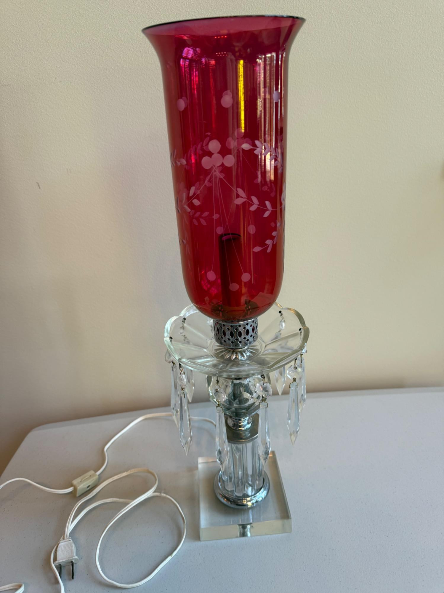 Vintage Hurricane Lamp with Cranberry Glass Shade – 19” Electric Table Lamp. This elegant vintage hurricane lamp features a beautiful cranberry glass shade with delicate etched floral patterns, adding a timeless touch of charm and sophistication. A perfect addition to vintage or Victorian décor, this lamp brings warm, ambient lighting and a touch of old-world elegance to any space. Let me know if you'd like any refinements!