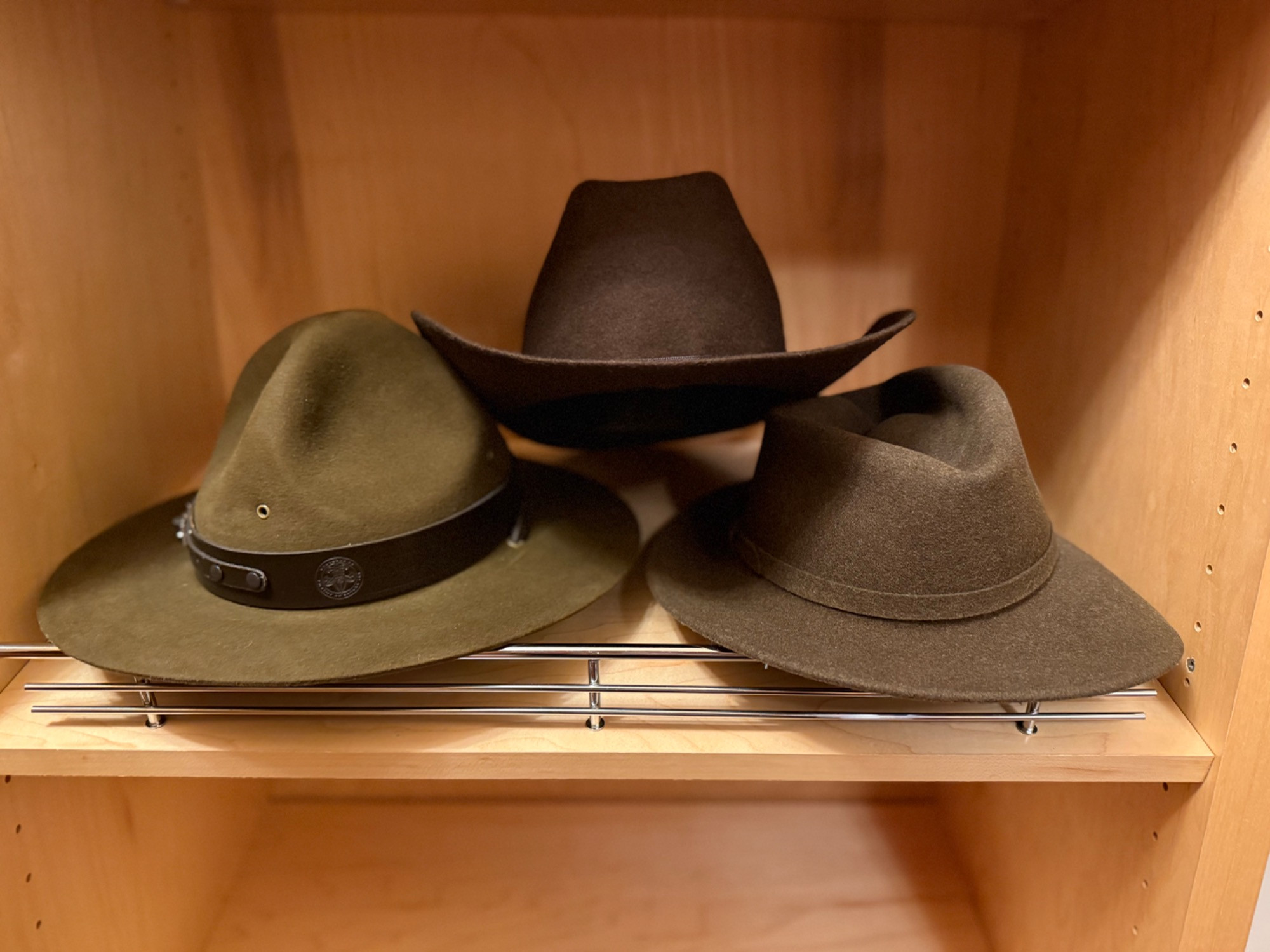 Vintage Eddie Bauer & Wool Felt Hats, Classic Western & Military Style. This set includes three wool felt hats, each with a unique style. The Eddie Bauer wool felt hat features a classic design with a branded metal nameplate. The Lite Felt® 100% wool hat is known for its durability and water resistance. The military-style campaign hat comes with an embossed leather hatband, giving it an authentic look. All hats are in great vintage condition and perfect for collectors, outdoor enthusiasts, or anyone who appreciates timeless style.