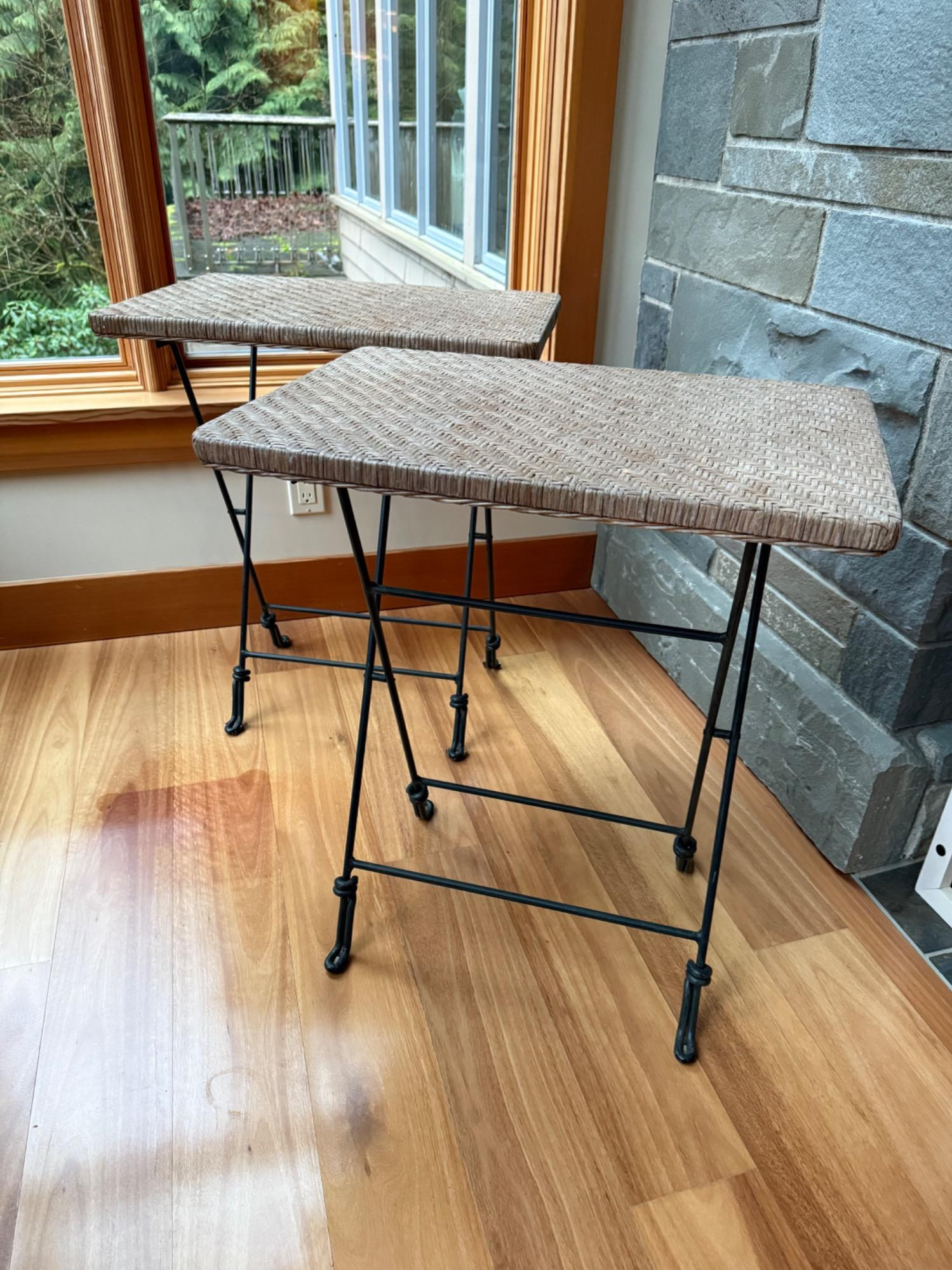 Set of 2 Vintage Iron & Wicker Folding Console Tables. Beautiful set of two vintage folding tables featuring woven wicker tops and sturdy black iron bases. These versatile tables combine rustic charm with industrial flair, perfect as side tables, plant stands, or accent pieces. Their lightweight, collapsible design makes them easy to store and move. A stylish and functional addition to any space! Bidding on this lot is an agreement that: (1.) You will have at least 2 capable, able-bodied persons to lift and load at a minimum. (2.) You will bring a hand truck and/or any other tools needed to remove this item. If these steps are not followed your item will be forfeited and no refund given.