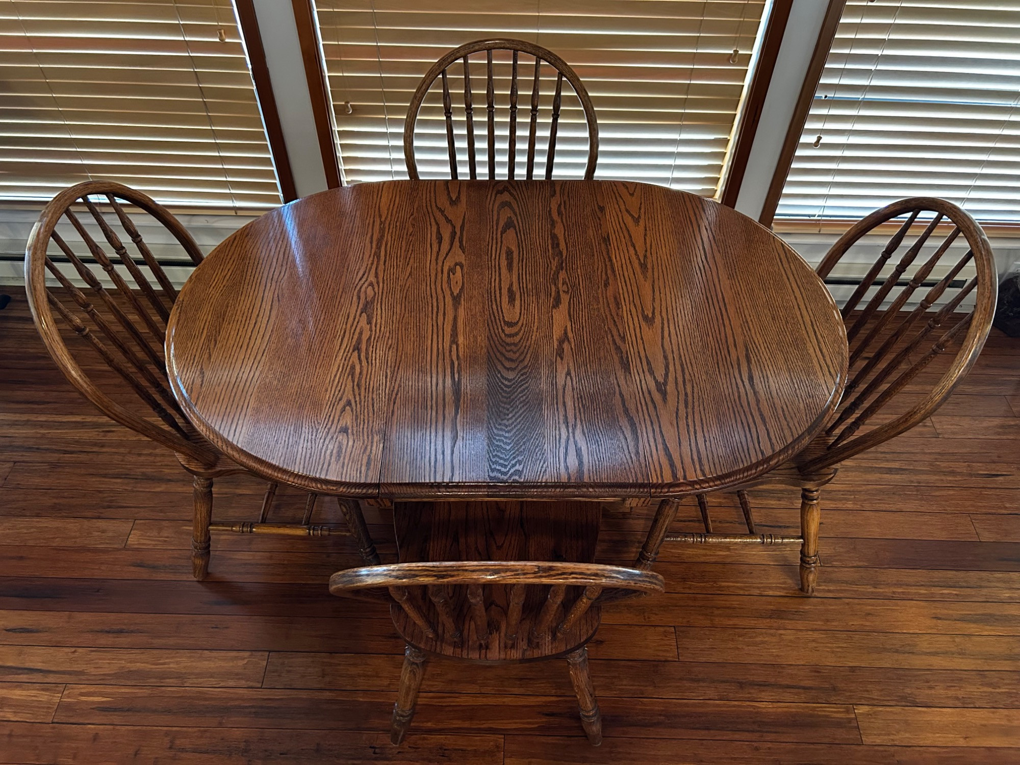 Solid Oak Dining Table & 4 Windsor Chairs – Expandable w/ Leaf. Chairs Are 38.5" H X 20"W X 22" D. Table Is 30"H X 36" W Without Leaf. Leaf Is 18' W X 36' Long. Beautiful solid oak dining set featuring a classic oval table and four Windsor-style chairs. The sturdy table measures 30” H x 36” W (without the leaf), with an 18” W x 36” L leaf that expands the table for extra seating. The chairs measure 38.5” H x 20” W x 22” D, offering a comfortable and timeless design. This high-quality set showcases the natural beauty of oak grain, making it a perfect addition to any dining space. Bidding on this lot is an agreement that: (1.) You will have at least 2 capable, able-bodied persons to lift and load at a minimum. (2.) You will bring a hand truck and/or any other tools needed to remove this item. If these steps are not followed your item will be forfeited and no refund given.