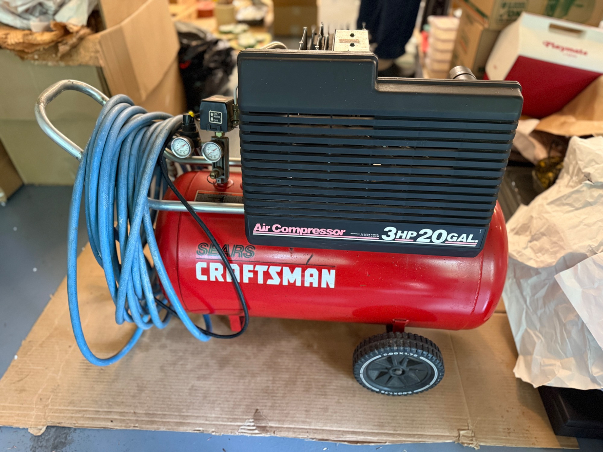 Craftsman 3HP 20-Gallon Air Compressor. Up for auction is a Sears Craftsman 3HP 20-Gallon Air Compressor, perfect for home garages, workshops, and DIY projects. This powerful unit delivers 8.6 SCFM at 40 PSI and 7.1 SCFM at 90 PSI, providing strong and steady airflow for various pneumatic tools. Features include a durable red steel tank, integrated pressure gauges, and easy-to-move wheels with a sturdy handle. Comes with a blue air hose for added convenience. Bidding on this lot is an agreement that: (1.) You will have at least 2 capable, able-bodied persons to lift and load at a minimum. (2.) You will bring a hand truck and/or any other tools needed to remove this item. If these steps are not followed your item will be forfeited and no refund given.