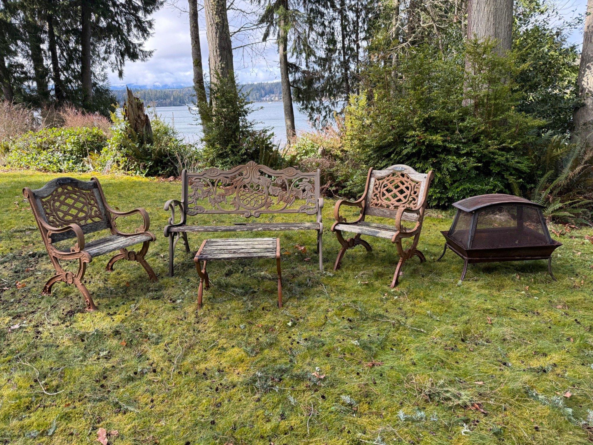 Berkeley Forge & Foundry Cast Iron & Wood Patio Set + Fire Pit. This vintage outdoor furniture set includes cast iron and wood seating and a matching table, designed by Berkeley Forge & Foundry. The intricate cast iron frames feature decorative scrollwork and lattice designs, while the wooden slats add rustic charm. The set shows signs of weathering, giving it a classic aged patina that adds to its character. Bench measures 50" wide. The set exhibits signs of wear due to exposure, with aged patina, rust on the iron elements, and weathered wood. This classic and collectible patio set is ideal for those who appreciate vintage craftsmanship and garden aesthetics. Whether used as-is for a rustic appeal or refinished for a fresh look, it remains a timeless outdoor furniture set. Bidding on this lot is an agreement that: (1.) You will have at least 2 capable, able-bodied persons to lift and load at a minimum. (2.) You will bring a hand truck and/or any other tools needed to remove this item. If these steps are not followed your item will be forfeited and no refund given.