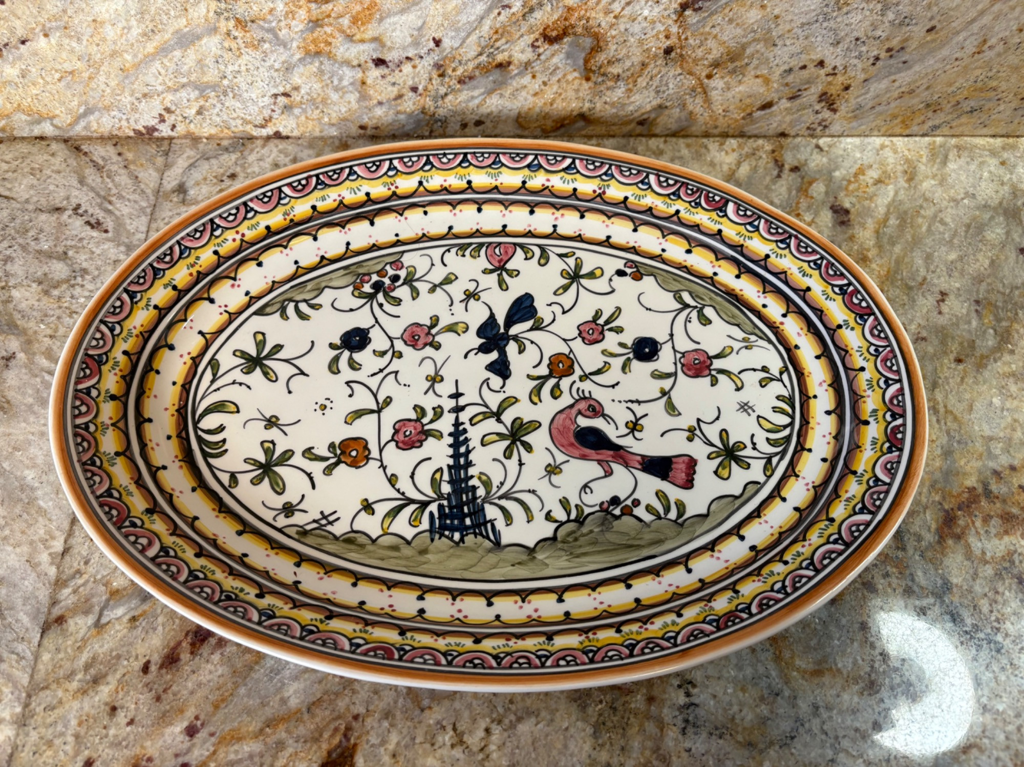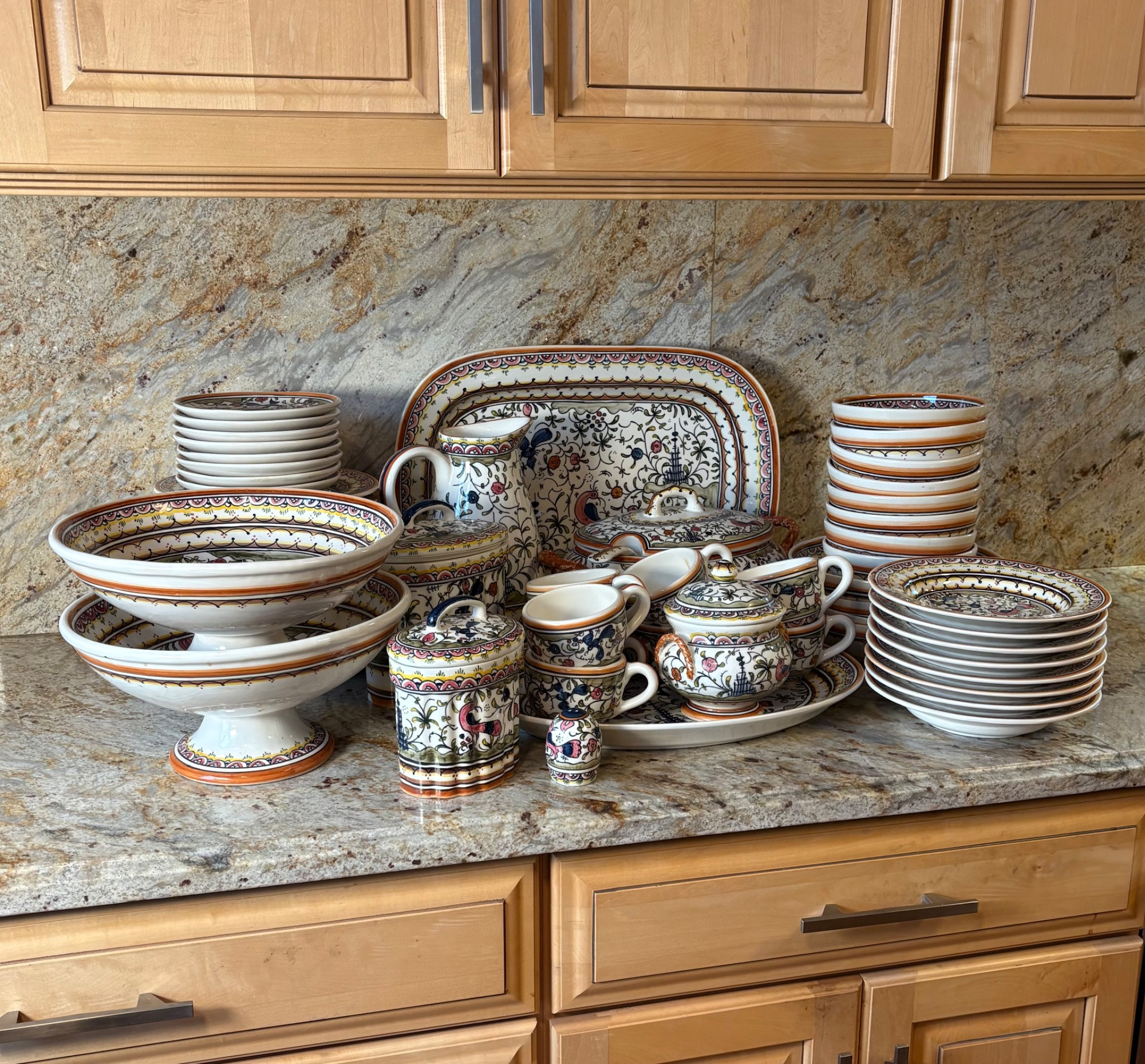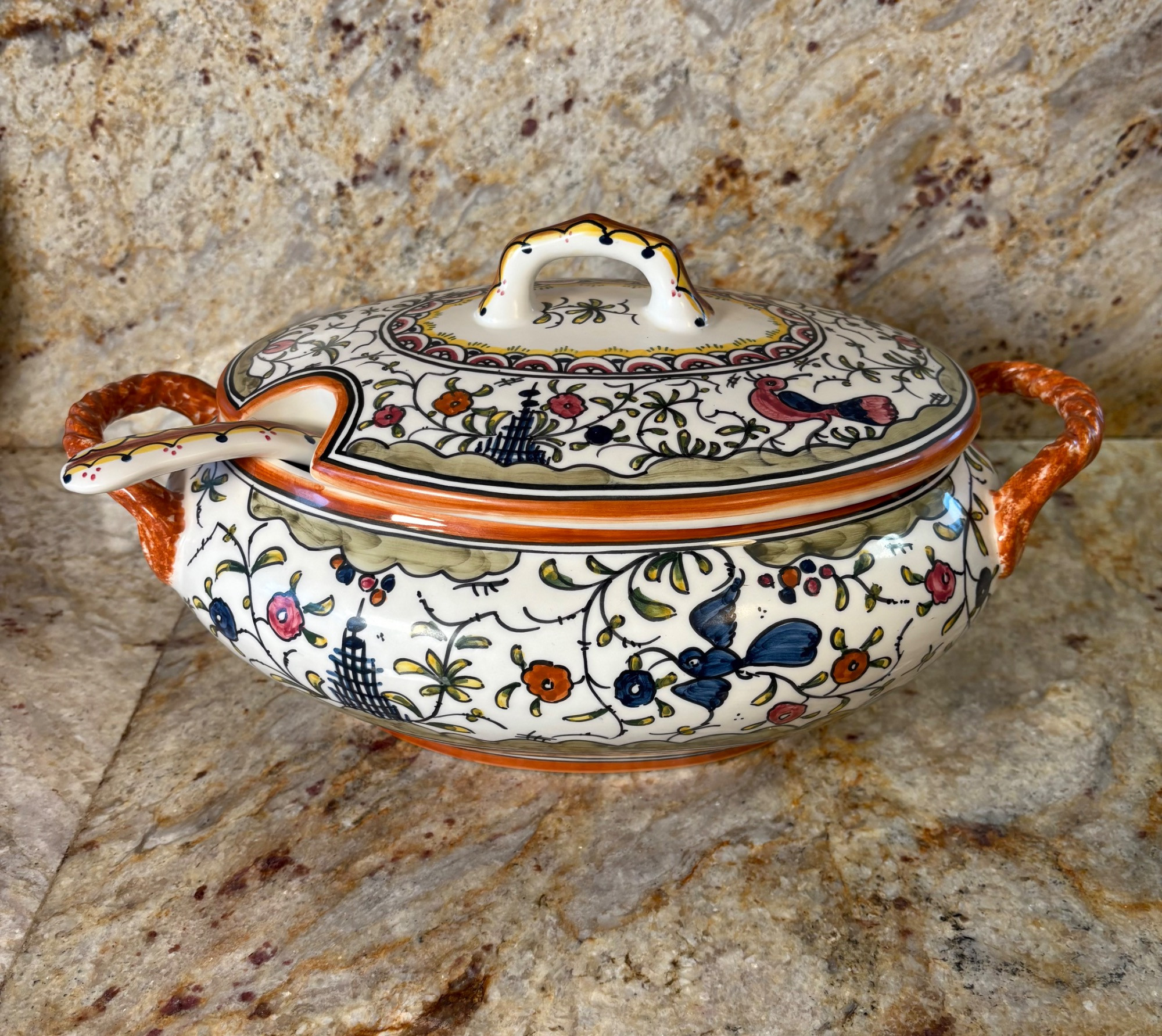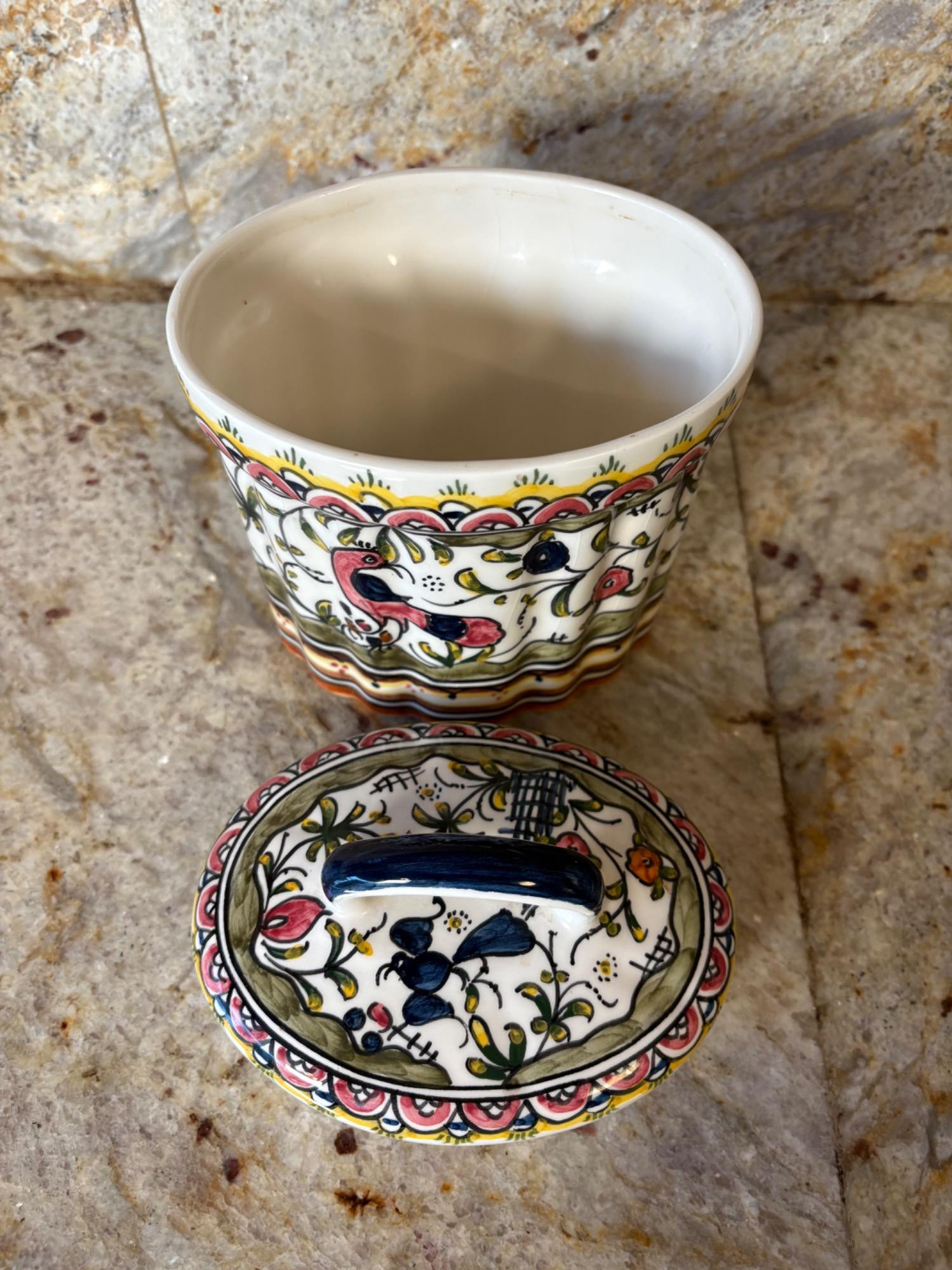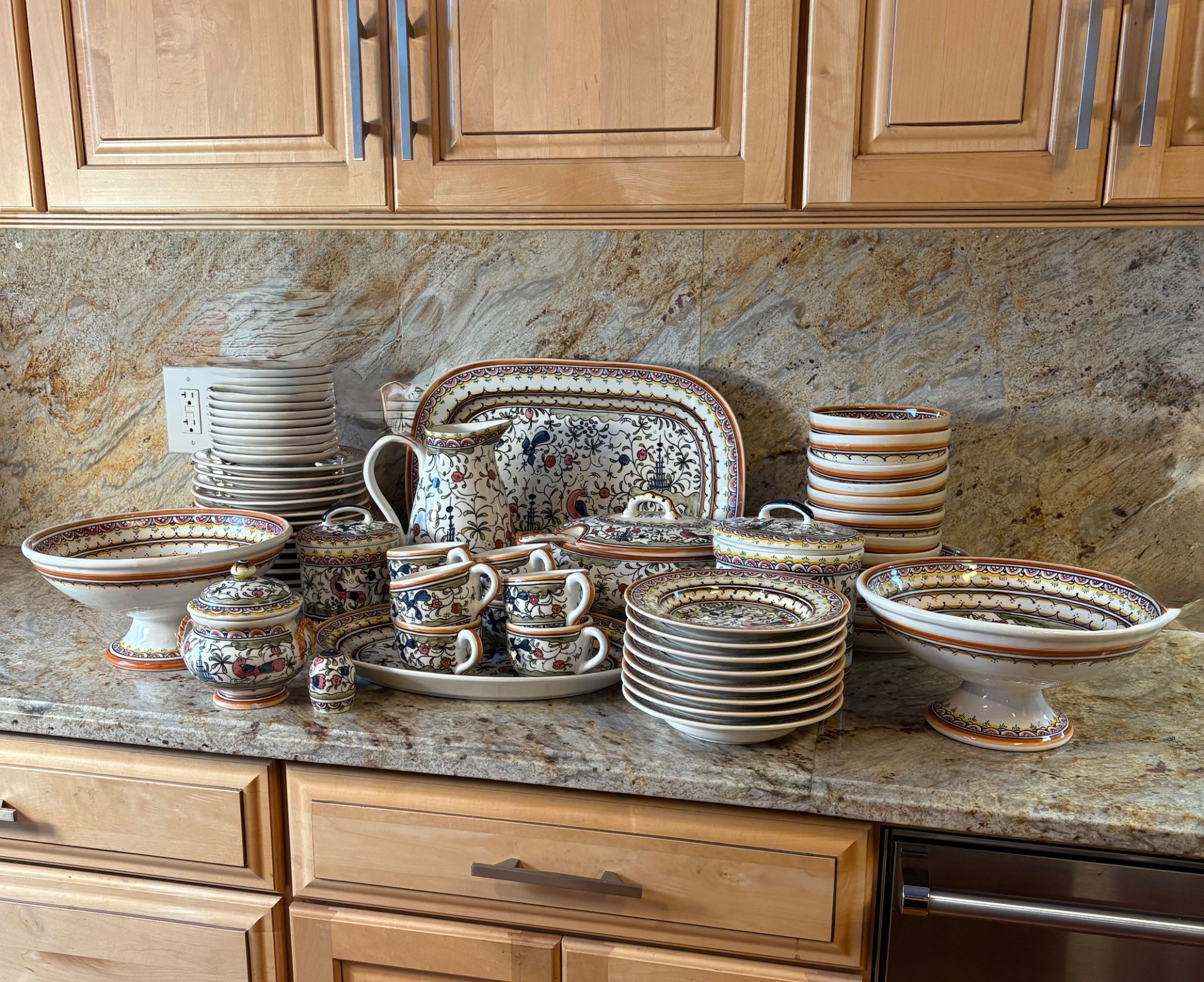 Huge set of wonderful dishes from Portugal with classic hand-painted bird & floral motifs. Made for Neiman Marcus, they are dishwasher safe & lead-free. Each piece is slightly different due to the artists' individual hands. Lot includes: 2 pedestal-footed serving bowls that measure11.5" across 8 flat-bottom soup/dessert bowls that measure 9" across 4 medium size serving bowls that measure 9.5"across 8 round-bottom soup/dessert bowls that measure 6.5" across 1 larger lidded canister that measures 8 " H 1 soup terrine that measures 14" handle to handle by 7" H. Includes matching ladle. 8 coffee cups & 8 saucers that measure 6.75" across 1 rectangular platter that measures 19" W 1 water pitcher that measures 10" H 1 smaller lidded canister that measures 6.5" H 1 oval platter that measures 16" W 1 round lidded canister that measures 6" H. Note that there is a hairline crack in the lid that has been repaired - see second to last photo. 7 salad or dessert plates that measure 9.25" across 7 dinner plates that measure 11" across. Note that one has a chip that has been repaired - albeit badly - see last photo 1 salt or pepper shaker measuring 2.5" H
