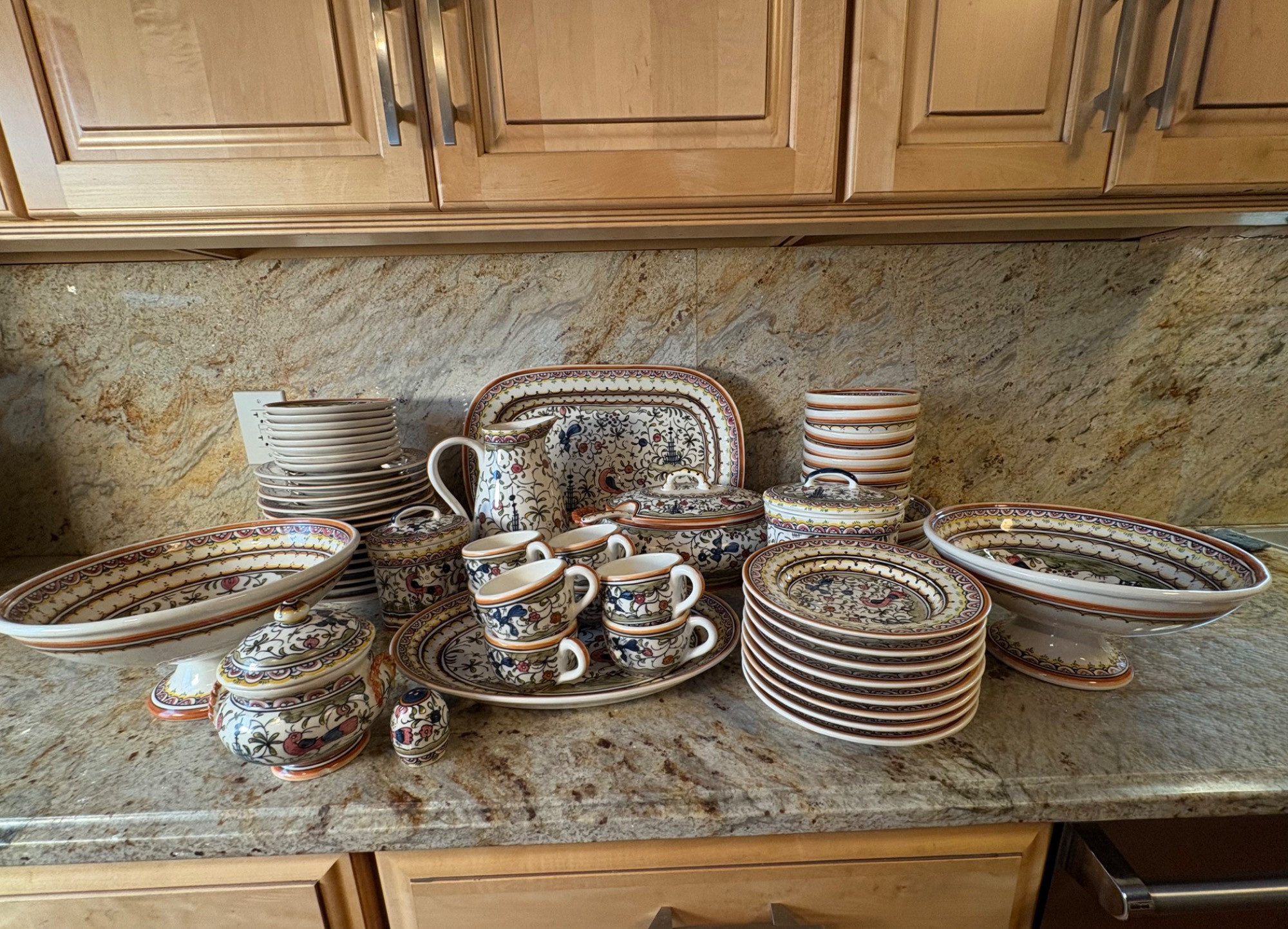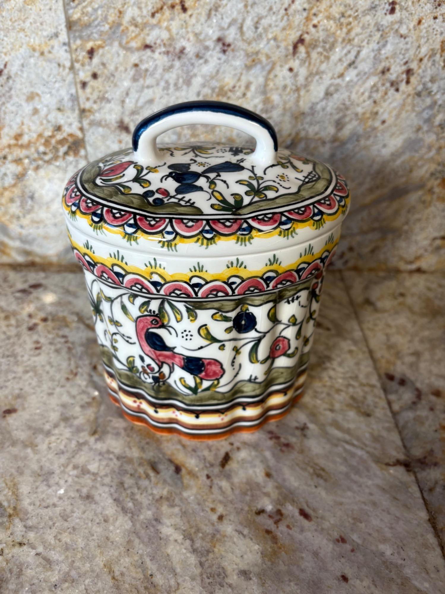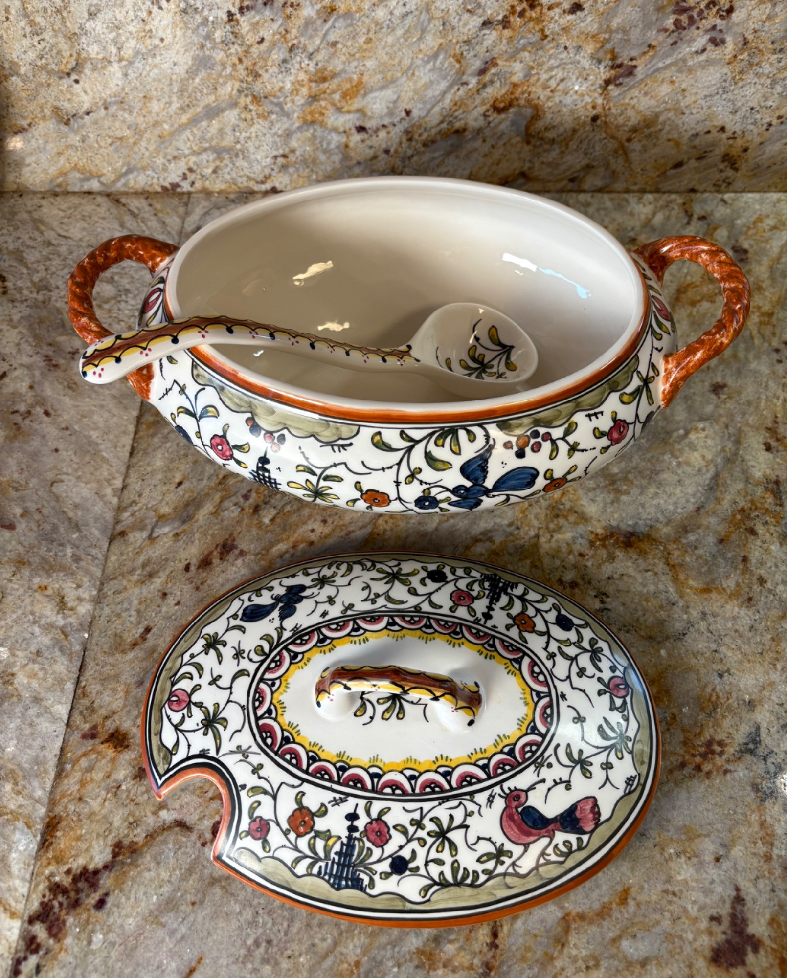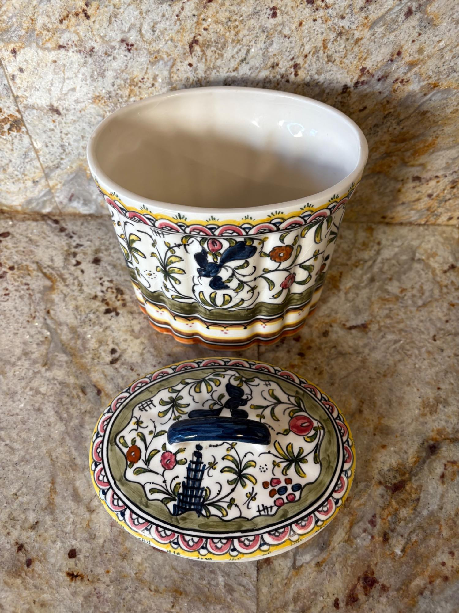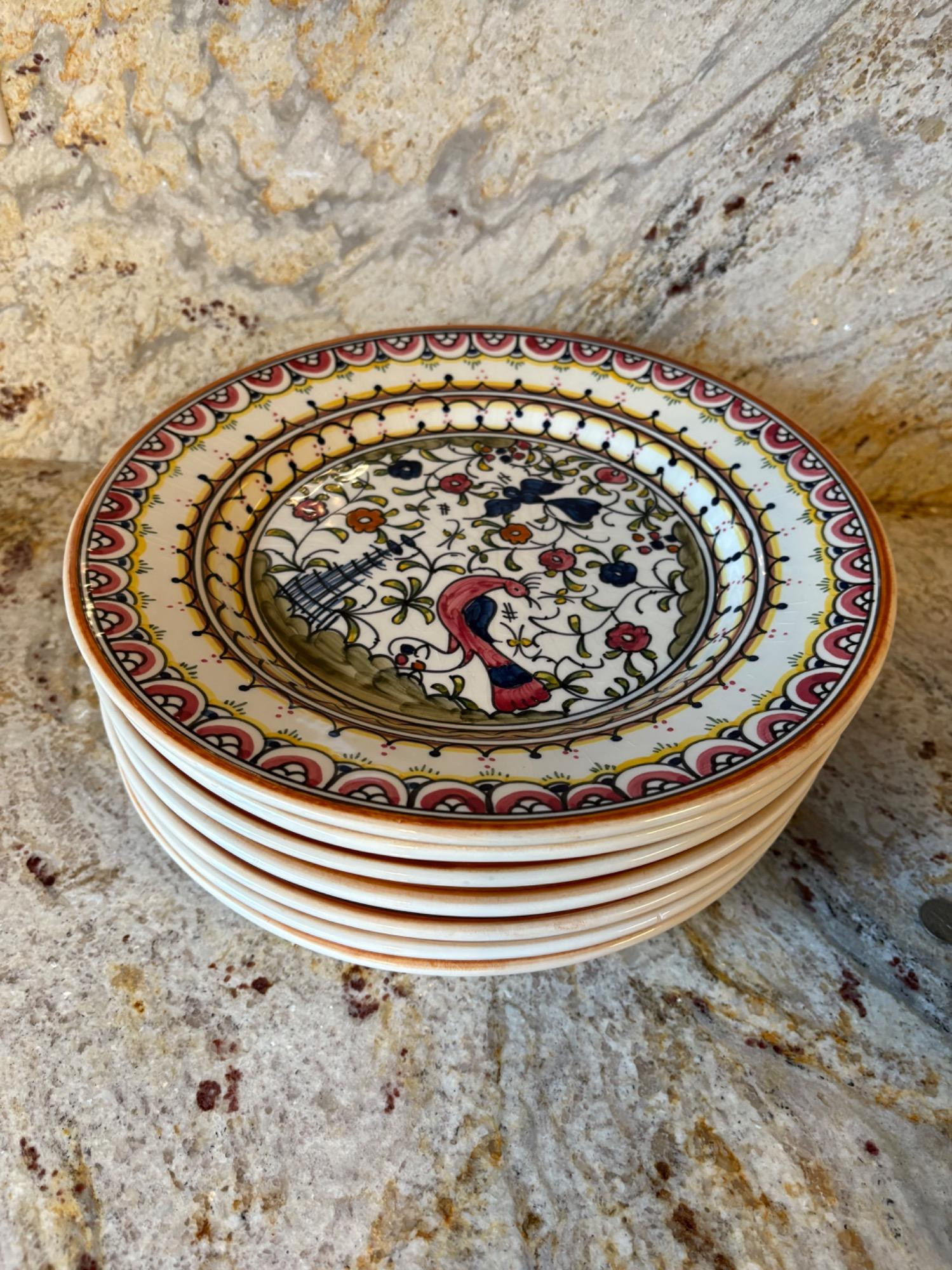 Huge set of wonderful dishes from Portugal with classic hand-painted bird & floral motifs. Made for Neiman Marcus, they are dishwasher safe & lead-free. Each piece is slightly different due to the artists' individual hands. Lot includes: 2 pedestal-footed serving bowls that measure11.5" across 8 flat-bottom soup/dessert bowls that measure 9" across 4 medium size serving bowls that measure 9.5"across 8 round-bottom soup/dessert bowls that measure 6.5" across 1 larger lidded canister that measures 8 " H 1 soup terrine that measures 14" handle to handle by 7" H. Includes matching ladle. 8 coffee cups & 8 saucers that measure 6.75" across 1 rectangular platter that measures 19" W 1 water pitcher that measures 10" H 1 smaller lidded canister that measures 6.5" H 1 oval platter that measures 16" W 1 round lidded canister that measures 6" H. Note that there is a hairline crack in the lid that has been repaired - see second to last photo. 7 salad or dessert plates that measure 9.25" across 7 dinner plates that measure 11" across. Note that one has a chip that has been repaired - albeit badly - see last photo 1 salt or pepper shaker measuring 2.5" H
