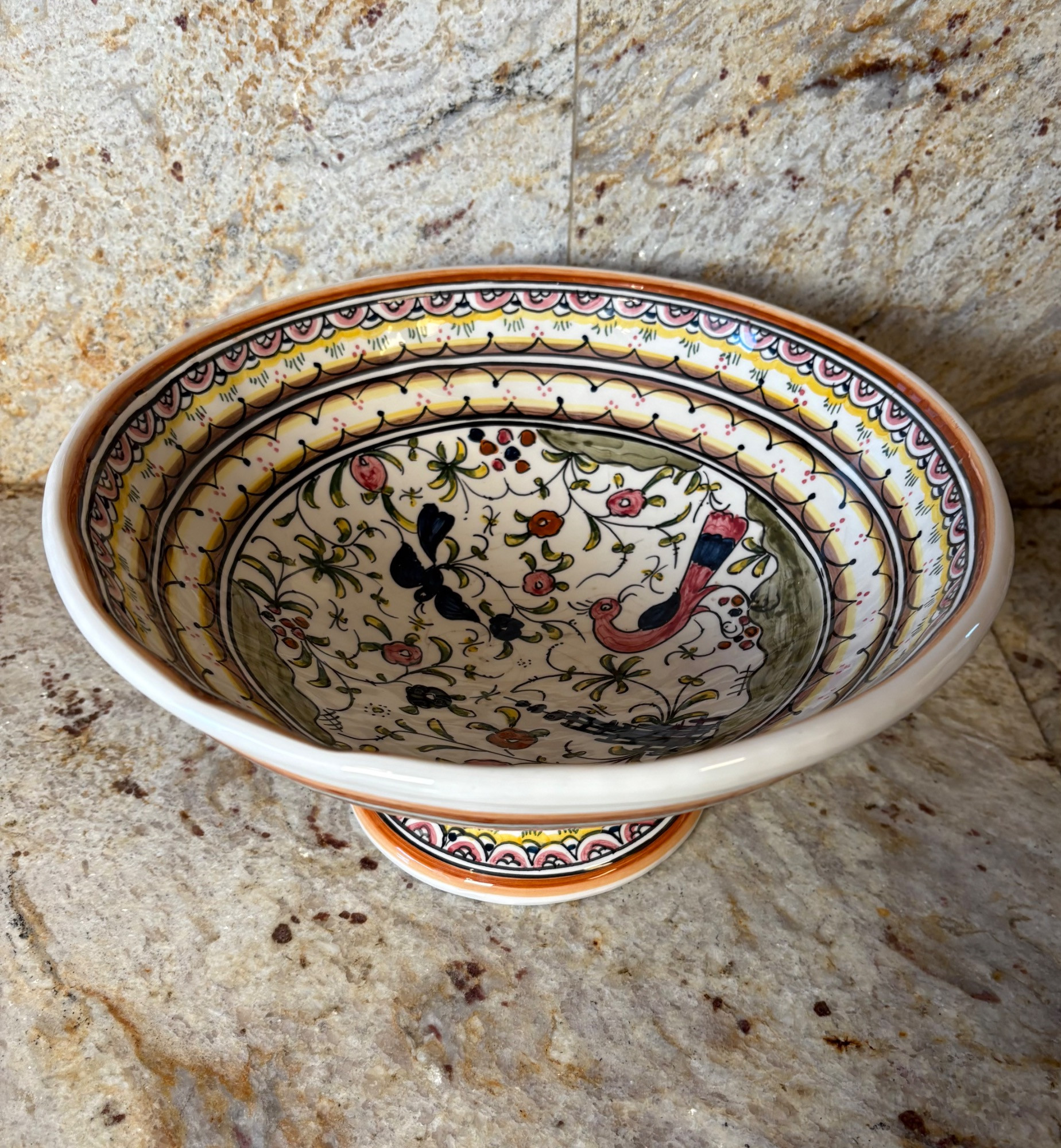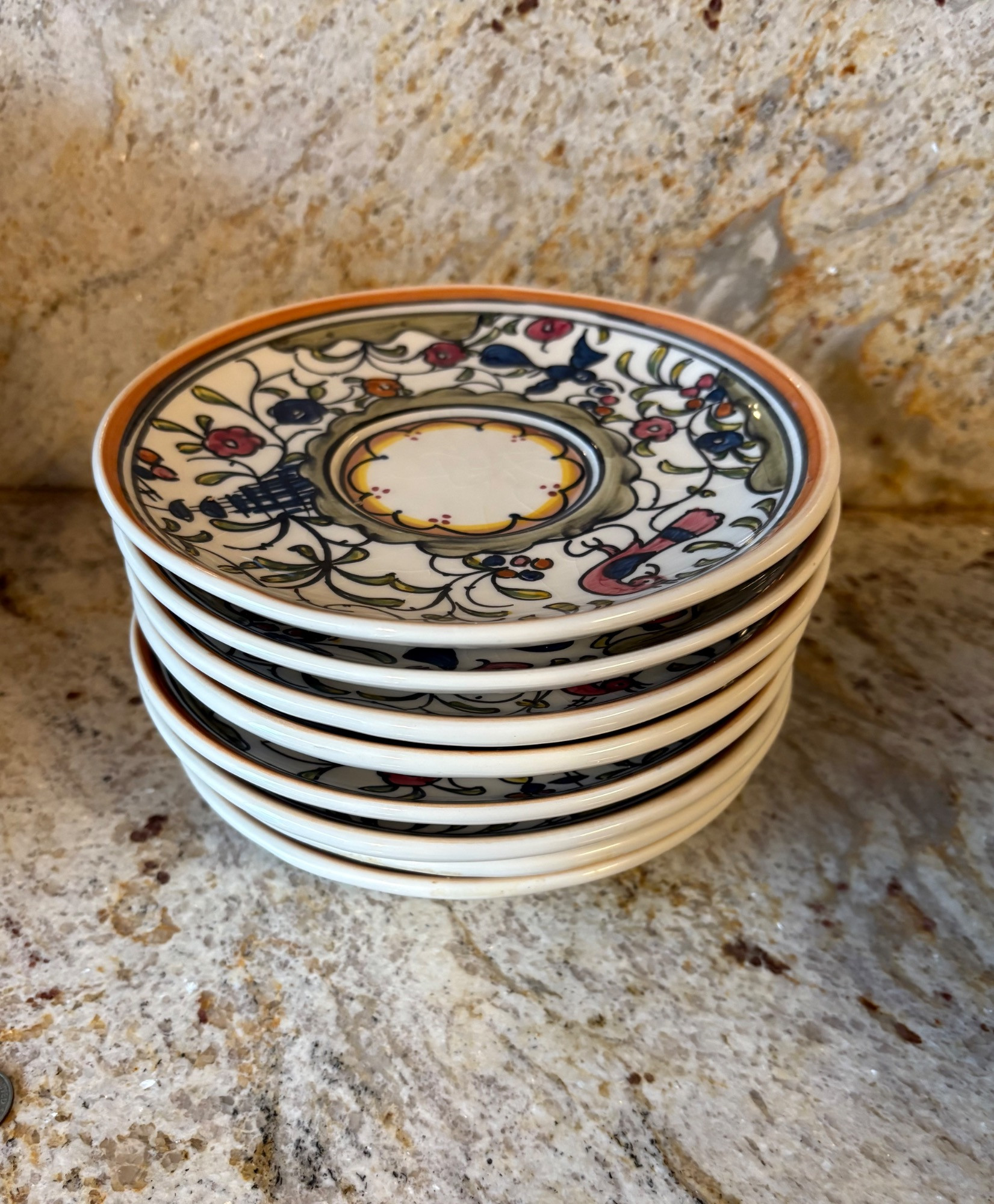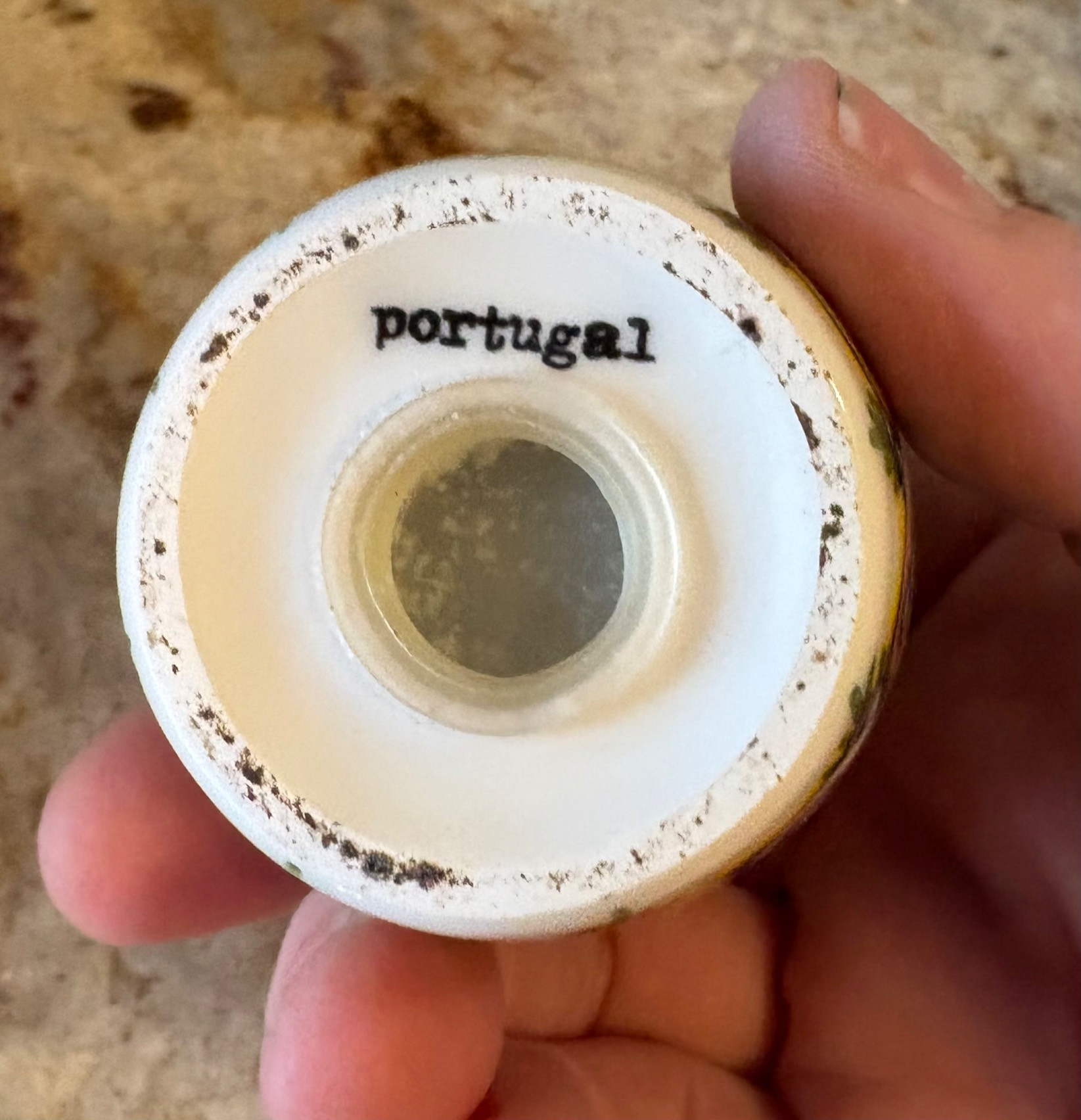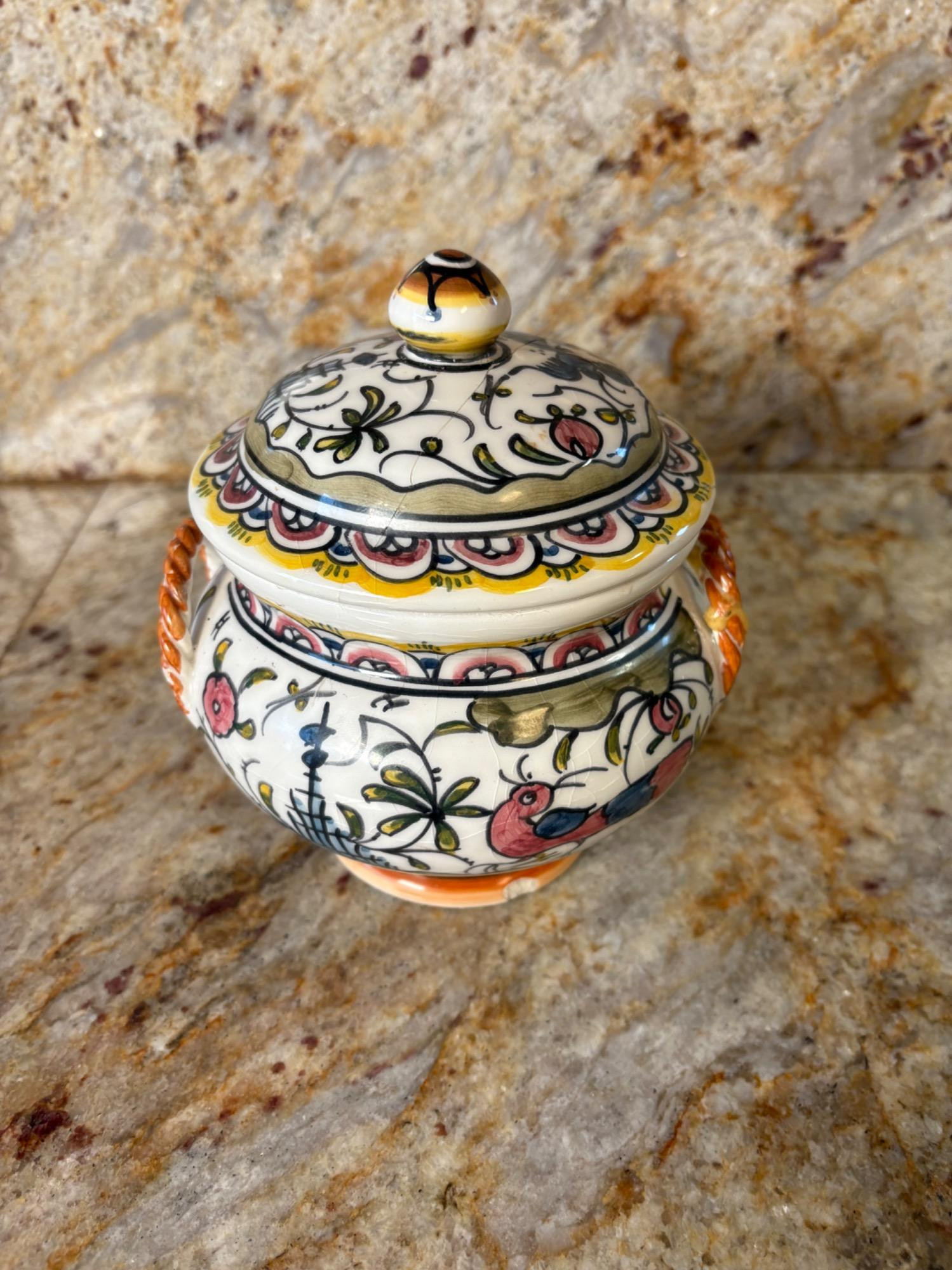 Huge set of wonderful dishes from Portugal with classic hand-painted bird & floral motifs. Made for Neiman Marcus, they are dishwasher safe & lead-free. Each piece is slightly different due to the artists' individual hands. Lot includes: 2 pedestal-footed serving bowls that measure11.5" across 8 flat-bottom soup/dessert bowls that measure 9" across 4 medium size serving bowls that measure 9.5"across 8 round-bottom soup/dessert bowls that measure 6.5" across 1 larger lidded canister that measures 8 " H 1 soup terrine that measures 14" handle to handle by 7" H. Includes matching ladle. 8 coffee cups & 8 saucers that measure 6.75" across 1 rectangular platter that measures 19" W 1 water pitcher that measures 10" H 1 smaller lidded canister that measures 6.5" H 1 oval platter that measures 16" W 1 round lidded canister that measures 6" H. Note that there is a hairline crack in the lid that has been repaired - see second to last photo. 7 salad or dessert plates that measure 9.25" across 7 dinner plates that measure 11" across. Note that one has a chip that has been repaired - albeit badly - see last photo 1 salt or pepper shaker measuring 2.5" H