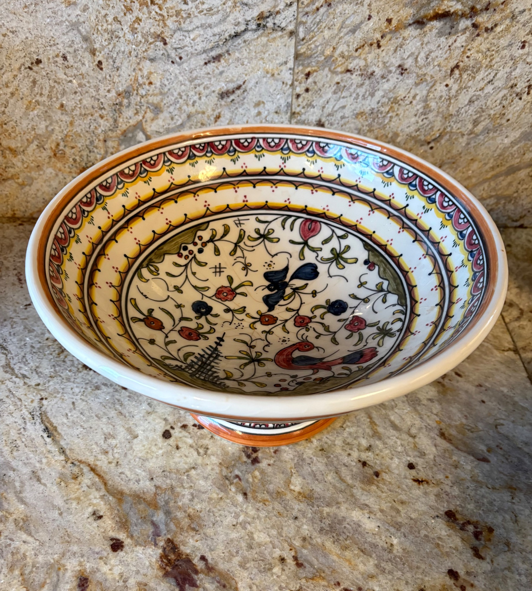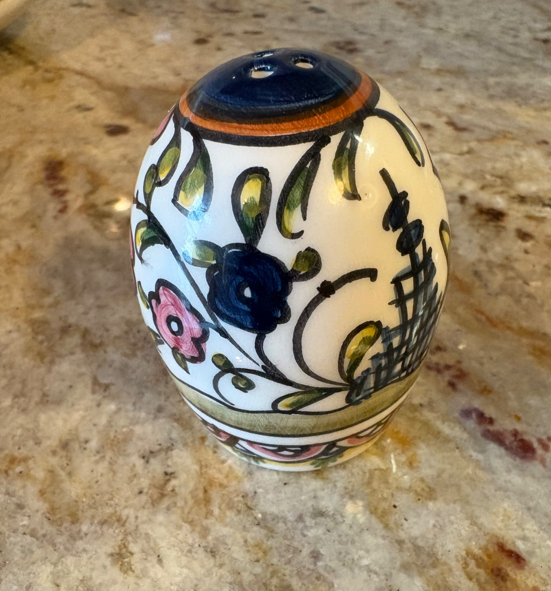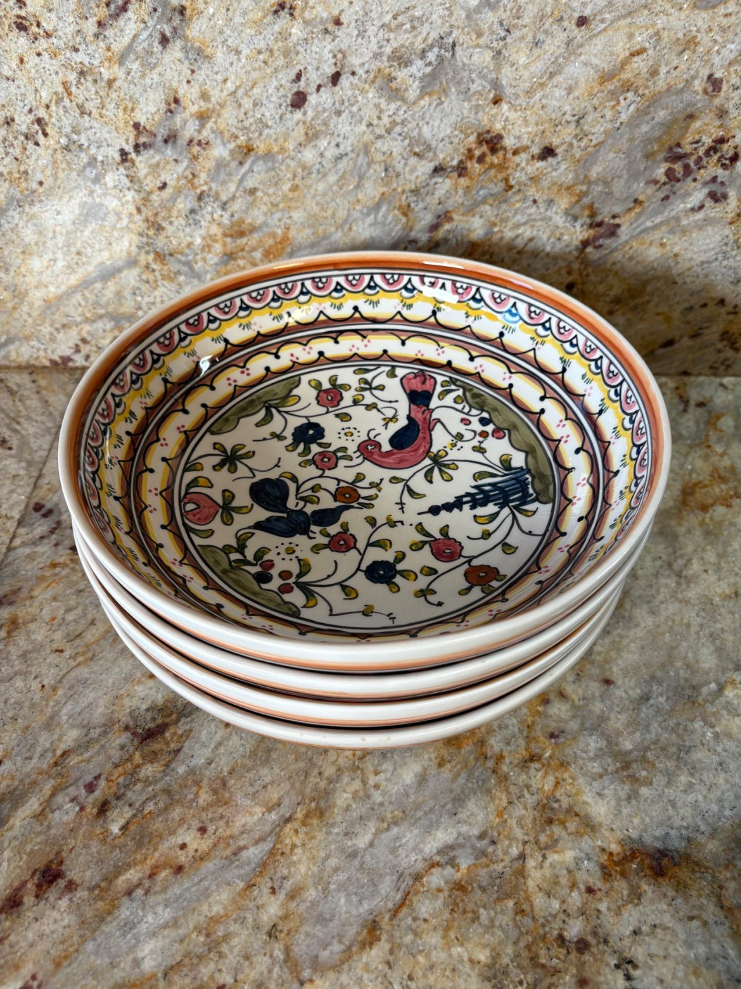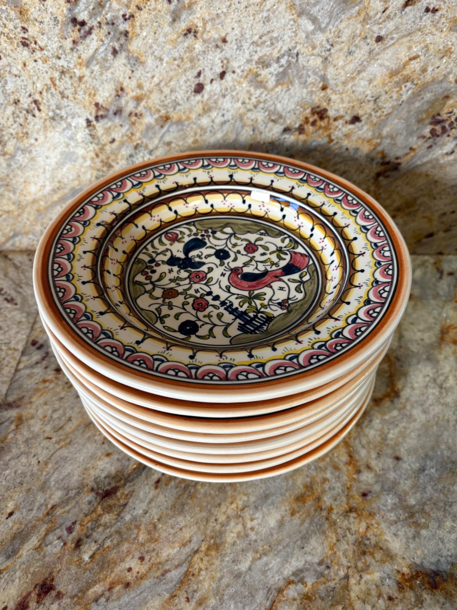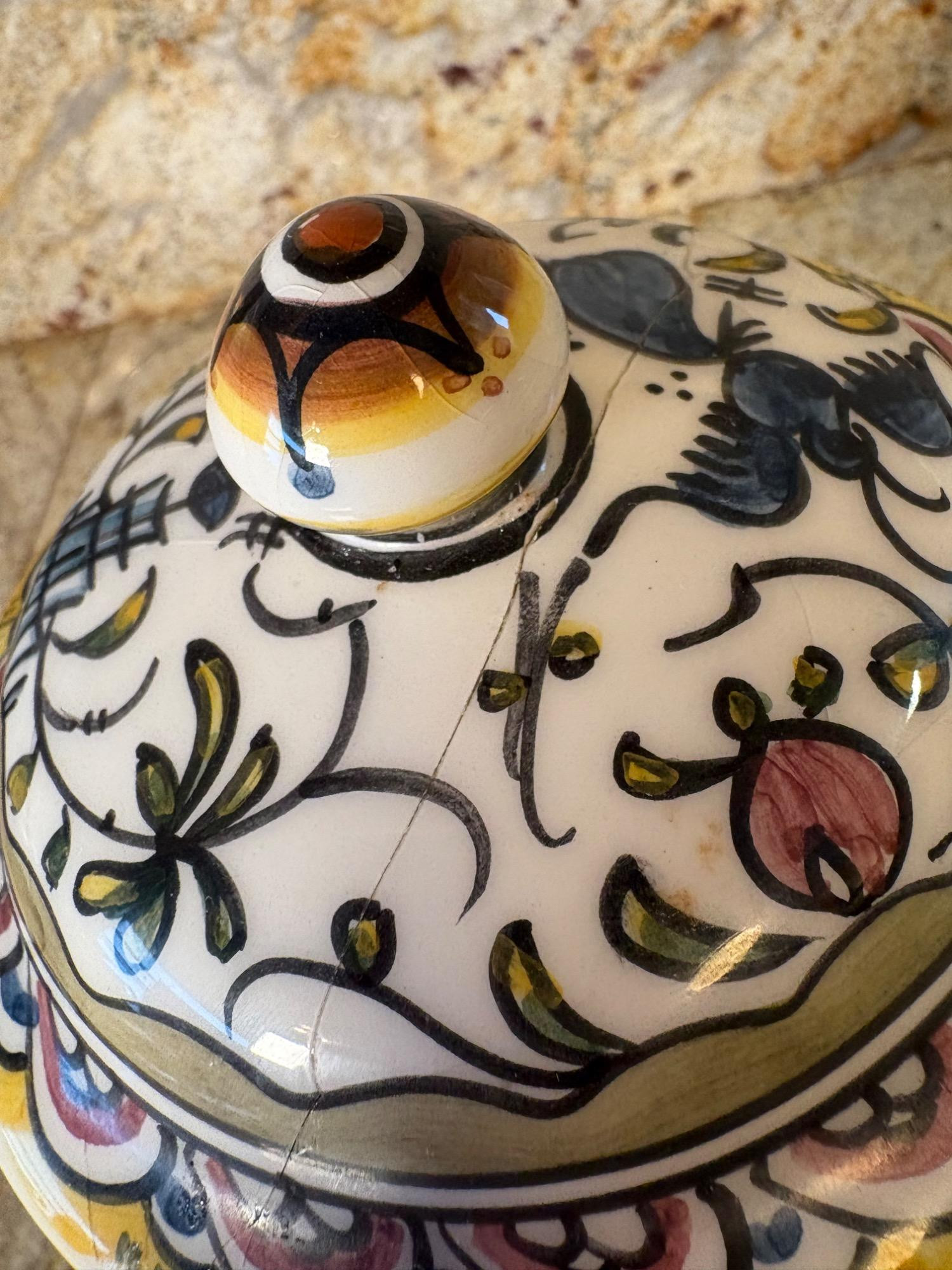 Huge set of wonderful dishes from Portugal with classic hand-painted bird & floral motifs. Made for Neiman Marcus, they are dishwasher safe & lead-free. Each piece is slightly different due to the artists' individual hands. Lot includes: 2 pedestal-footed serving bowls that measure11.5" across 8 flat-bottom soup/dessert bowls that measure 9" across 4 medium size serving bowls that measure 9.5"across 8 round-bottom soup/dessert bowls that measure 6.5" across 1 larger lidded canister that measures 8 " H 1 soup terrine that measures 14" handle to handle by 7" H. Includes matching ladle. 8 coffee cups & 8 saucers that measure 6.75" across 1 rectangular platter that measures 19" W 1 water pitcher that measures 10" H 1 smaller lidded canister that measures 6.5" H 1 oval platter that measures 16" W 1 round lidded canister that measures 6" H. Note that there is a hairline crack in the lid that has been repaired - see second to last photo. 7 salad or dessert plates that measure 9.25" across 7 dinner plates that measure 11" across. Note that one has a chip that has been repaired - albeit badly - see last photo 1 salt or pepper shaker measuring 2.5" H