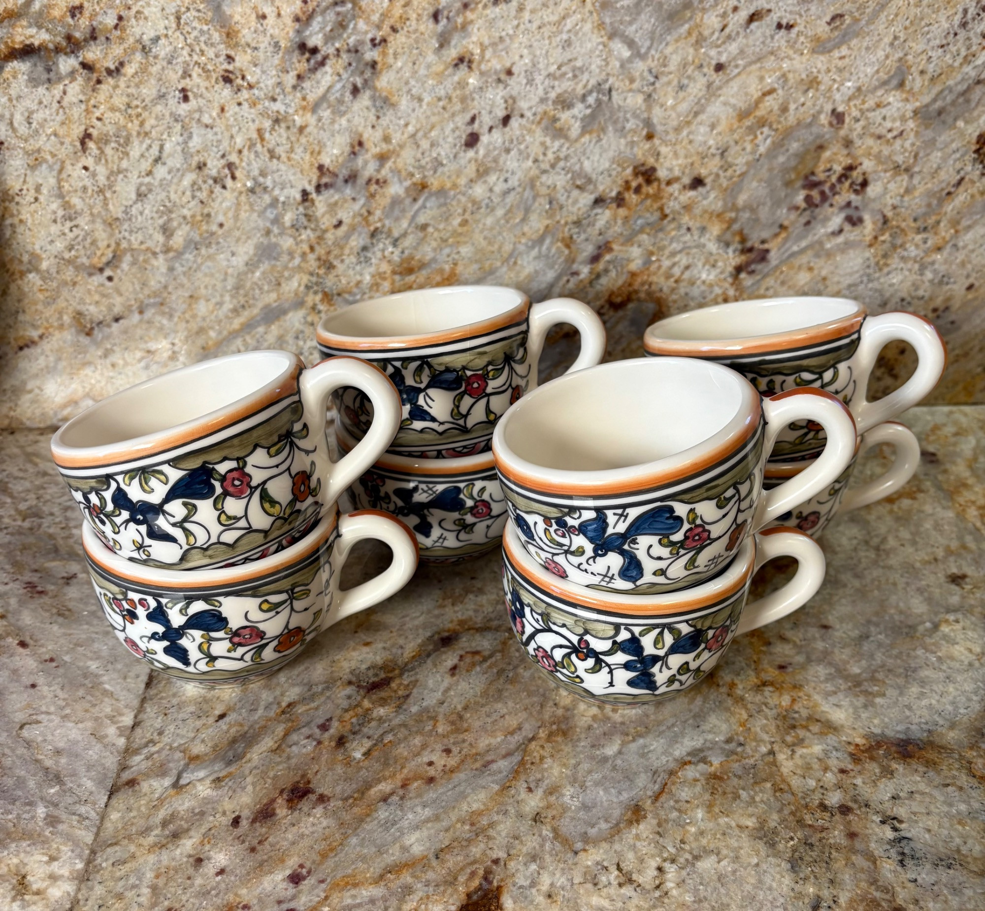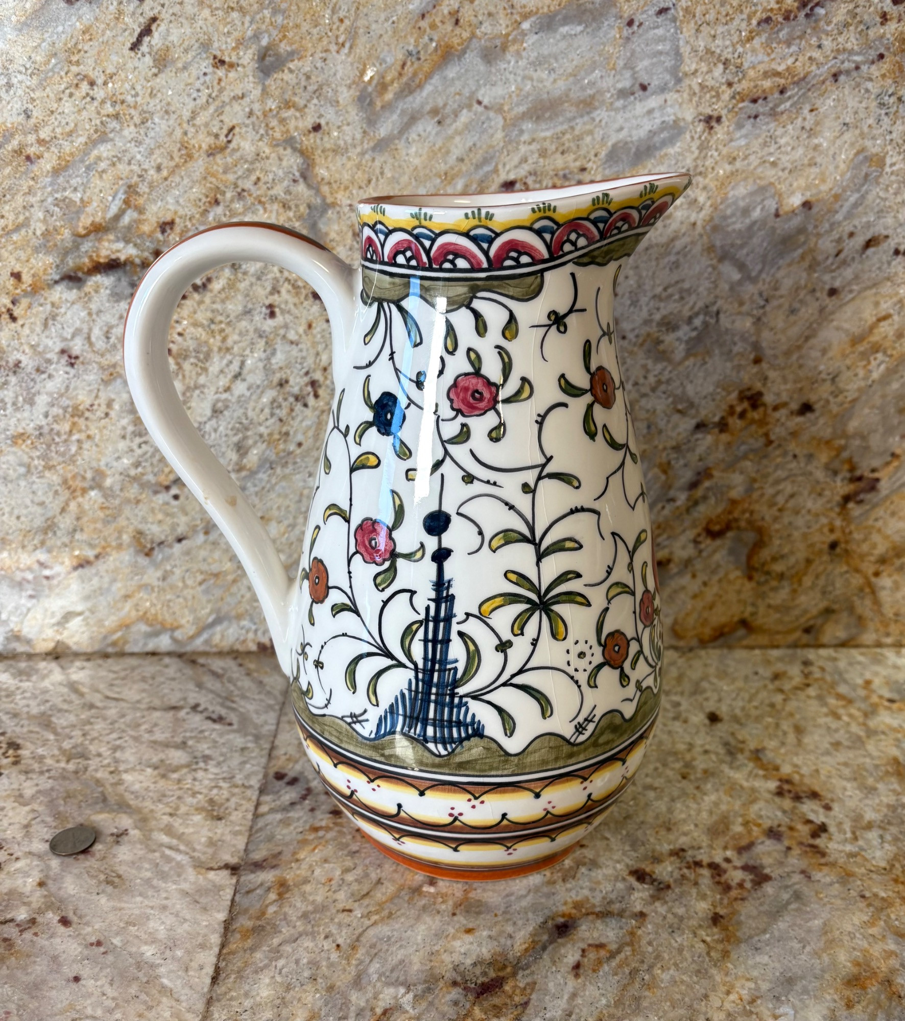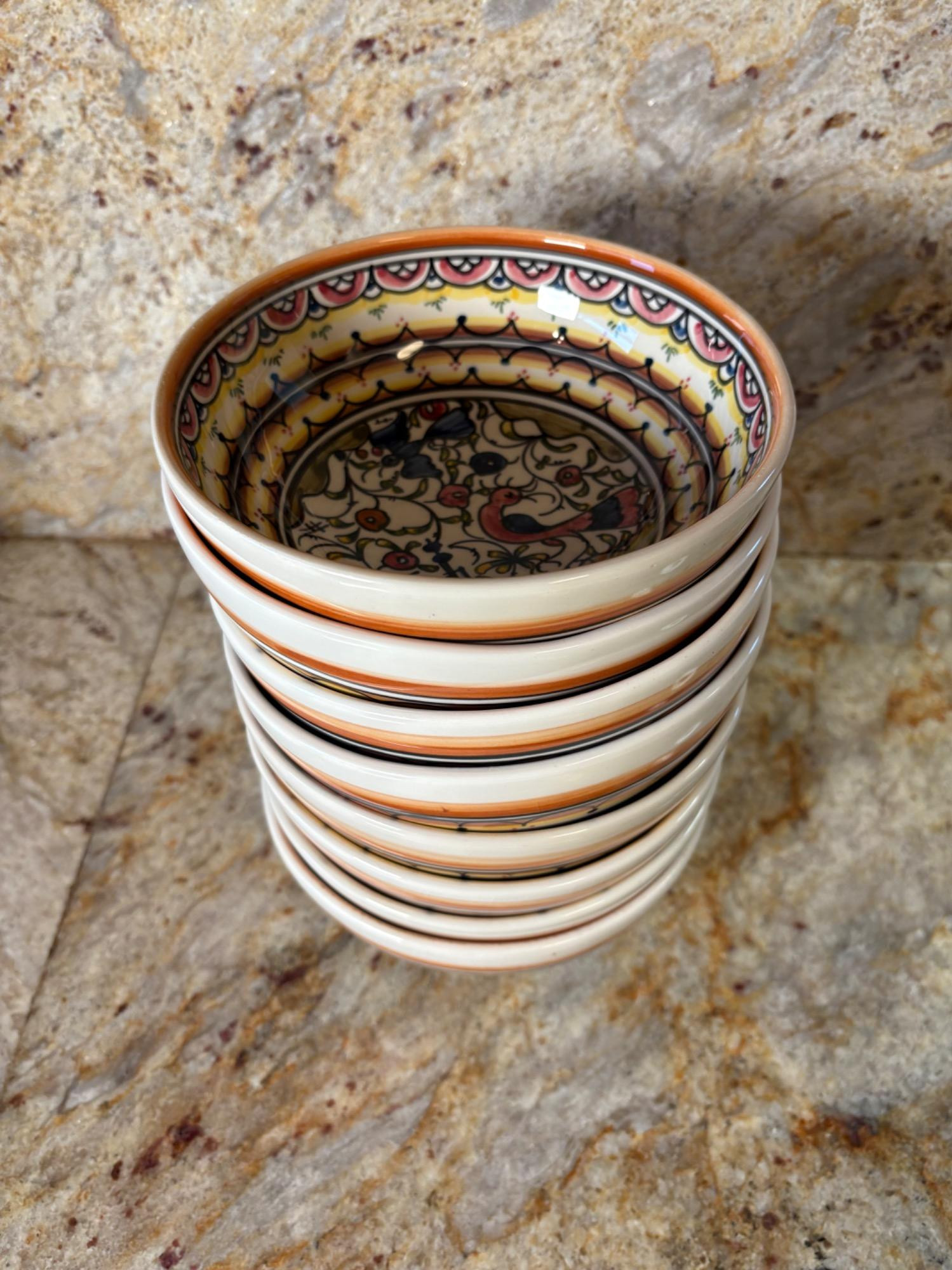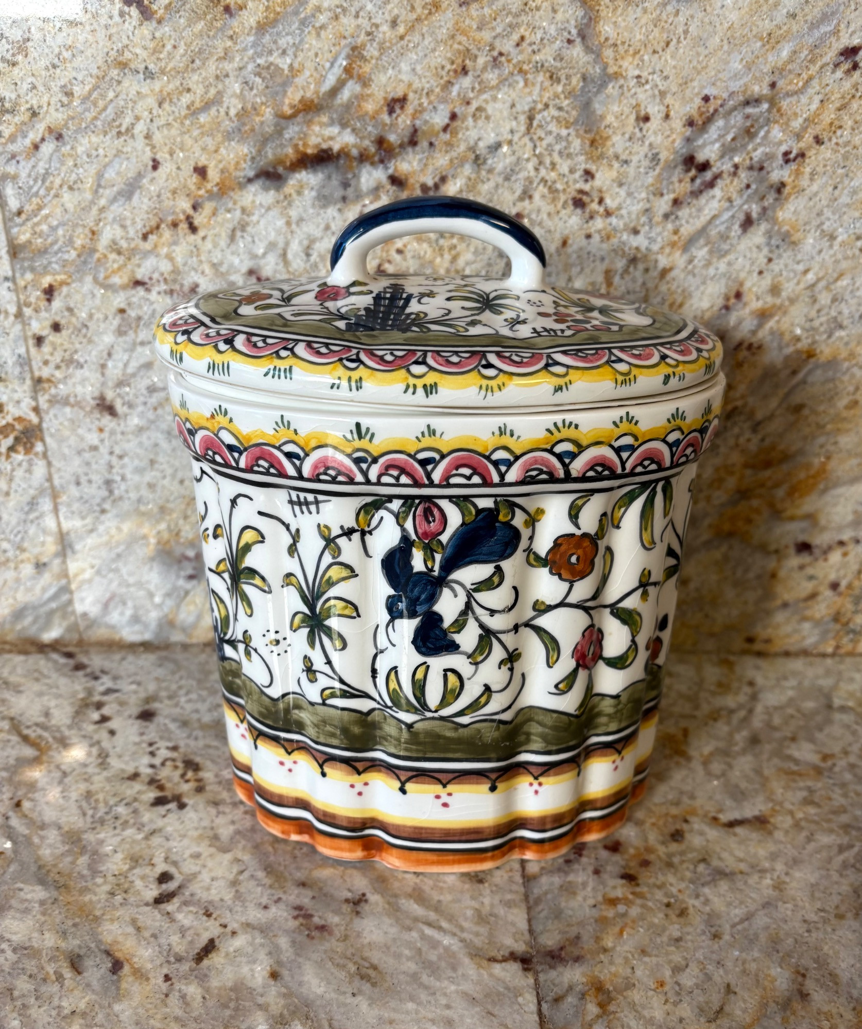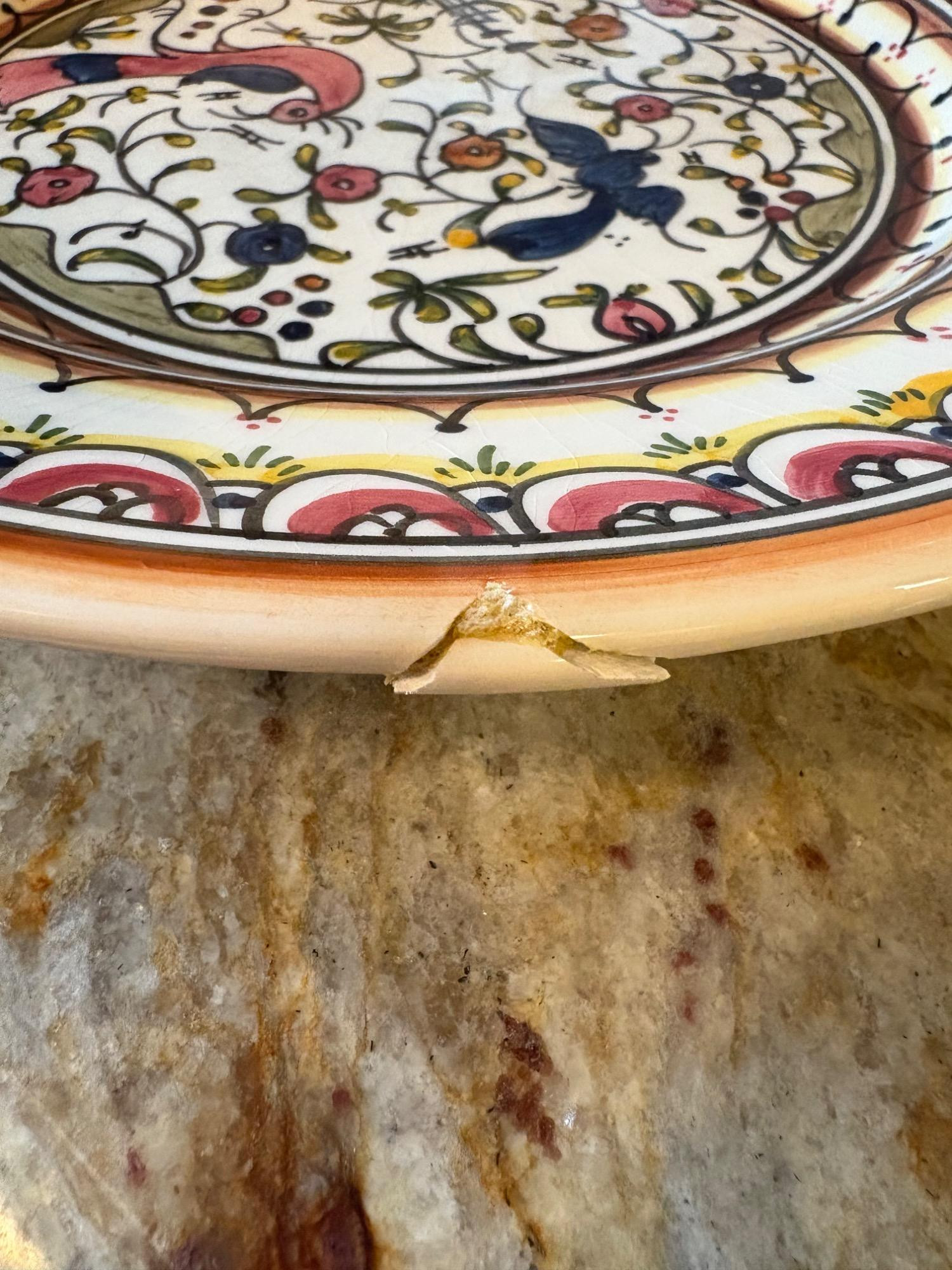 Huge set of wonderful dishes from Portugal with classic hand-painted bird & floral motifs. Made for Neiman Marcus, they are dishwasher safe & lead-free. Each piece is slightly different due to the artists' individual hands. Lot includes: 2 pedestal-footed serving bowls that measure11.5" across 8 flat-bottom soup/dessert bowls that measure 9" across 4 medium size serving bowls that measure 9.5"across 8 round-bottom soup/dessert bowls that measure 6.5" across 1 larger lidded canister that measures 8 " H 1 soup terrine that measures 14" handle to handle by 7" H. Includes matching ladle. 8 coffee cups & 8 saucers that measure 6.75" across 1 rectangular platter that measures 19" W 1 water pitcher that measures 10" H 1 smaller lidded canister that measures 6.5" H 1 oval platter that measures 16" W 1 round lidded canister that measures 6" H. Note that there is a hairline crack in the lid that has been repaired - see second to last photo. 7 salad or dessert plates that measure 9.25" across 7 dinner plates that measure 11" across. Note that one has a chip that has been repaired - albeit badly - see last photo 1 salt or pepper shaker measuring 2.5" H