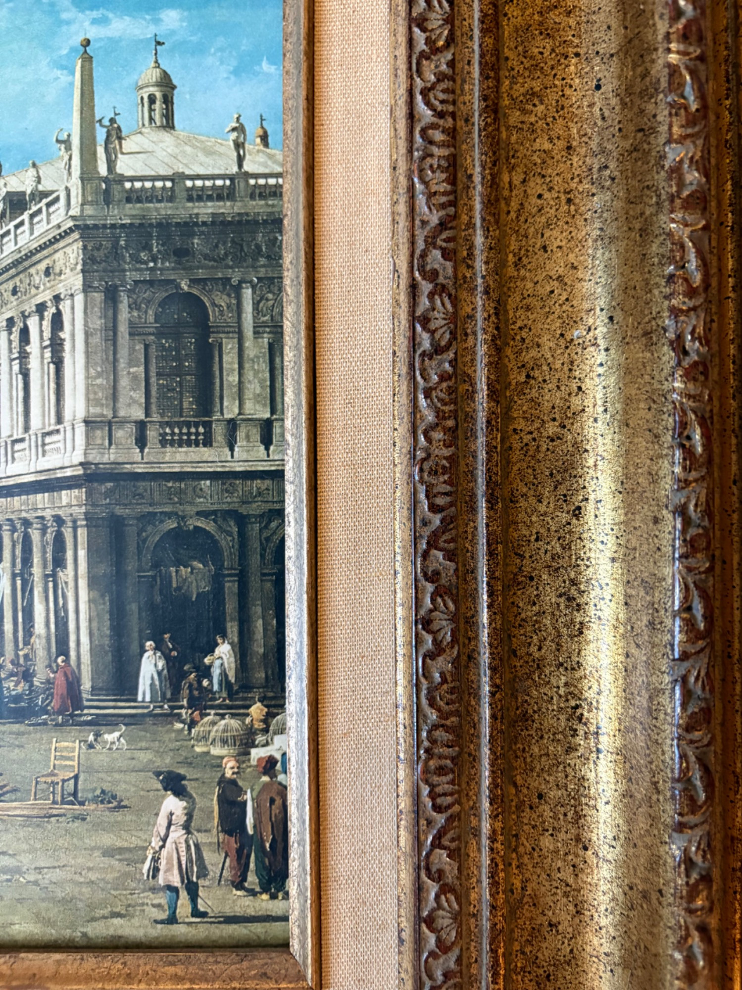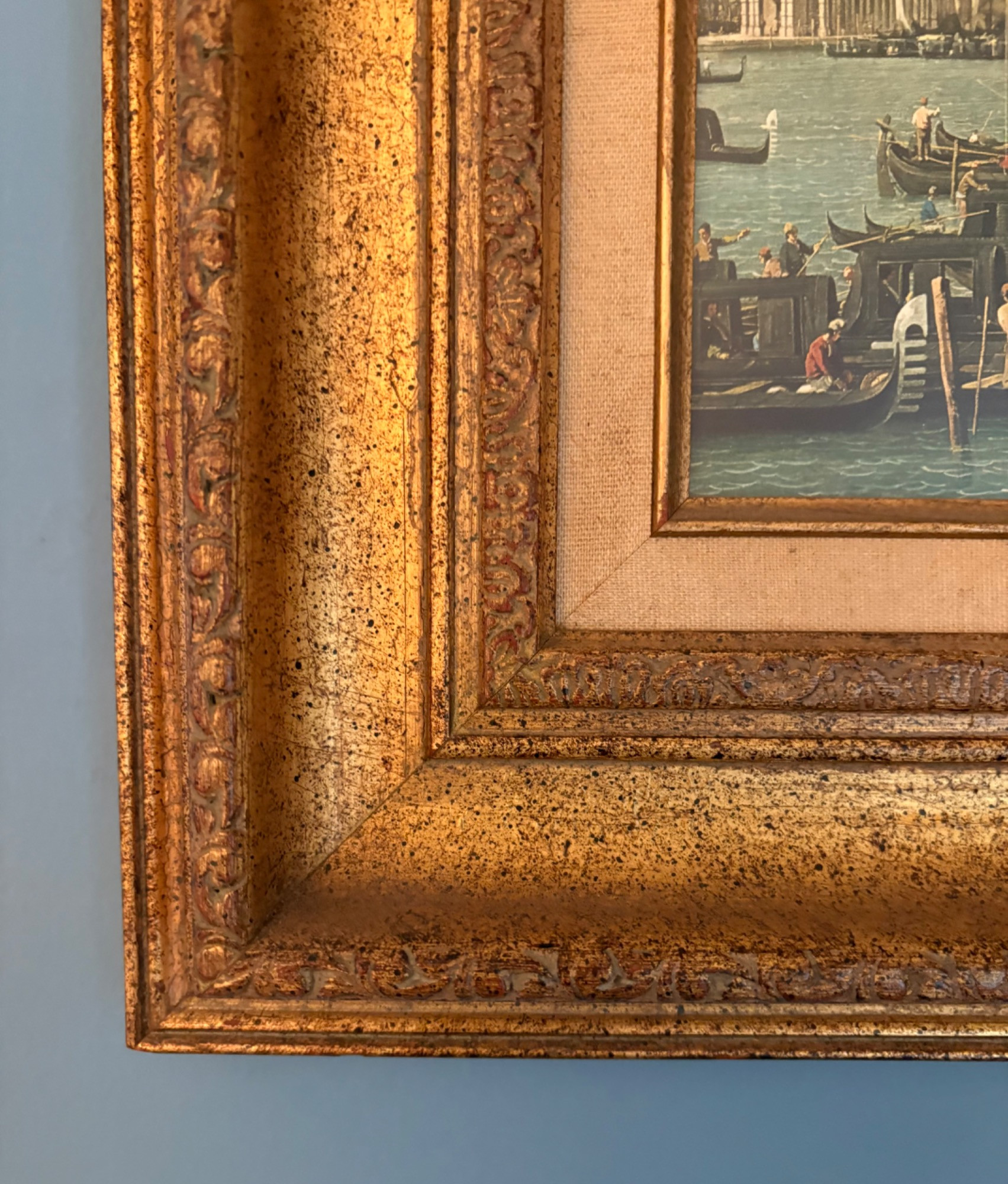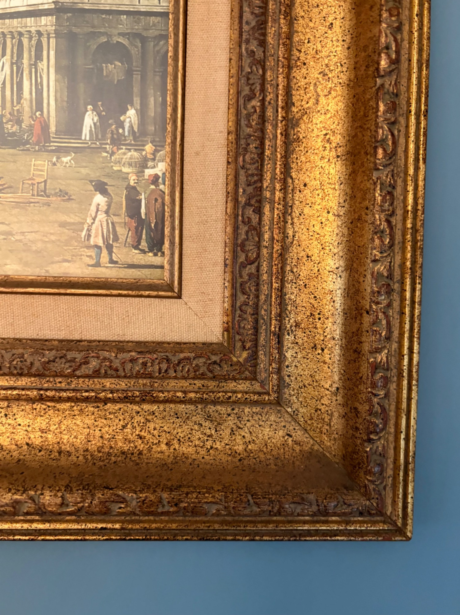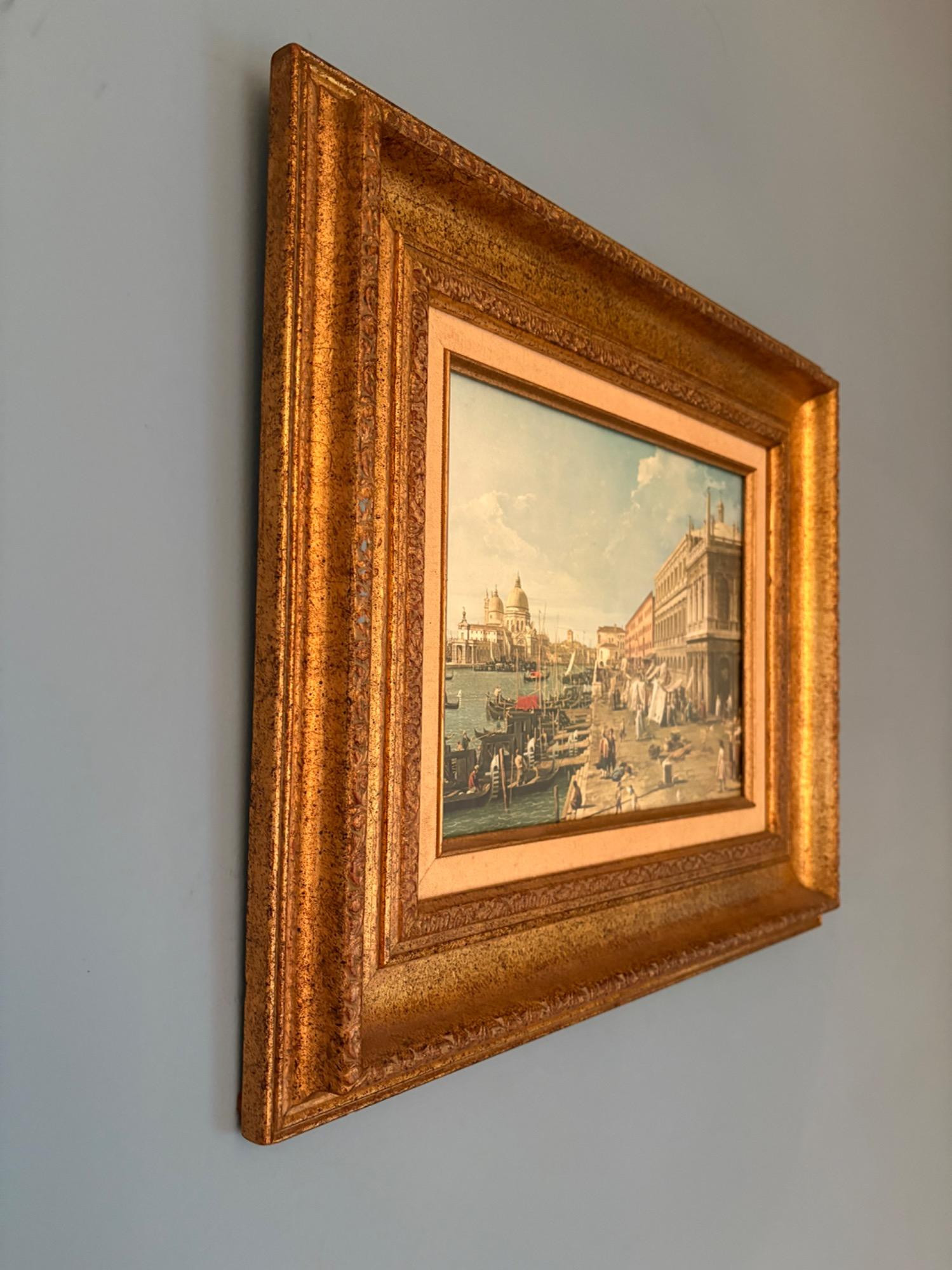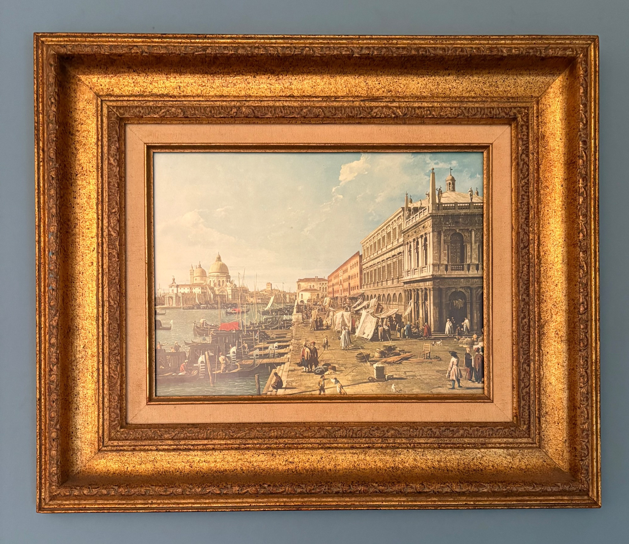 Photolithograph reproduction of a Venice harbor painting by Giovanni Antonio Canal, aka Canaletto (1697 - 1765). It is nicely bordered by a gold double-bordered wood frame. Smaller work - approx. 1.5' W framed. We are usure of the origin of this reproduction - given the frame, we think it might have been from Around the Corner Art but are not certain. Can be shipped FedEx.
