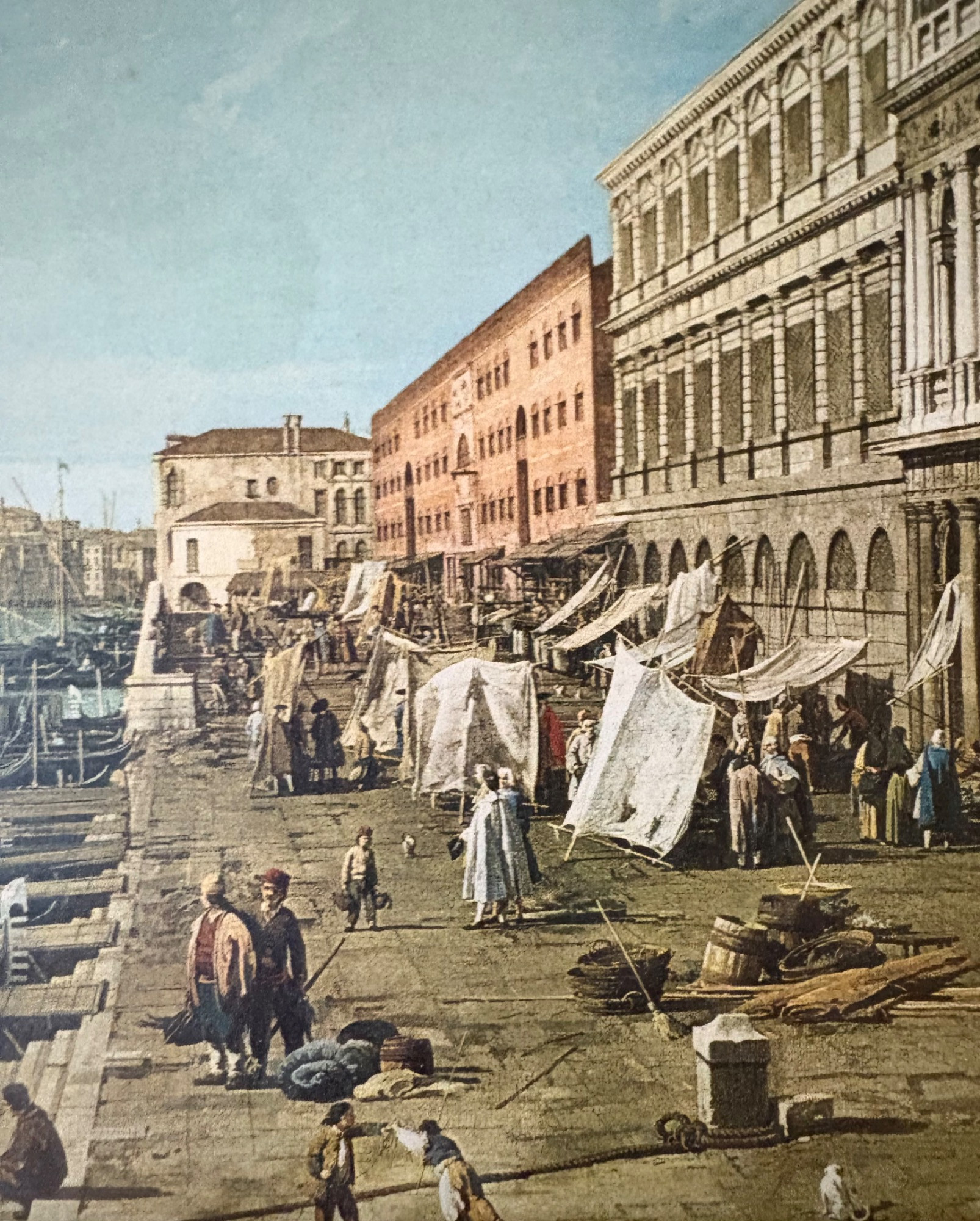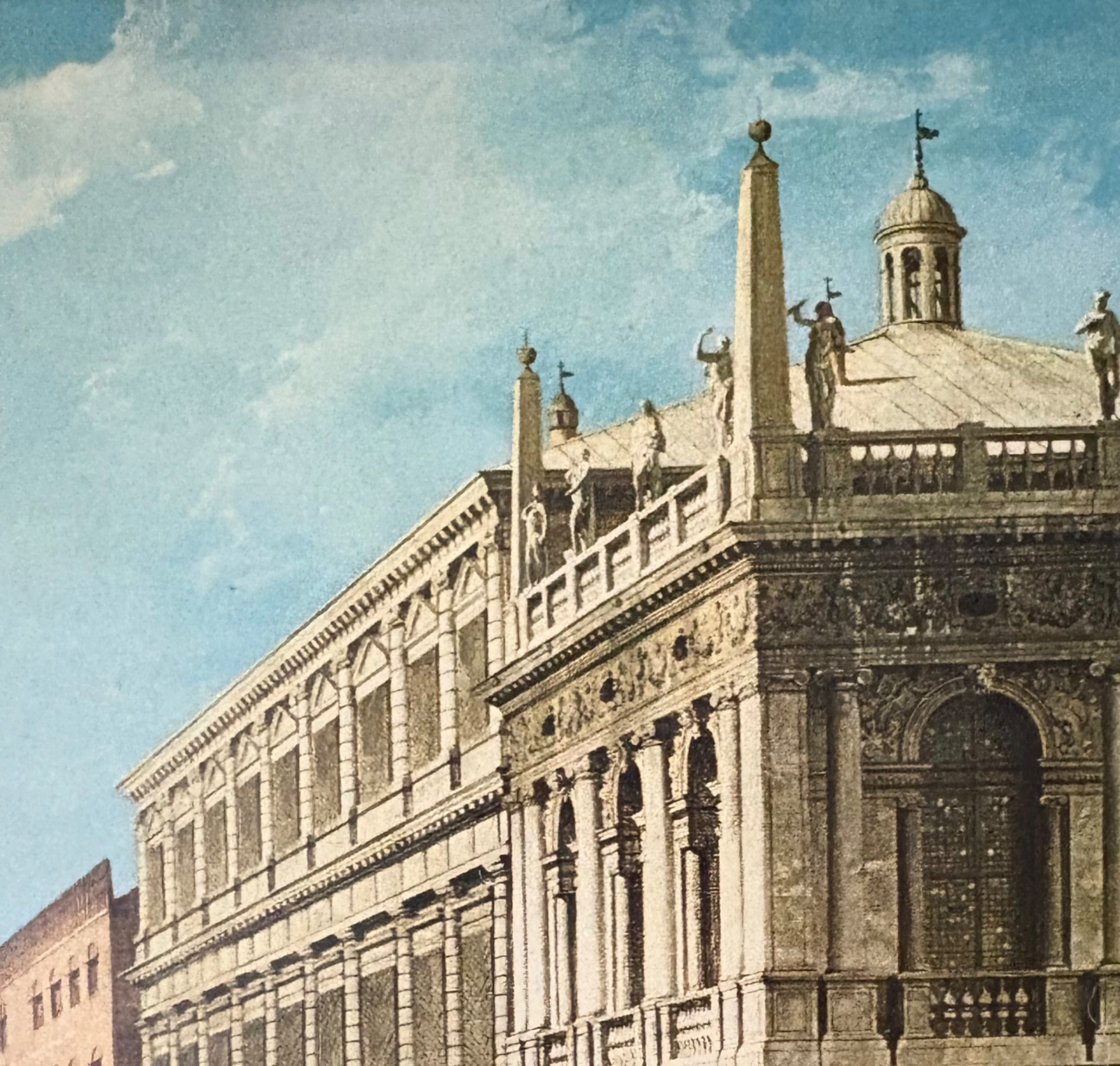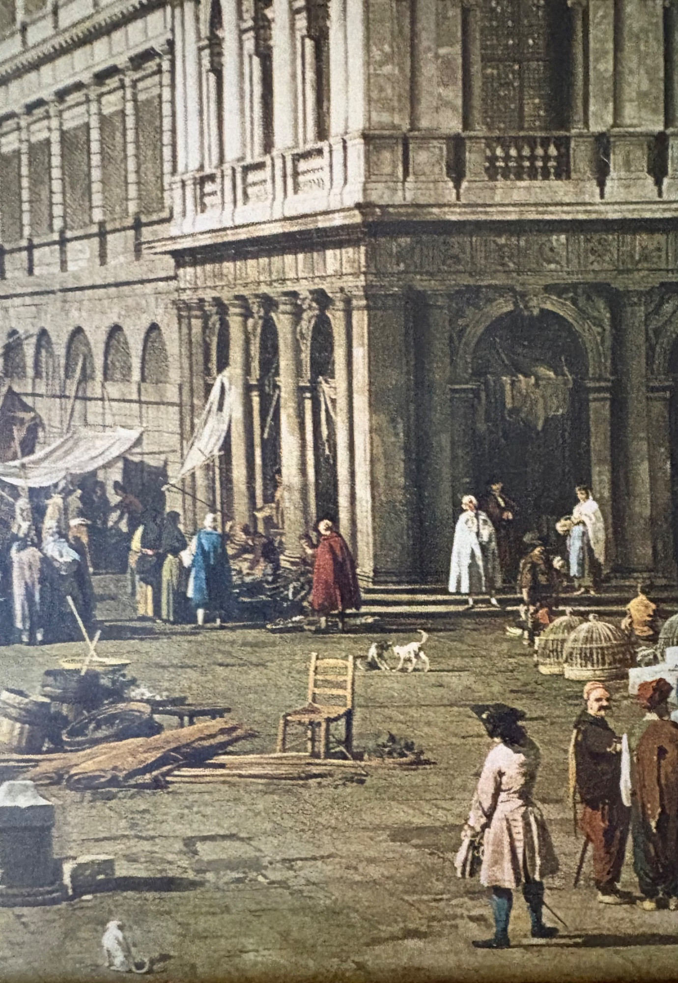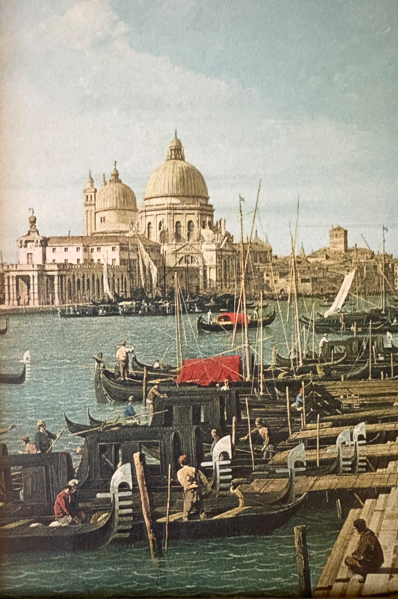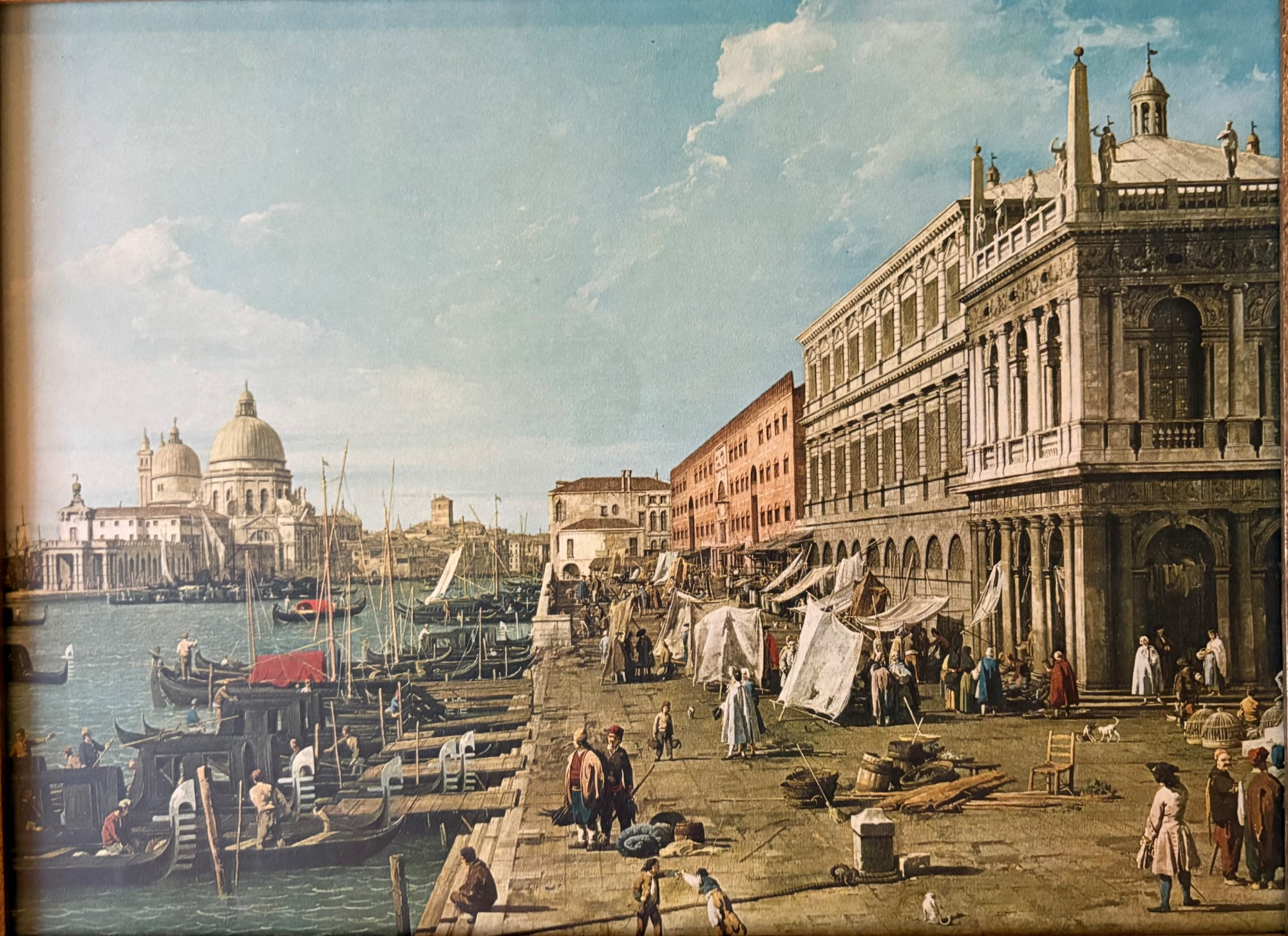 Photolithograph reproduction of a Venice harbor painting by Giovanni Antonio Canal, aka Canaletto (1697 - 1765). It is nicely bordered by a gold double-bordered wood frame. Smaller work - approx. 1.5' W framed. We are usure of the origin of this reproduction - given the frame, we think it might have been from Around the Corner Art but are not certain. Can be shipped FedEx.