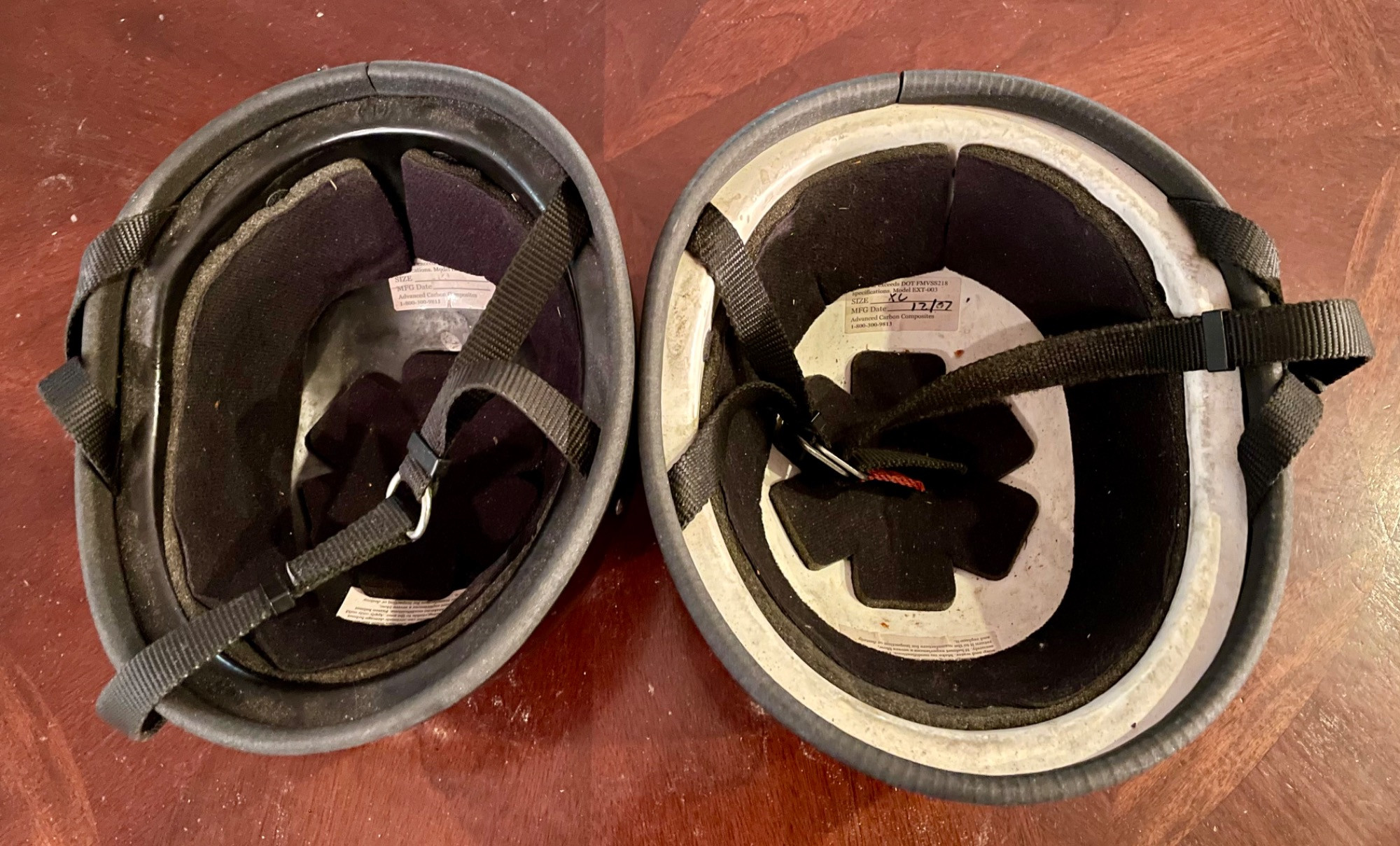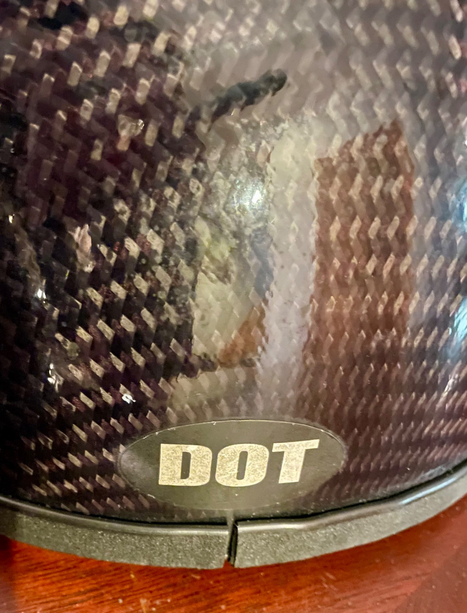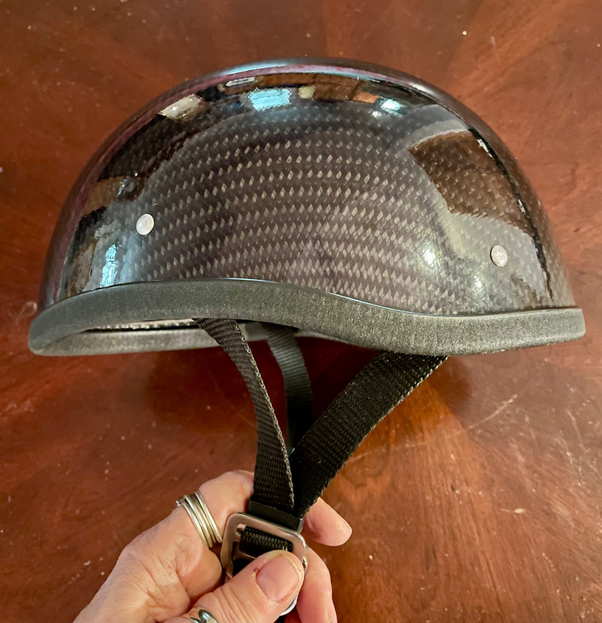 2 half-shell patterned motorcycle helmets from Advanced Carbon Composites - model EXT-003. Both have deep grey/purple patterning and meet DOT specifications. One has no size markings (8.25” measured front to back of interior shell, 7” side to side of interior shell) but we’d say it’s a medium. One marked XL (9” measured front to back of interior shell, 7.25” side to side of interior shell).