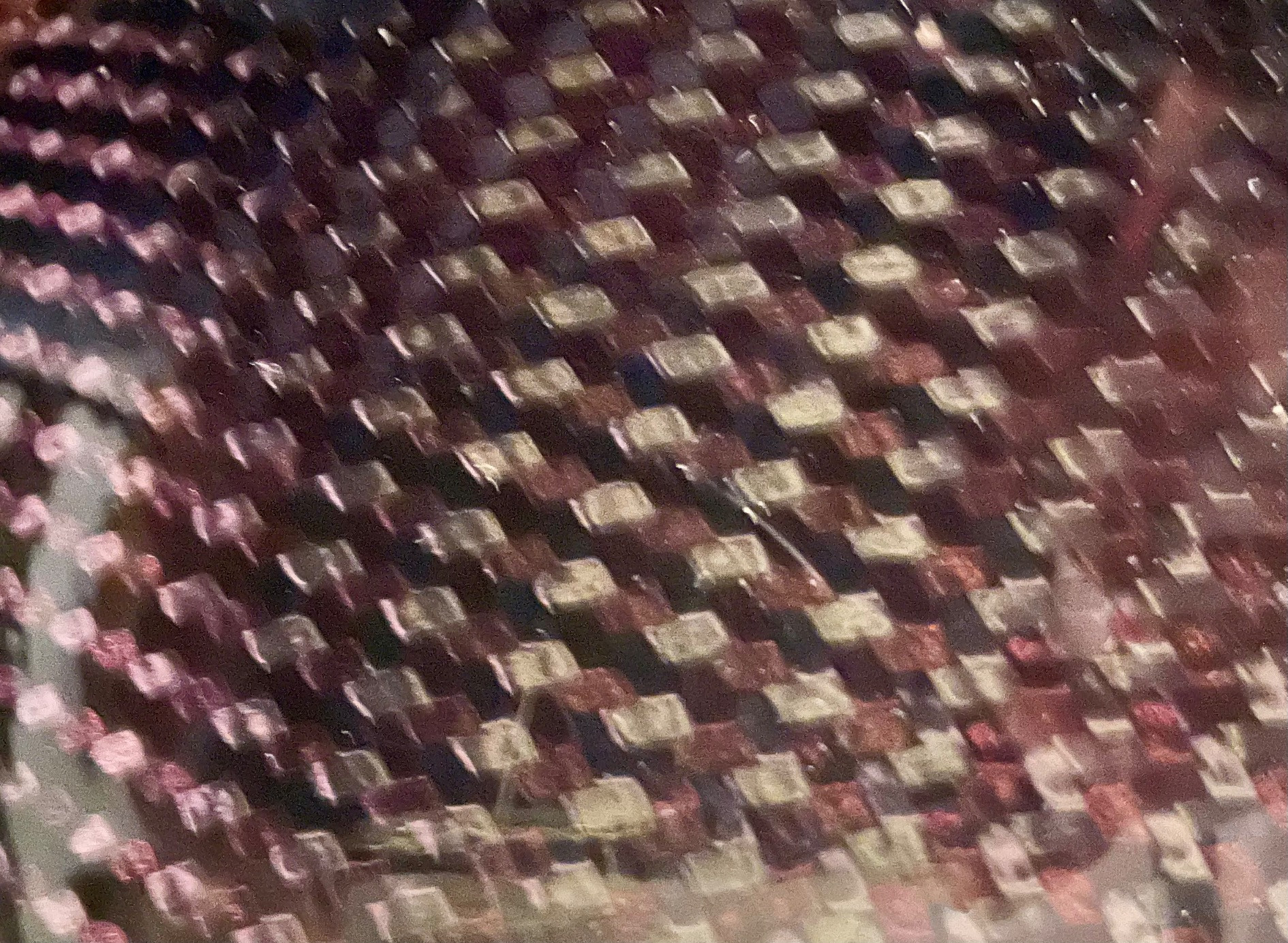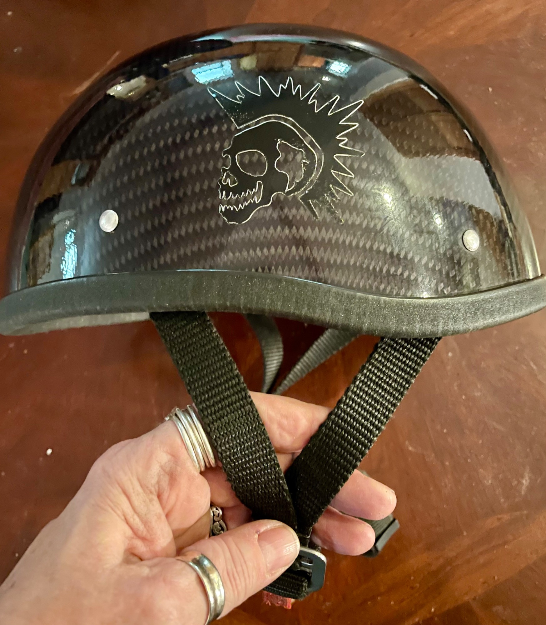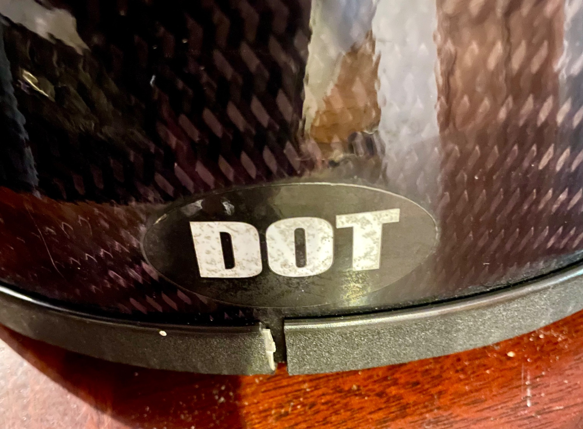 2 half-shell patterned motorcycle helmets from Advanced Carbon Composites - model EXT-003. Both have deep grey/purple patterning and meet DOT specifications. One has no size markings (8.25” measured front to back of interior shell, 7” side to side of interior shell) but we’d say it’s a medium. One marked XL (9” measured front to back of interior shell, 7.25” side to side of interior shell).