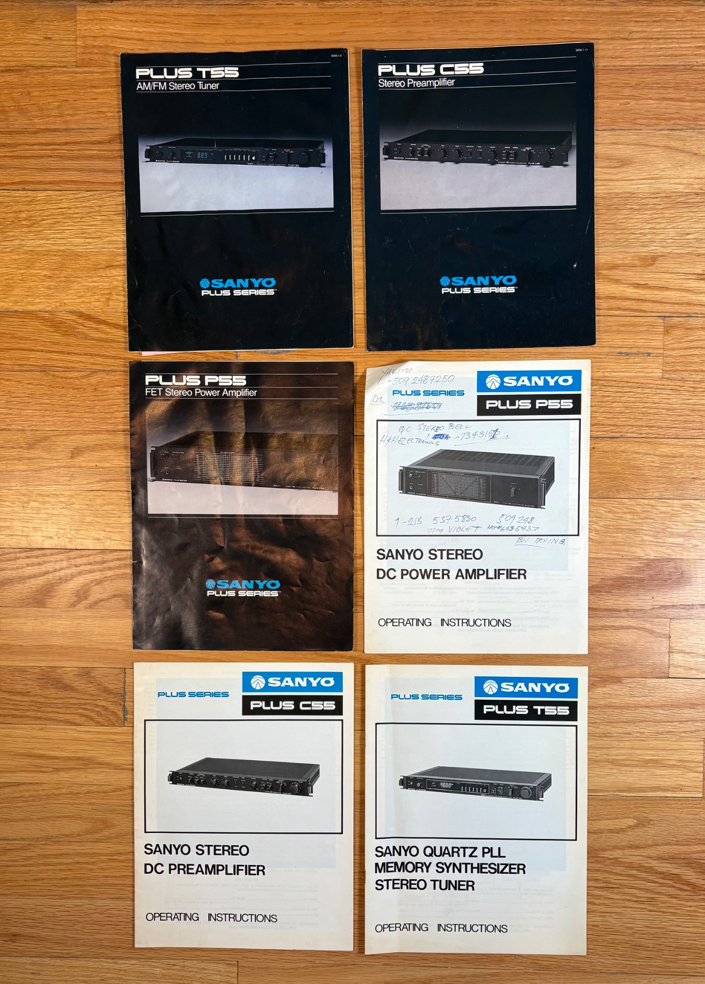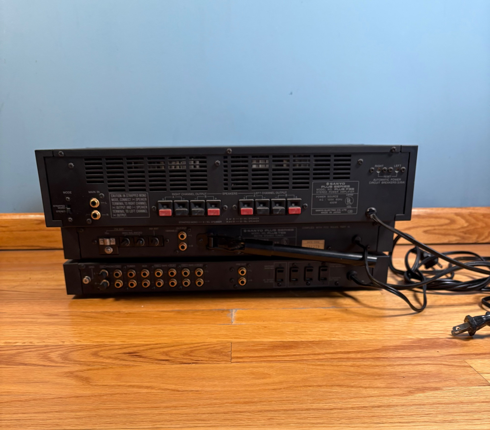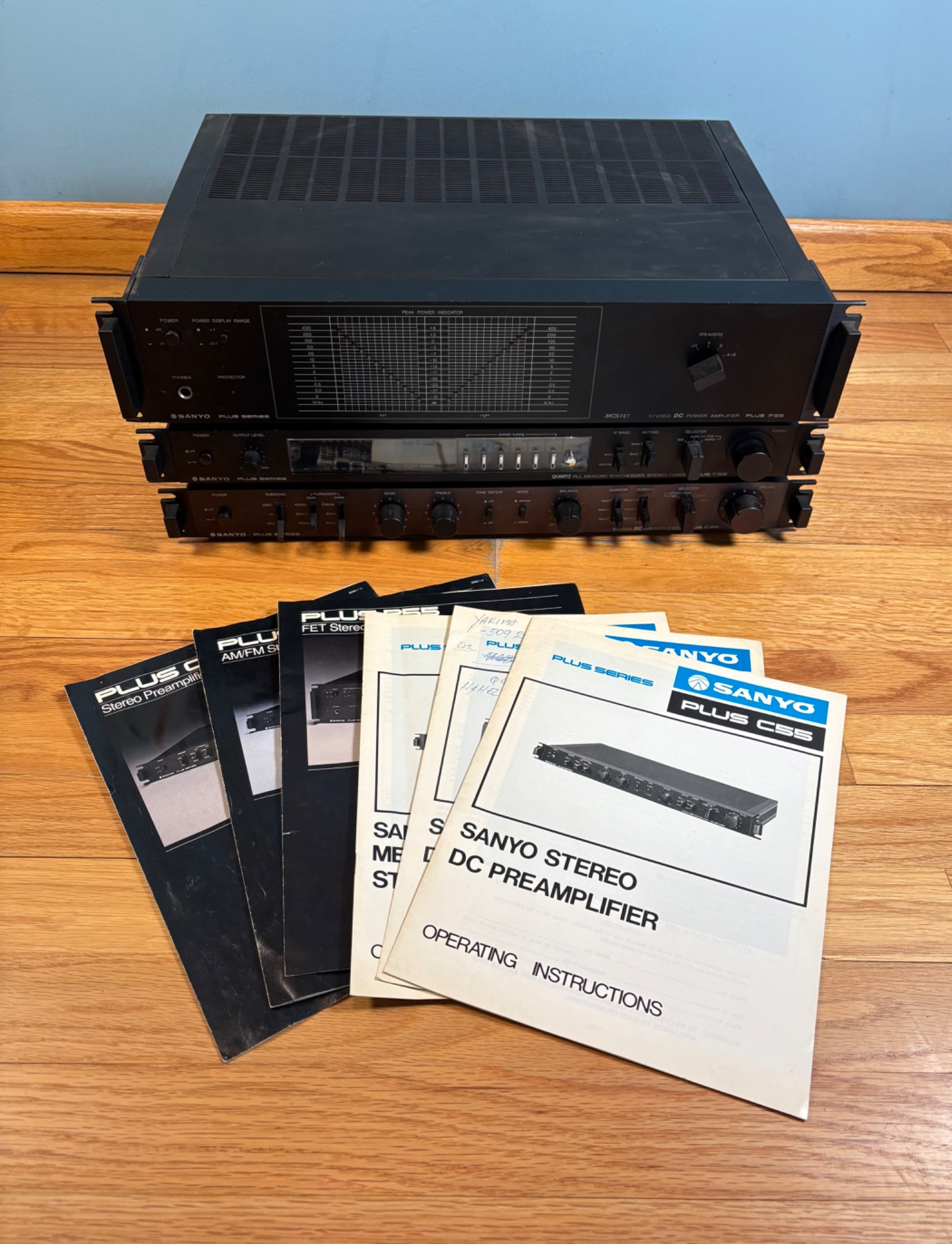 Sanyo Stereo Setup: Sanyo Plus Series MOSFET Stereo DC Power Amplifier Plus P55. Powers on. Sanyo Plus Series Quartz PLL Memory Synthesizer Stereo Tuner Plus T55. Powers on but flickers on LED screen. Sanyo Plus Series Stereo DC Preamplifier C55. Powers on.