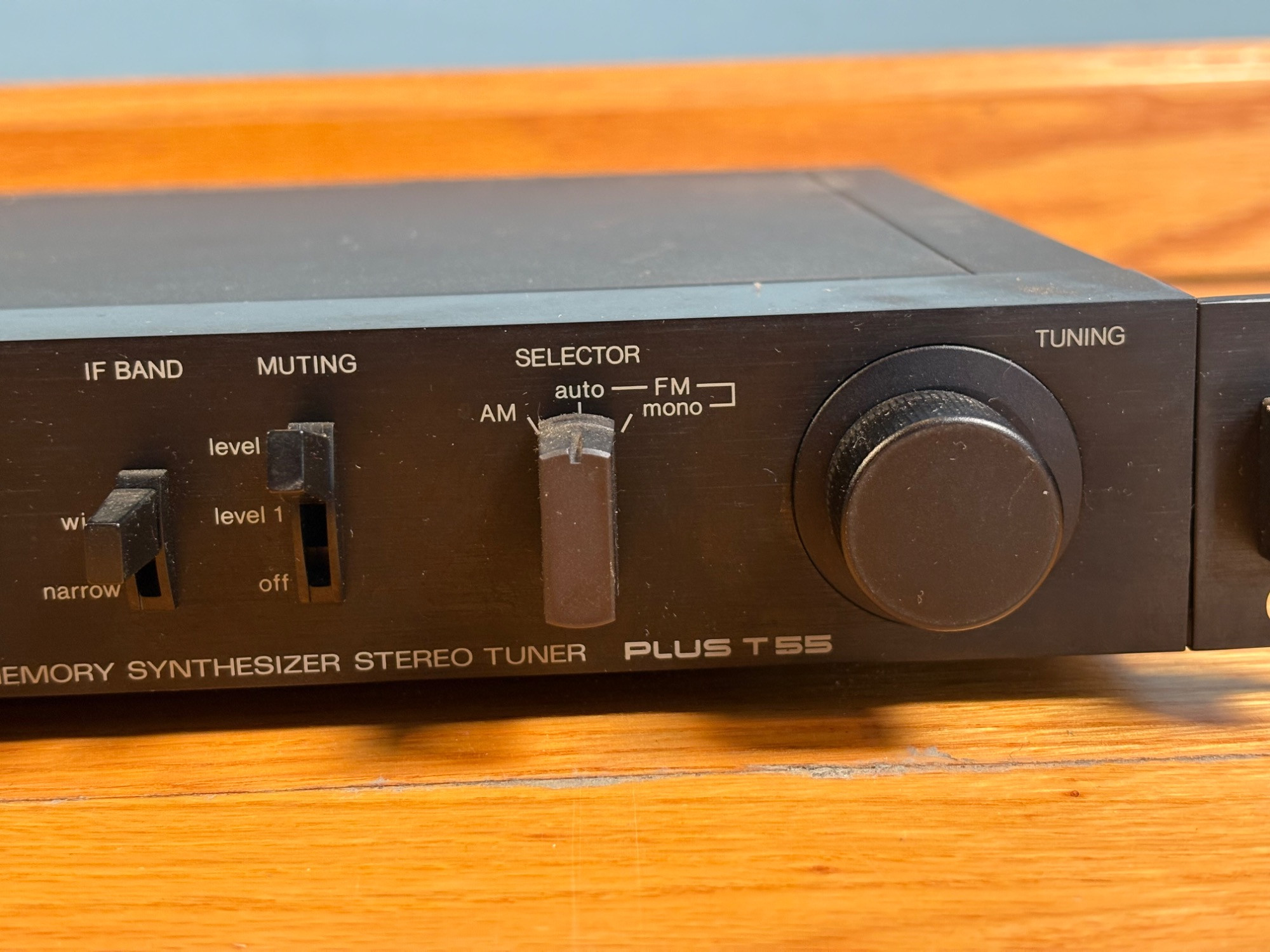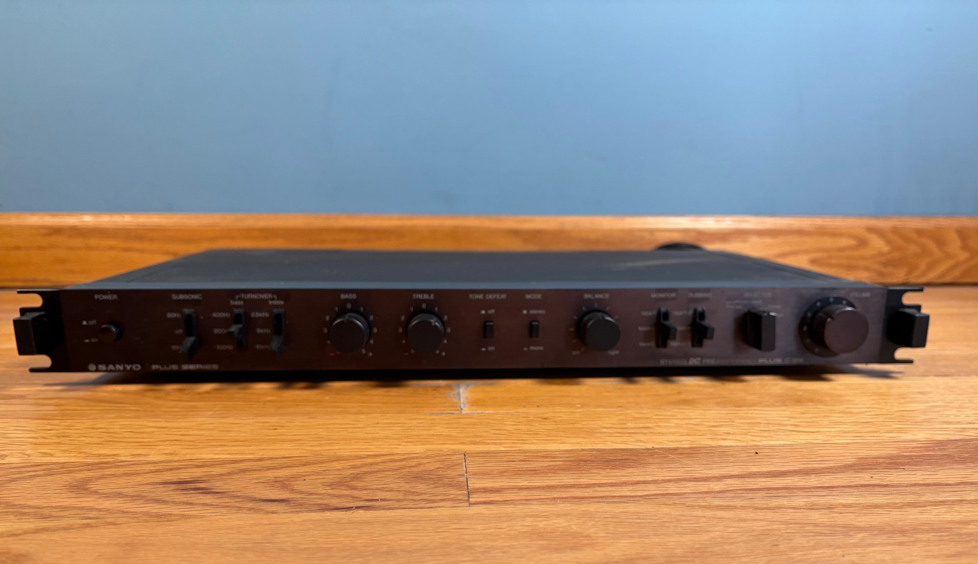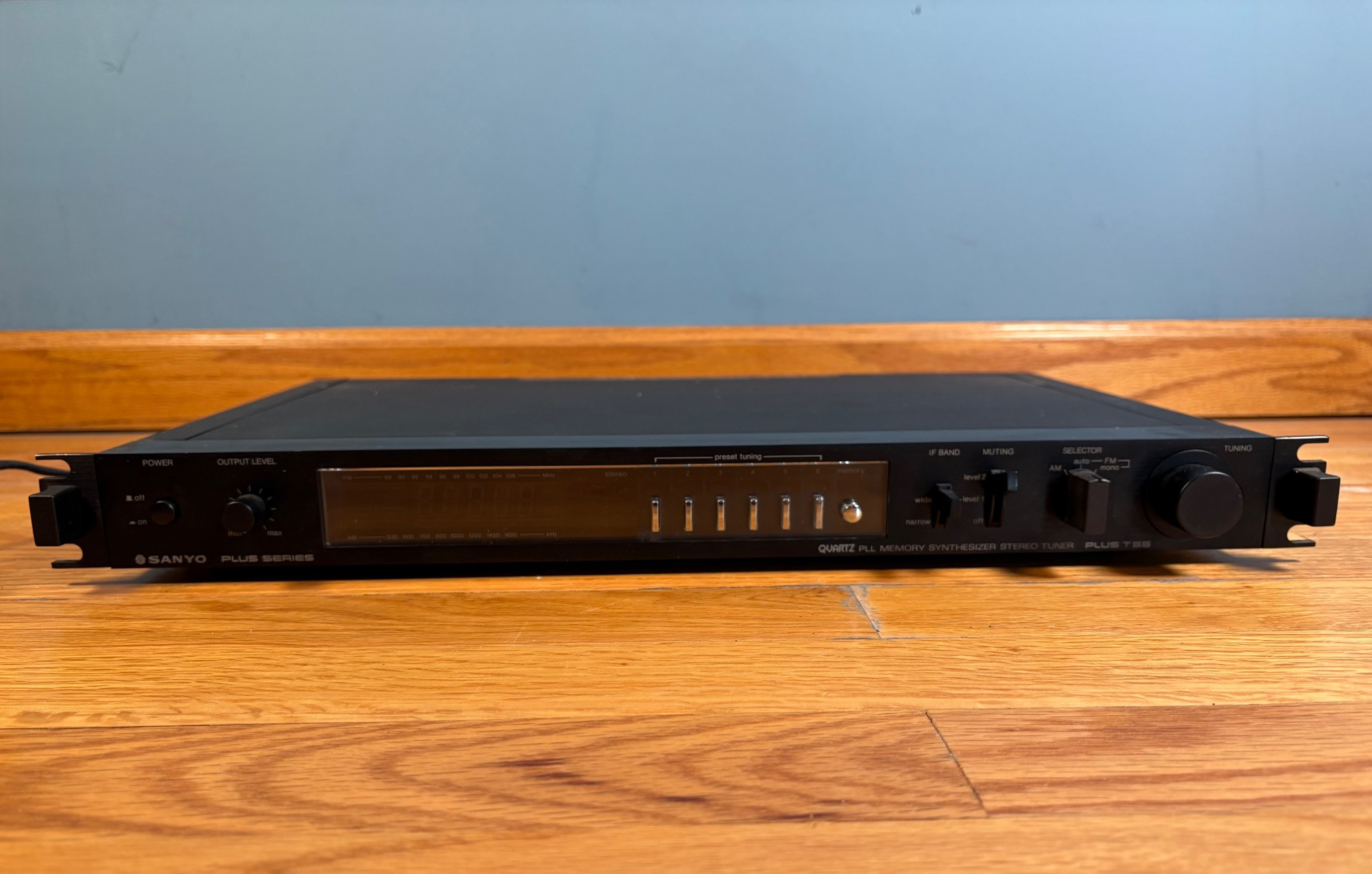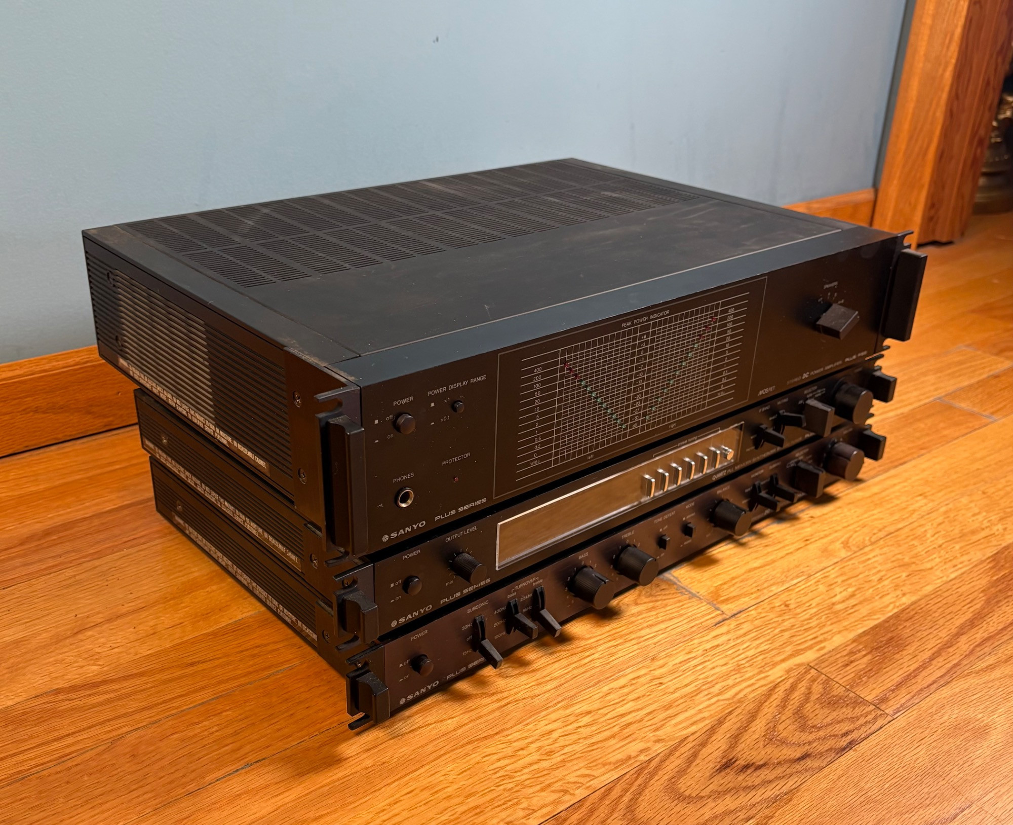 Sanyo Stereo Setup: Sanyo Plus Series MOSFET Stereo DC Power Amplifier Plus P55. Powers on. Sanyo Plus Series Quartz PLL Memory Synthesizer Stereo Tuner Plus T55. Powers on but flickers on LED screen. Sanyo Plus Series Stereo DC Preamplifier C55. Powers on.