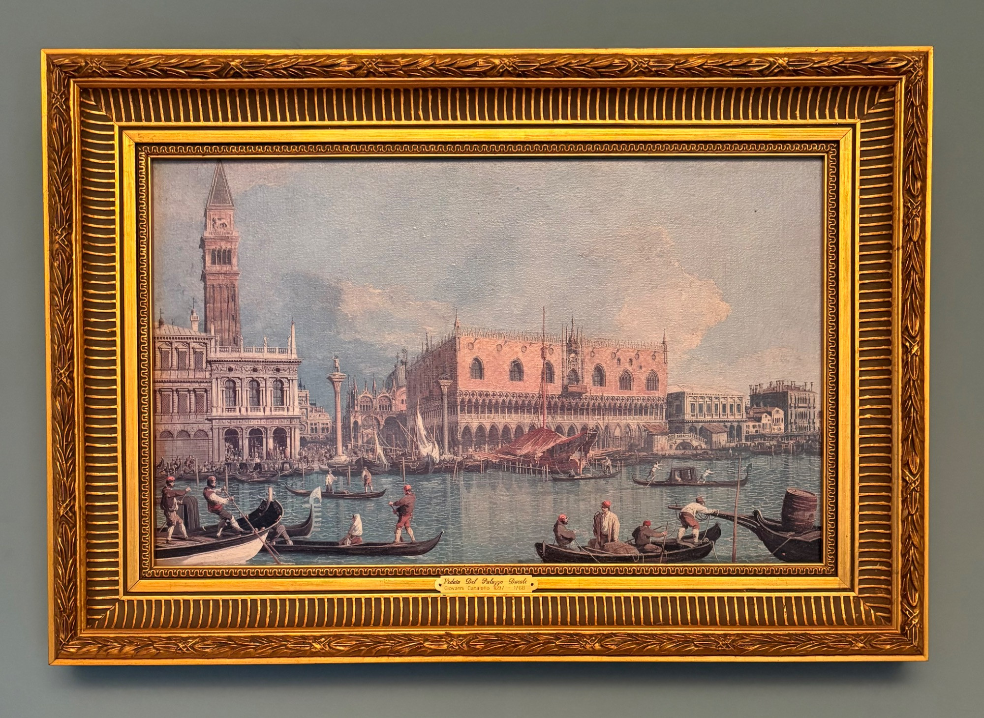 “Veduta Del Palazzo Ducale” Giovanni Antonio Canal, aka Canaletto (1697 - 1765) Reproduction painting on canvas in elaborate gold wood frame. We are usure of the origin of this reproduction - given the frame, we think it might have been from Around the Corner Fine Art but are not certain. Can be shipped FedEx.
