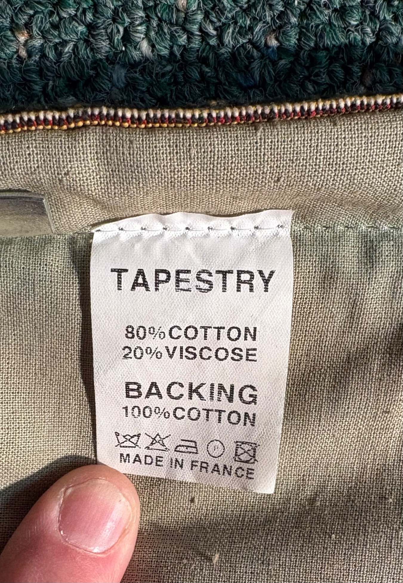 Vintage tapestry showing what could be an Italian garden landscape w a view to the sea. Garden urn planter and a classic stone pergola featured. It is quite large - about 3.5' high by 4.5' wide. Nice tight weave & fully lined. Made in France. Note: All tapestries listed in this auction are in good condition, but all would benefit from a good wash.