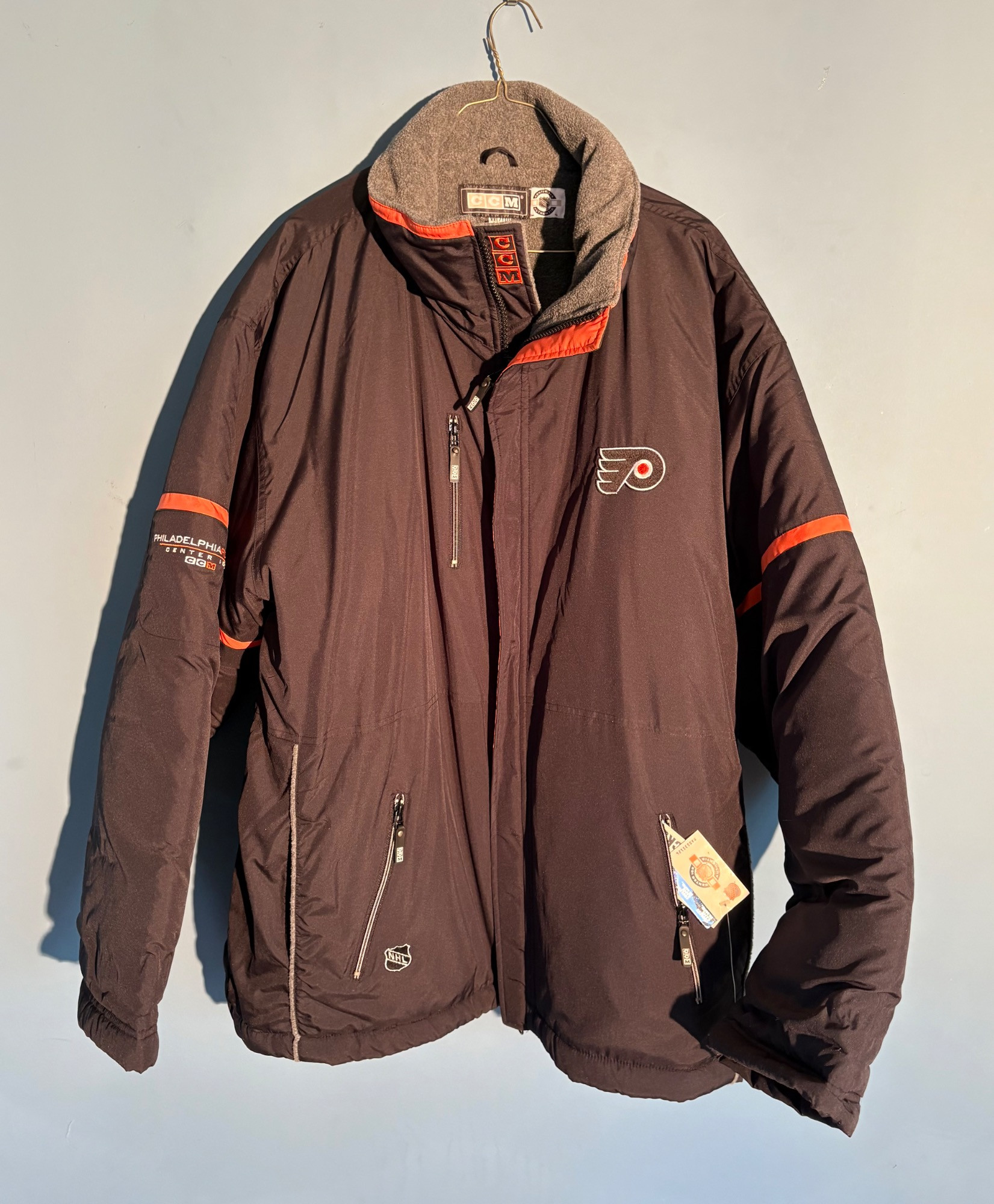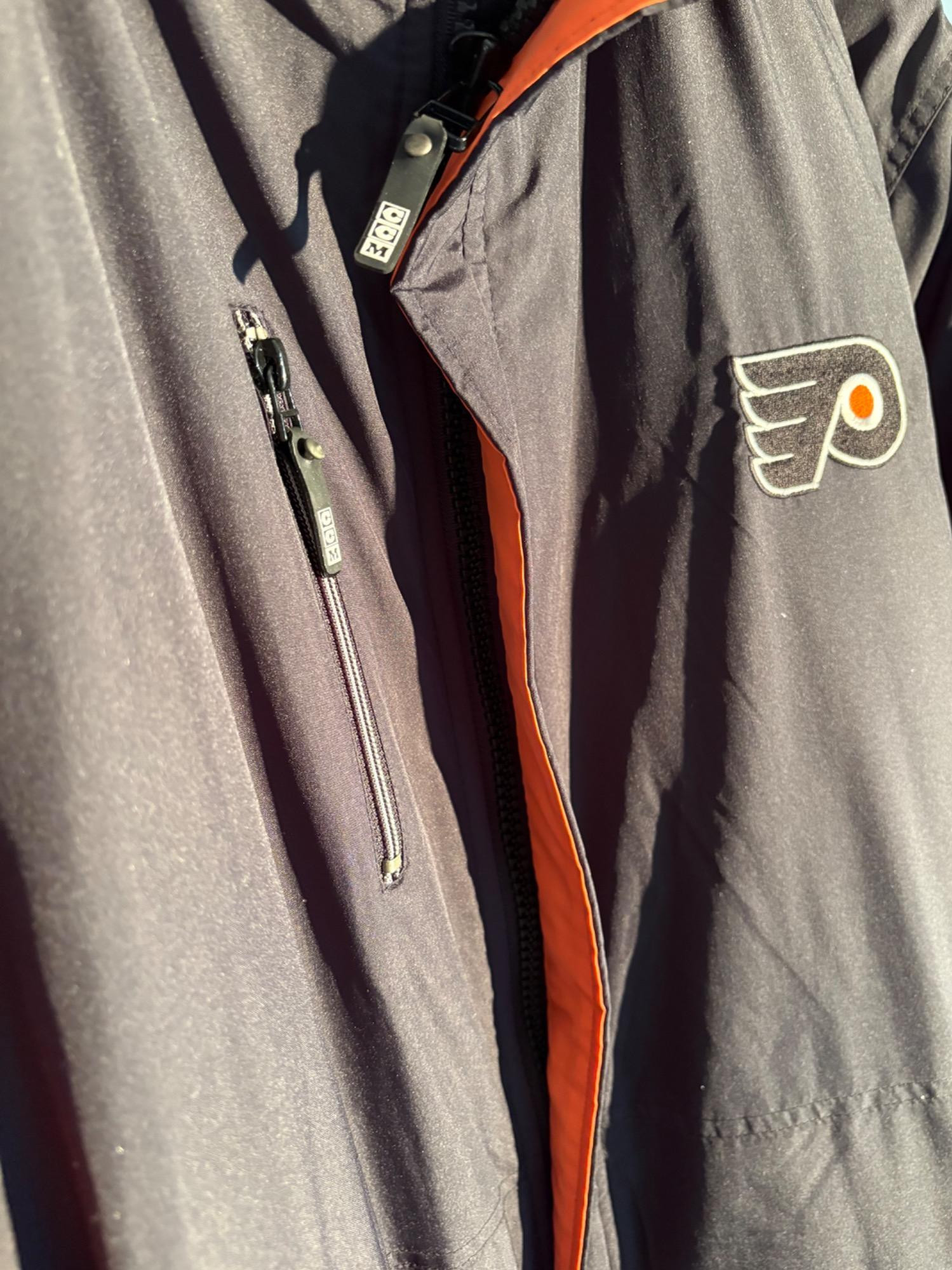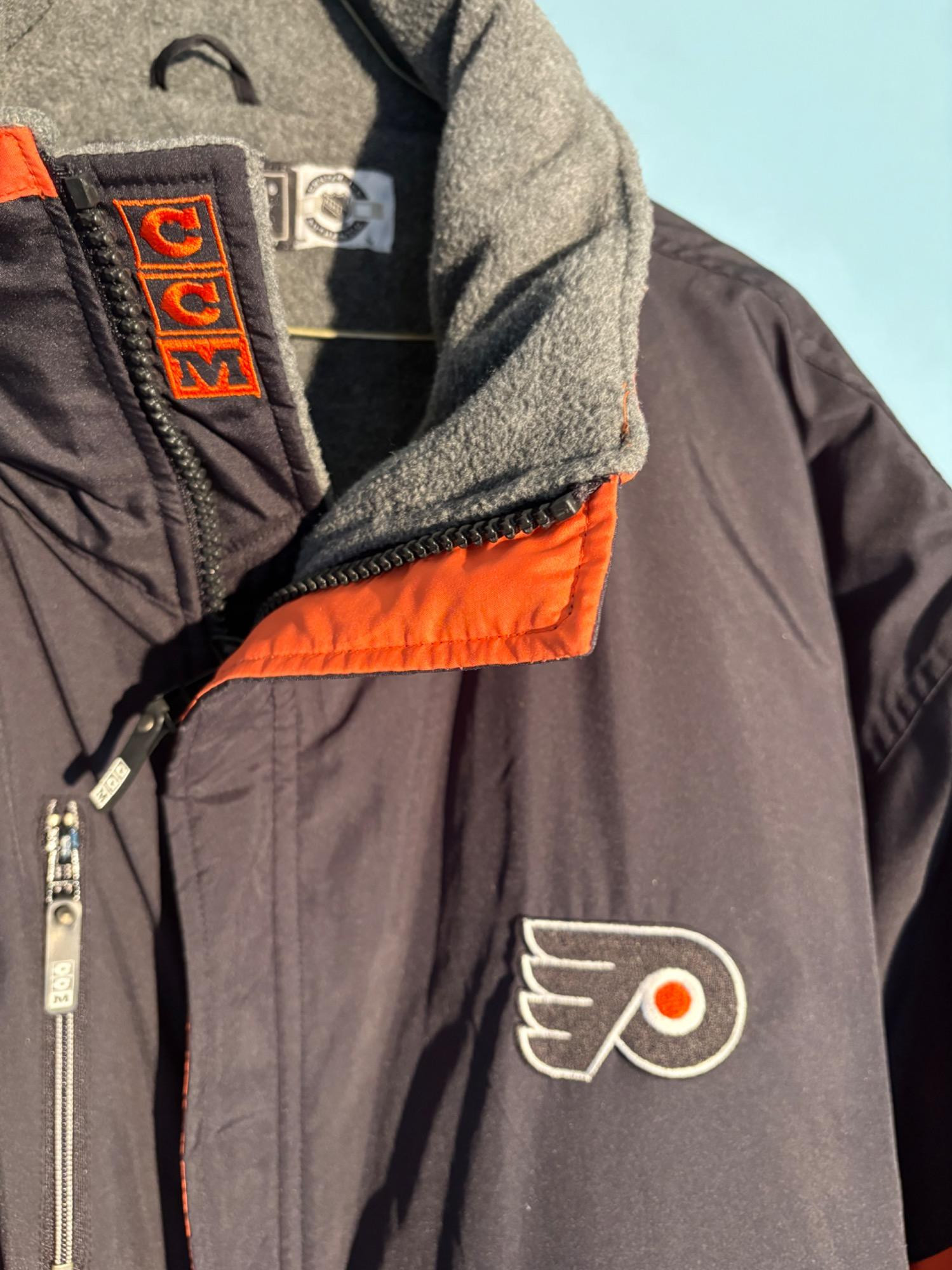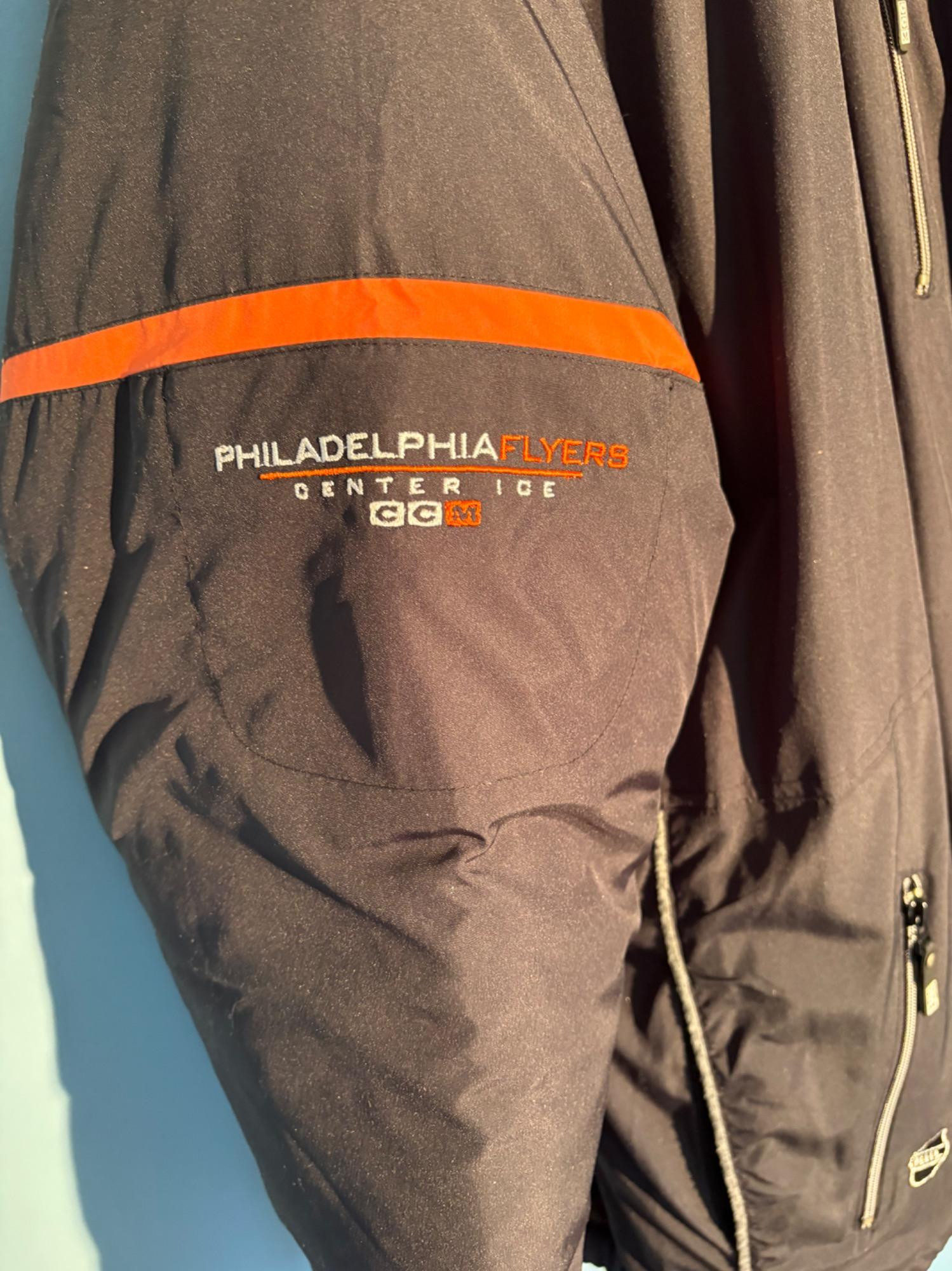 Pristine CCM brand Philadelphia Flyers hockey jacket in black. New with tags. Zip front placket breast, zipper pocket, hip pockets, and Flyers logo on the left breast. In black with orange highlights under the placket and on the sleeves. Inside lining is gray polar fleece. Embroidery on right sleeve says "Philadelphia Flyers Center Ice". CCM logo is in several places, including the hang band on the back neck and along the front zipper placket. Terrific warm winter jacket in a hard-to-find size. Men’s size XXL - pit to pit measurement is almost 30". NOTE: the coat is actually a deep saturated black - our flash washed the color out for the pictures taken against the blue wall.