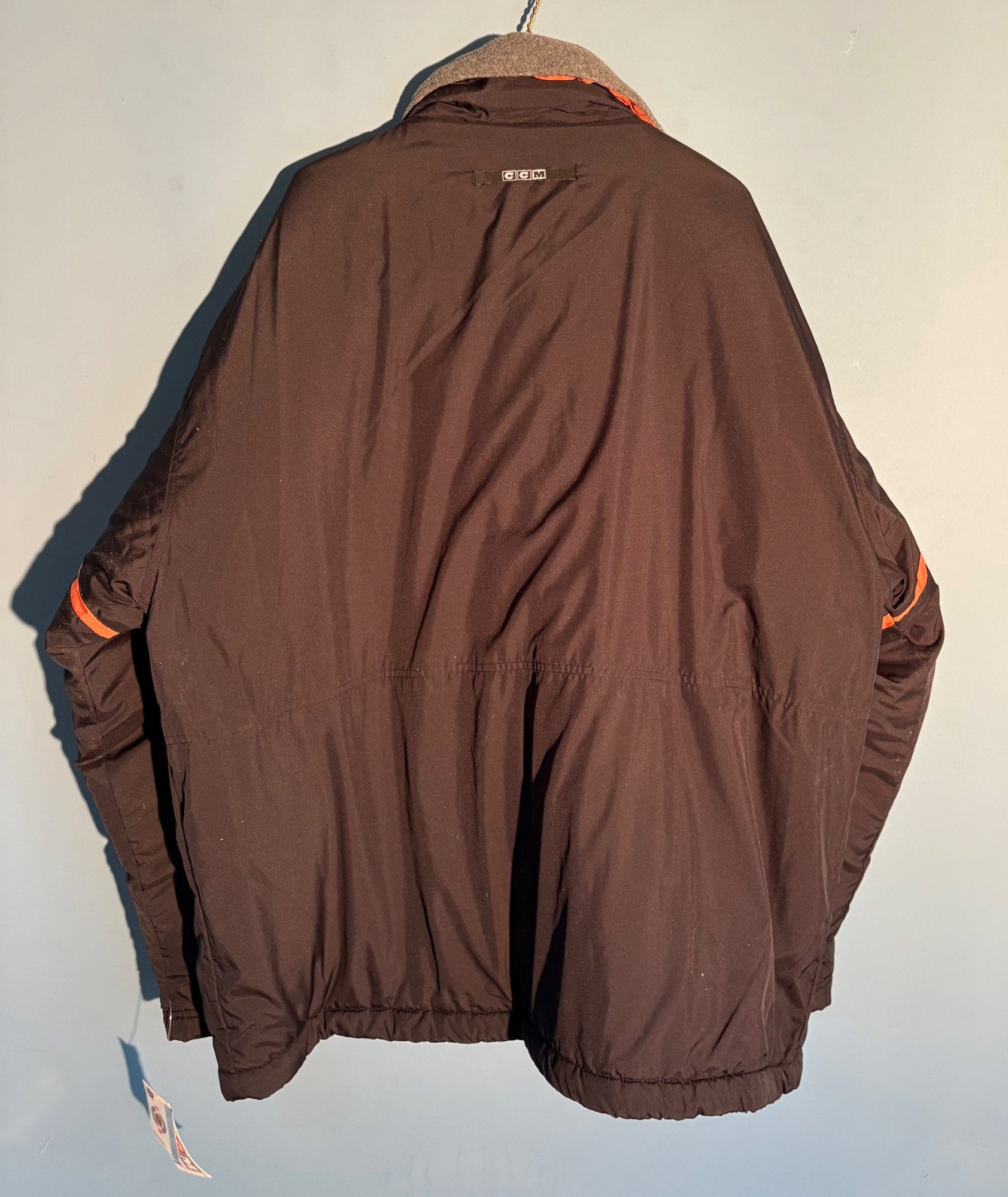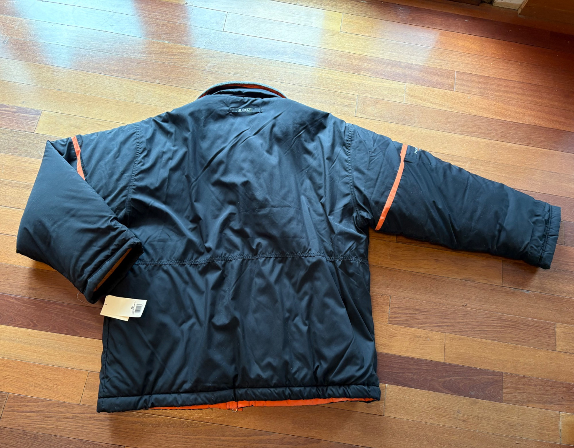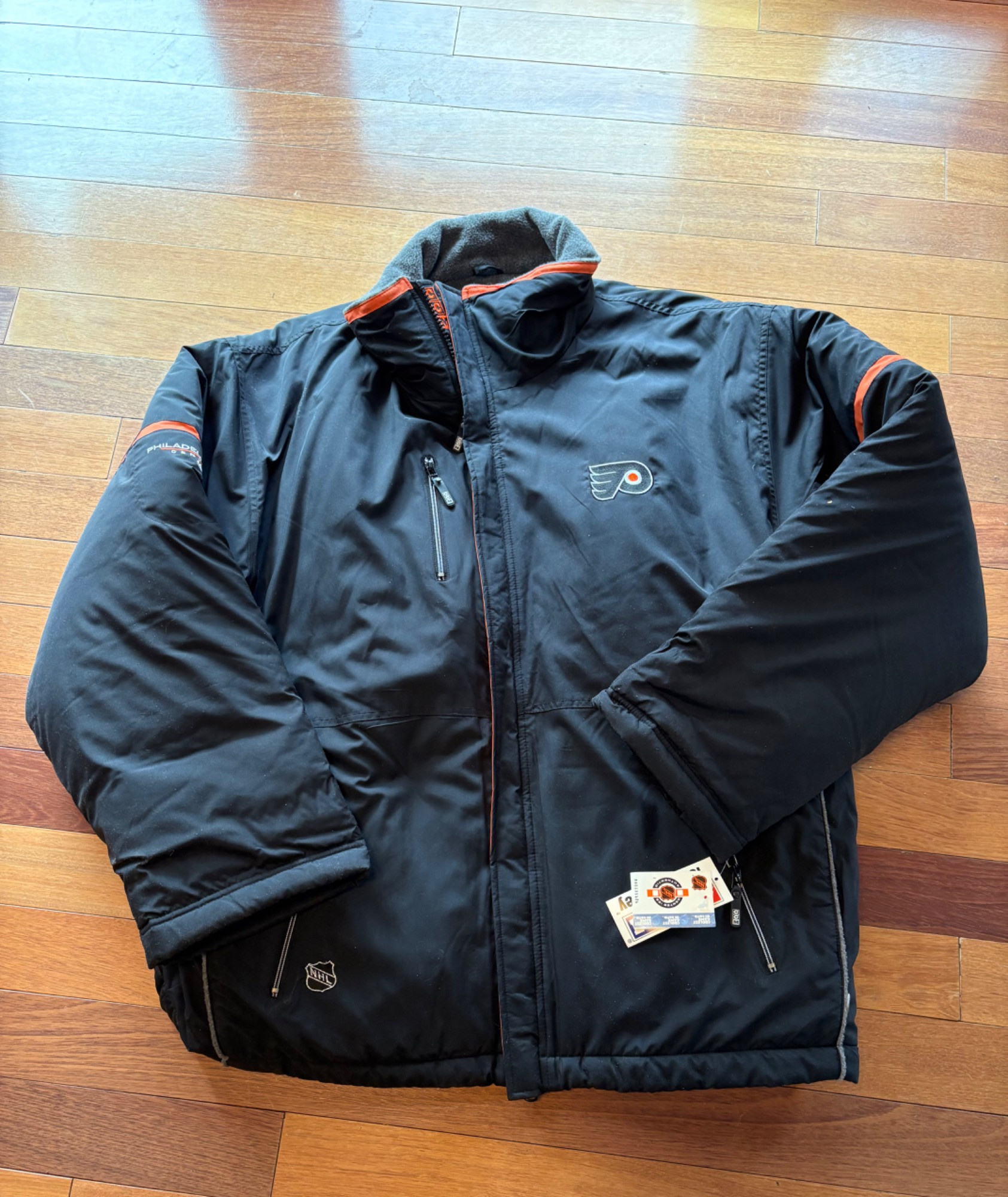 Pristine CCM brand Philadelphia Flyers hockey jacket in black. New with tags. Zip front placket breast, zipper pocket, hip pockets, and Flyers logo on the left breast. In black with orange highlights under the placket and on the sleeves. Inside lining is gray polar fleece. Embroidery on right sleeve says "Philadelphia Flyers Center Ice". CCM logo is in several places, including the hang band on the back neck and along the front zipper placket. Terrific warm winter jacket in a hard-to-find size. Men’s size XXL - pit to pit measurement is almost 30". NOTE: the coat is actually a deep saturated black - our flash washed the color out for the pictures taken against the blue wall.