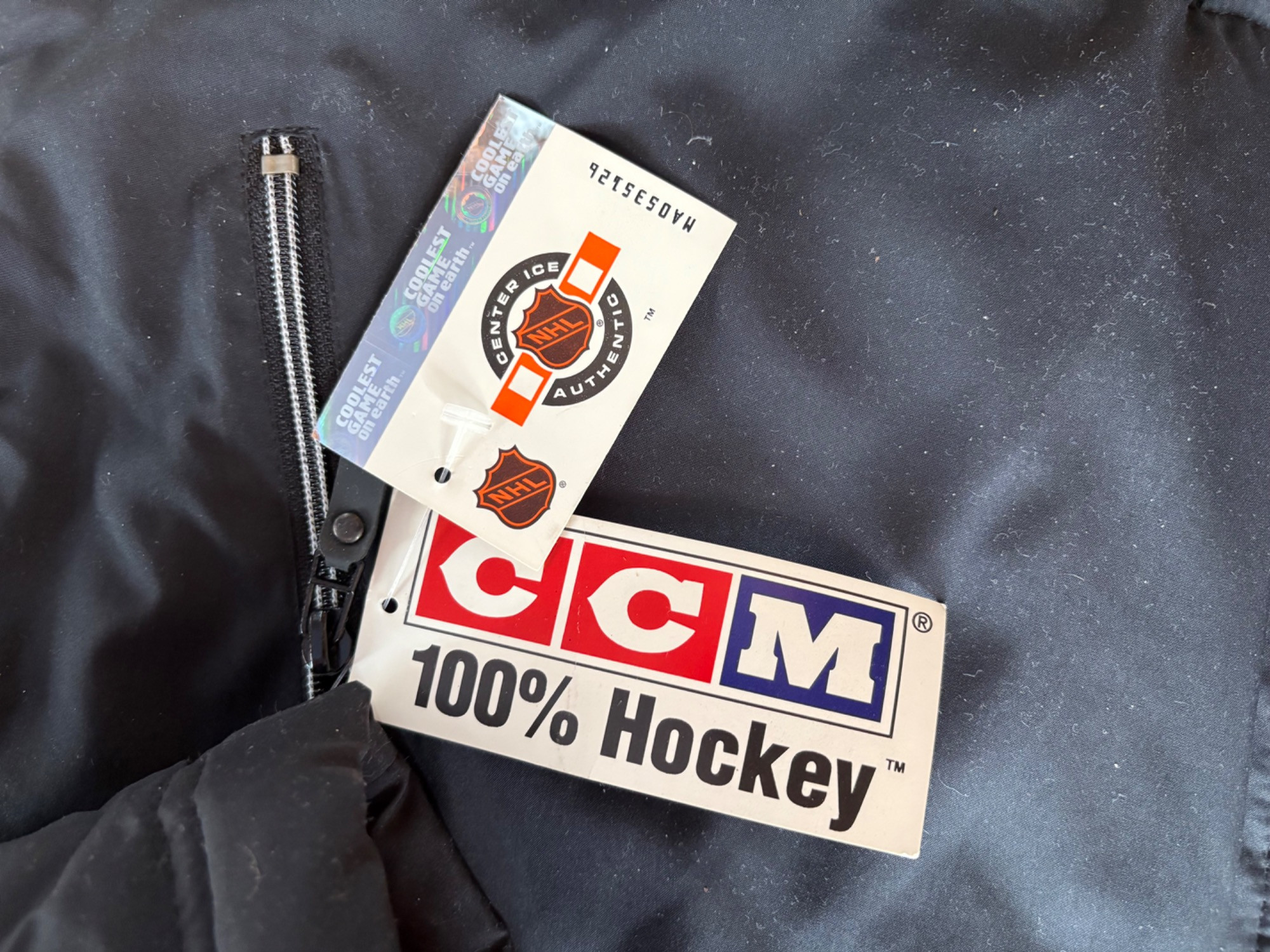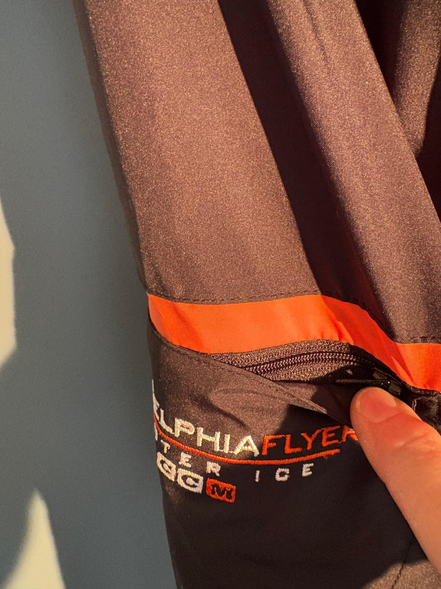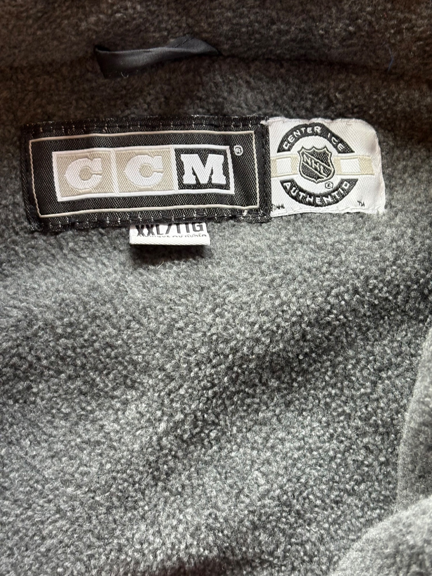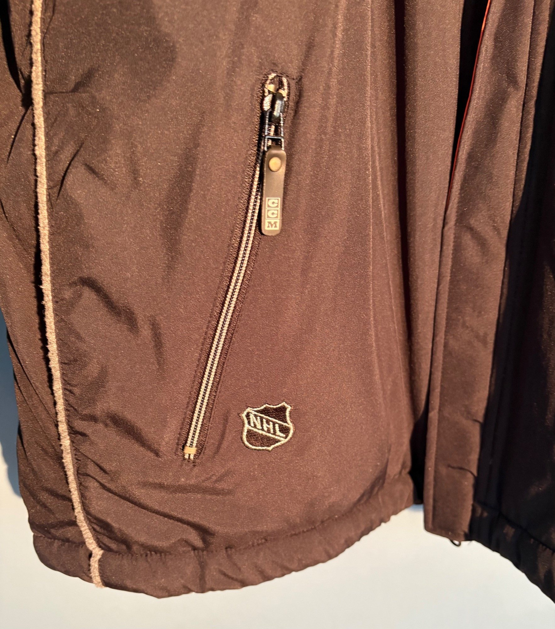 Pristine CCM brand Philadelphia Flyers hockey jacket in black. New with tags. Zip front placket breast, zipper pocket, hip pockets, and Flyers logo on the left breast. In black with orange highlights under the placket and on the sleeves. Inside lining is gray polar fleece. Embroidery on right sleeve says "Philadelphia Flyers Center Ice". CCM logo is in several places, including the hang band on the back neck and along the front zipper placket. Terrific warm winter jacket in a hard-to-find size. Men’s size XXL - pit to pit measurement is almost 30". NOTE: the coat is actually a deep saturated black - our flash washed the color out for the pictures taken against the blue wall.