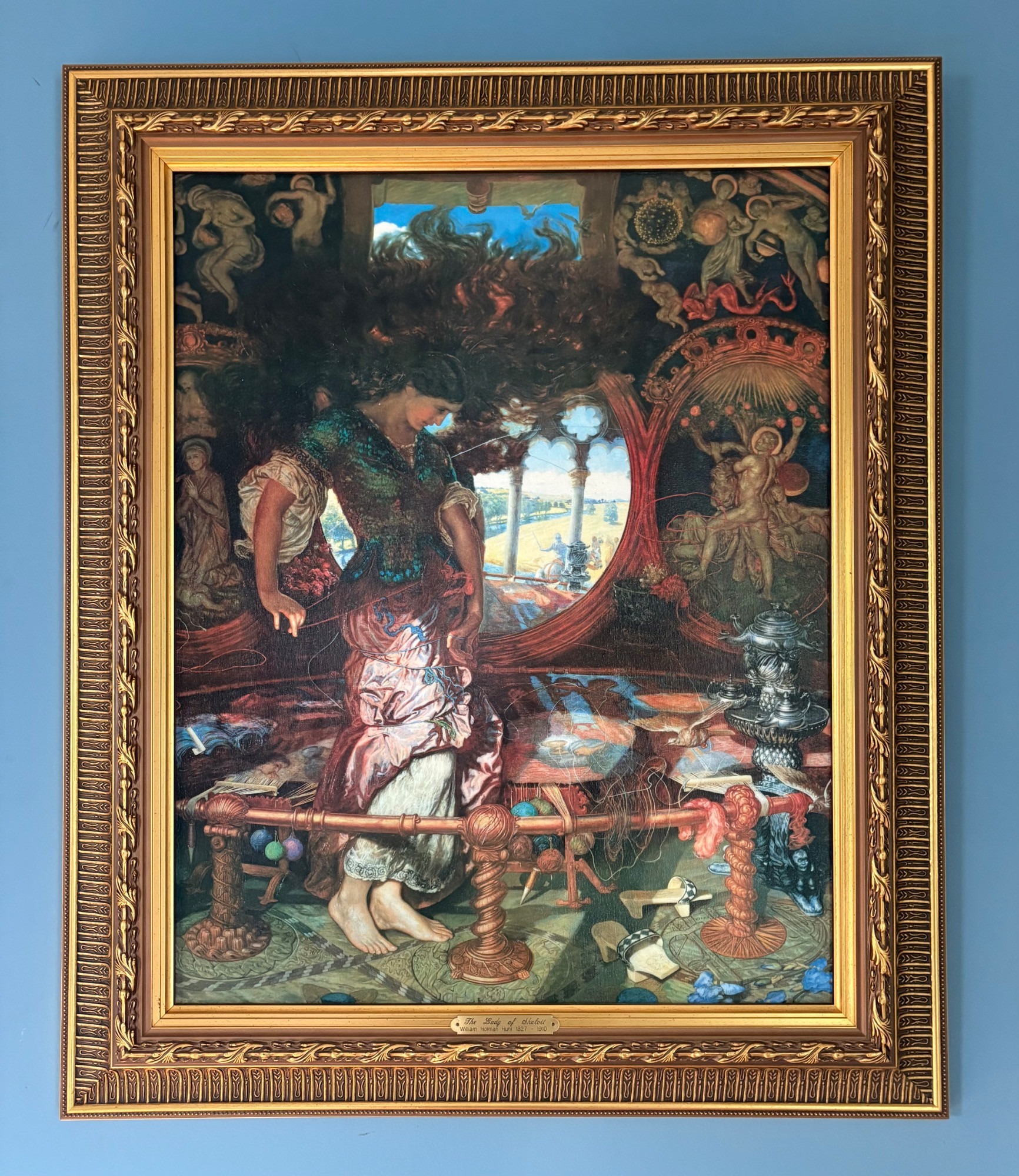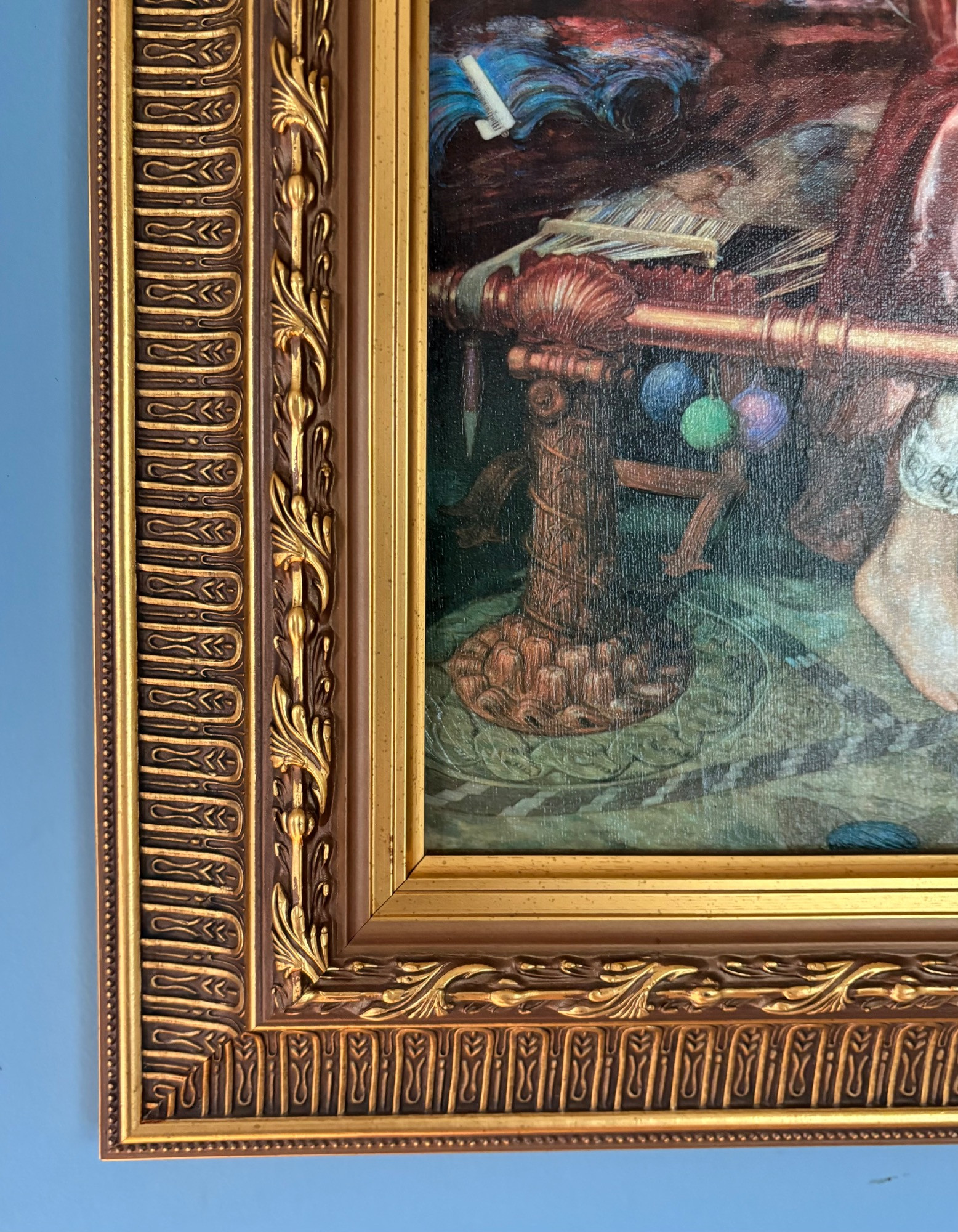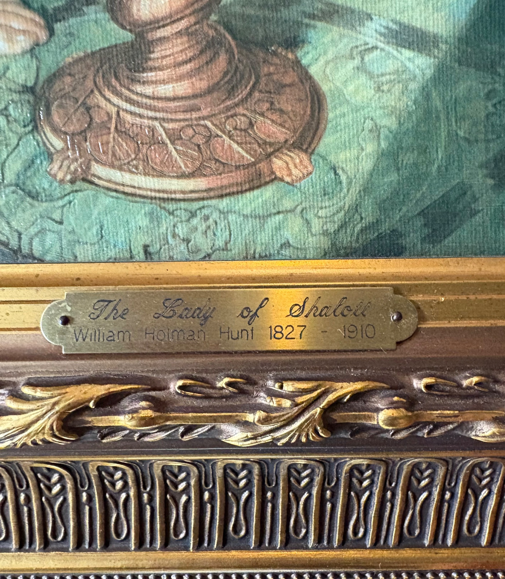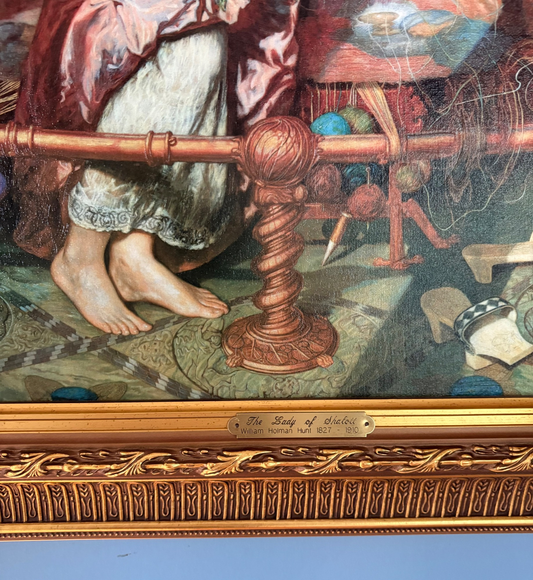 “The Lady of Shalott” by William Holman Hunt (1927 - 1910). Reproduction painting on canvas with typical pre-Raphaelite subject matter - Tennyson's Lady of Shalott. Surrounded by a multi-patterned ornately carved wood frame. Substantial in size at approx. 2.5' H framed. We are usure of the origin of this reproduction - we think it might have been from Around the Corner Art and then framed locally, but are not certain. Can be shipped FedEx.