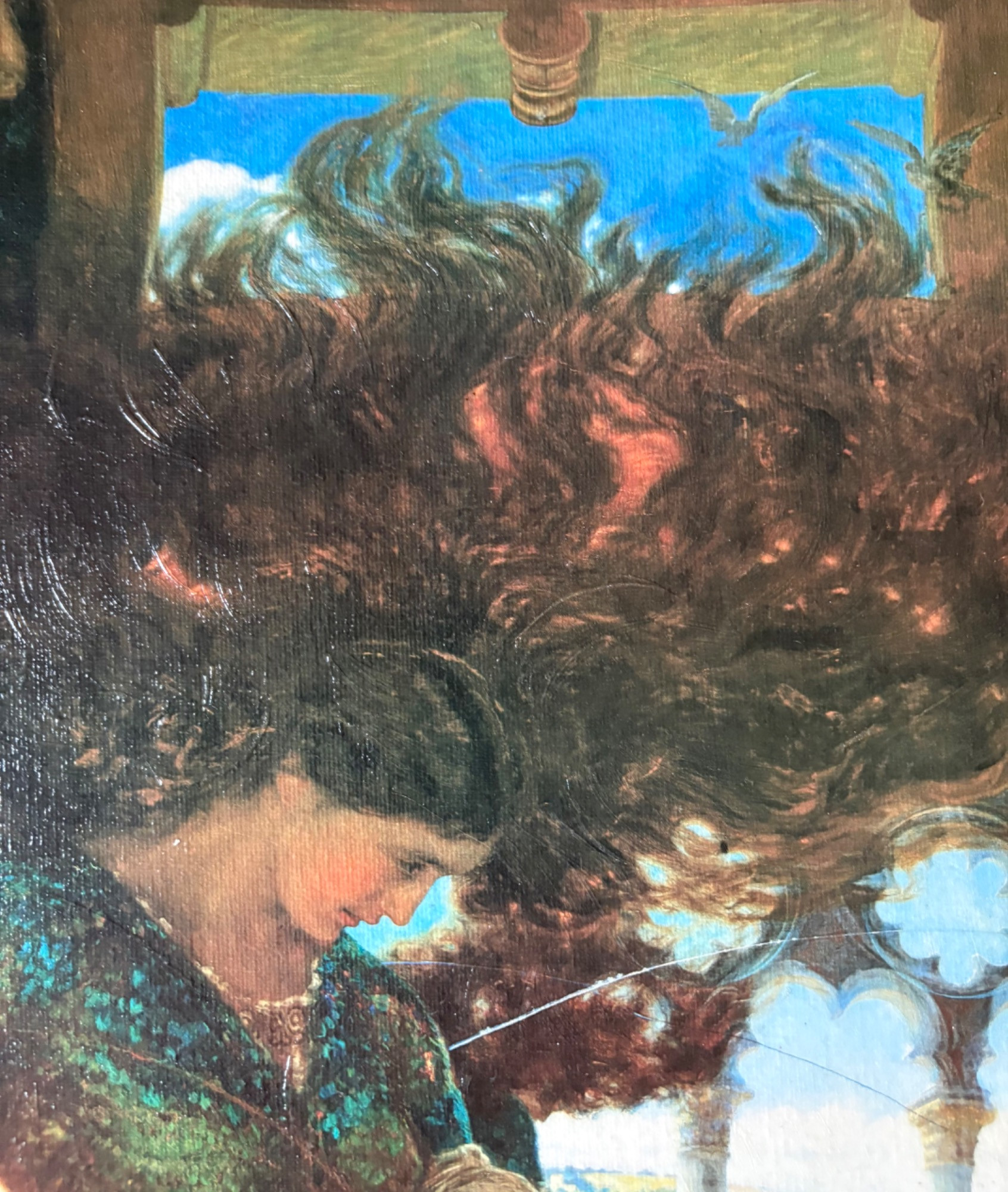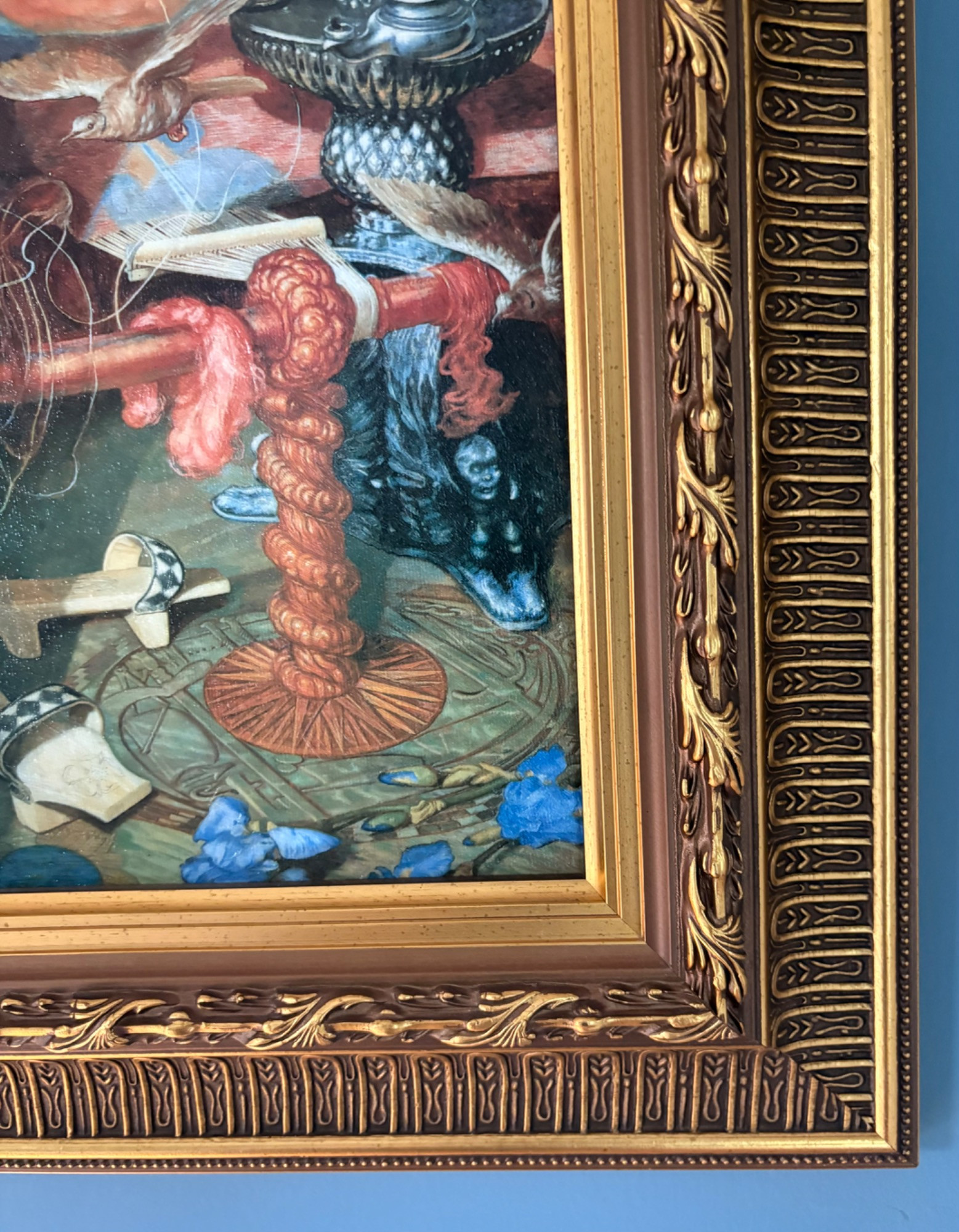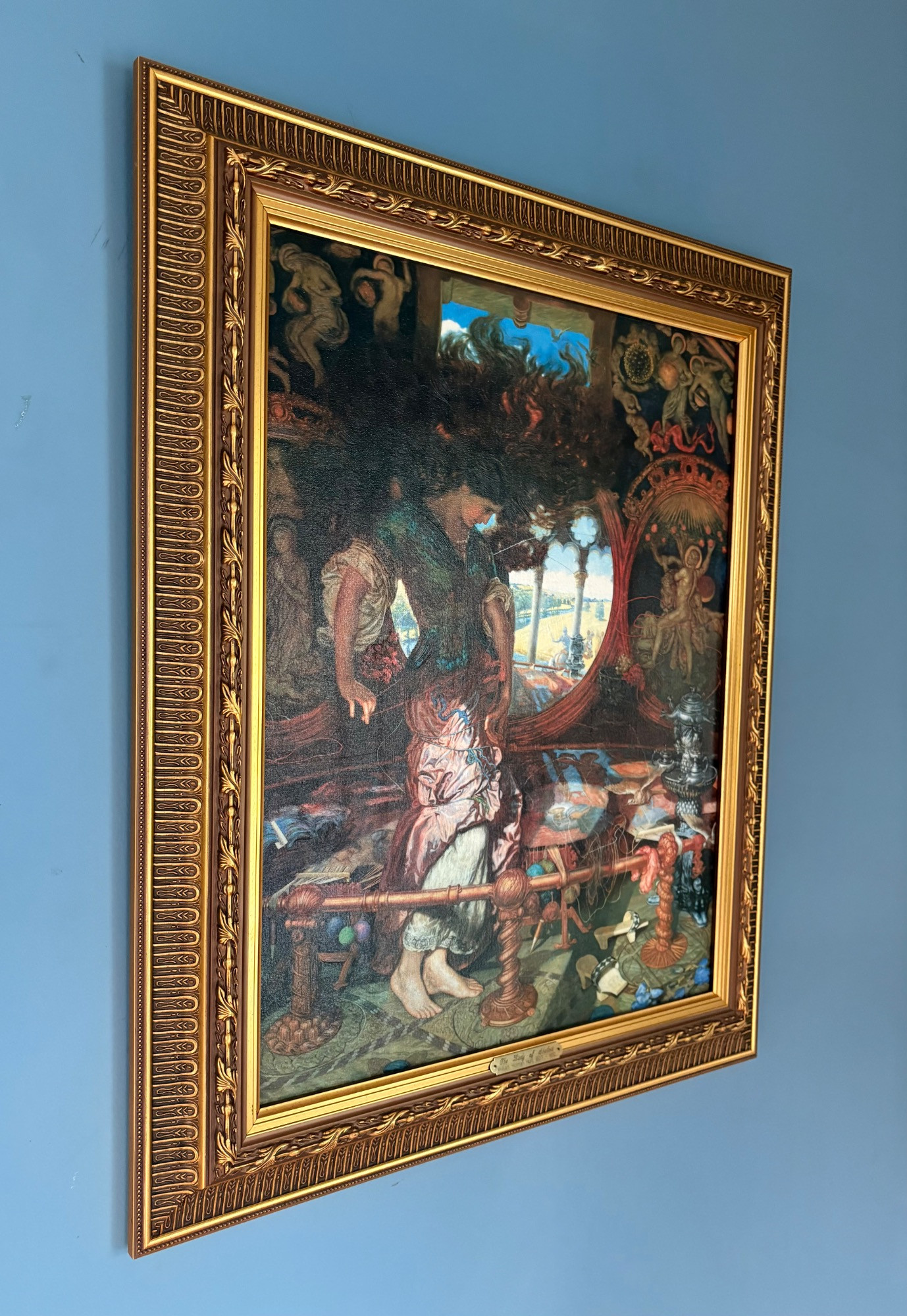 “The Lady of Shalott” by William Holman Hunt (1927 - 1910). Reproduction painting on canvas with typical pre-Raphaelite subject matter - Tennyson's Lady of Shalott. Surrounded by a multi-patterned ornately carved wood frame. Substantial in size at approx. 2.5' H framed. We are usure of the origin of this reproduction - we think it might have been from Around the Corner Art and then framed locally, but are not certain. Can be shipped FedEx.
