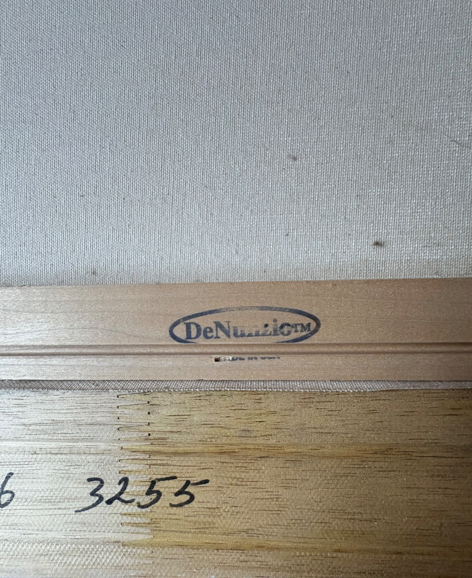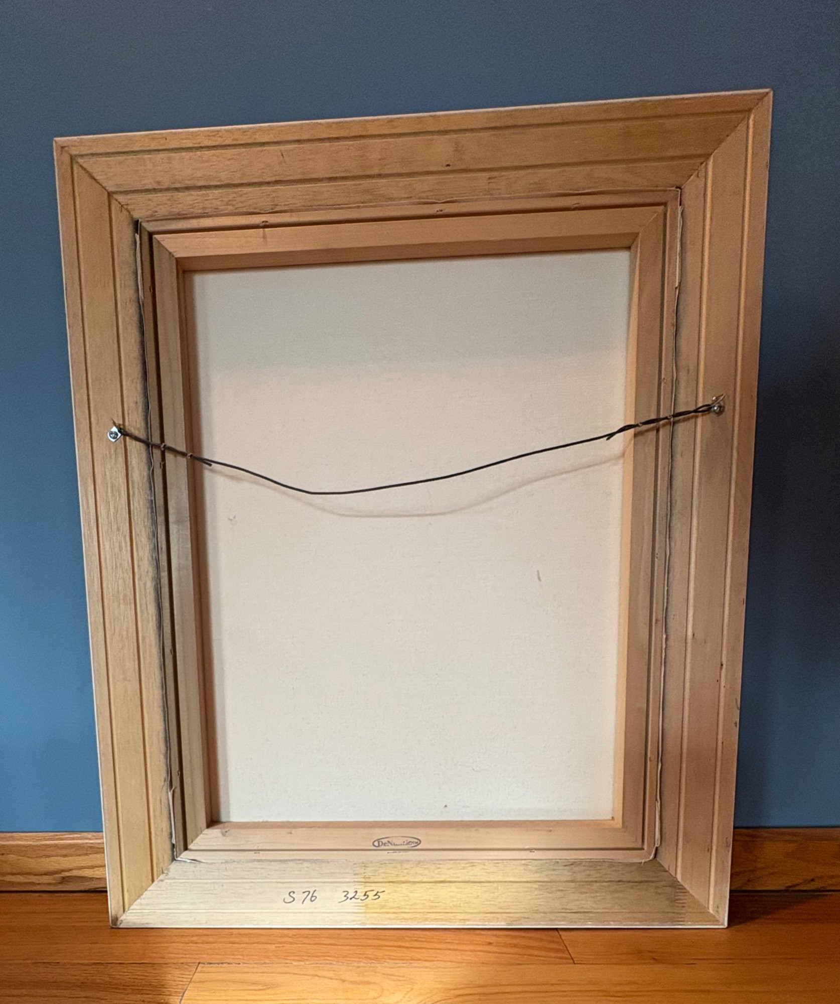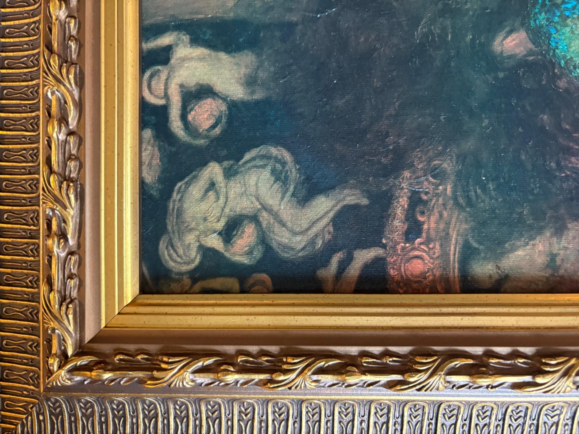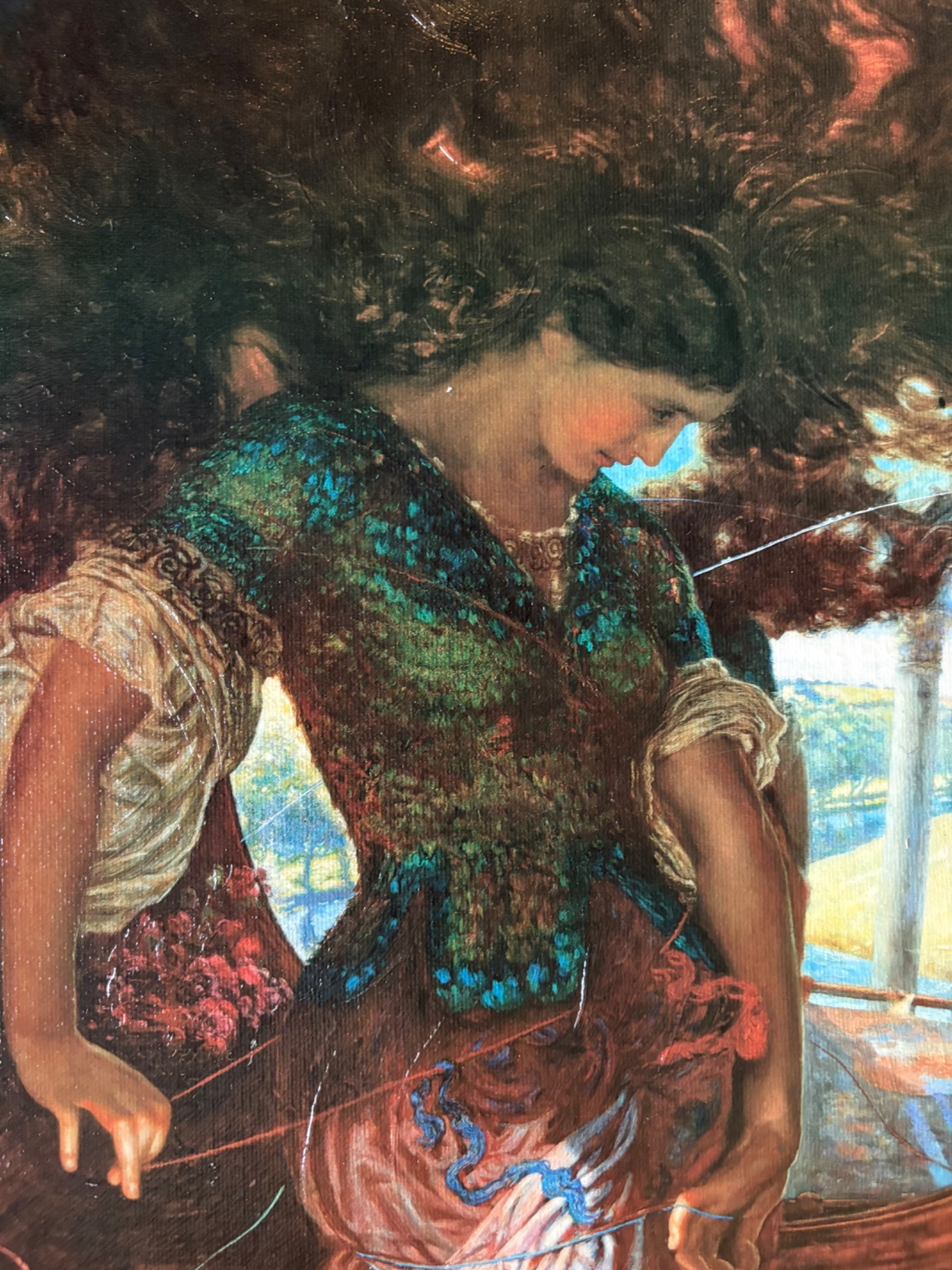 “The Lady of Shalott” by William Holman Hunt (1927 - 1910). Reproduction painting on canvas with typical pre-Raphaelite subject matter - Tennyson's Lady of Shalott. Surrounded by a multi-patterned ornately carved wood frame. Substantial in size at approx. 2.5' H framed. We are usure of the origin of this reproduction - we think it might have been from Around the Corner Art and then framed locally, but are not certain. Can be shipped FedEx.