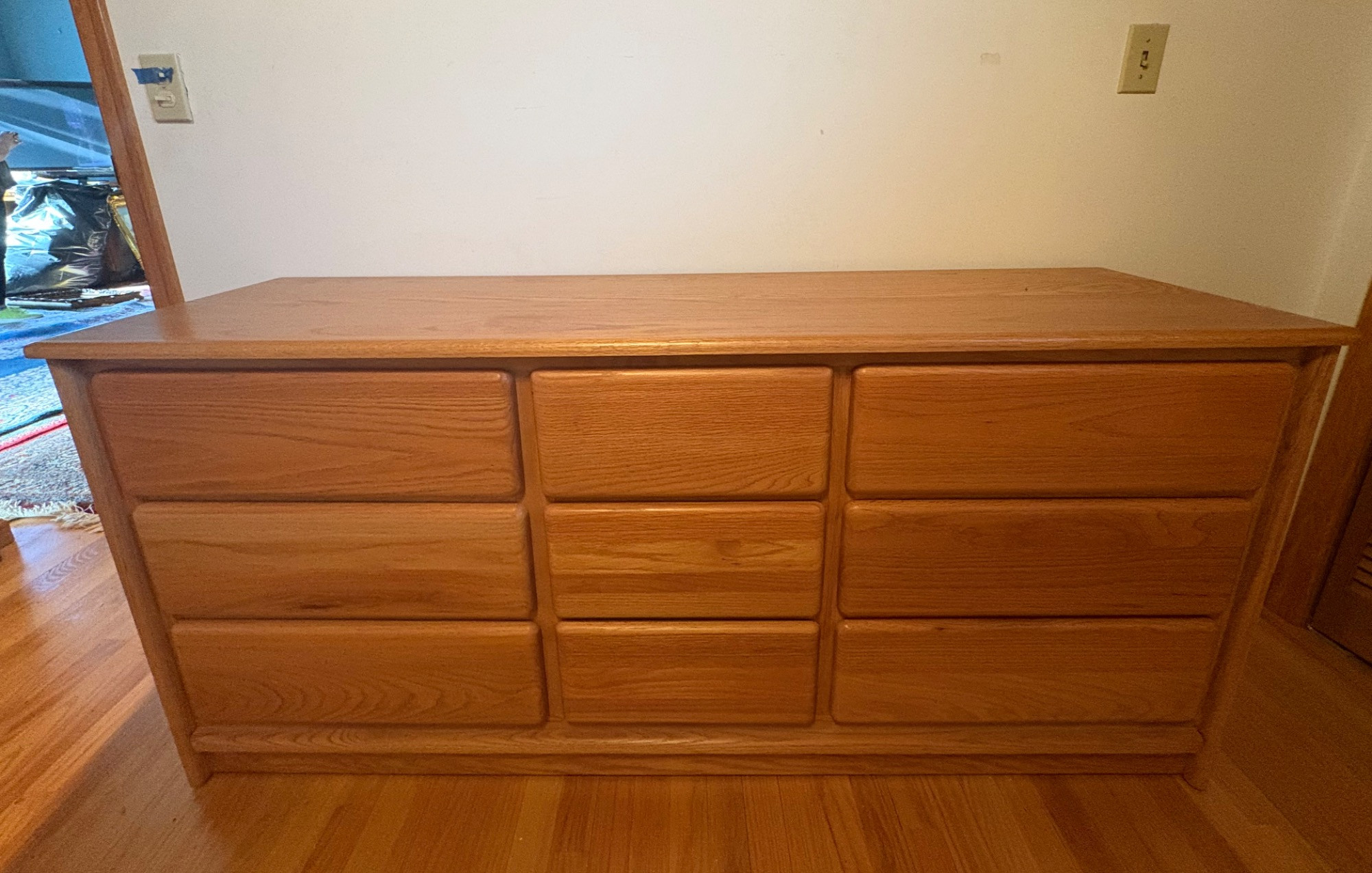 Terrific wood chest of drawers. All wood with 9 drawers (largest drawers have interior space approx. 18.5 x 15") Appears to be in very good condition. Drawer edge fronts are rounded with cut-out finger pulls at the bottom of drawers. Top is in excellent condition - no flaws noted with the exception of couple faint scratches at the left top end - see last photo. Matching chests of drawers in Lots #59 & #199 Local Pickup Only. Bidding on this lot is an agreement that: (1.) You will have 2 capable, able-bodied persons to lift and load at a minimum. (2.) You will bring a hand truck and/or any other tools needed to remove this item. If these steps are not followed your item will be forfeited and no refund given.