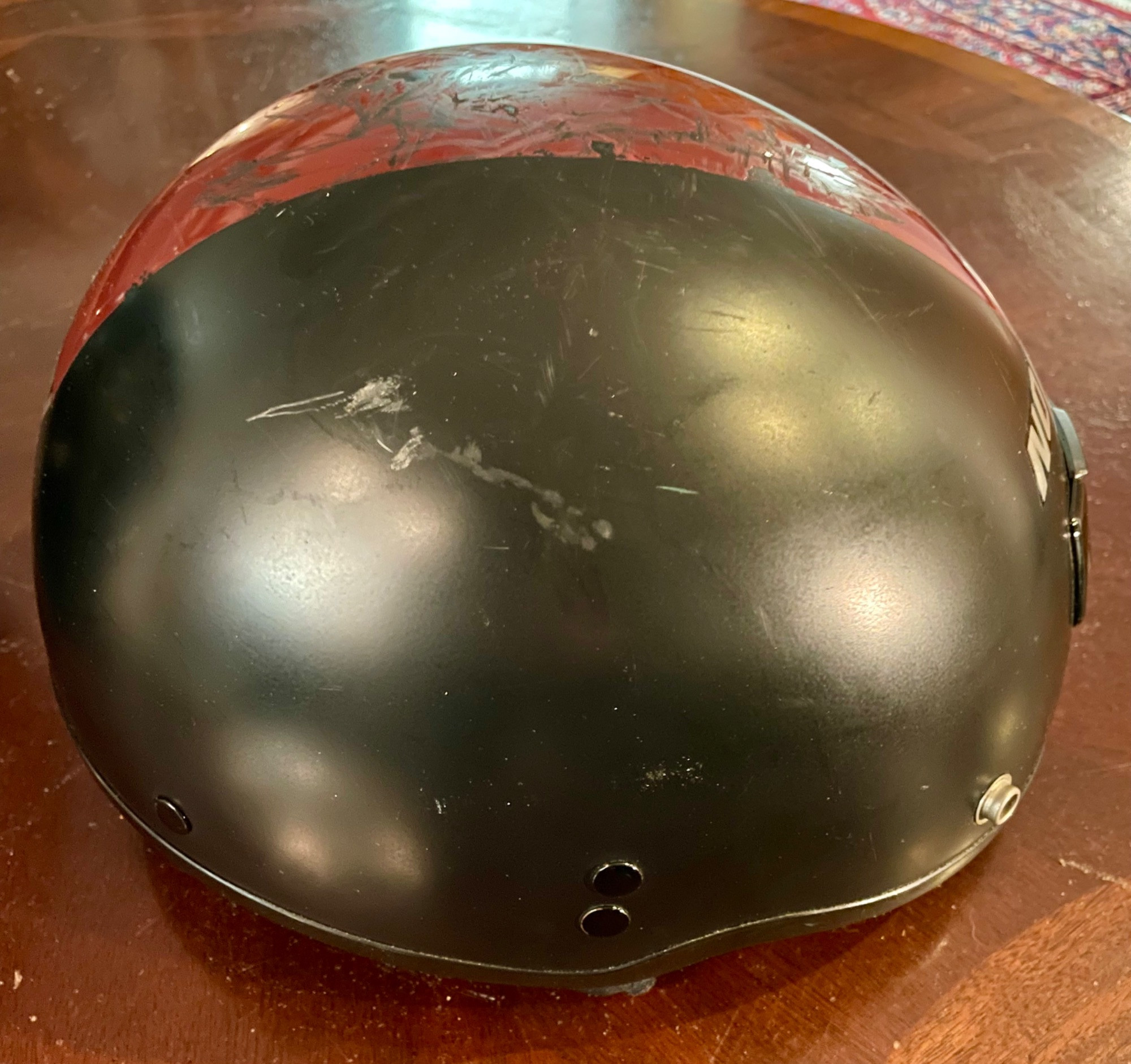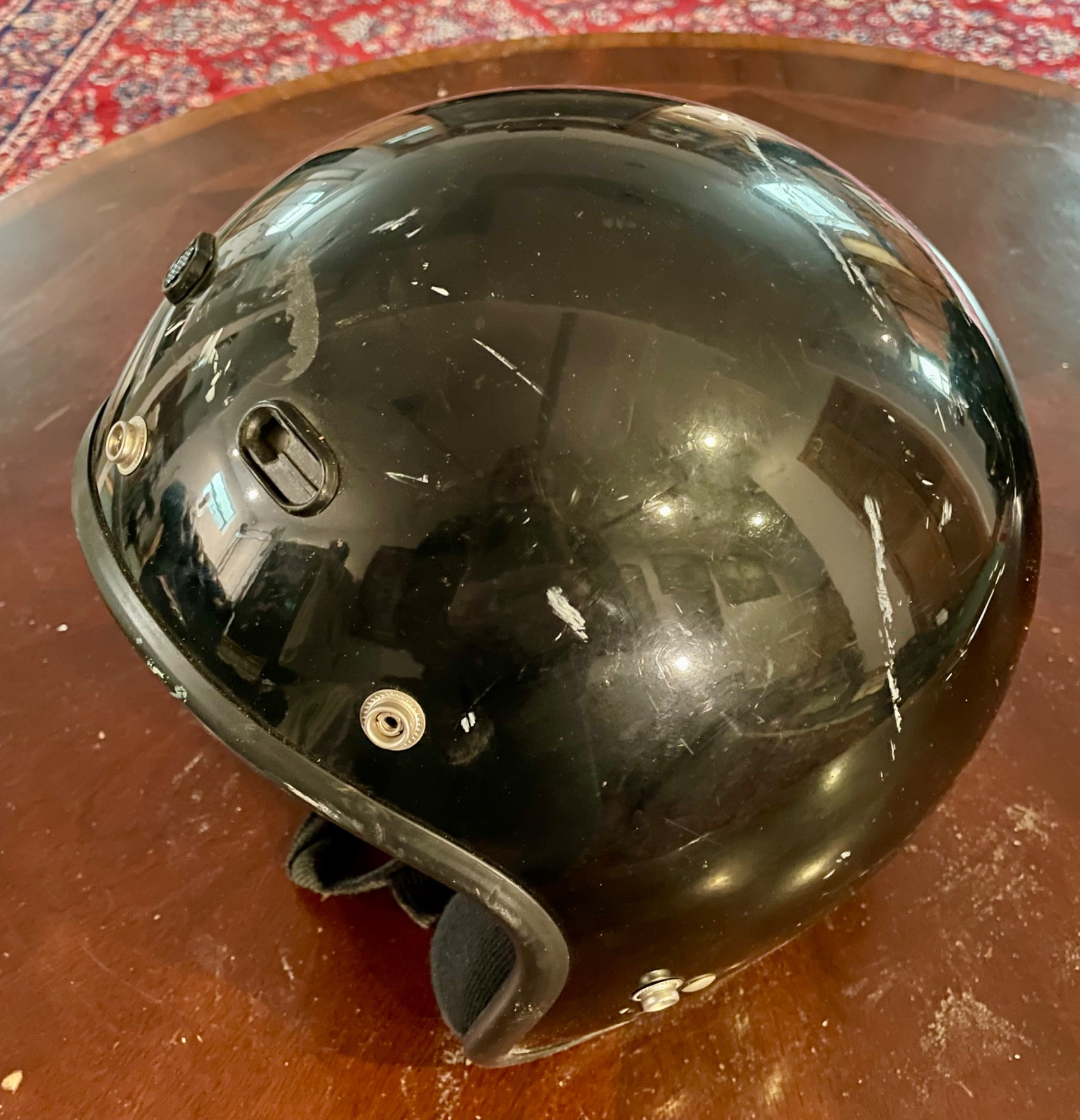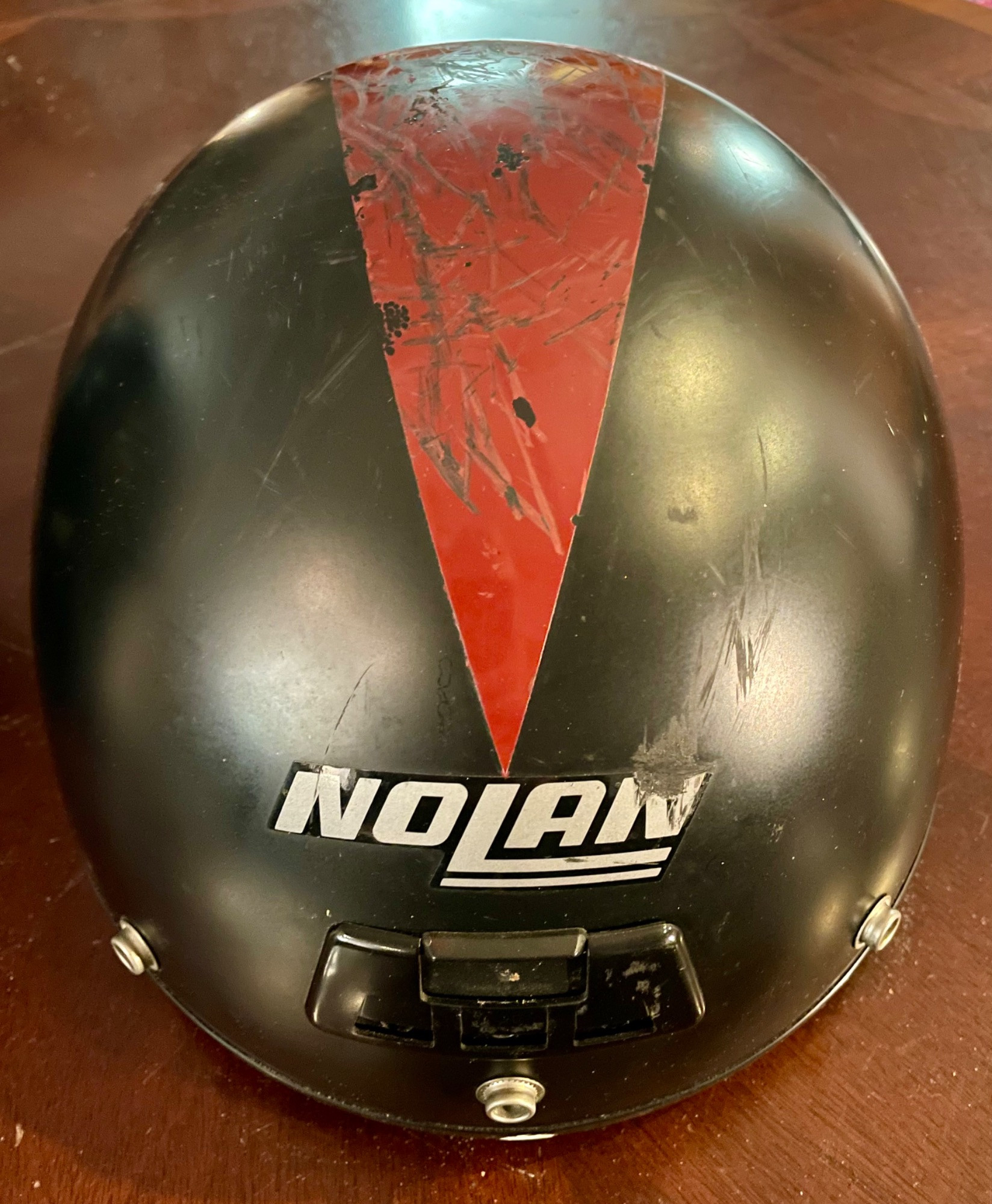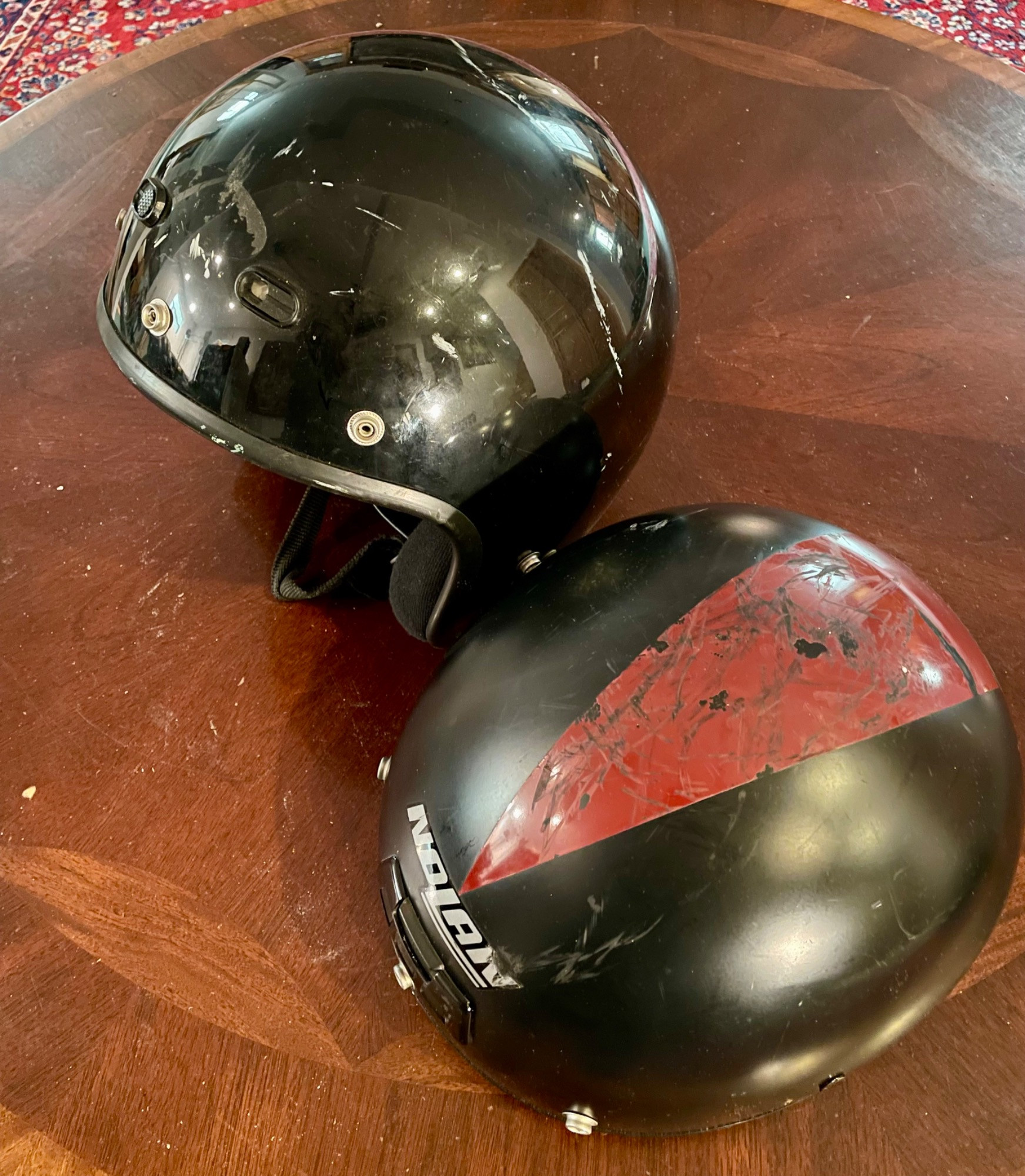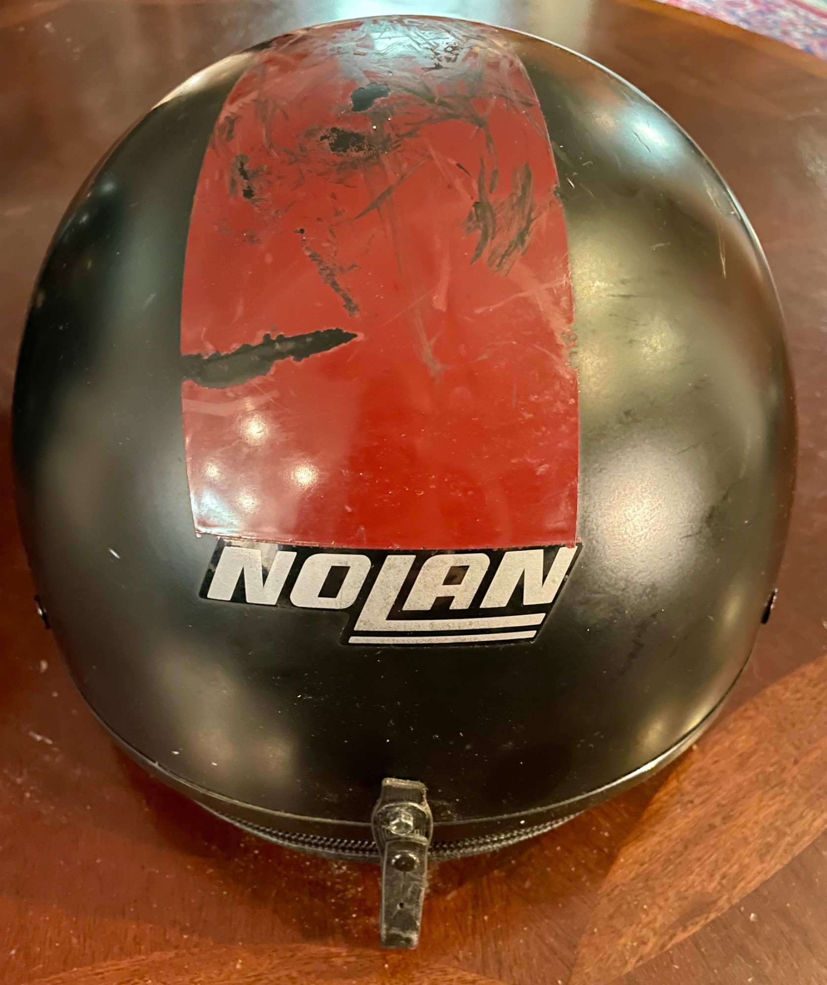 Classic motorcycle helmet pair. Nolan “Cruise” made in Italy; black with red detail. Size M/L (8.5” front to back interior shell and 7” side to side interior shell) Unbranded solid black ABS-formed with polystyrene liner. Size XL (9” front to back interior liner, 8.25” side to side). No face mask; one front vent closure is missing the slider.