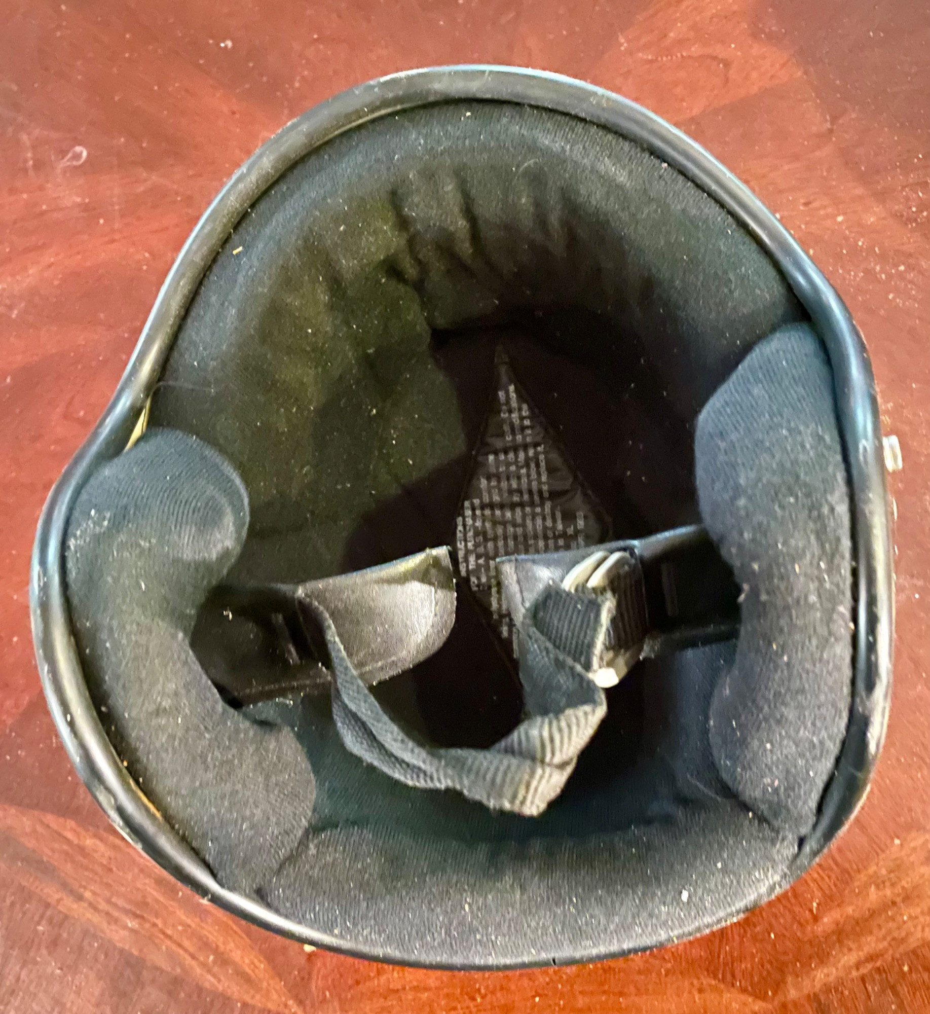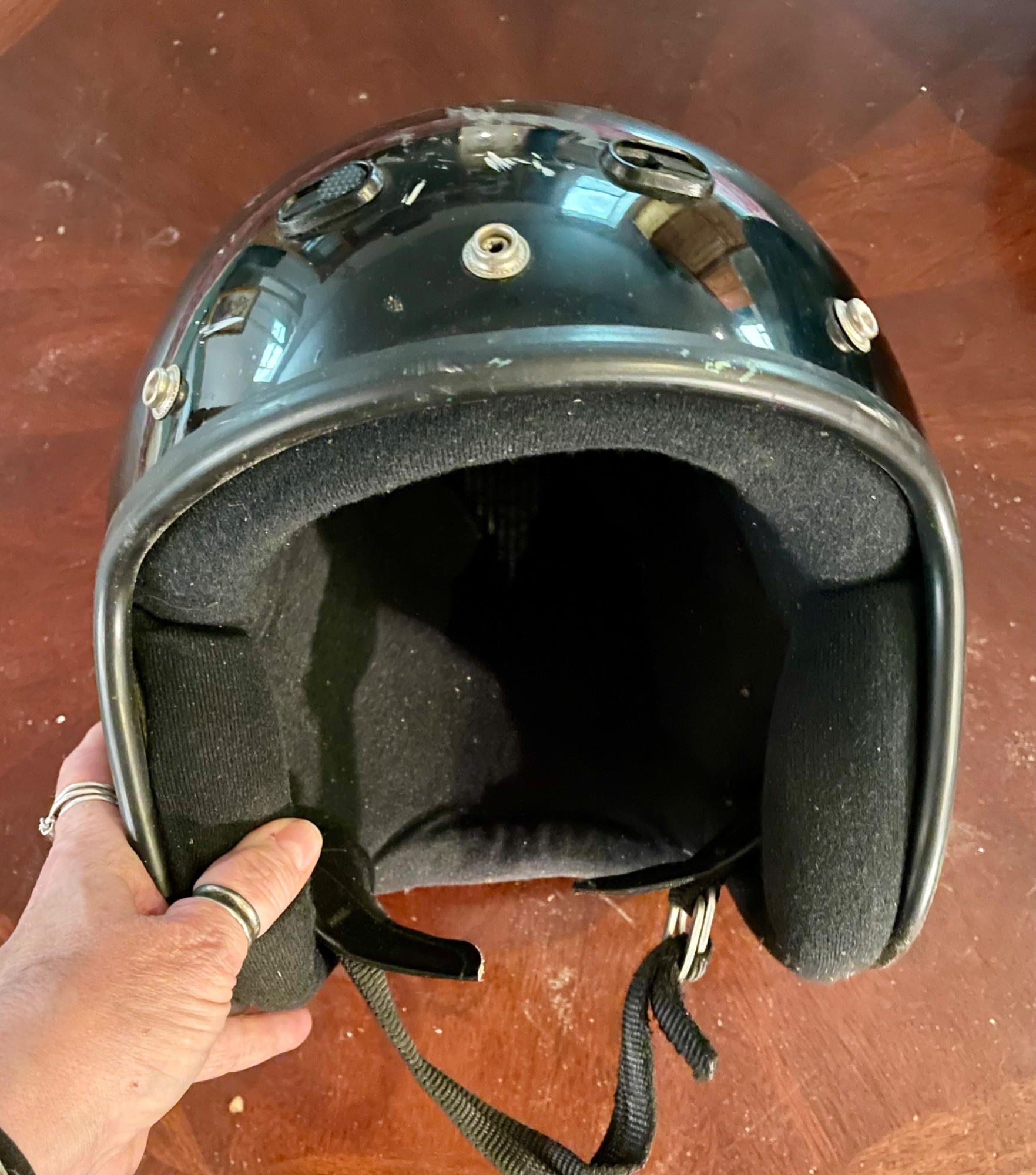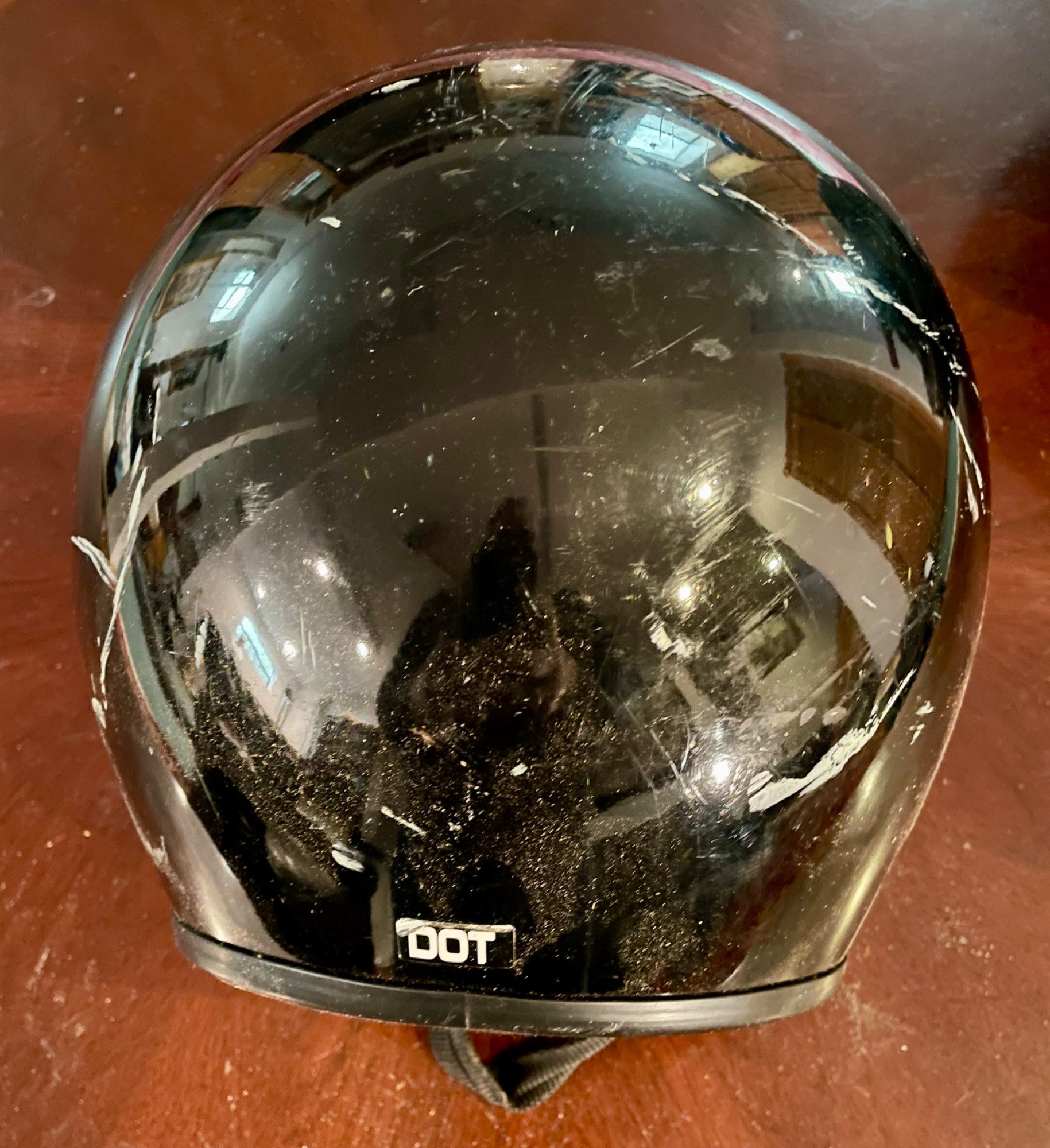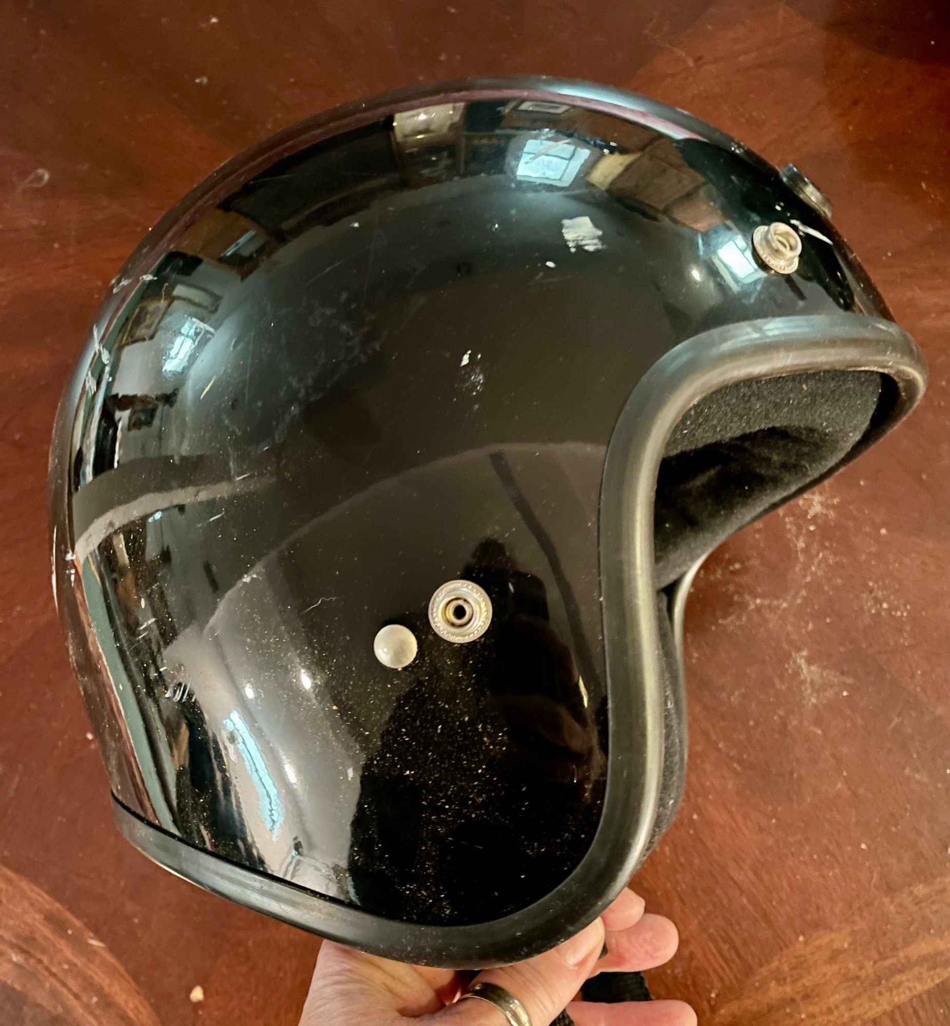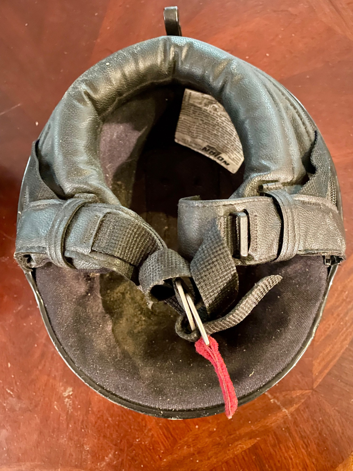 Classic motorcycle helmet pair. Nolan “Cruise” made in Italy; black with red detail. Size M/L (8.5” front to back interior shell and 7” side to side interior shell) Unbranded solid black ABS-formed with polystyrene liner. Size XL (9” front to back interior liner, 8.25” side to side). No face mask; one front vent closure is missing the slider.