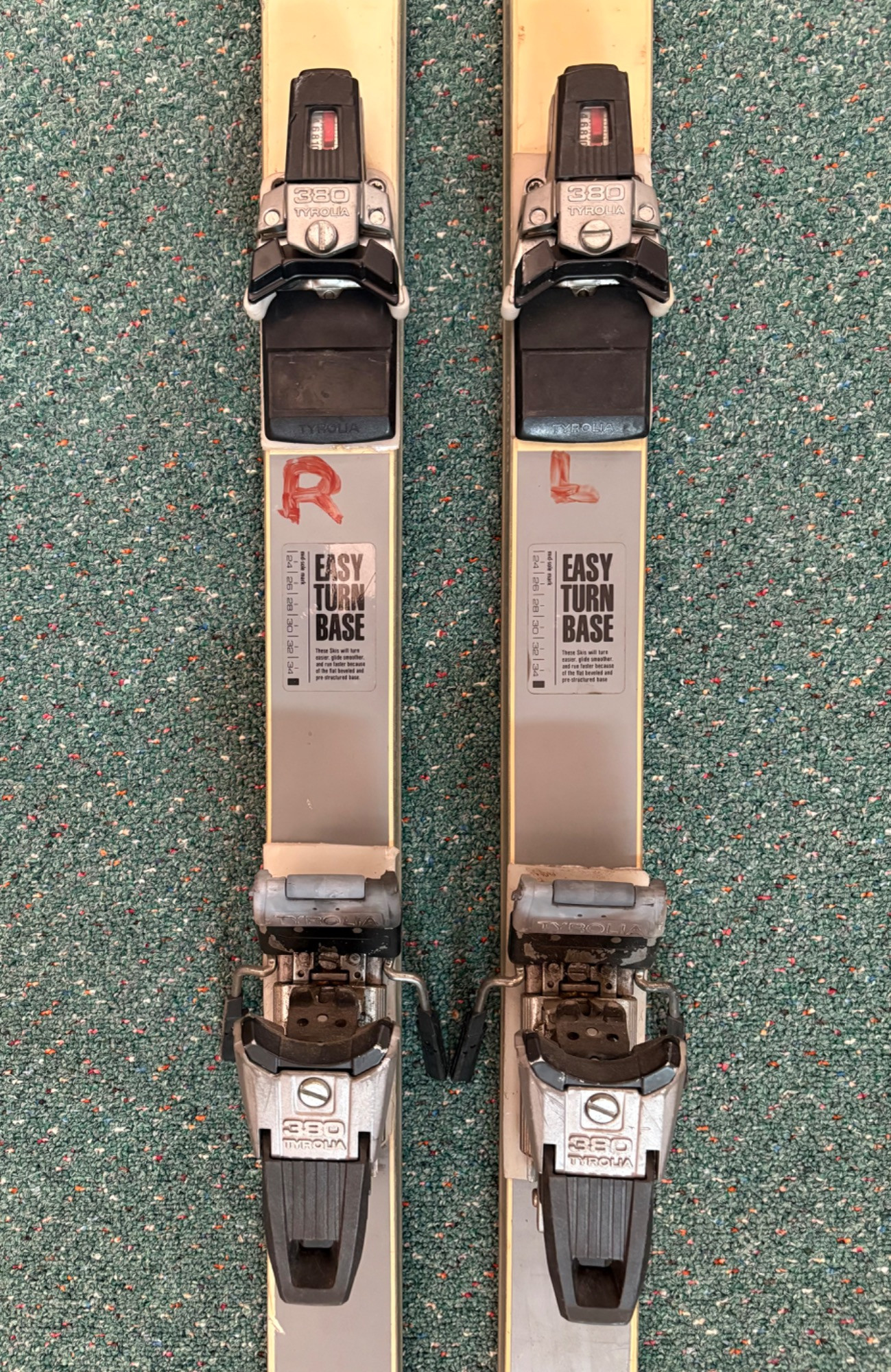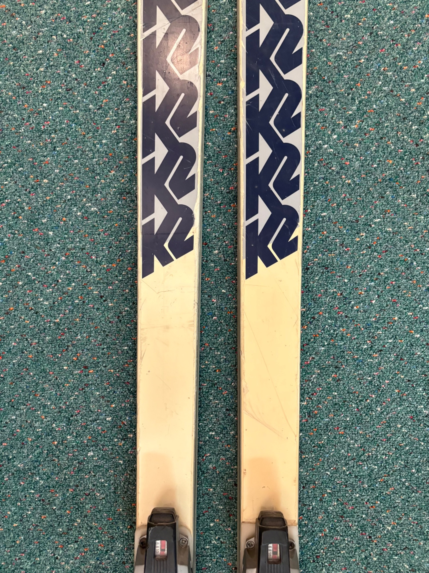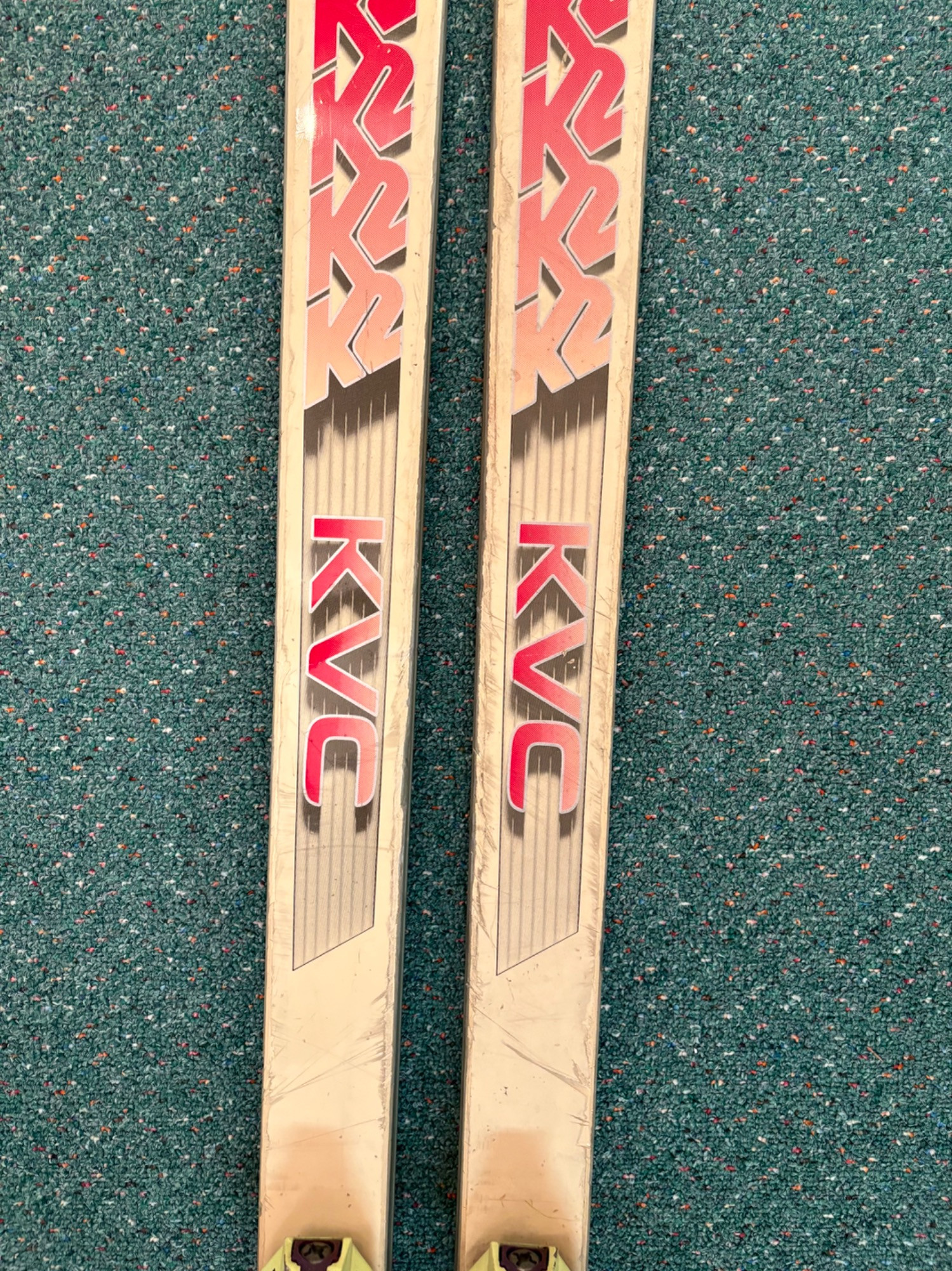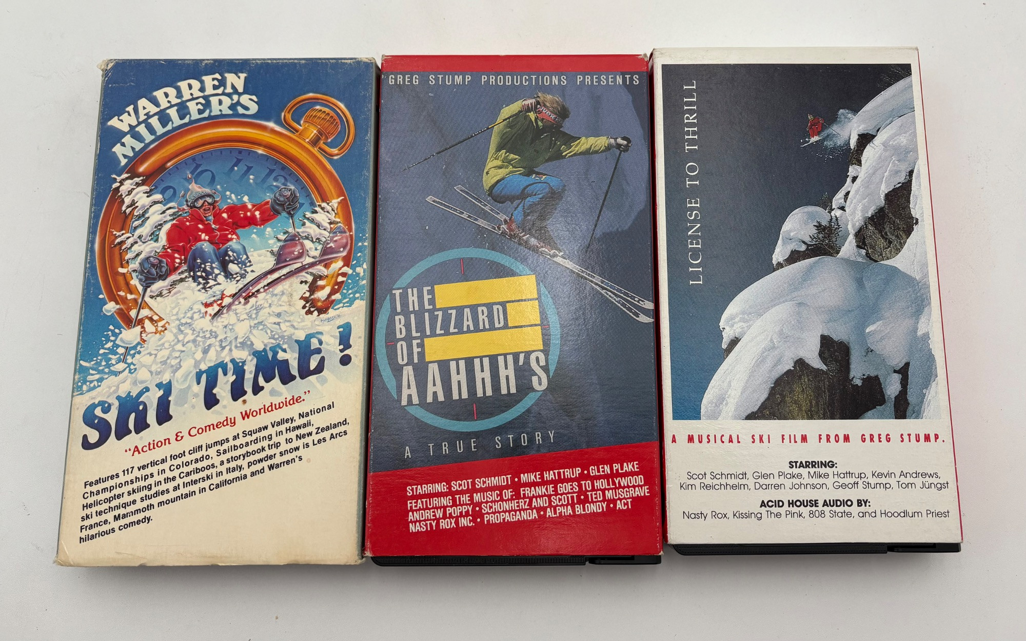 Three pairs of vintage K2 skis. All are white and edges show a bit of rust, but no divots or major flaws noted other than normal wear. All have various Tyrolia bindings. - Left pair measures approximately 80" L. - Center white and gray pair measures approximately 81" L. - Right pair measures approximately 81" L.. 3 vintage VCR ski tapes BONUS: we are also including a vintage zip-close ski bag not pictured. It very much needs a good wash.