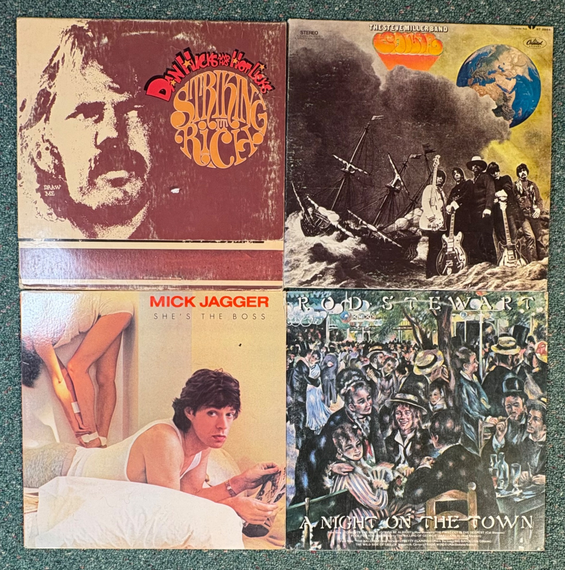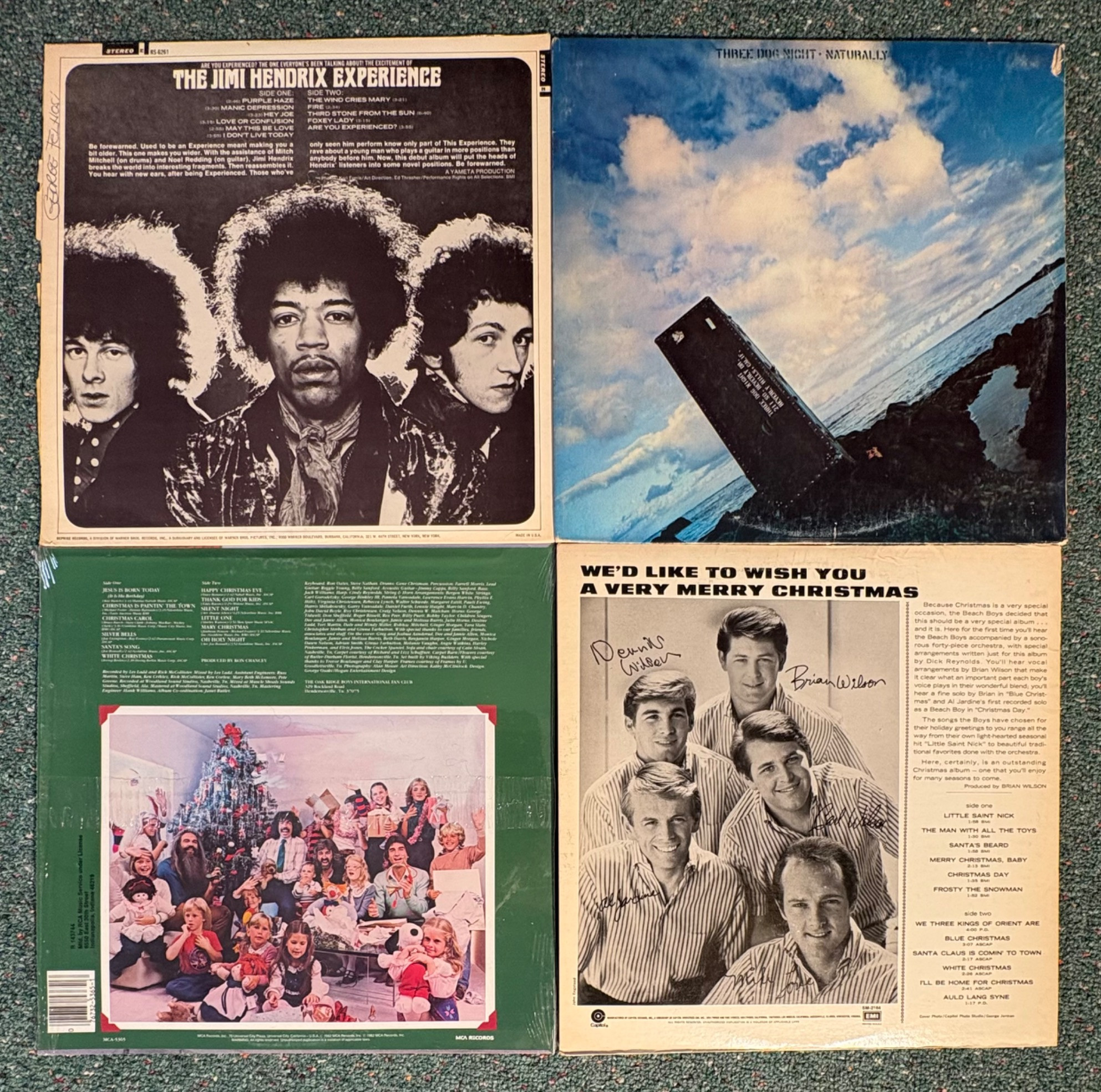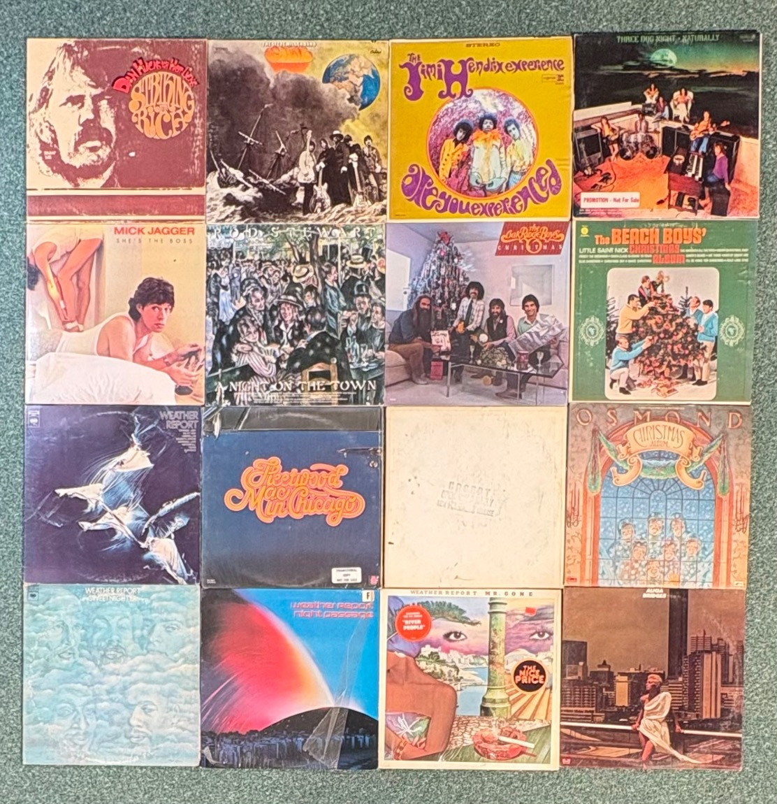 16 vintage vinyl LPs! Our client had eclectic taste and loved his albums - thus, most of these have been lovingly played over the years. We checked to make sure the correct album was in the correct cover and did a cursory glance for any egregious scratches. Some covers reflect heavy use and are worn/split in places/have names written on them. However, the majority are in good used shape. Artists/Bands in this lot include: Fleetwood Mac Mick Jagger Rod Stewart Dan Hicks & His Hot Licks Steve Miller Band Jimi Hendrix Experience The Oak Ridge Boys Three Dog Night The Beach Boys The Fireballs Alicia Bridges Osmonds Weather Report (4 albums)