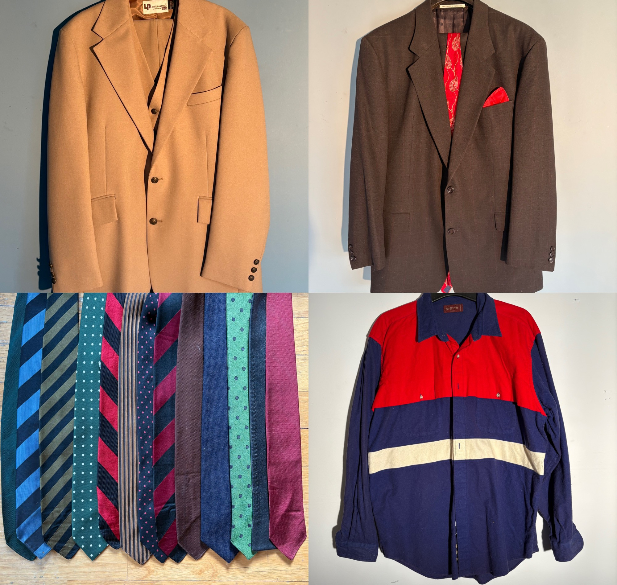 Vintage suit pair - Hugo Boss wool suit & Levis casual suit. Lovely 100% black virgin wool Hugo Boss two-button jacket with pleated cuffed pants - size 46 long. This is a quality suit as shown by the care given to matching the subtle blue and red pin-stripes at seams. Made in Germany. Also included is a red brocade necktie from Italy and a gold tone tie tack tack along with a red satin pocket square. Appears to be in beautiful shape with no flaws noticed on cursory examination; shows very few signs of being worn. Second suit is a vintage Levi’s three-piece ensemble in a taupe/beige for more casual occasions. Two button jacket, five button lined vest, and straight cut pants in a twill-like fabric. There appear to be a few light stains - see last photos - as it appears not to have been cleaned after the last wearing; not sure if they could be removed after all this time. Suit is size 44 long. Nordstrom cotton flannel color block button-front shirt. In good vintage condition. Size is not marked, but definitely a L or XL given our client's normal size. Baker's dozen of skinny vintage ties from various makers and materials (one is even leather). Please see photos for details.