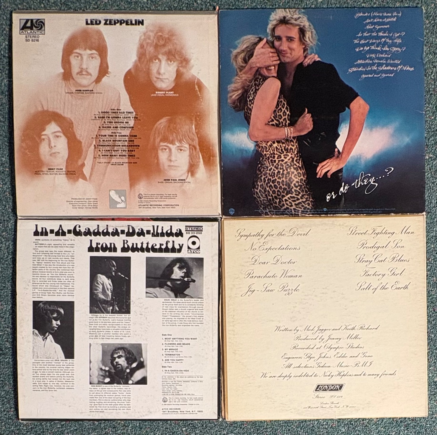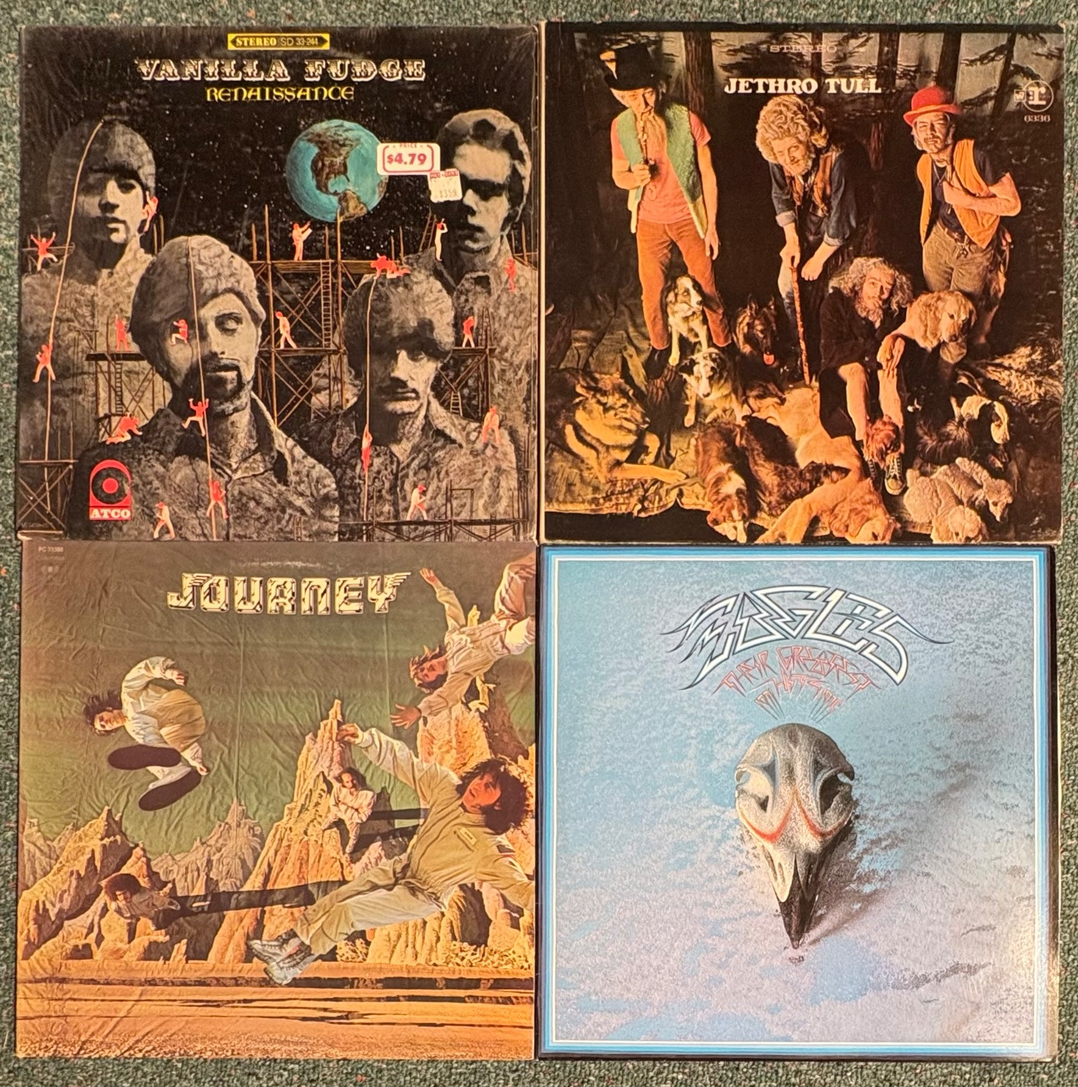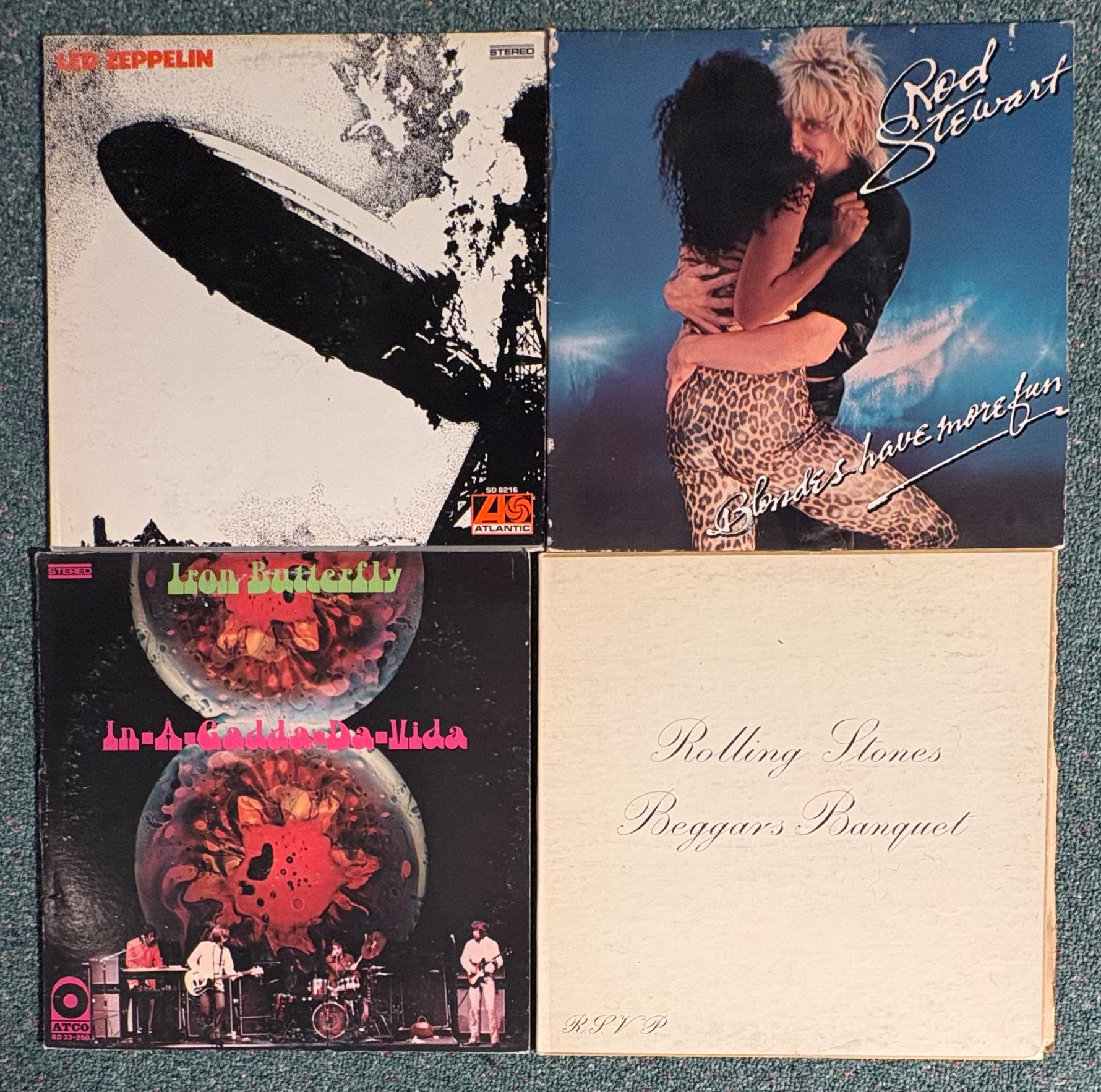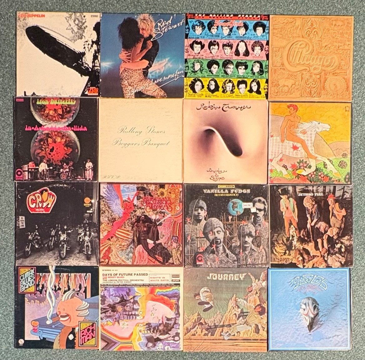 16 vintage vinyl LPs! Our client had eclectic taste and loved his albums - thus, most of these have been lovingly played over the years. We checked to make sure the correct album was in the correct cover and did a cursory glance for any egregious scratches. Some covers reflect heavy use and are worn/split in places/have names written on them. However, the majority are in good used shape. Artists/Bands in this lot include: Santana Jethro Tull Eagles Moody Blues Chicago Fleetwood Mac Rolling Stones (2 albums) Robin Trower Rod Stewart Iron Butterfly Led Zeppelin Crow Music Vanilla Fudge Journey Climax Blues Band