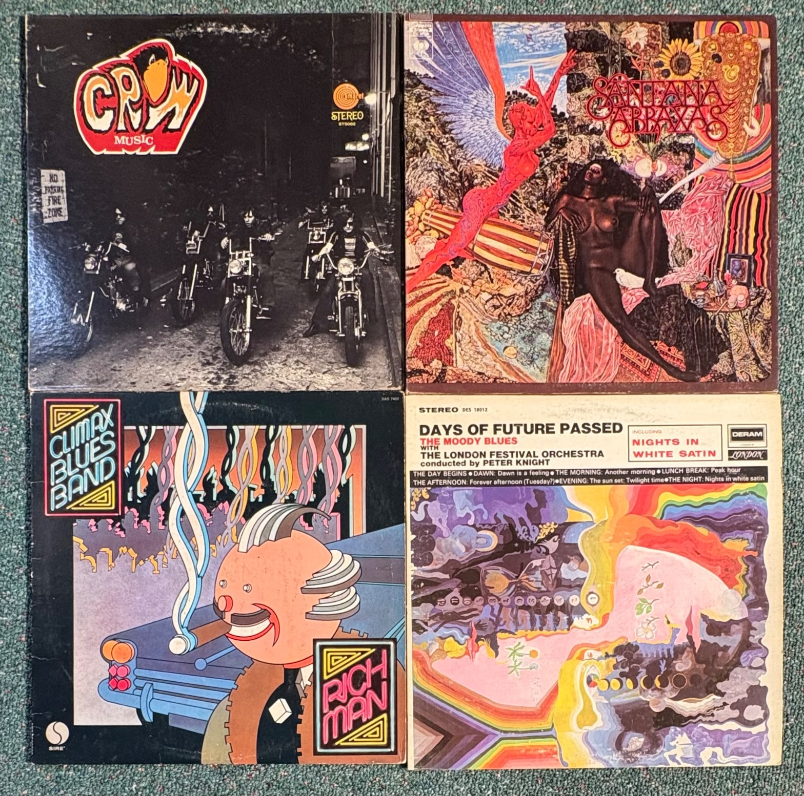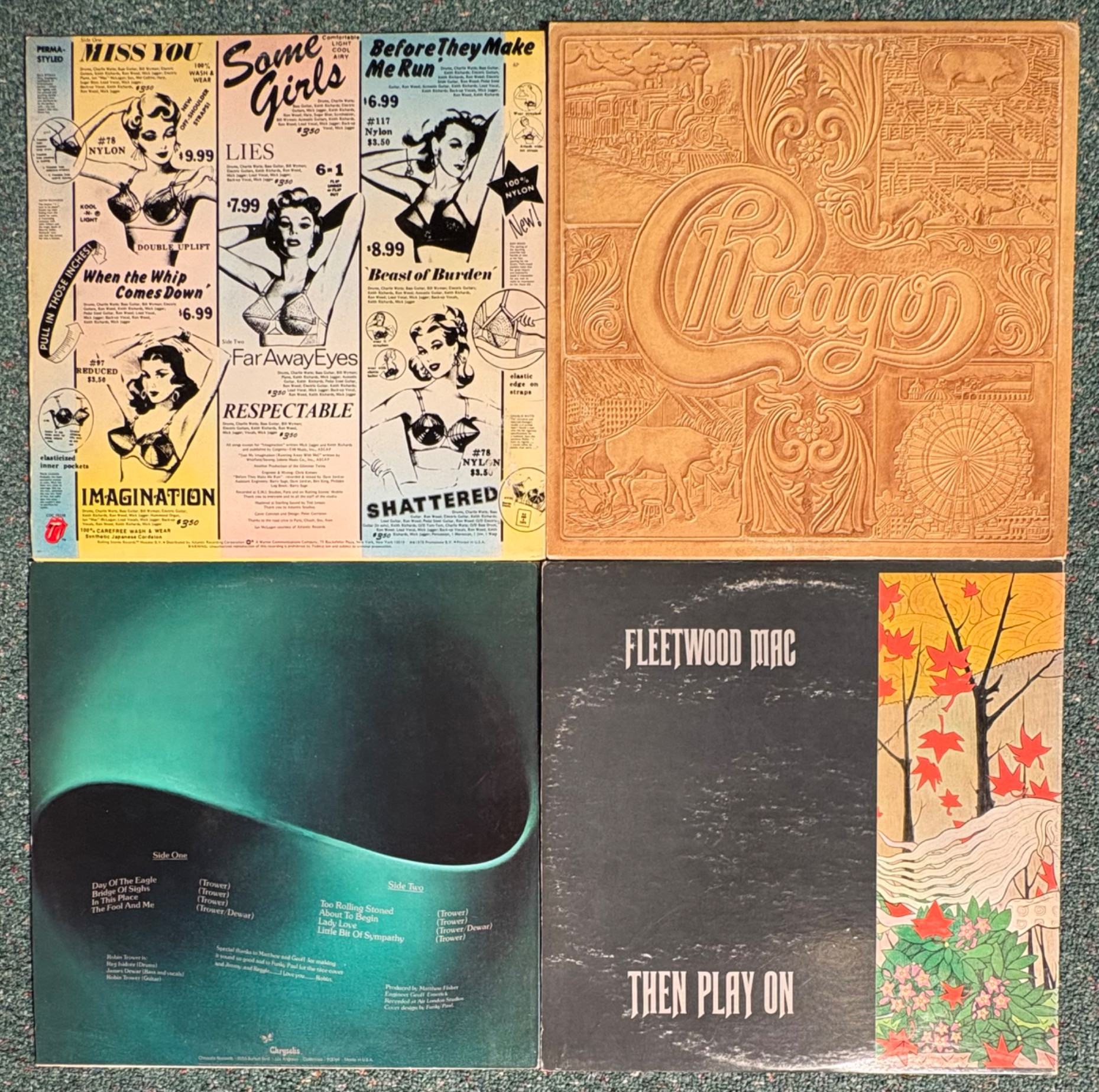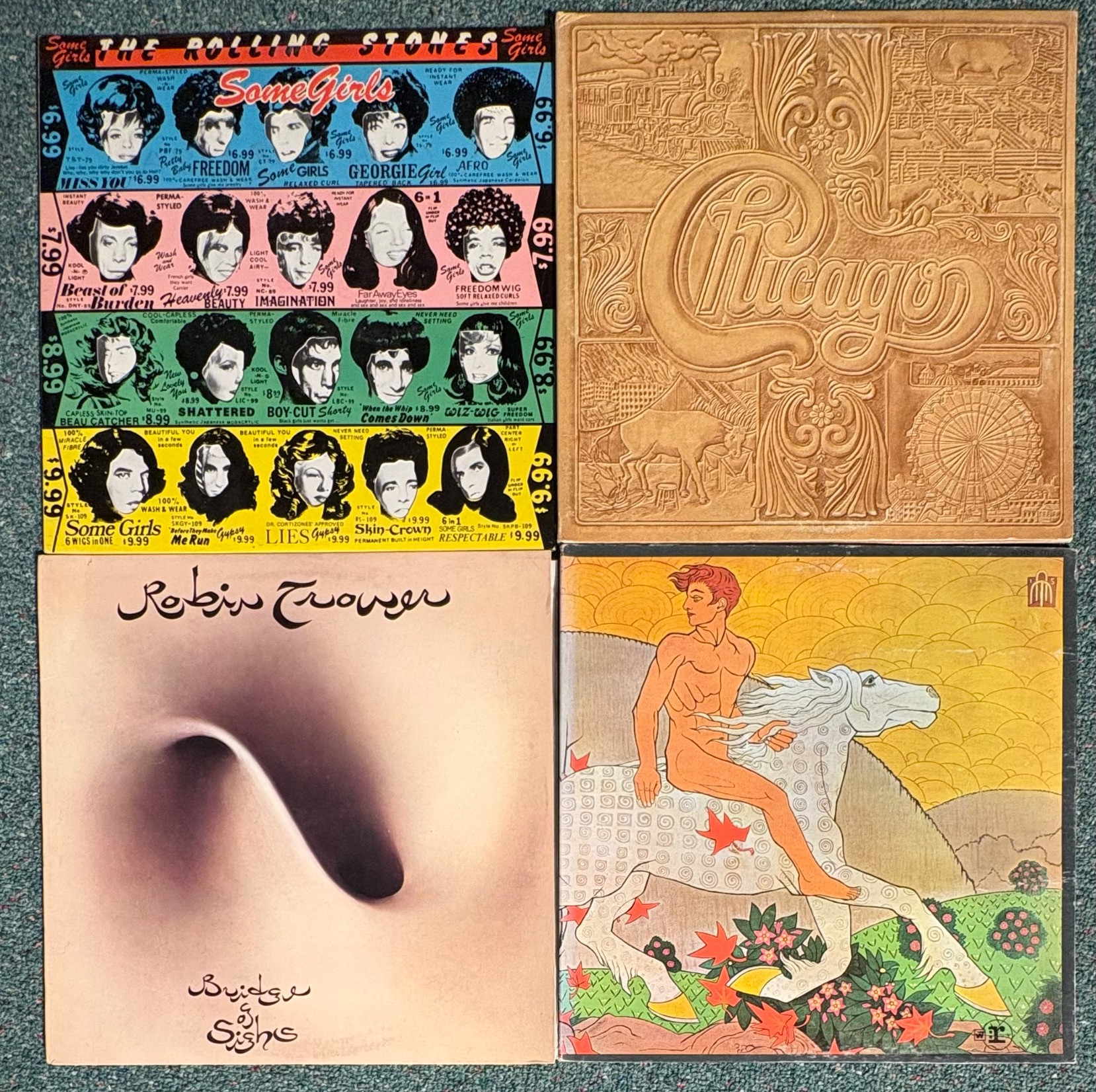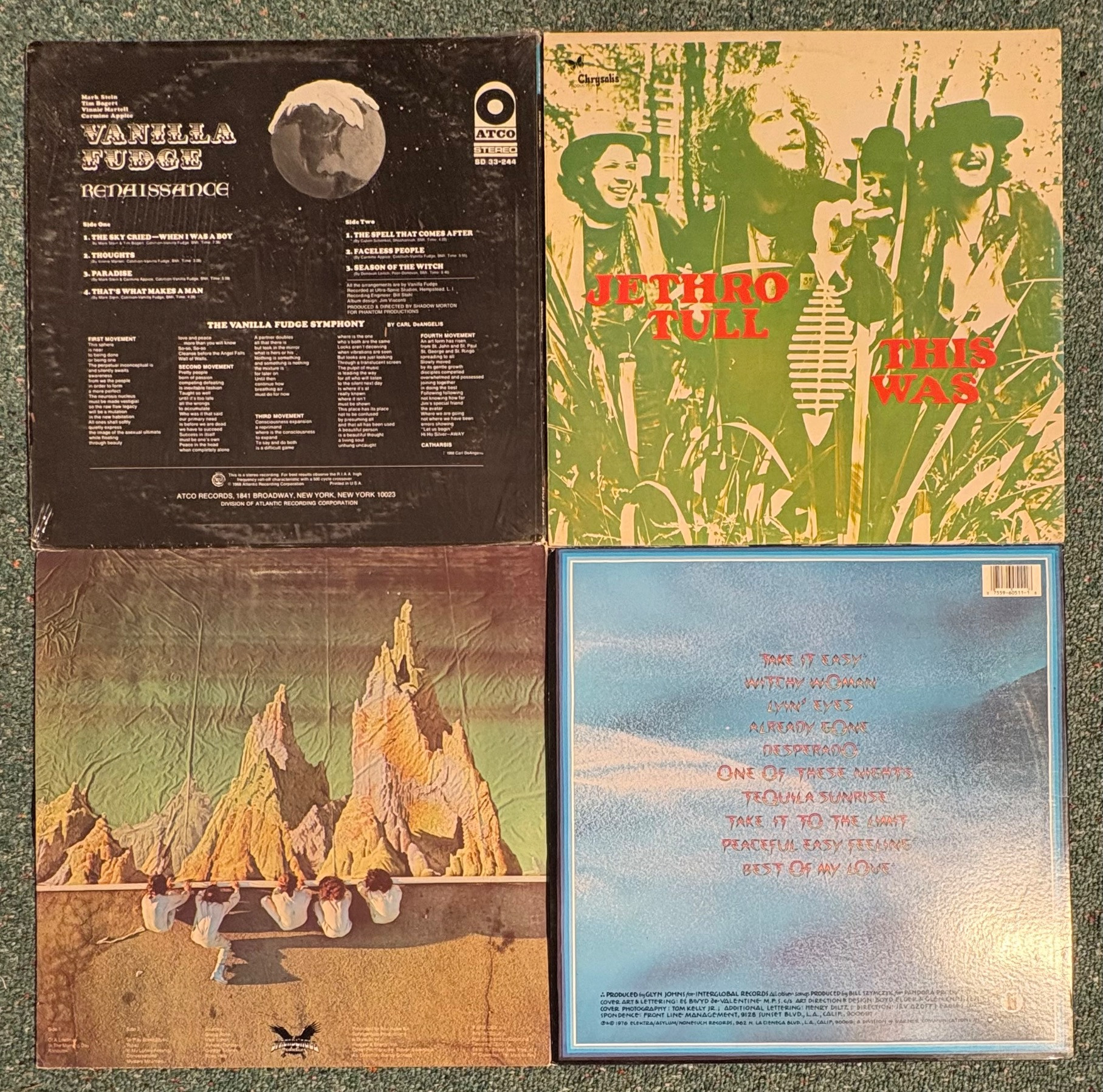 16 vintage vinyl LPs! Our client had eclectic taste and loved his albums - thus, most of these have been lovingly played over the years. We checked to make sure the correct album was in the correct cover and did a cursory glance for any egregious scratches. Some covers reflect heavy use and are worn/split in places/have names written on them. However, the majority are in good used shape. Artists/Bands in this lot include: Santana Jethro Tull Eagles Moody Blues Chicago Fleetwood Mac Rolling Stones (2 albums) Robin Trower Rod Stewart Iron Butterfly Led Zeppelin Crow Music Vanilla Fudge Journey Climax Blues Band