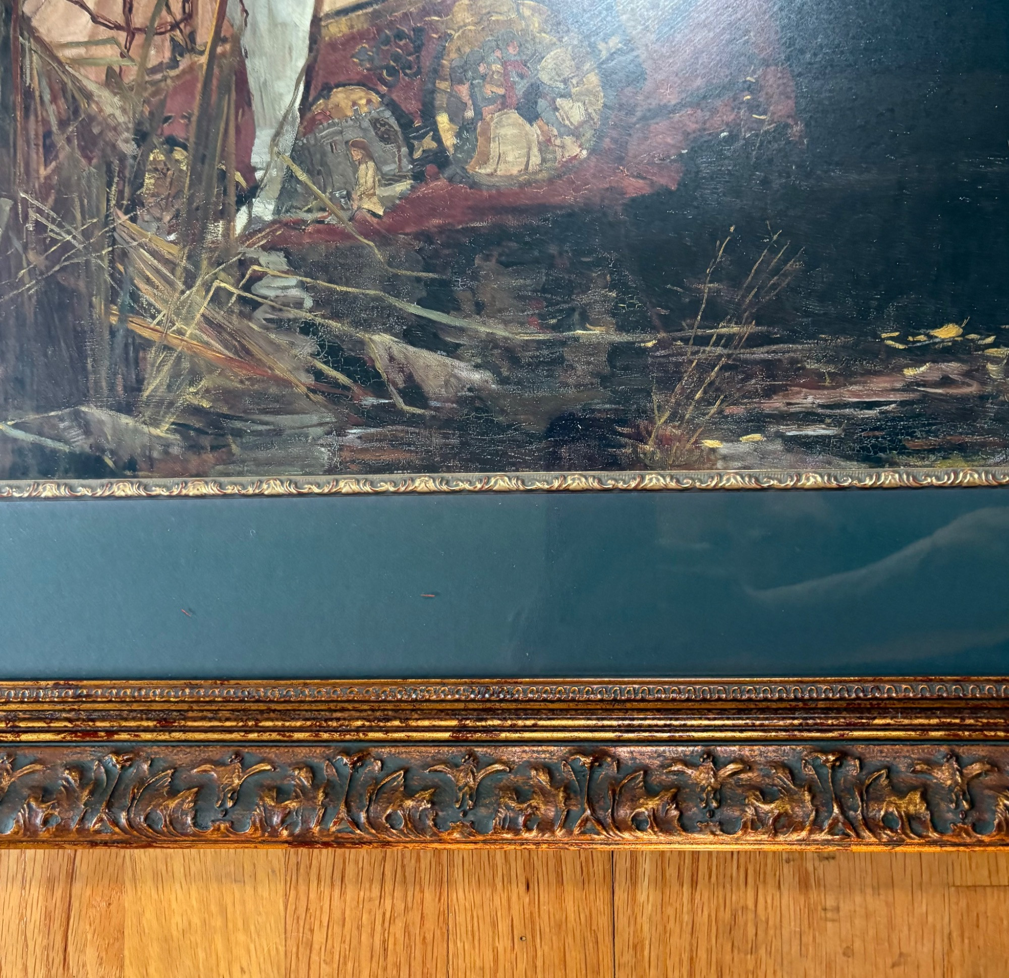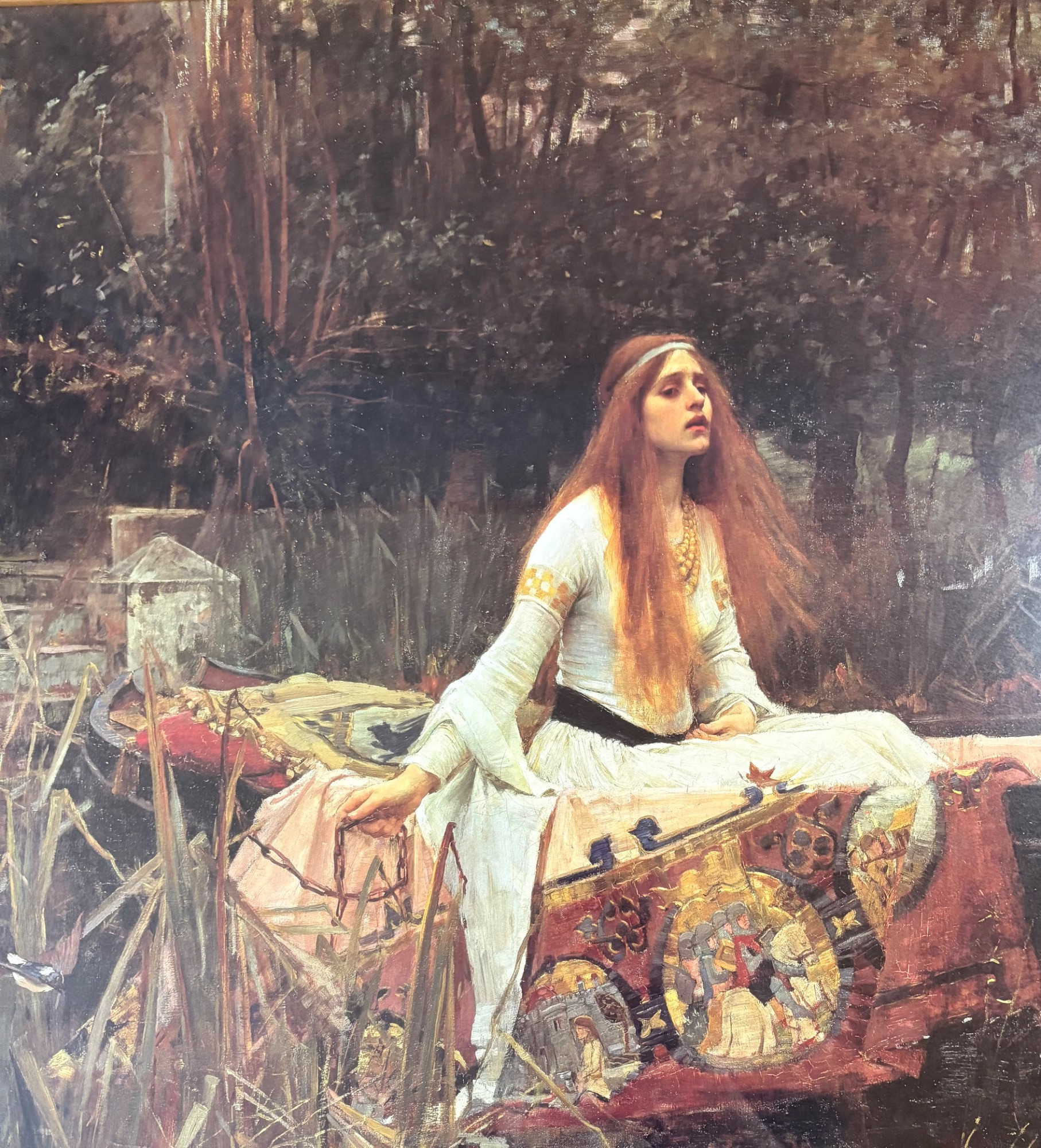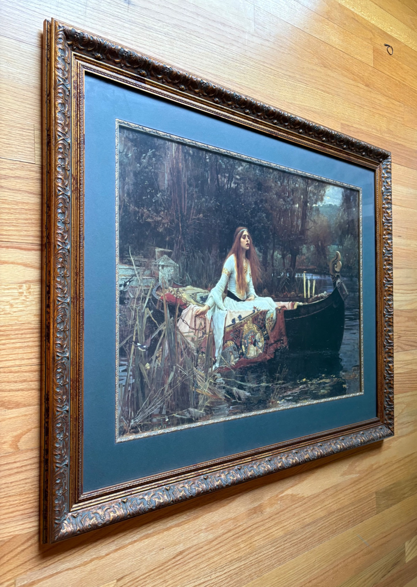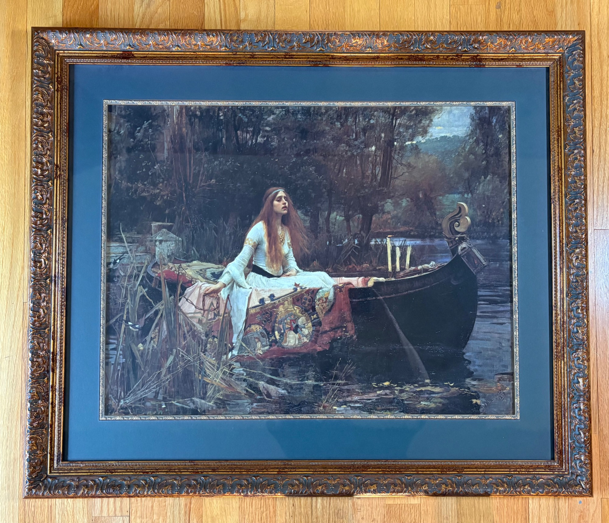 “The Lady of Shalott” by John Waterhouse (1849-1917). Reproduction print of one of this artist's most famous images. Surrounded by a somewhat subdued frame (compared with some of the other frames!). Fairly large at almost 3' wide framed. We are usure of the origin of this reproduction - we think the print itself might have been from Around the Corner Art and then was framed locally, but are not certain. Can be shipped FedEx.