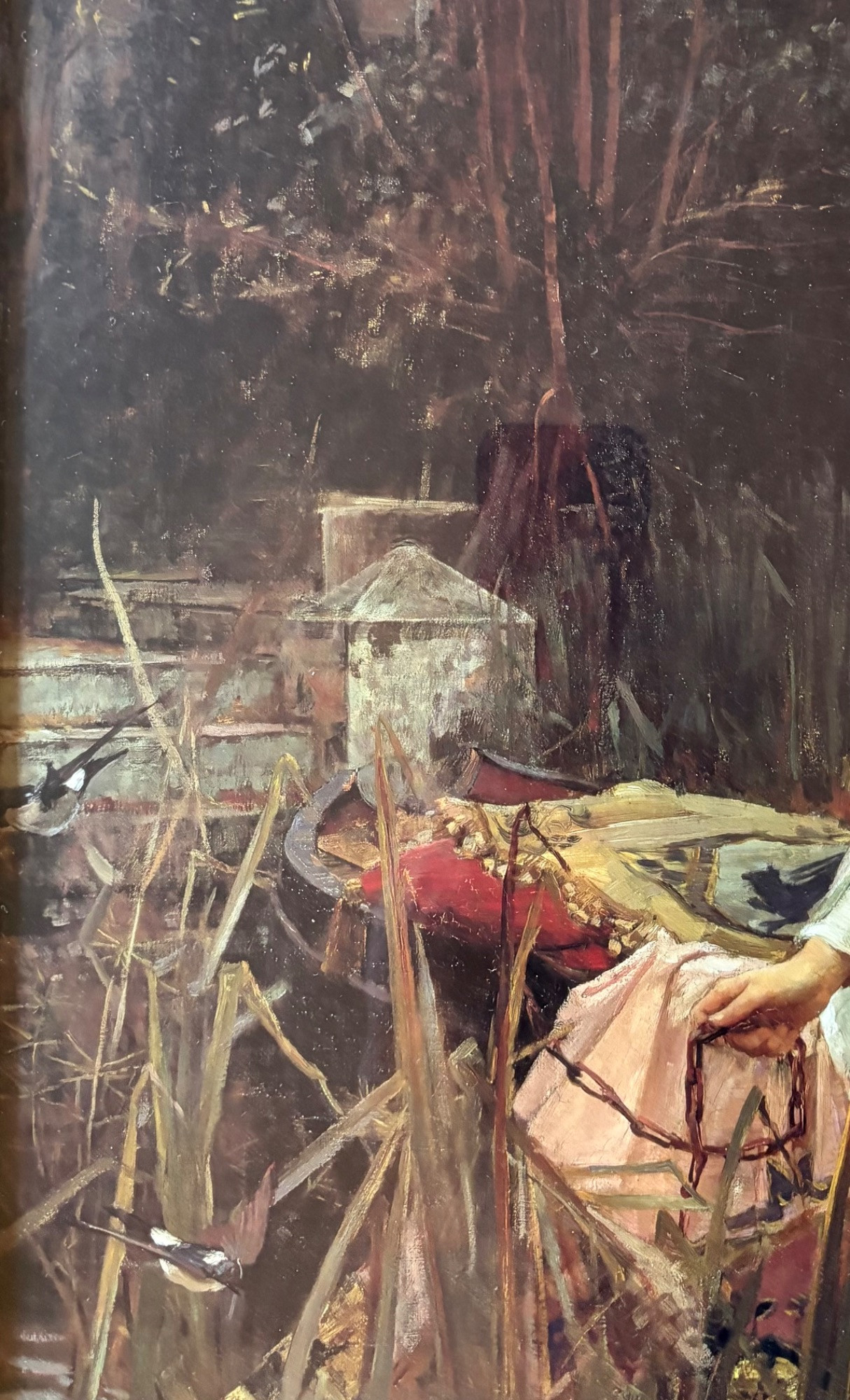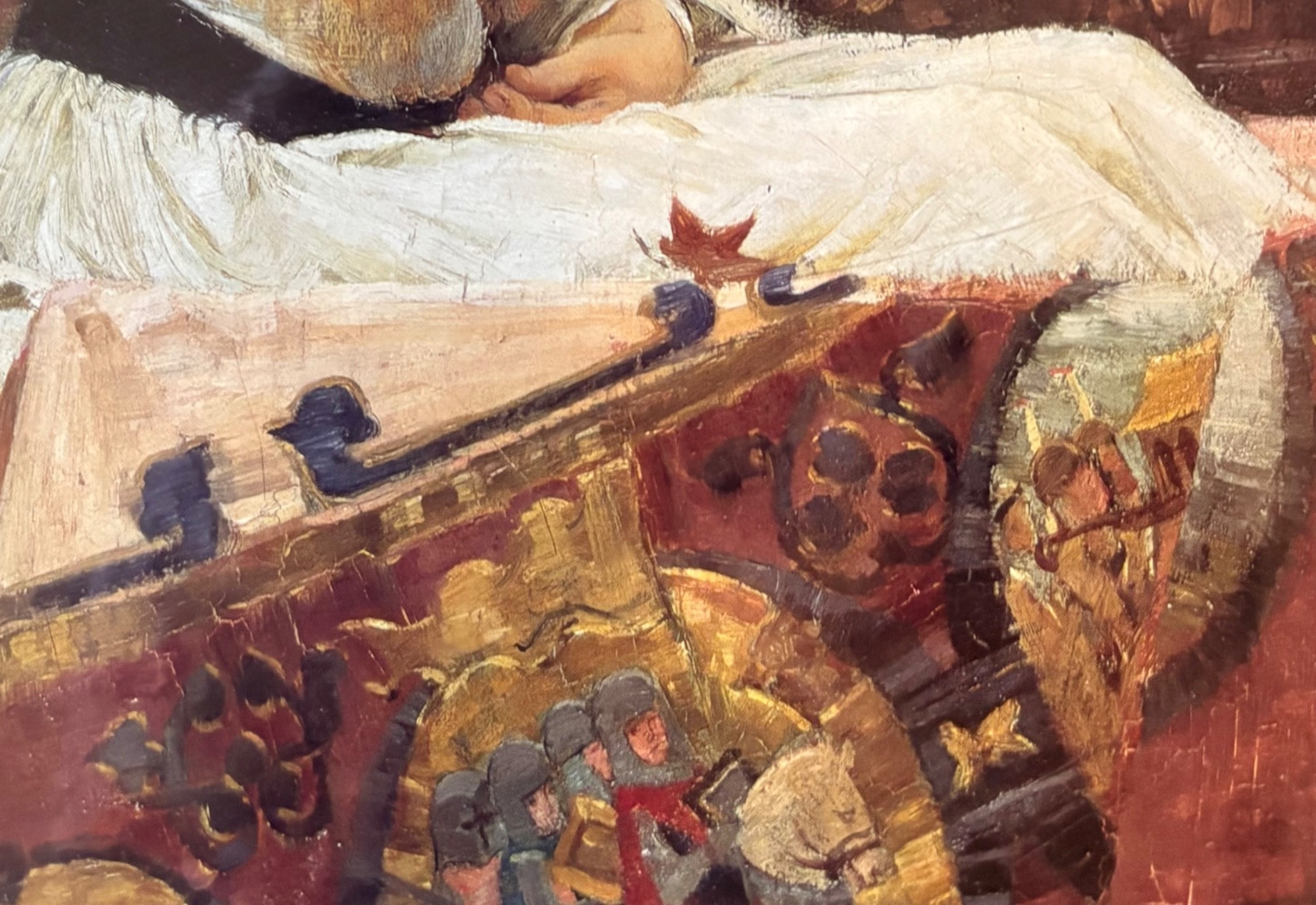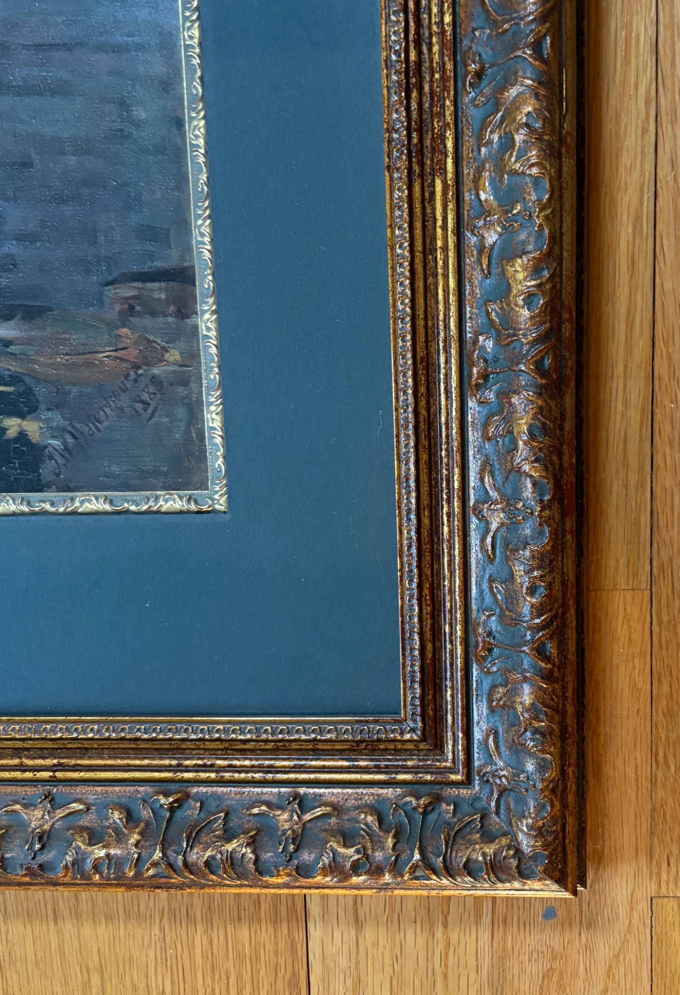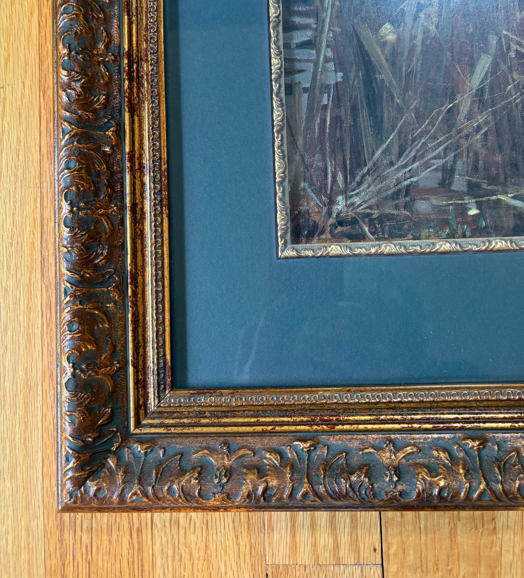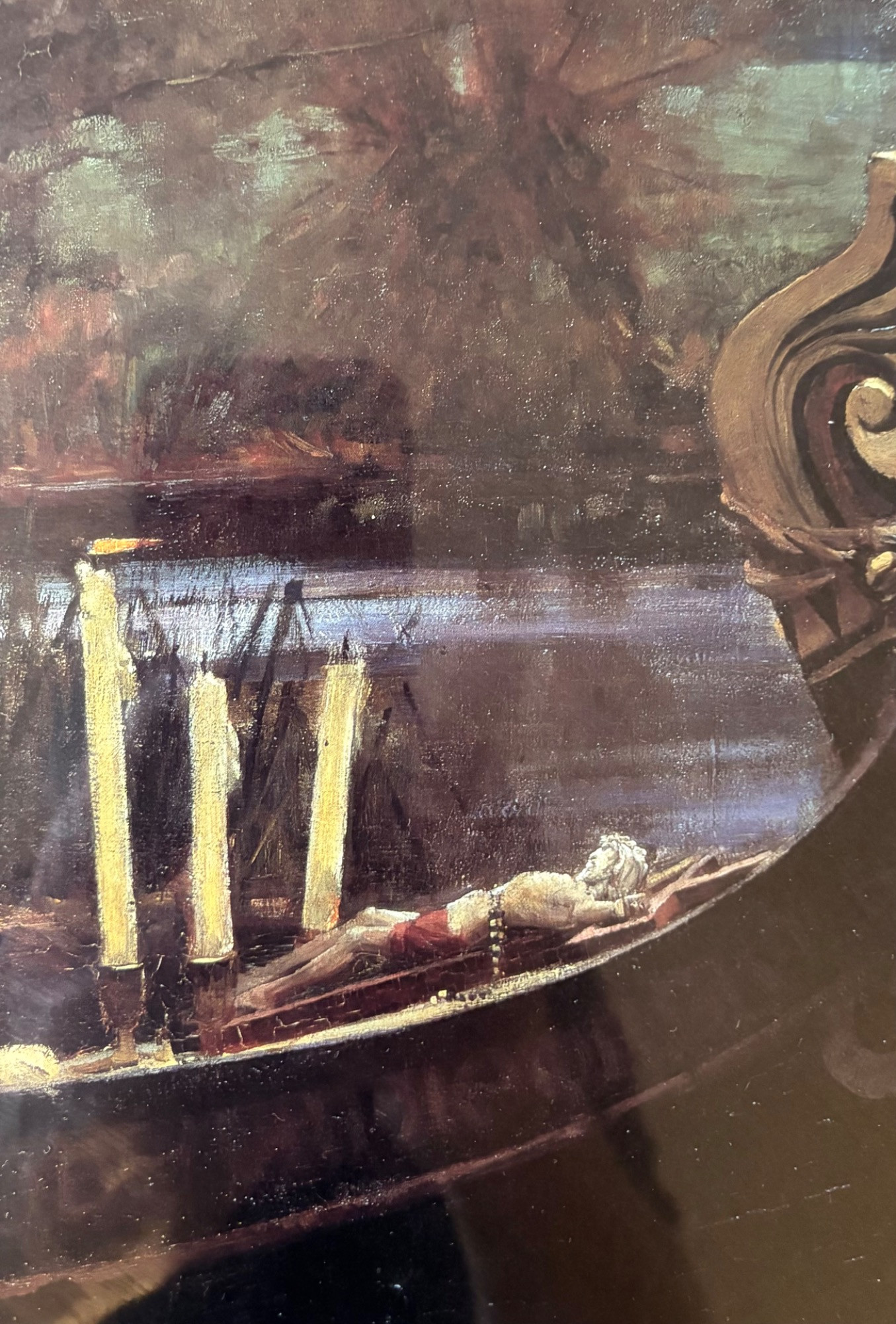 “The Lady of Shalott” by John Waterhouse (1849-1917). Reproduction print of one of this artist's most famous images. Surrounded by a somewhat subdued frame (compared with some of the other frames!). Fairly large at almost 3' wide framed. We are usure of the origin of this reproduction - we think the print itself might have been from Around the Corner Art and then was framed locally, but are not certain. Can be shipped FedEx.