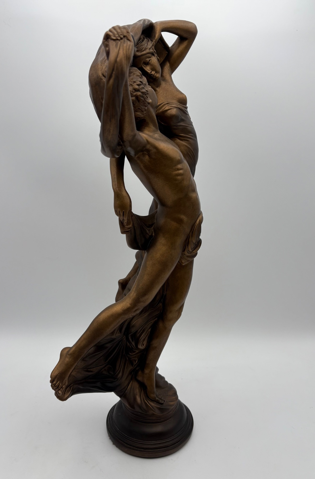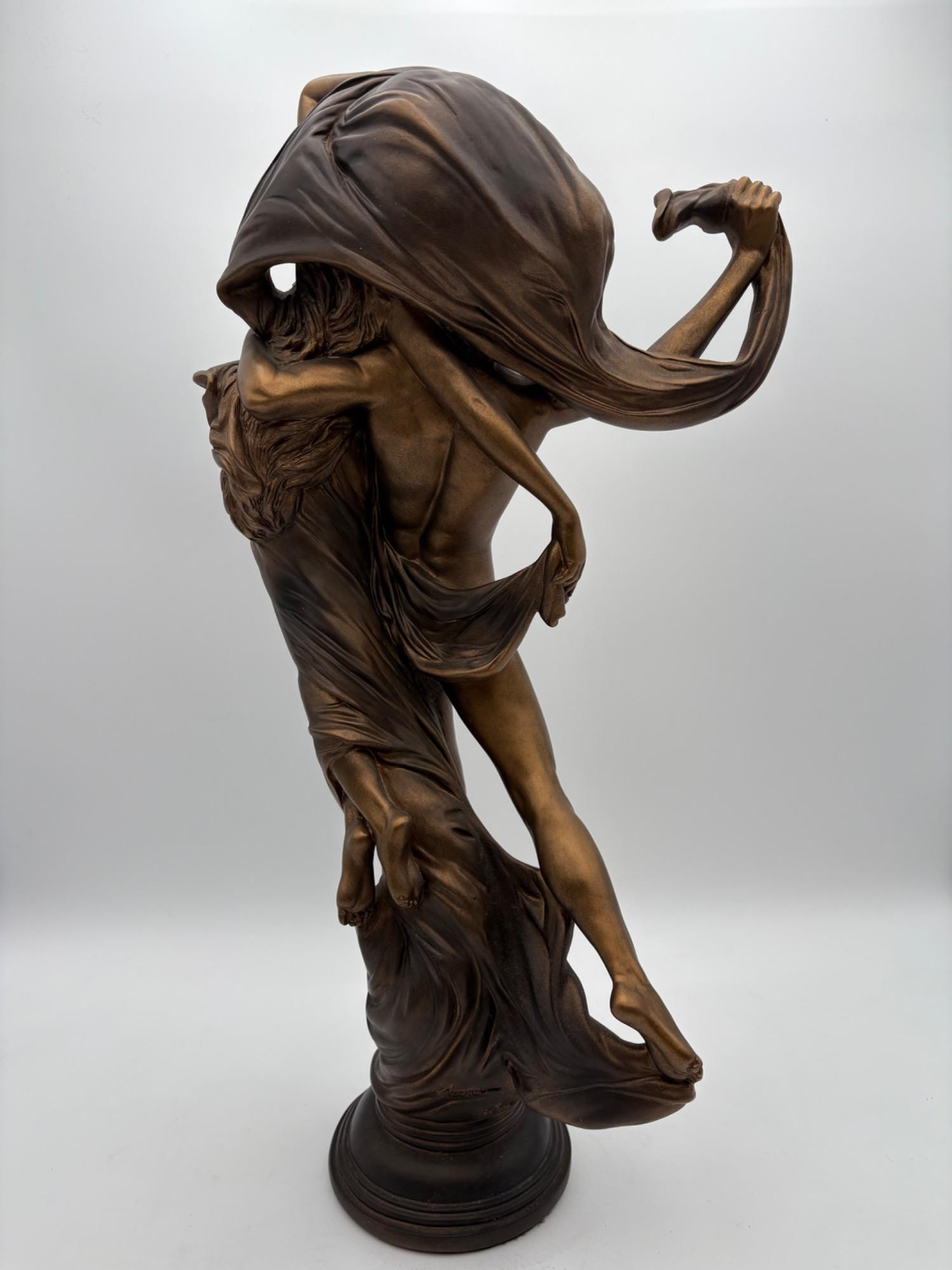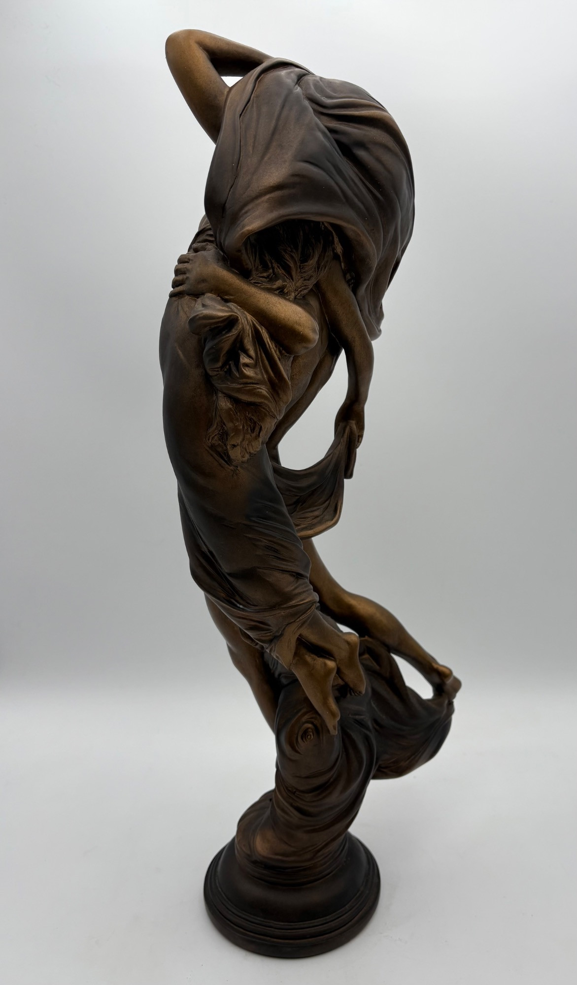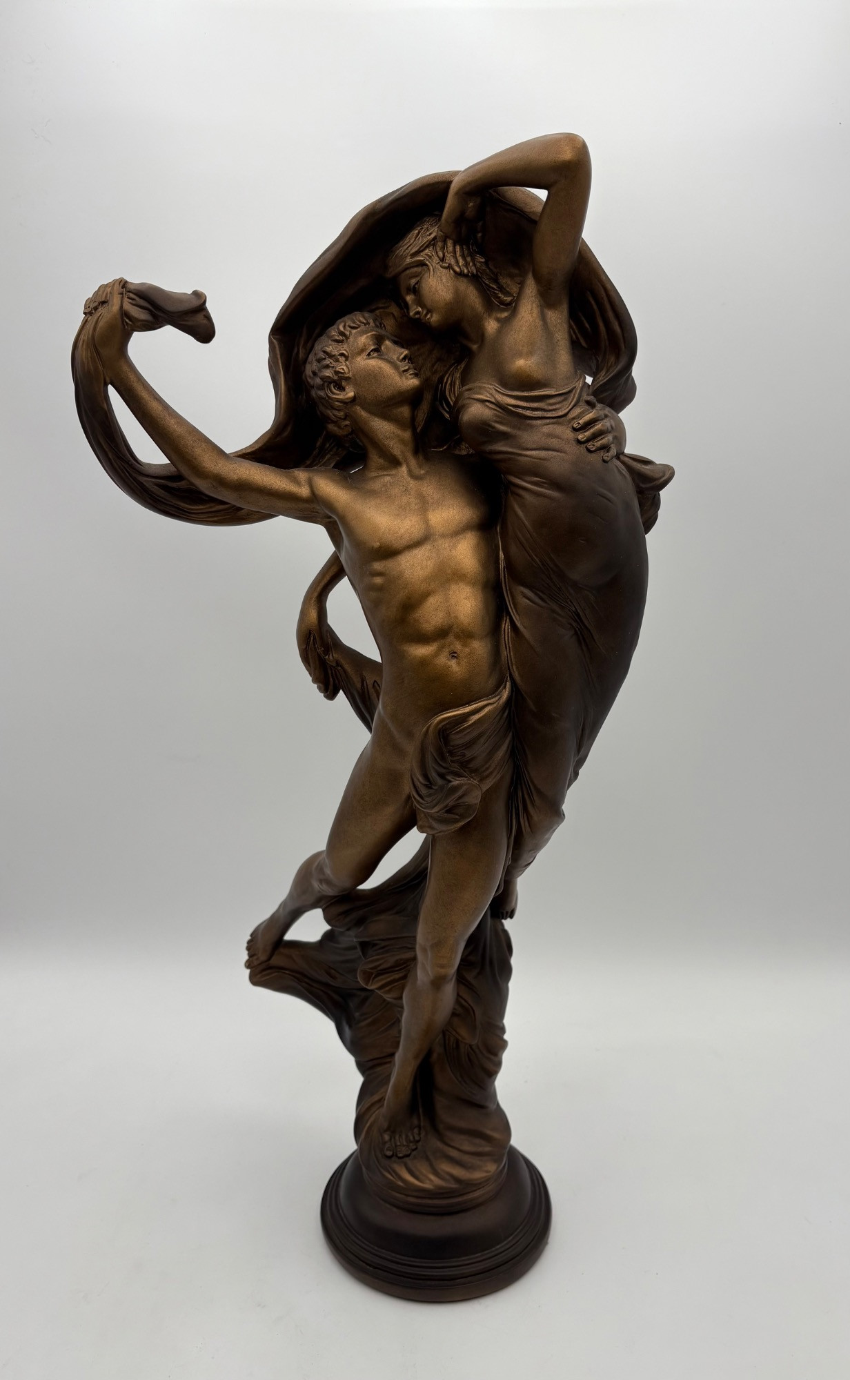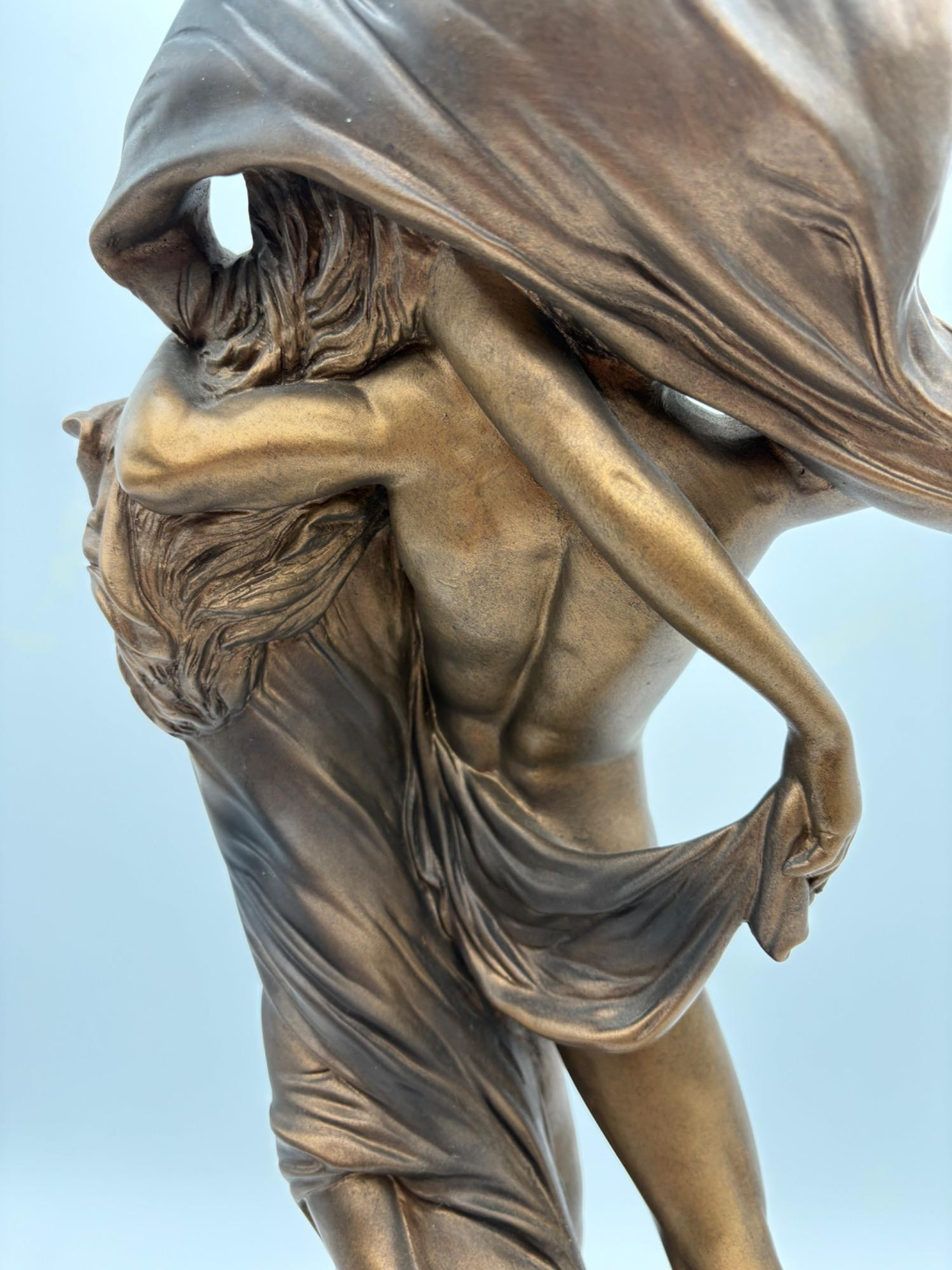 We believe this to be "Zephyr & Psyche" made from Durastone by Austin Sculpture in 1996. Very smooth finish in warm bronze color with high quality casting - no obvious seams or joins. Base is 6" at its widest. Fairly large at about 2' high.