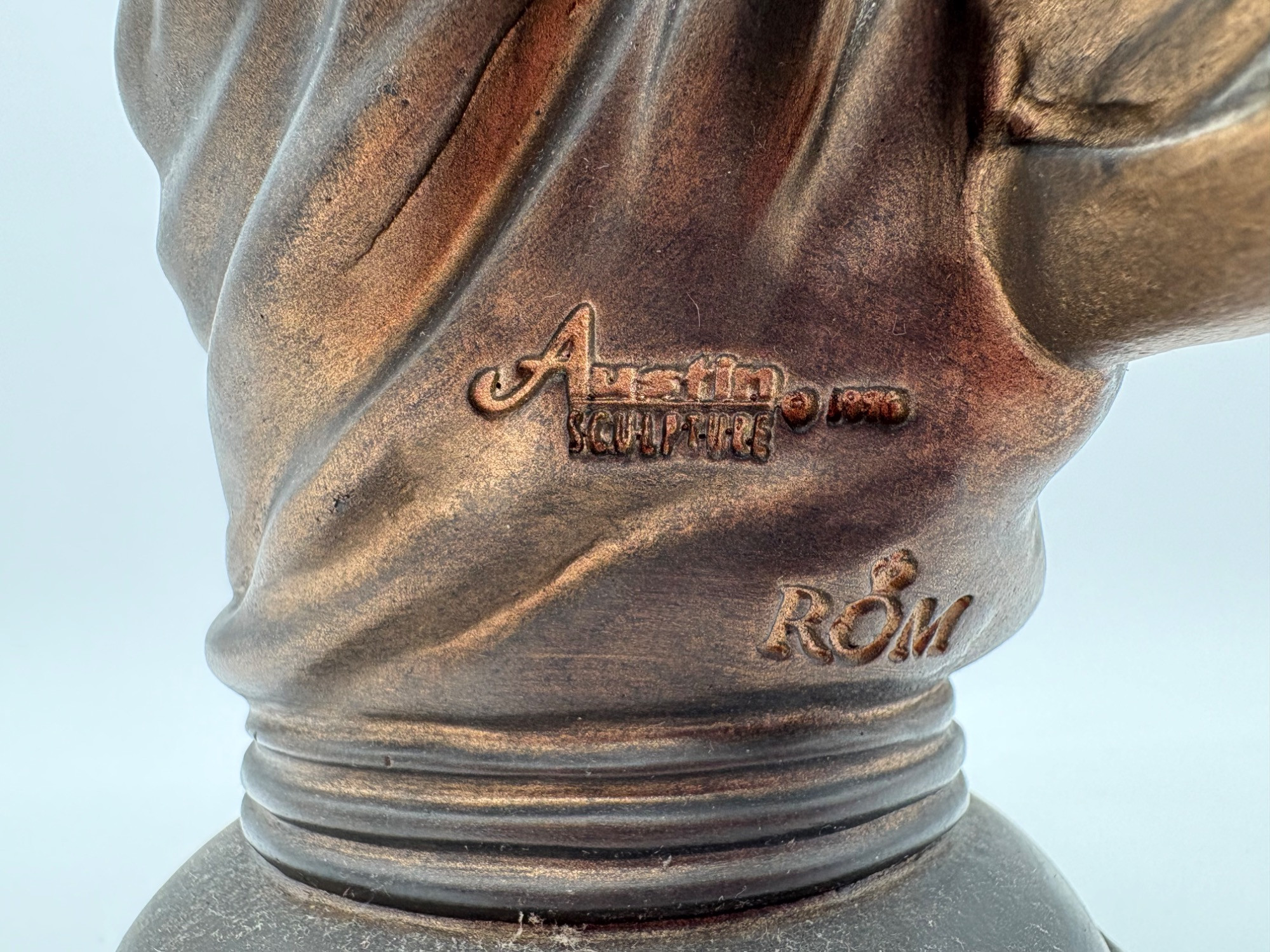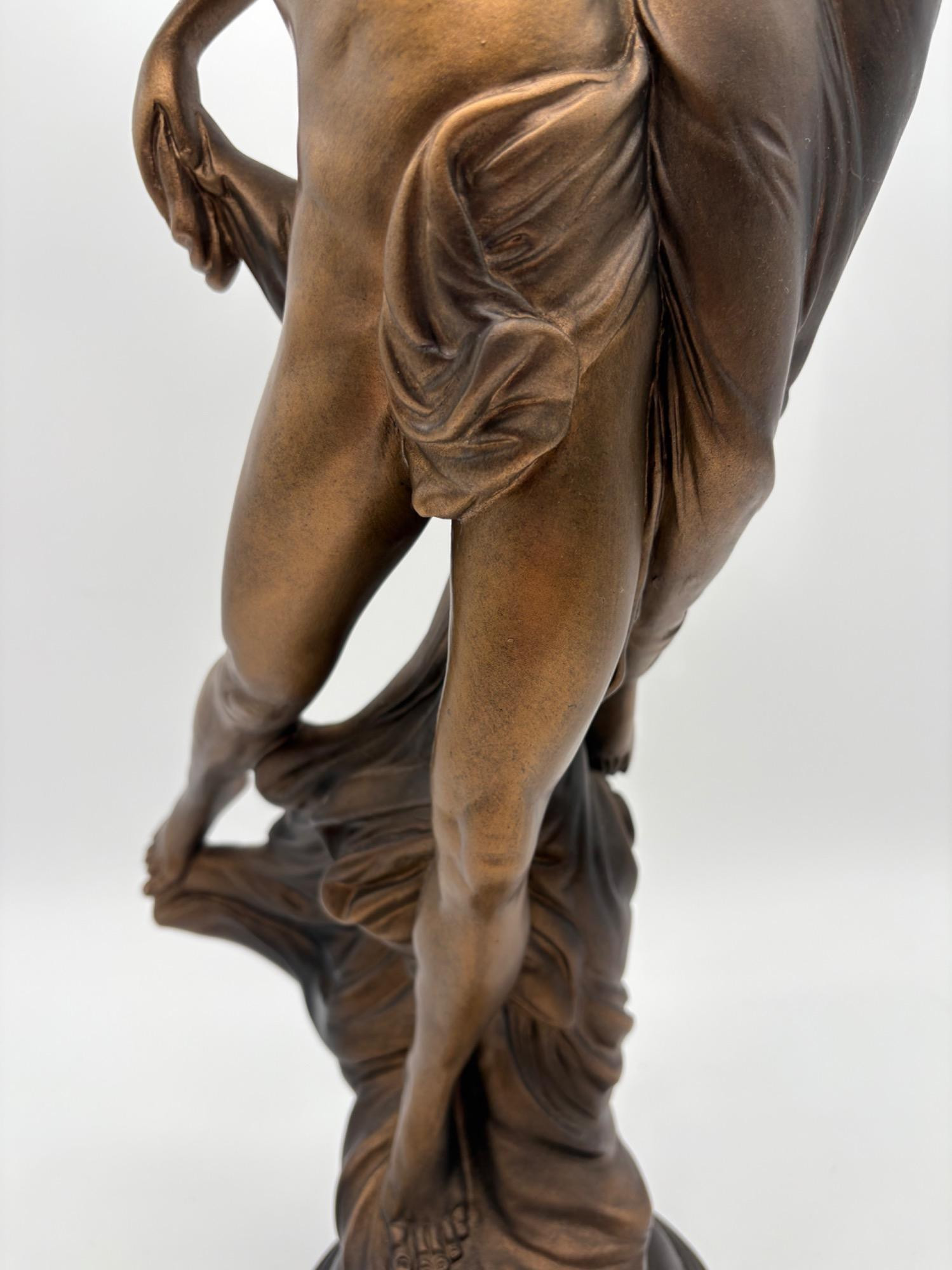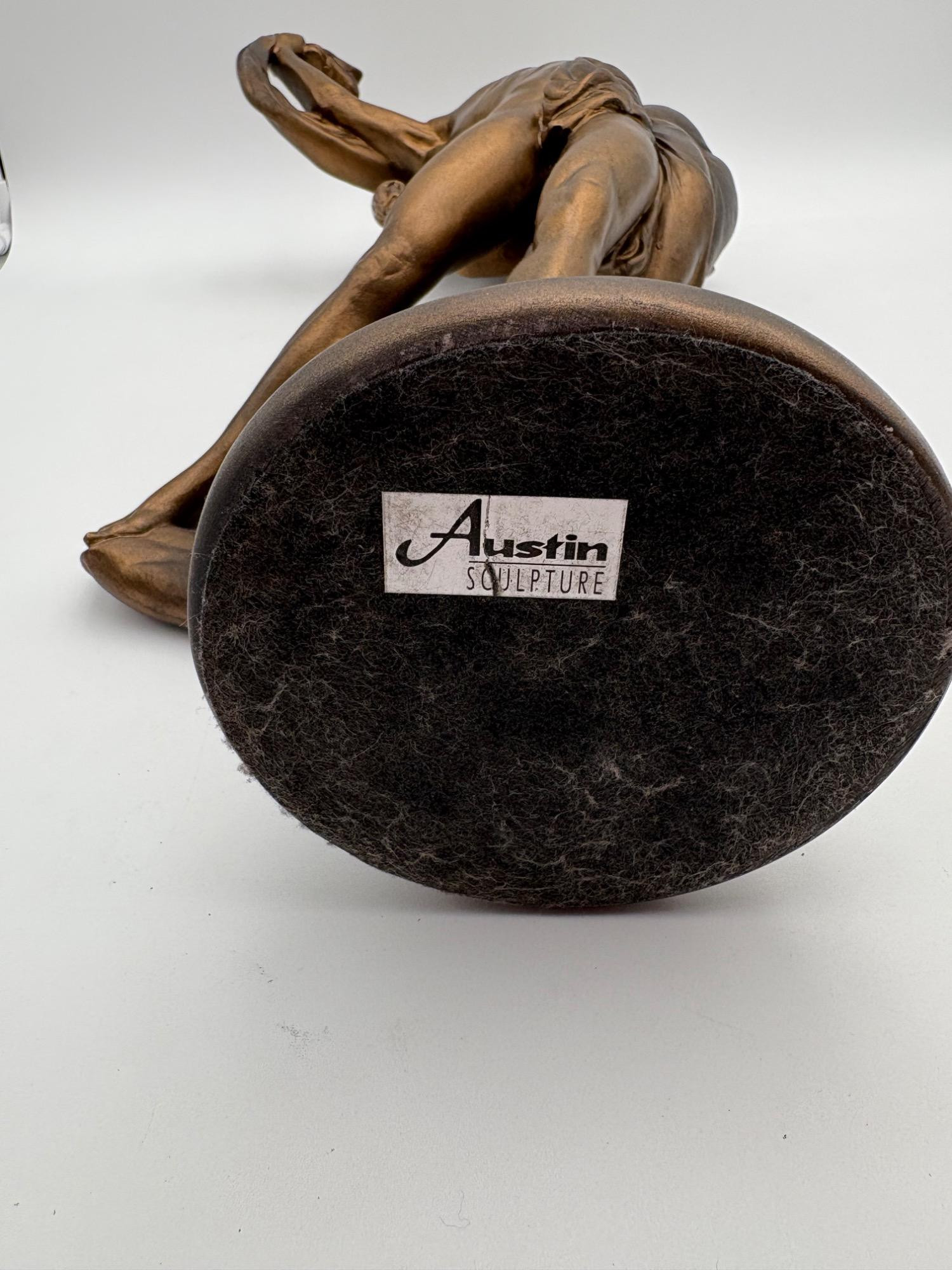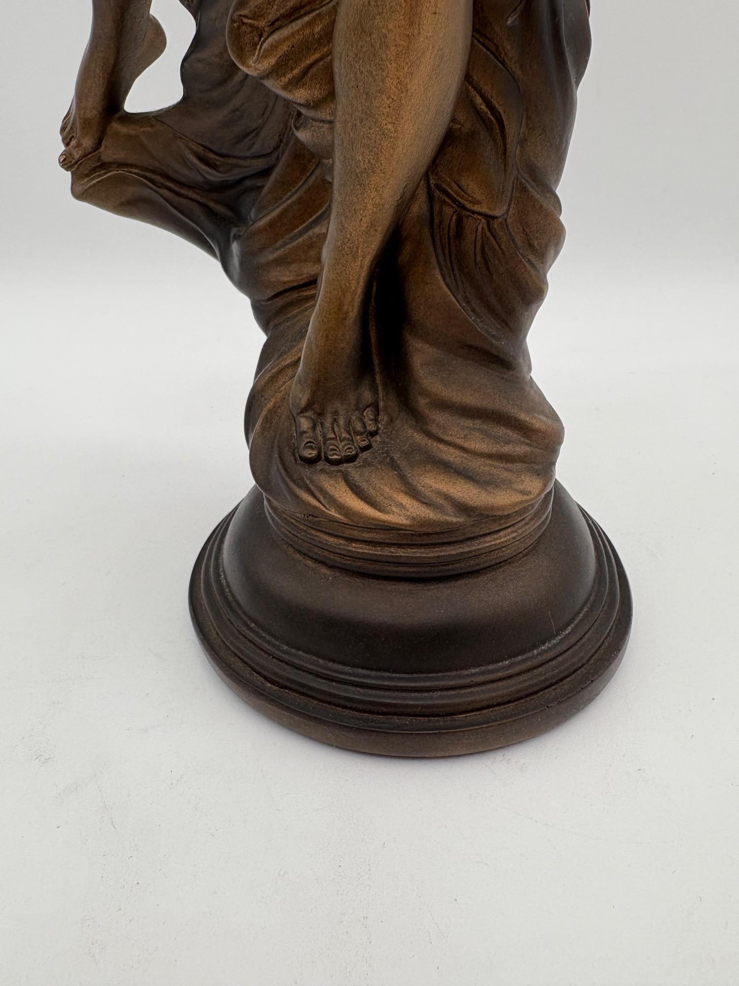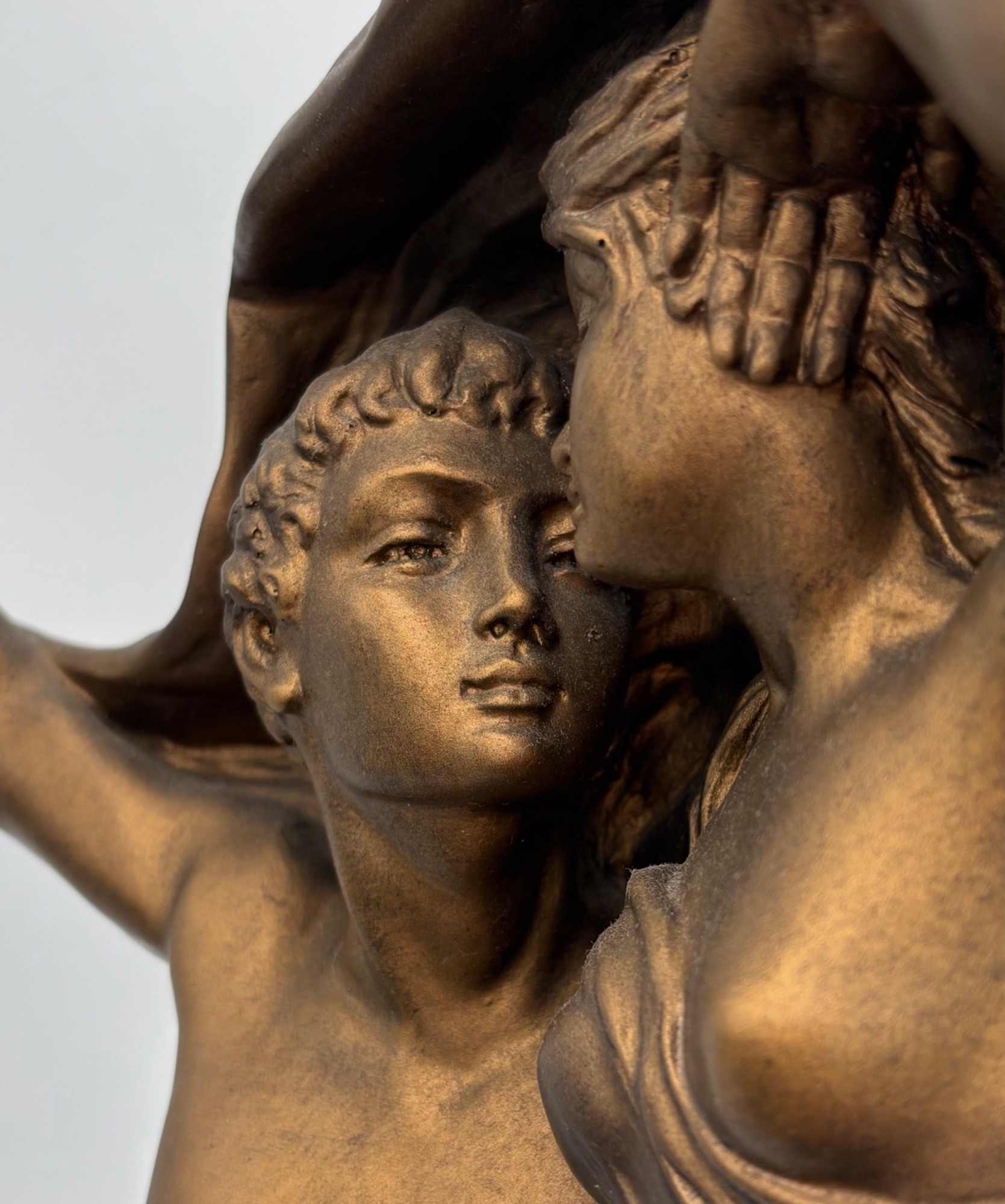 We believe this to be "Zephyr & Psyche" made from Durastone by Austin Sculpture in 1996. Very smooth finish in warm bronze color with high quality casting - no obvious seams or joins. Base is 6" at its widest. Fairly large at about 2' high.