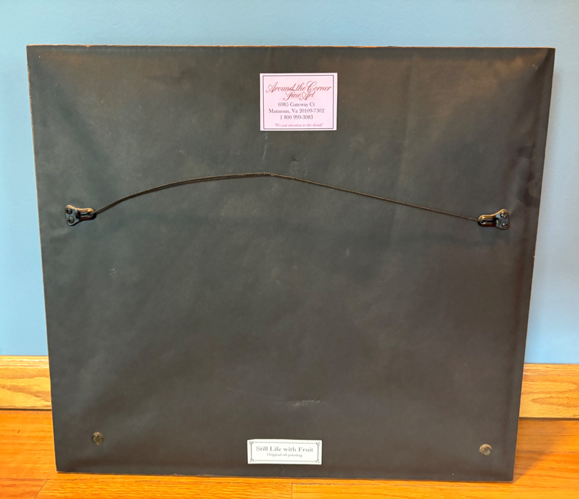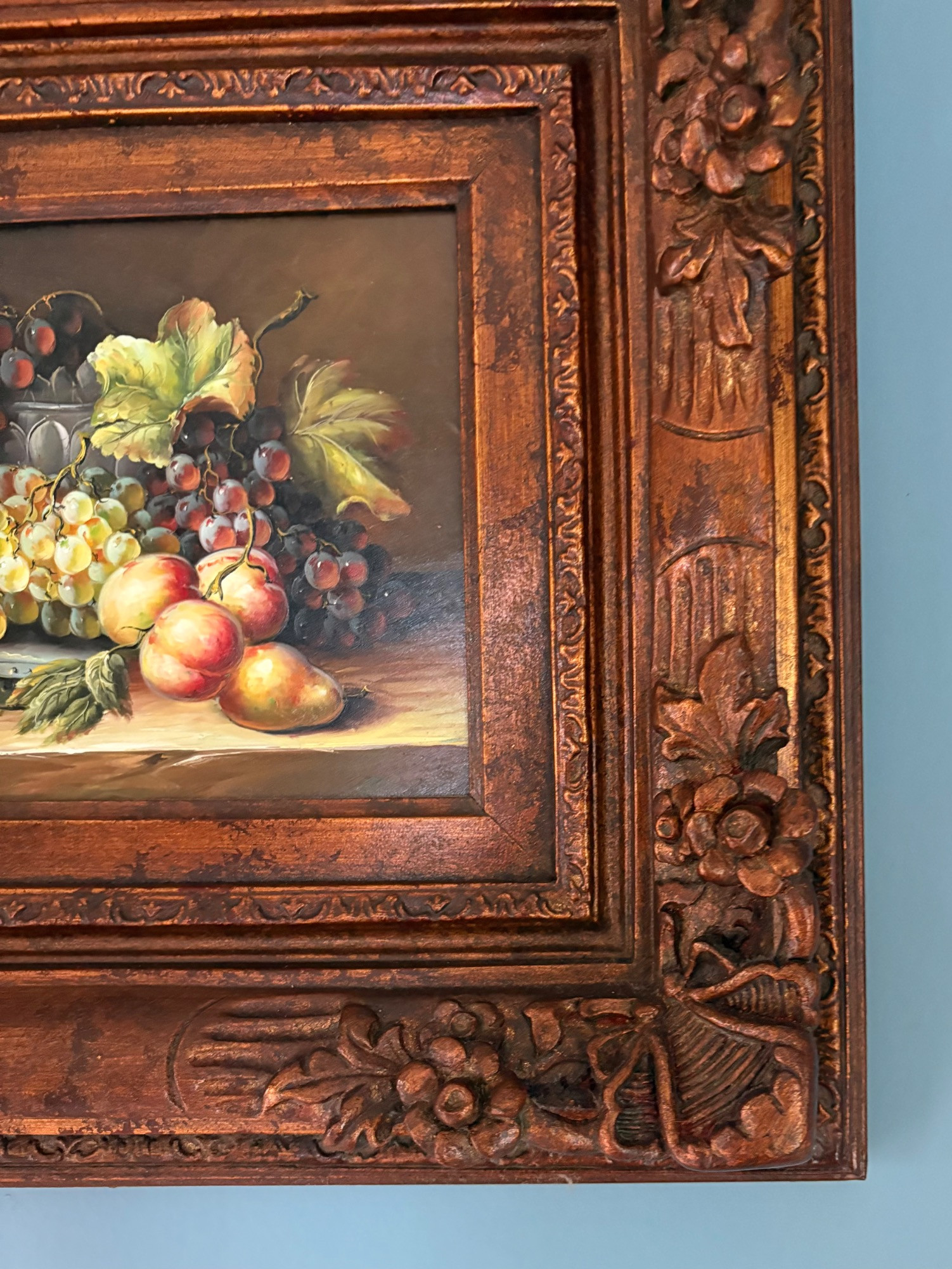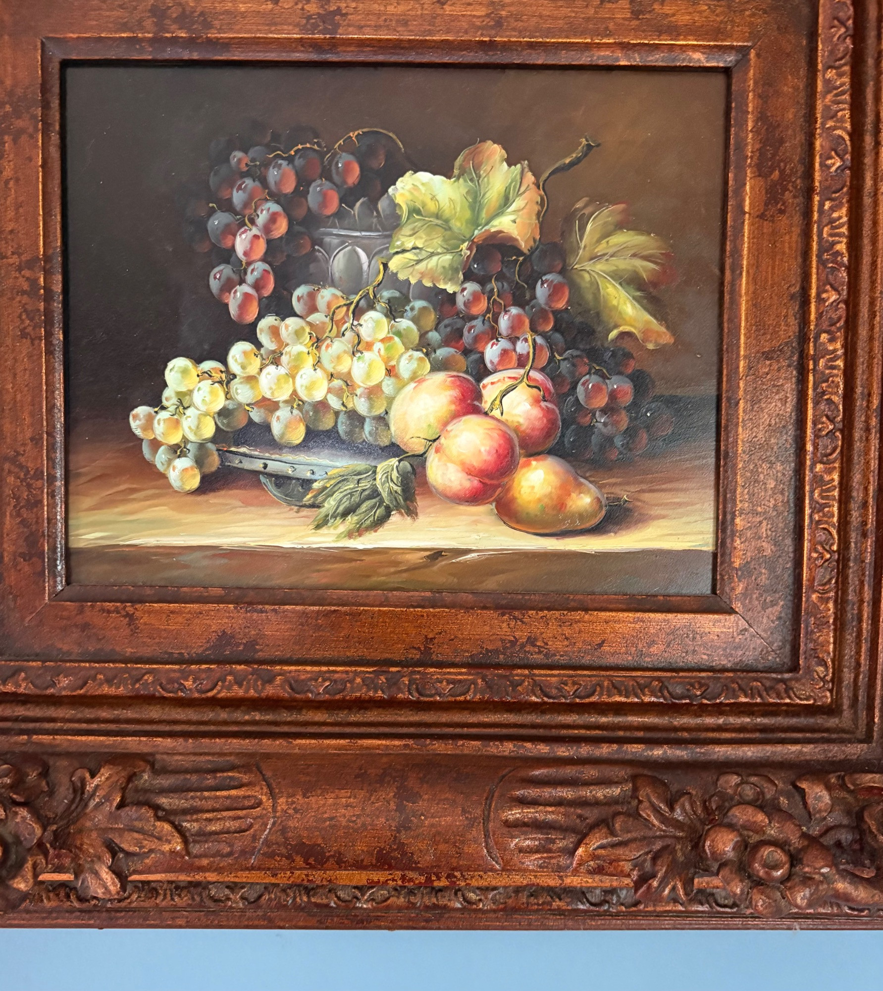 Original oil painting - still life image of fruit (peaches and grapes) on wood panel. Artist unknown. Framed in a detailed relief carved wood frame. Smaller piece at about 1.5' square. From Around the Corner Fine Art of Virginia known for producing high quality reproductions & frames in the 1980s & 1990s (Sadly, they appear to have closed shop in the early 2000s). We found a catalogue offering many of the exact works our client owned that roughly aligns with our client's purchase dates (pre-internet when everything was phone ordered or mail ordered). For those curious about the original price range/production of the paintings, see catalogue info in photos below after the listing photos. Can be shipped FedEx.