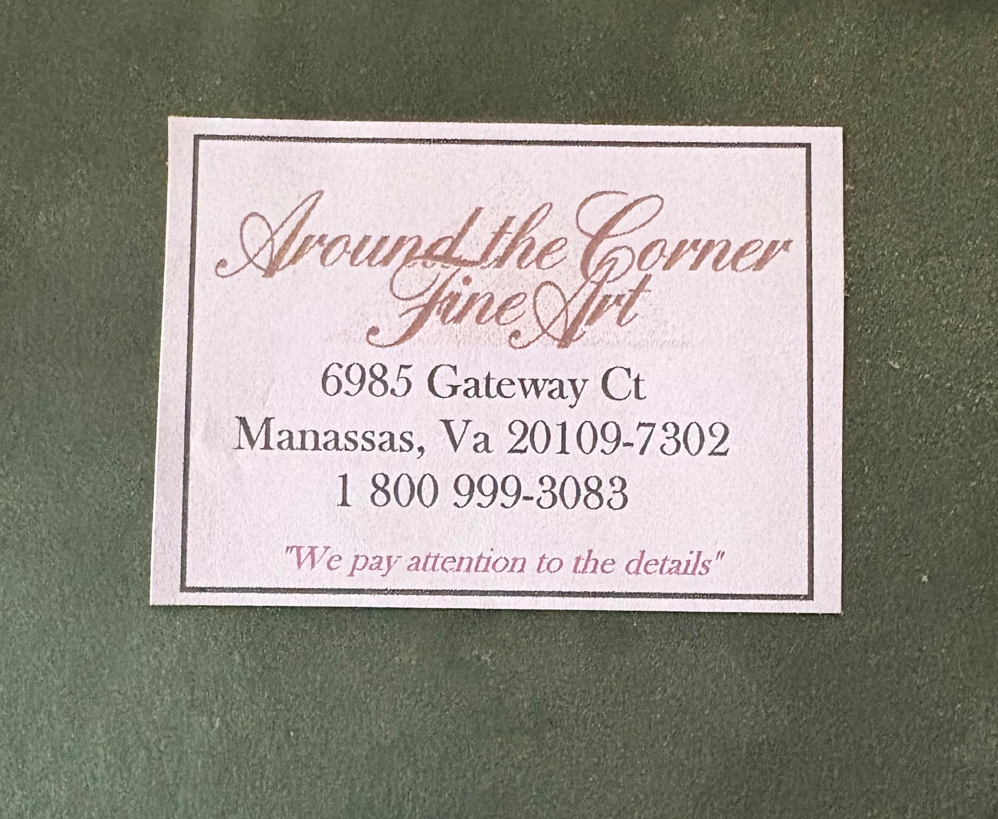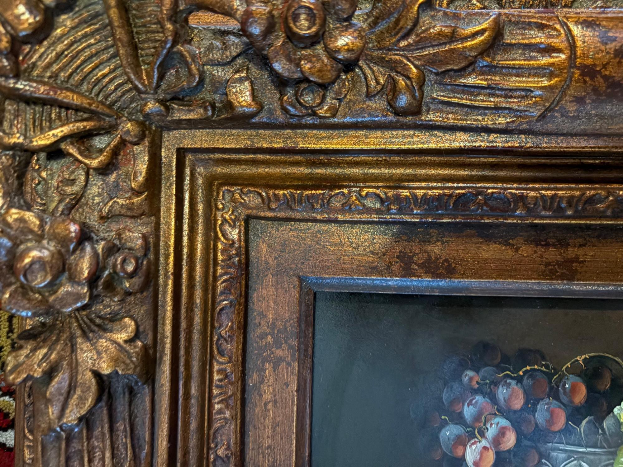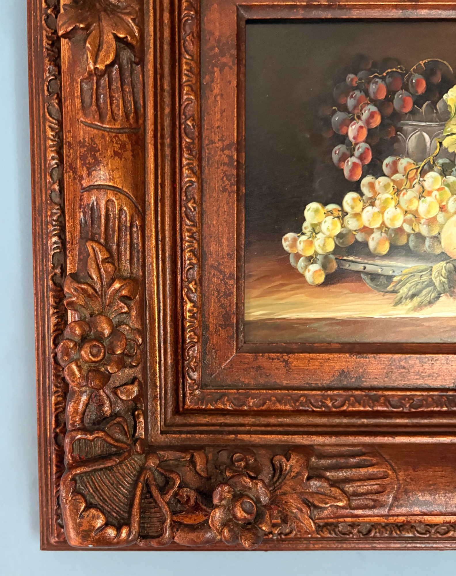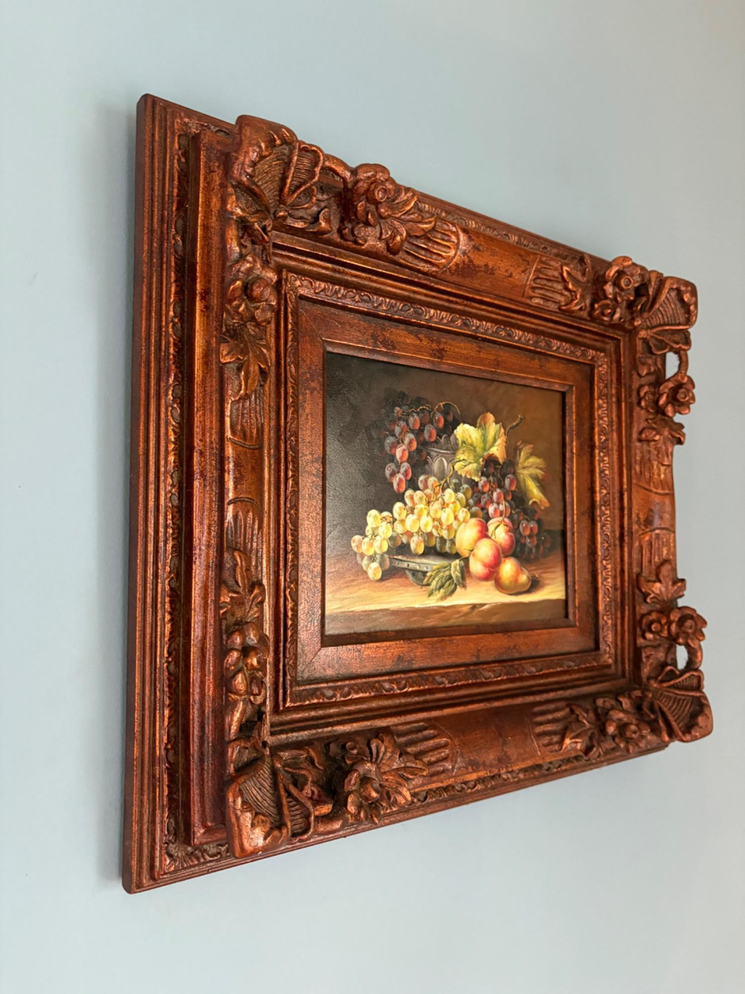 Original oil painting - still life image of fruit (peaches and grapes) on wood panel. Artist unknown. Framed in a detailed relief carved wood frame. Smaller piece at about 1.5' square. From Around the Corner Fine Art of Virginia known for producing high quality reproductions & frames in the 1980s & 1990s (Sadly, they appear to have closed shop in the early 2000s). We found a catalogue offering many of the exact works our client owned that roughly aligns with our client's purchase dates (pre-internet when everything was phone ordered or mail ordered). For those curious about the original price range/production of the paintings, see catalogue info in photos below after the listing photos. Can be shipped FedEx.