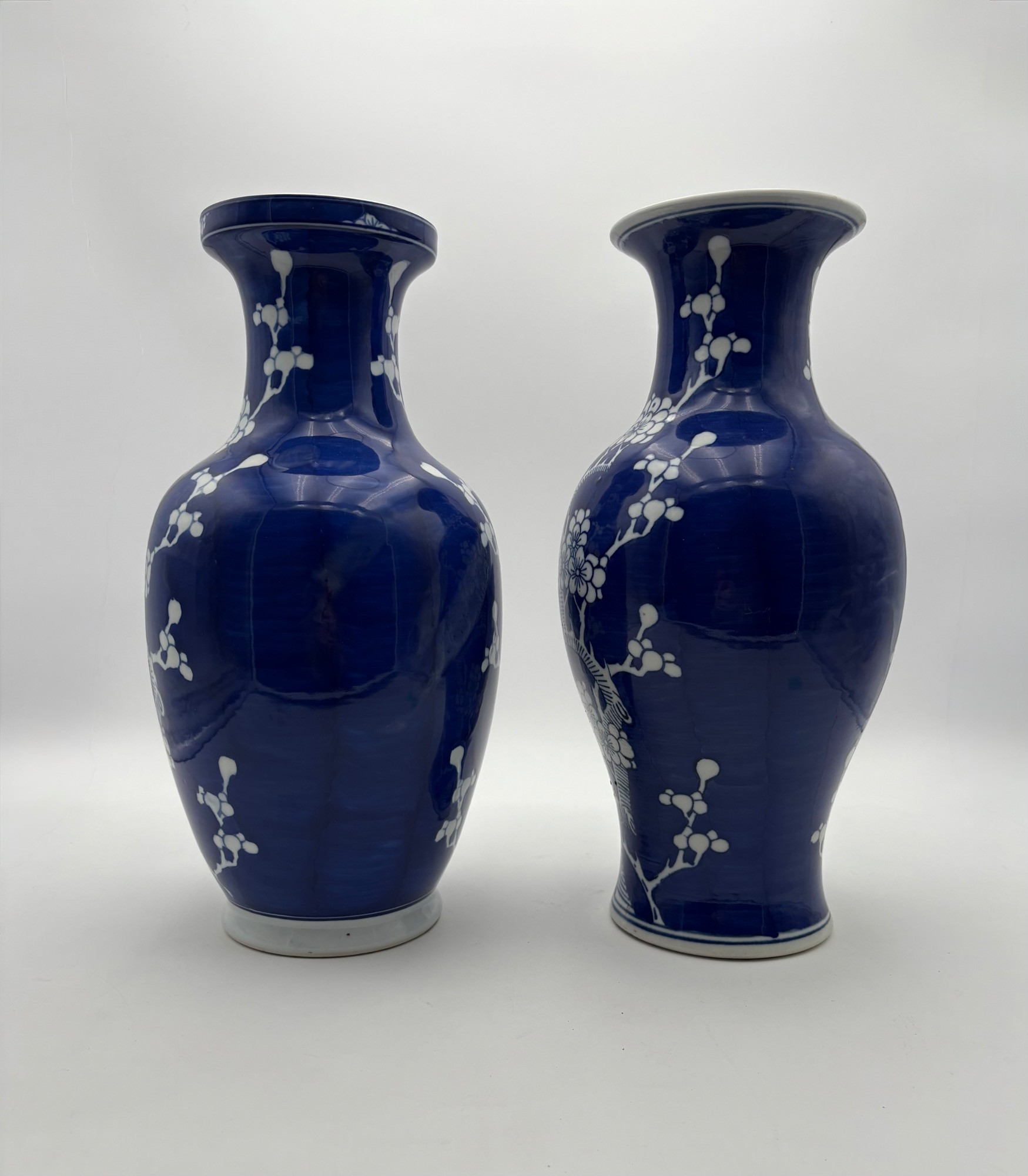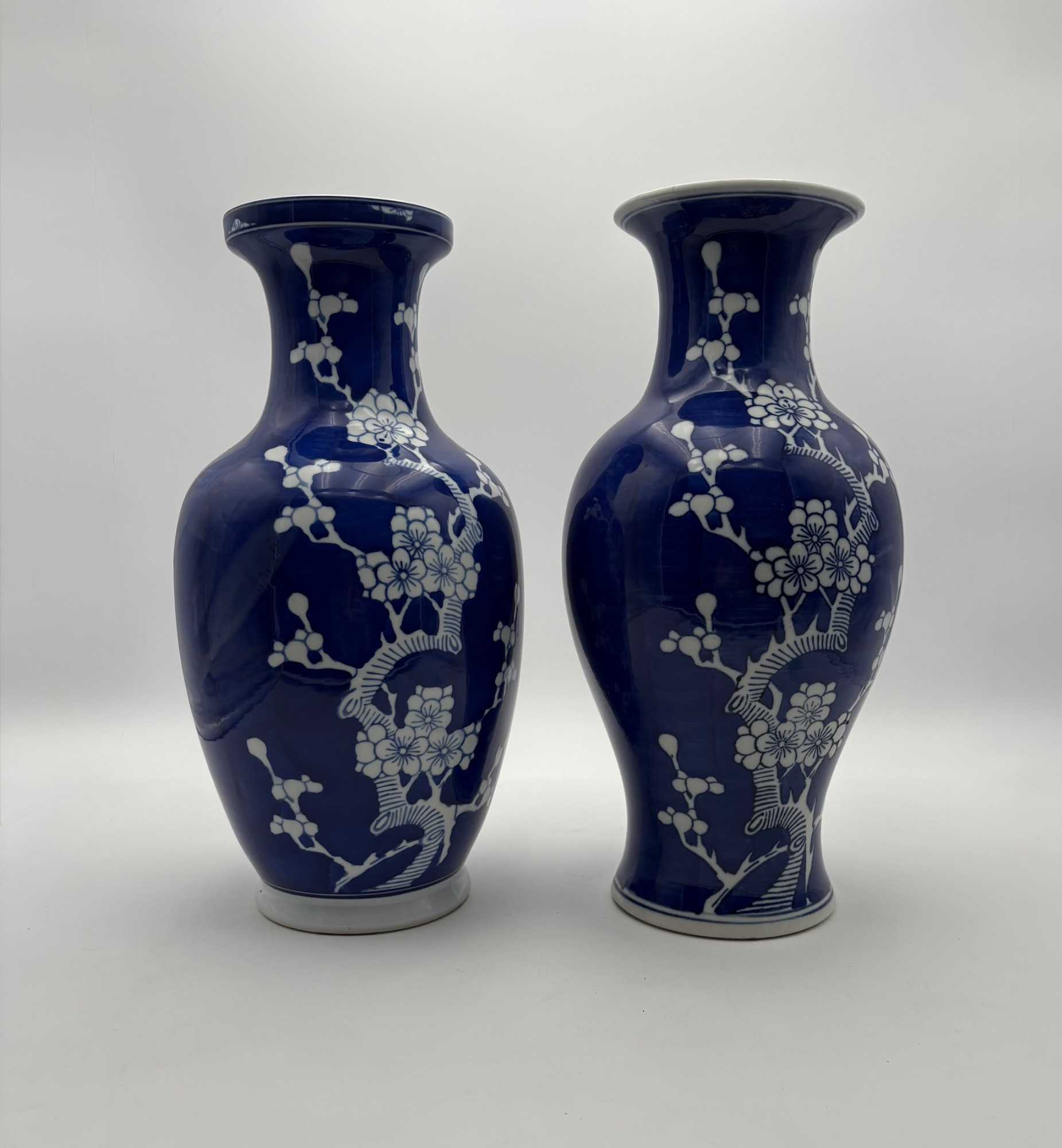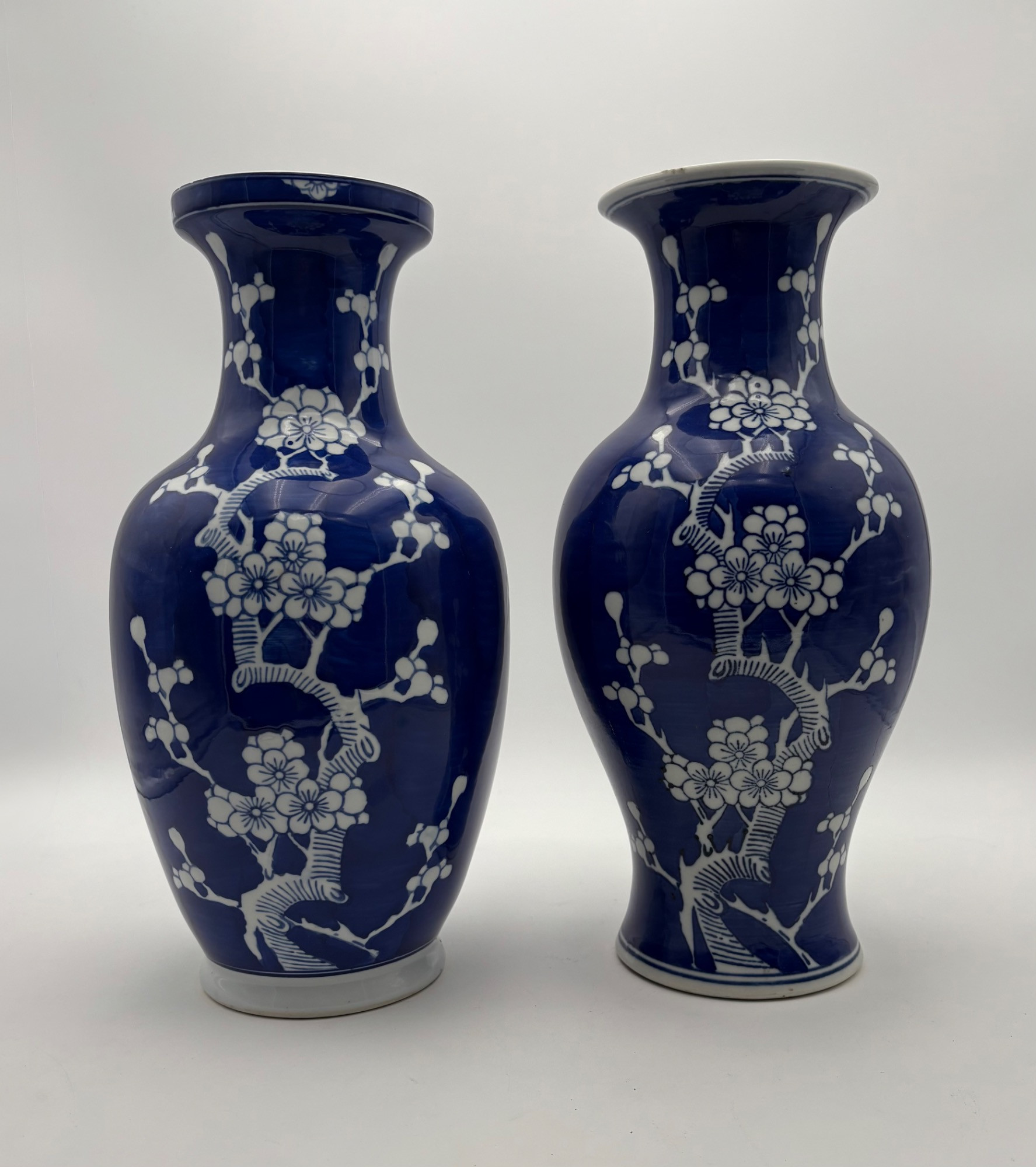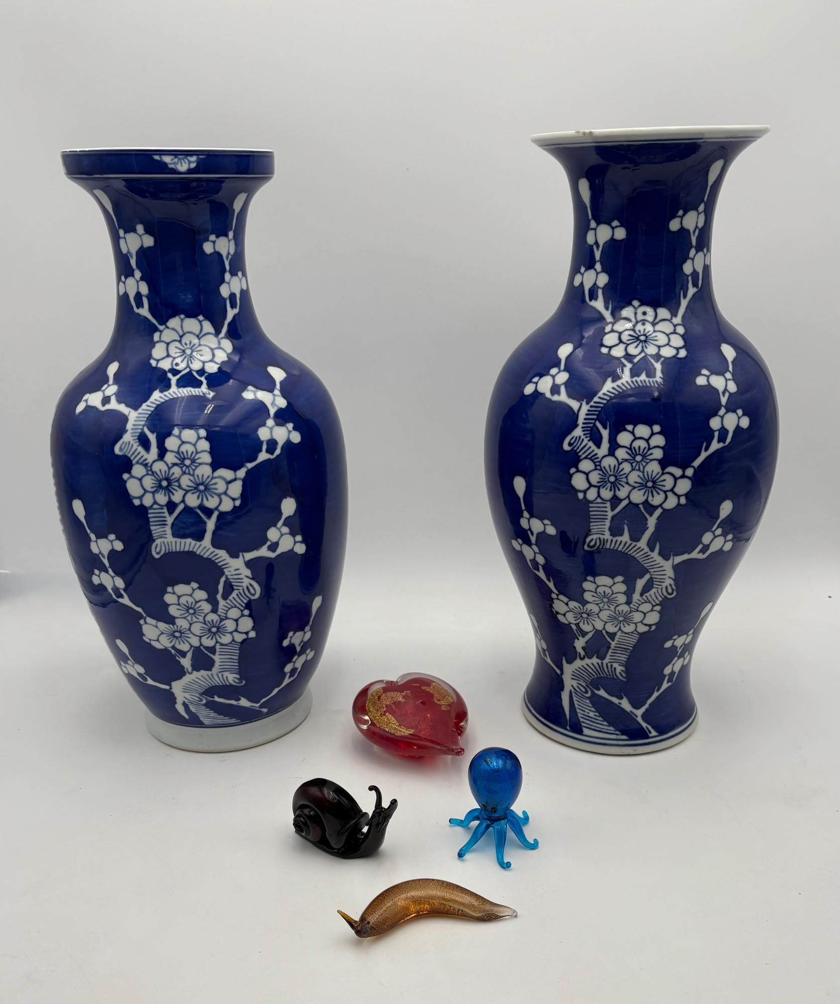 Two nearly identical vases in blue & white decorated with classic Asian floral motif. Both measure approximately 14.5" H. They work together, but are not identical in profile - both the lips and shaping are slightly different. Pair of wooden stands accompany them. Note - there is a hairline crack at the top of the right vase with some slight rubbing /chipping on the lip. There appears to be a flaw in the underglazing on the vase on the left. Neither is really noticeable unless you are inspecting closely - see last 2 photos. Four glass figures. Largest is the heart that measures 4" L x 3" W x 1.5" H.