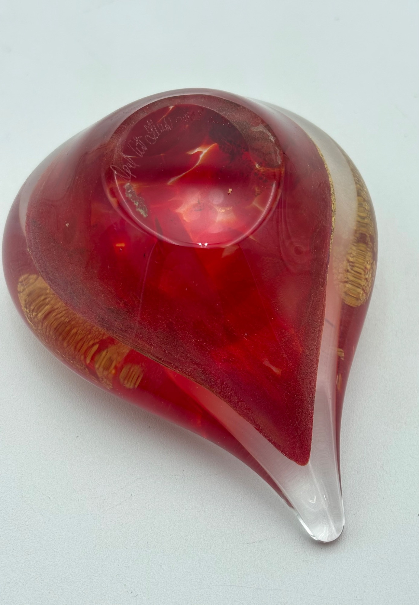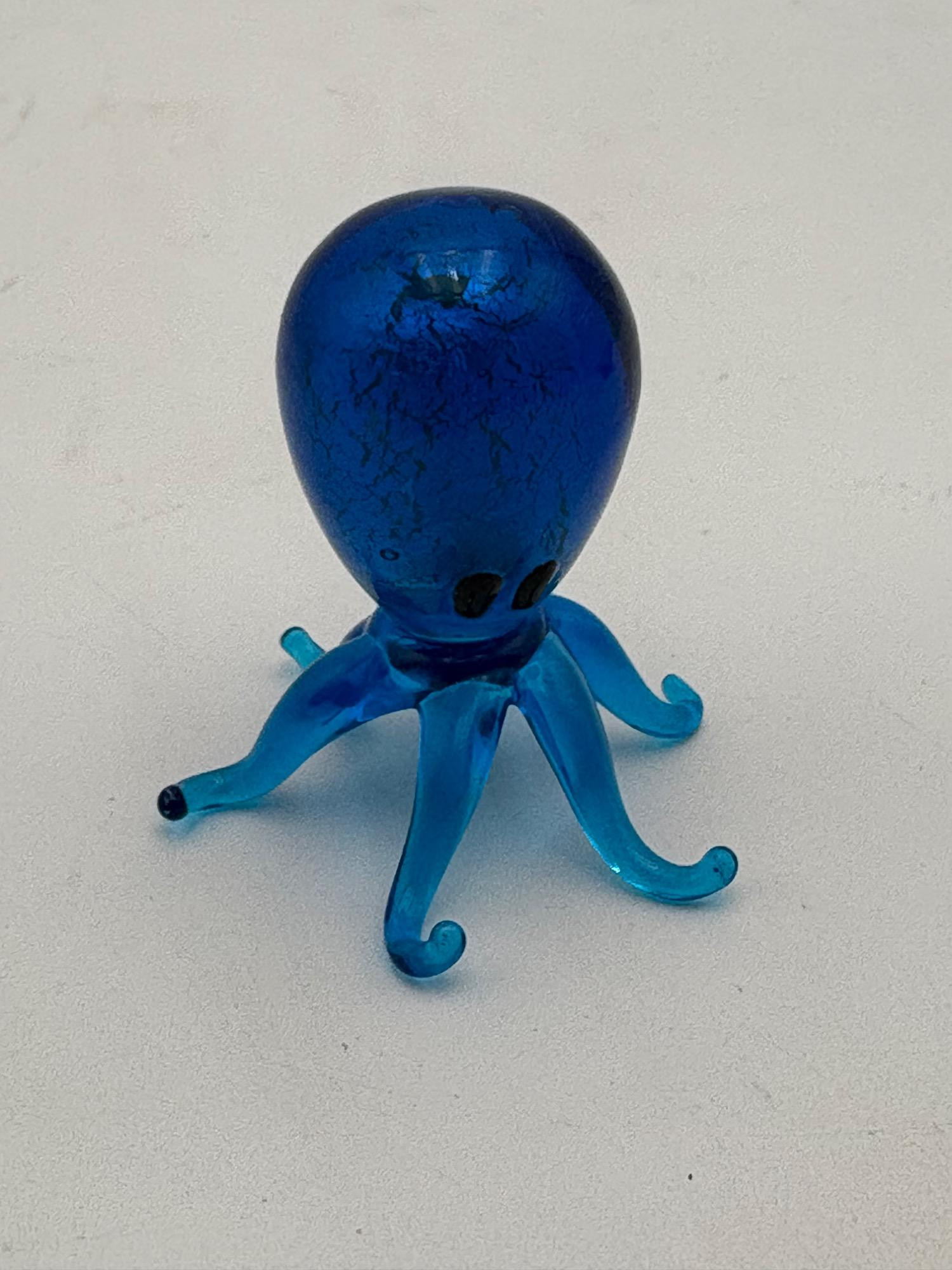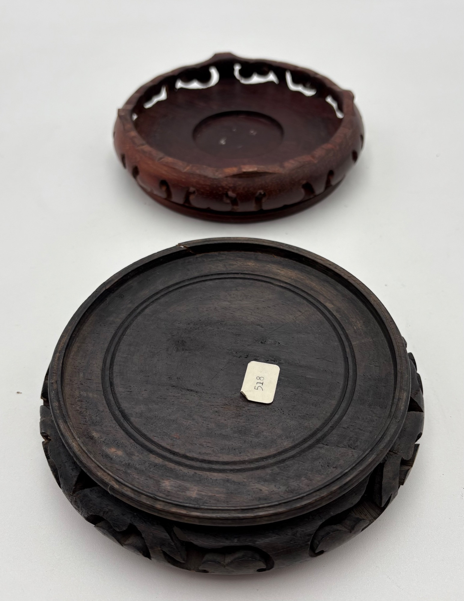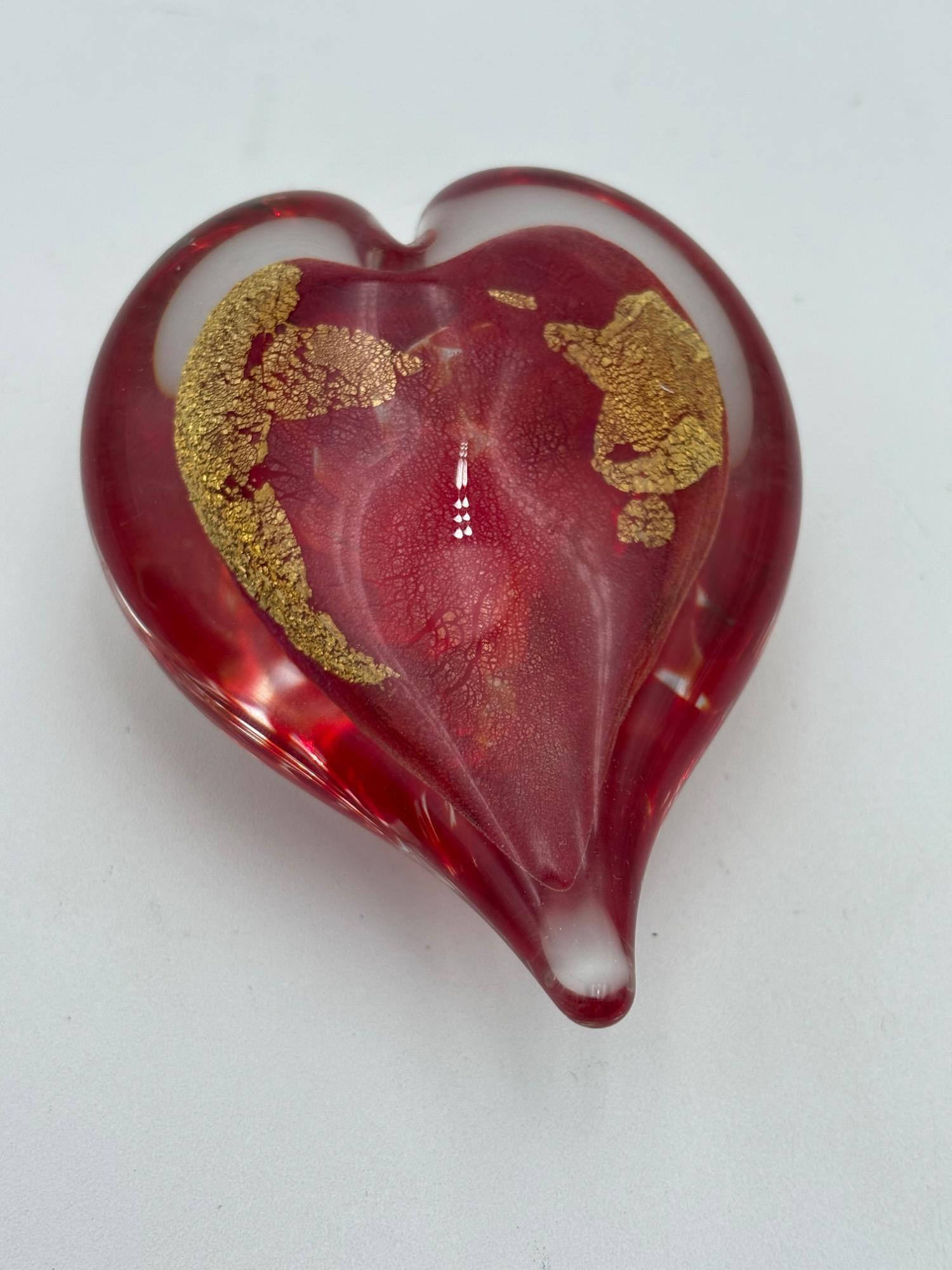 Two nearly identical vases in blue & white decorated with classic Asian floral motif. Both measure approximately 14.5" H. They work together, but are not identical in profile - both the lips and shaping are slightly different. Pair of wooden stands accompany them. Note - there is a hairline crack at the top of the right vase with some slight rubbing /chipping on the lip. There appears to be a flaw in the underglazing on the vase on the left. Neither is really noticeable unless you are inspecting closely - see last 2 photos. Four glass figures. Largest is the heart that measures 4" L x 3" W x 1.5" H.