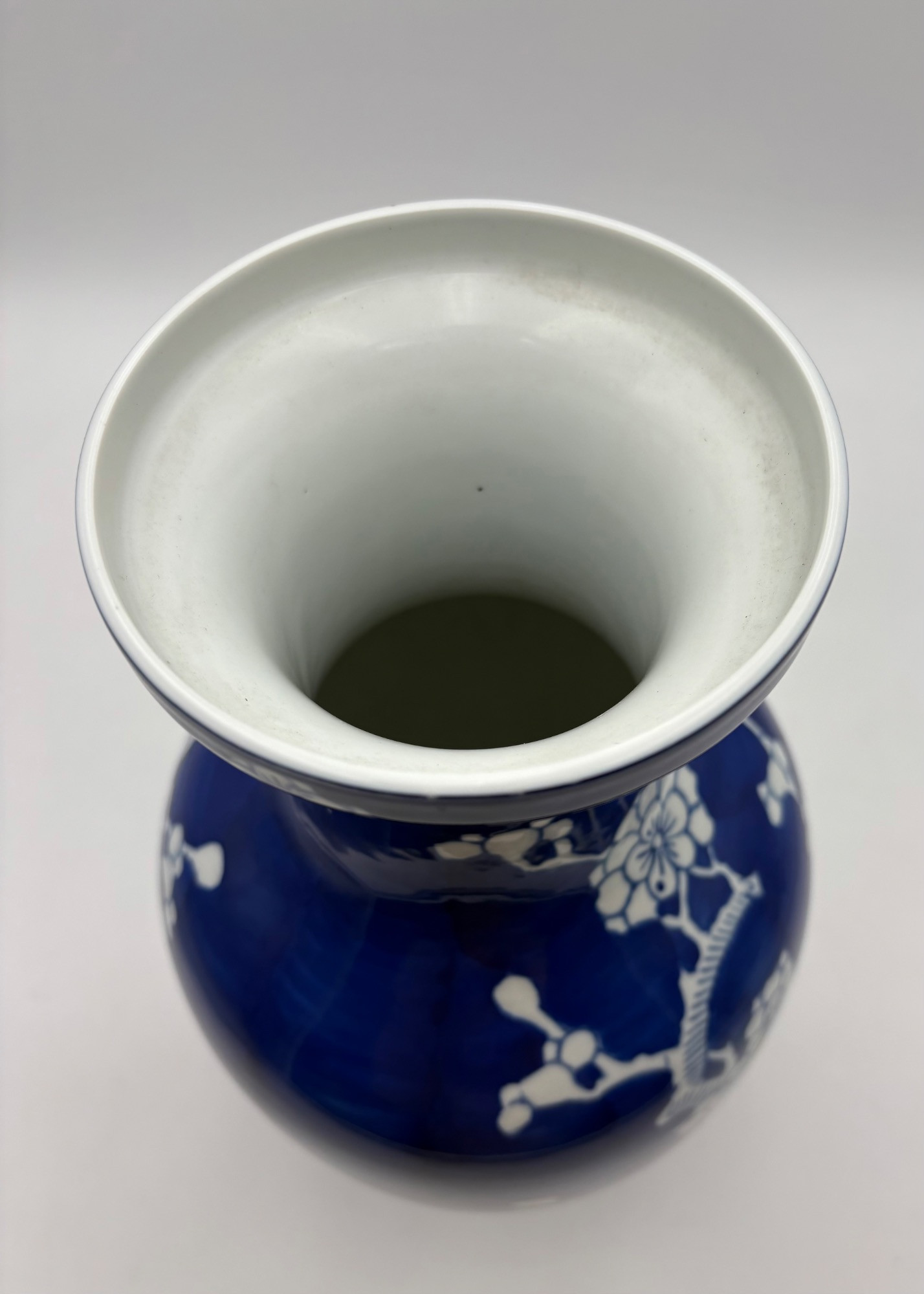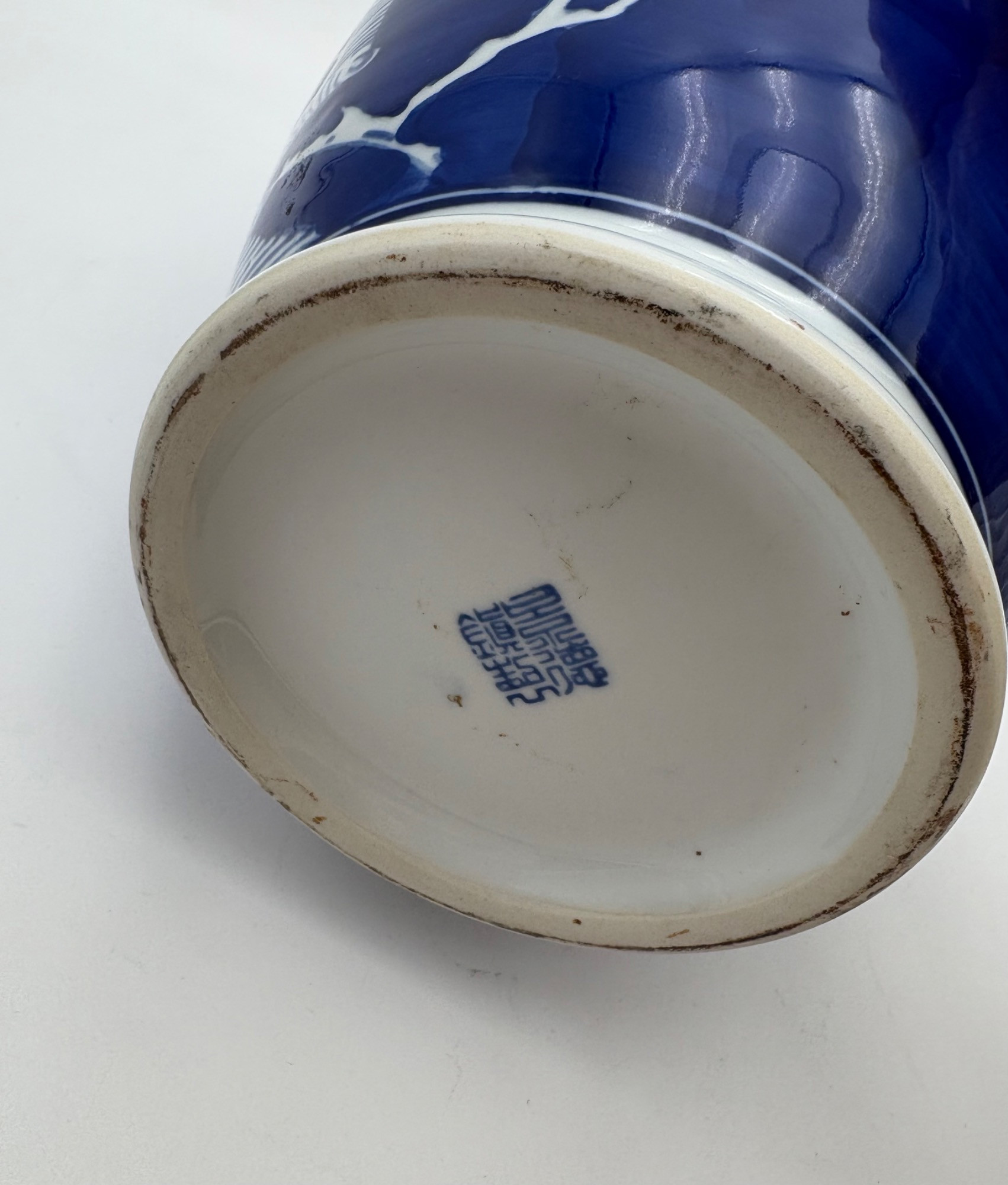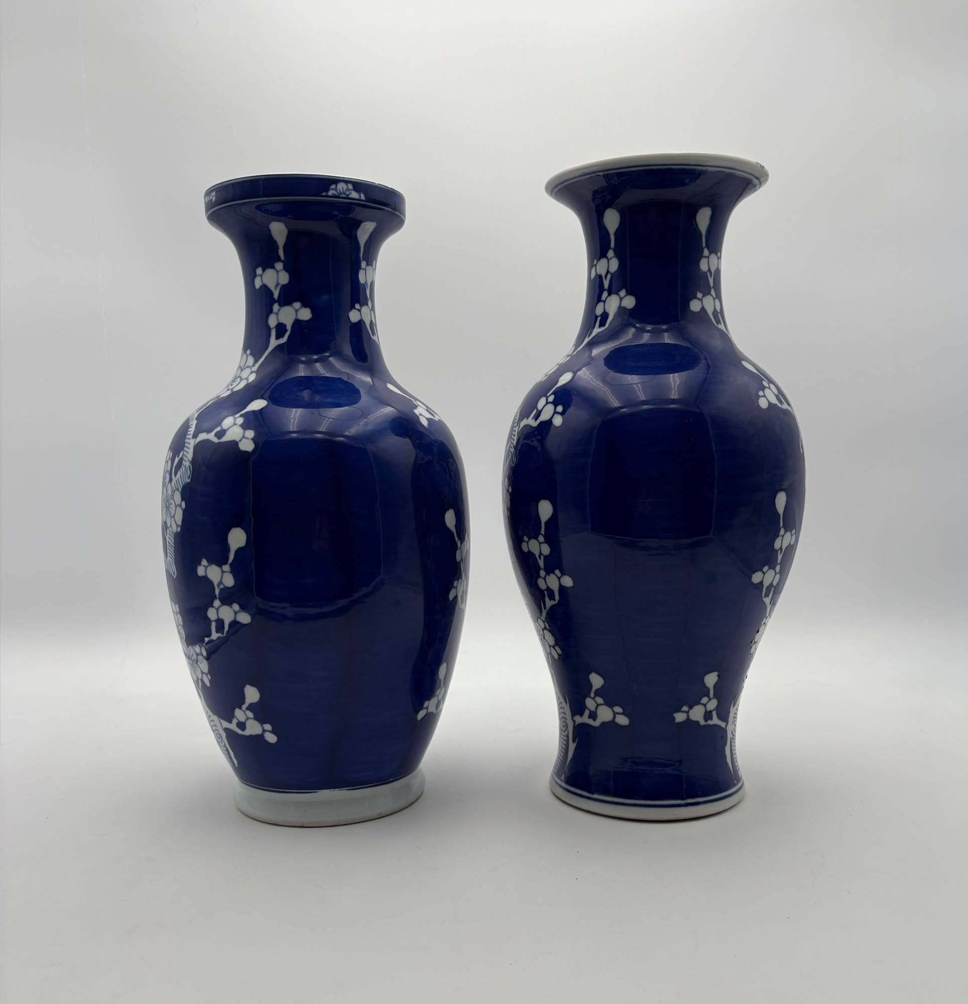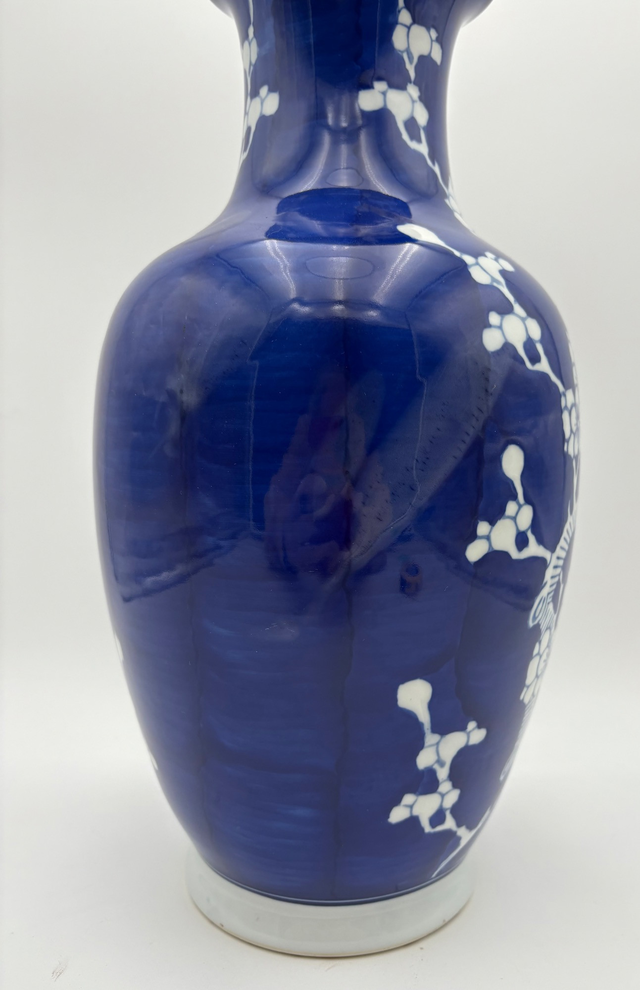 Two nearly identical vases in blue & white decorated with classic Asian floral motif. Both measure approximately 14.5" H. They work together, but are not identical in profile - both the lips and shaping are slightly different. Pair of wooden stands accompany them. Note - there is a hairline crack at the top of the right vase with some slight rubbing /chipping on the lip. There appears to be a flaw in the underglazing on the vase on the left. Neither is really noticeable unless you are inspecting closely - see last 2 photos. Four glass figures. Largest is the heart that measures 4" L x 3" W x 1.5" H.