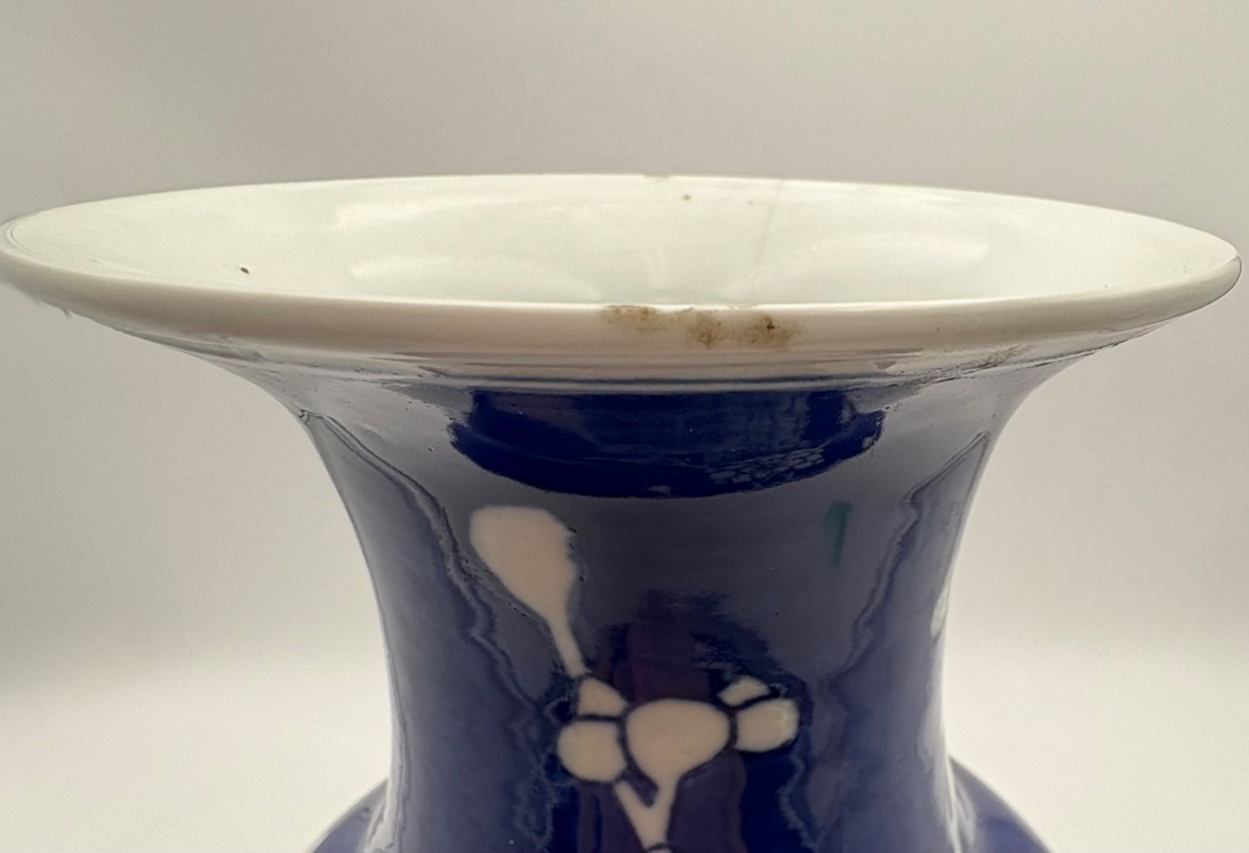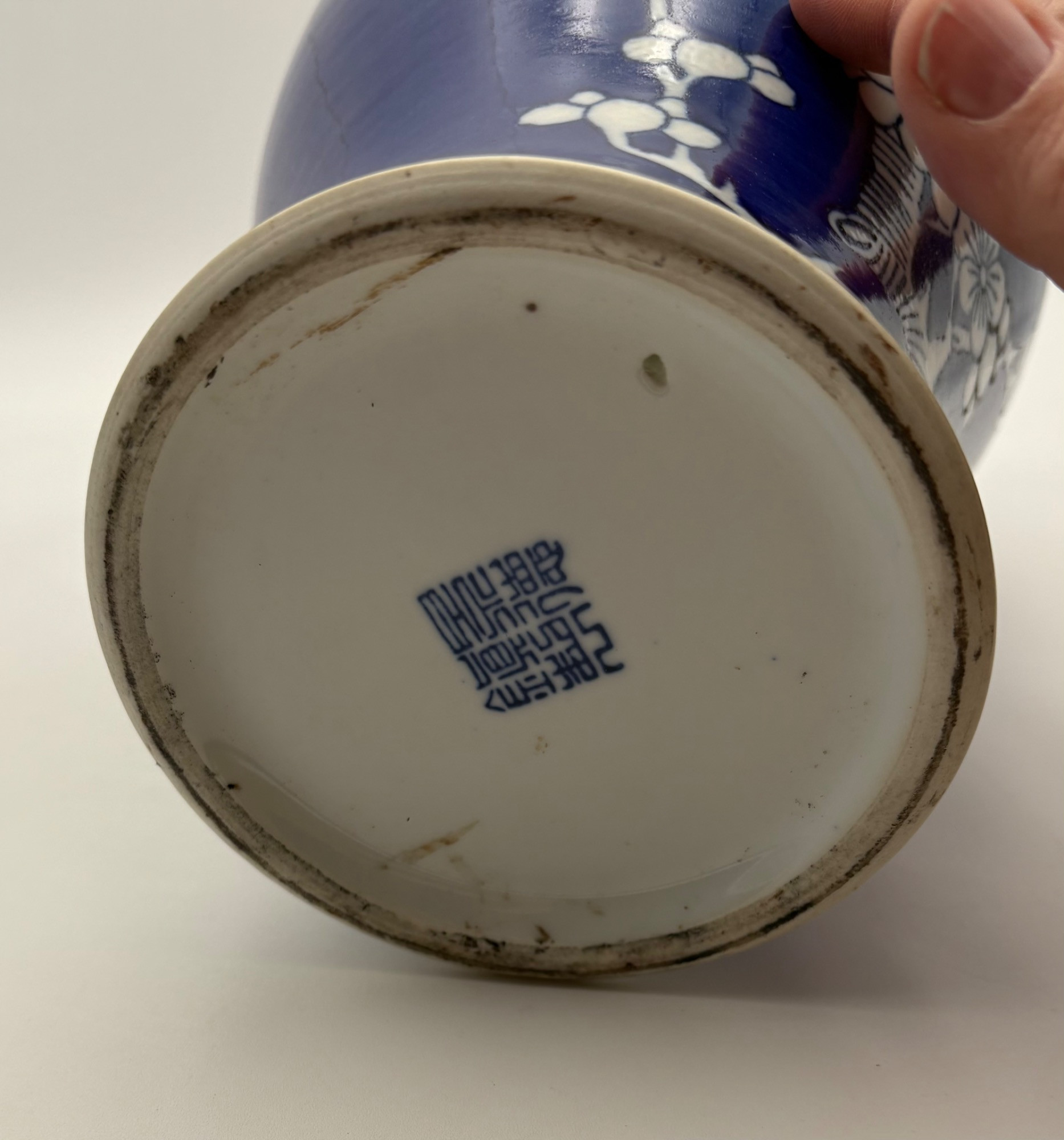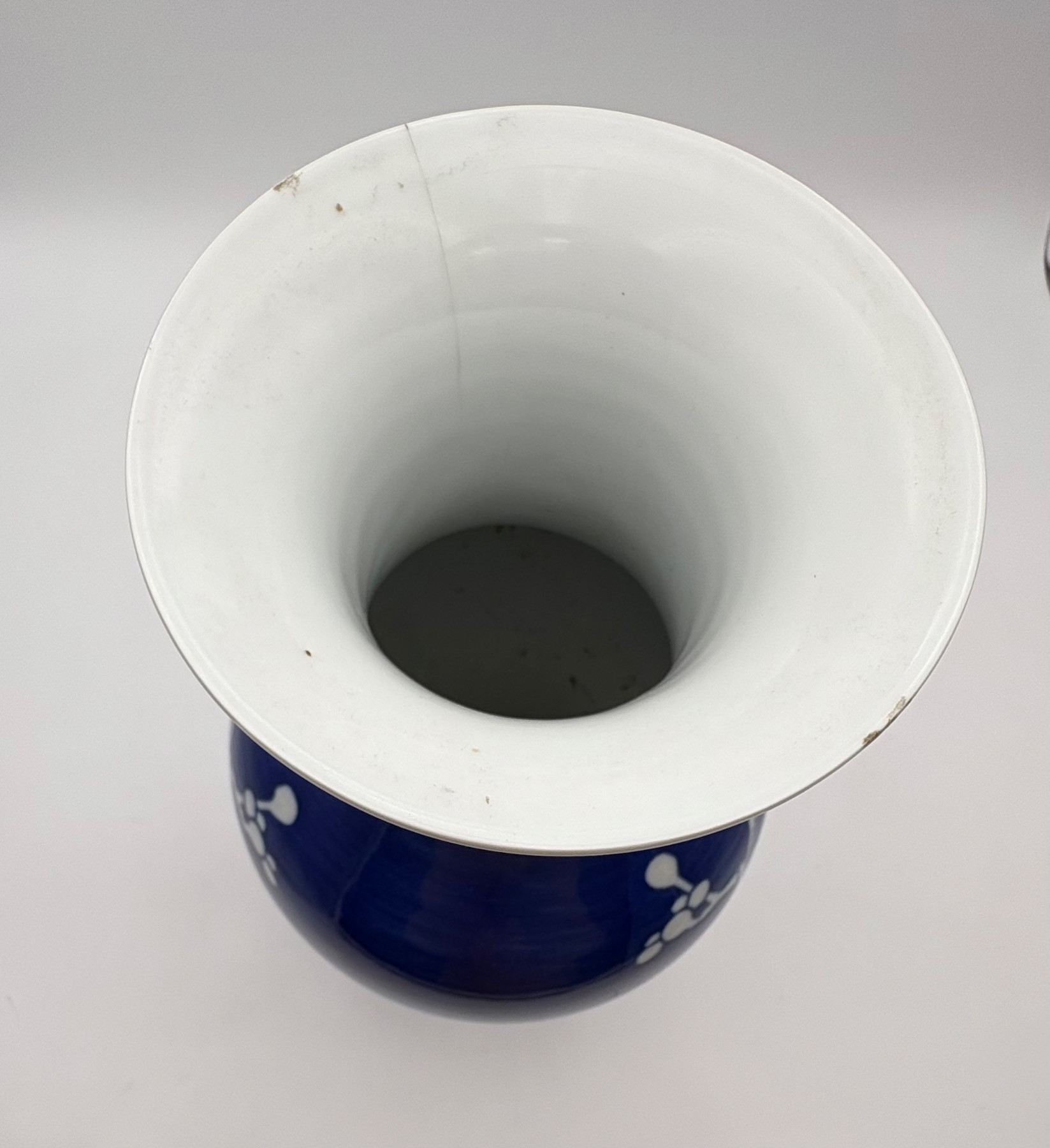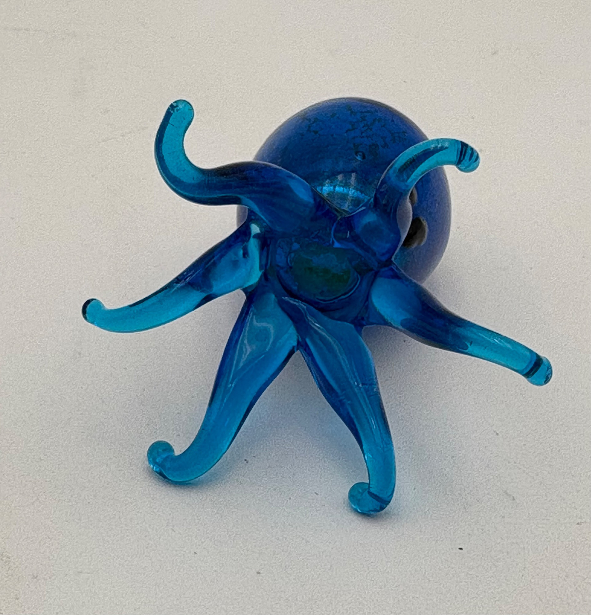 Two nearly identical vases in blue & white decorated with classic Asian floral motif. Both measure approximately 14.5" H. They work together, but are not identical in profile - both the lips and shaping are slightly different. Pair of wooden stands accompany them. Note - there is a hairline crack at the top of the right vase with some slight rubbing /chipping on the lip. There appears to be a flaw in the underglazing on the vase on the left. Neither is really noticeable unless you are inspecting closely - see last 2 photos. Four glass figures. Largest is the heart that measures 4" L x 3" W x 1.5" H.