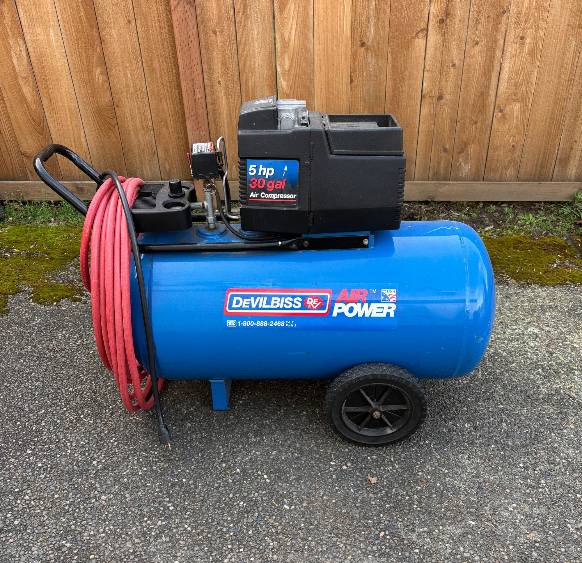 DeVilbiss 5 hp 30-gallon air compressor in very good condition. Model #DF5030 with max pressure of 125 psi. Nicely balanced with wheels that roll/pivot easily to move it into position wherever you need it. Measures approx. 32" H x 42" L. Powers up great.