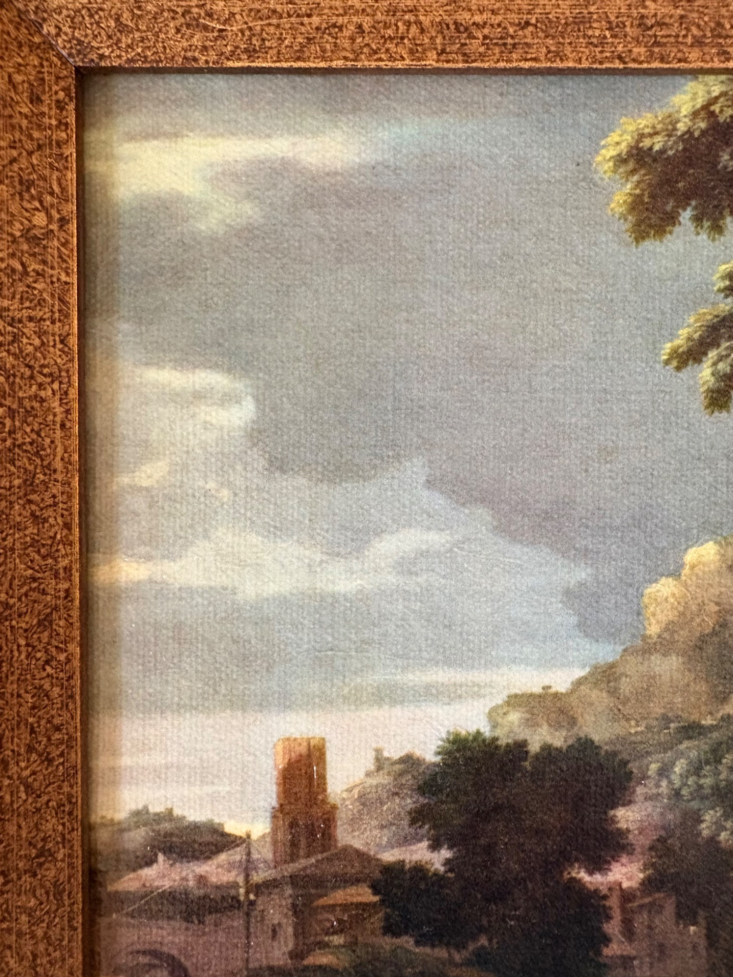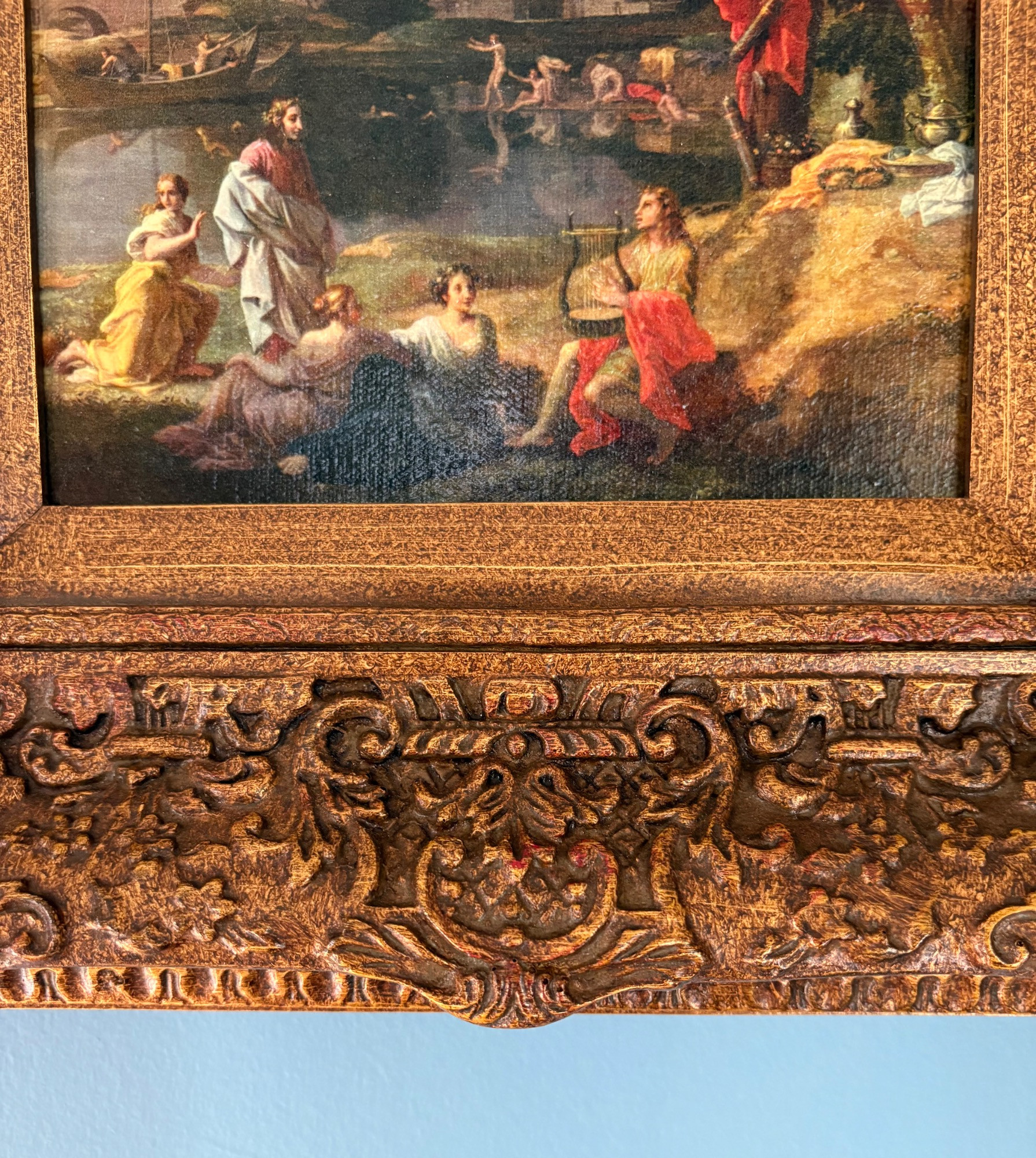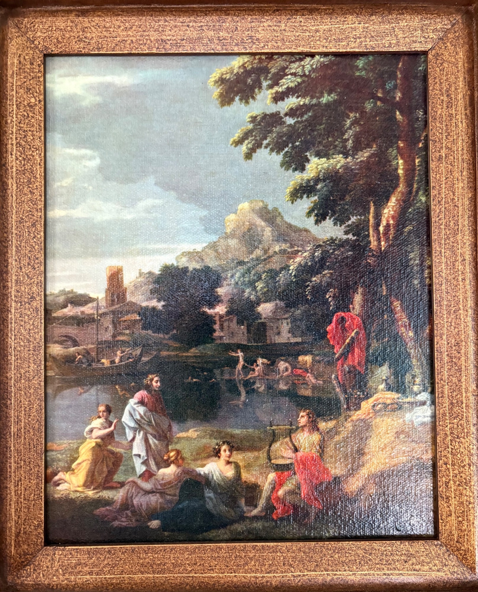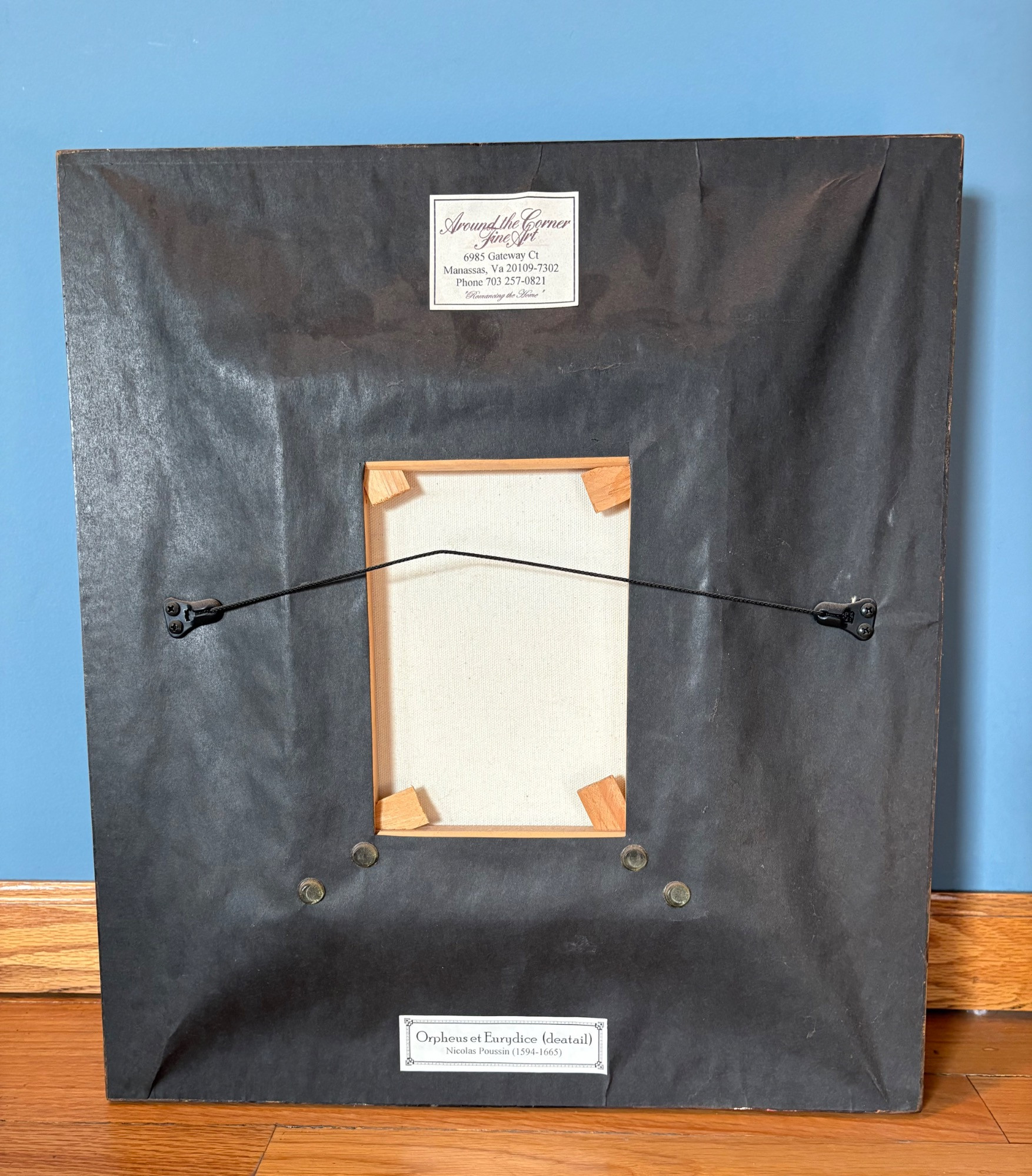 “Orpheus et Eurydice" (detail) by Nicolas Poussin (1594-1665). Reproduction painting on canvas of a typical theme in this artist's repertoire. The carving on the frame is almost over the top! Smaller piece at about 1.5' high framed. From Around the Corner Fine Art of Virginia known for producing high quality reproductions & frames in the 1980s & 1990s (Sadly, they appear to have closed shop in the early 2000s). We found a catalogue offering many of the exact works our client owned that roughly aligns with our client's purchase dates (pre-internet when everything was phone ordered or mail ordered). For those curious about the original price range/production of the paintings, see catalogue info in photos below after the listing photos. Can be shipped FedEx.