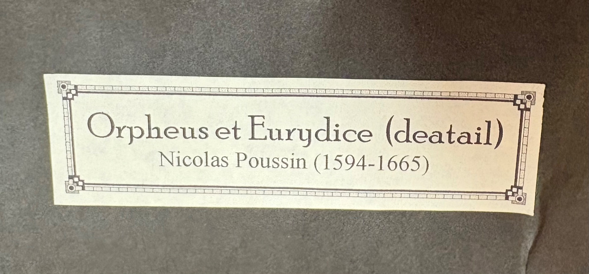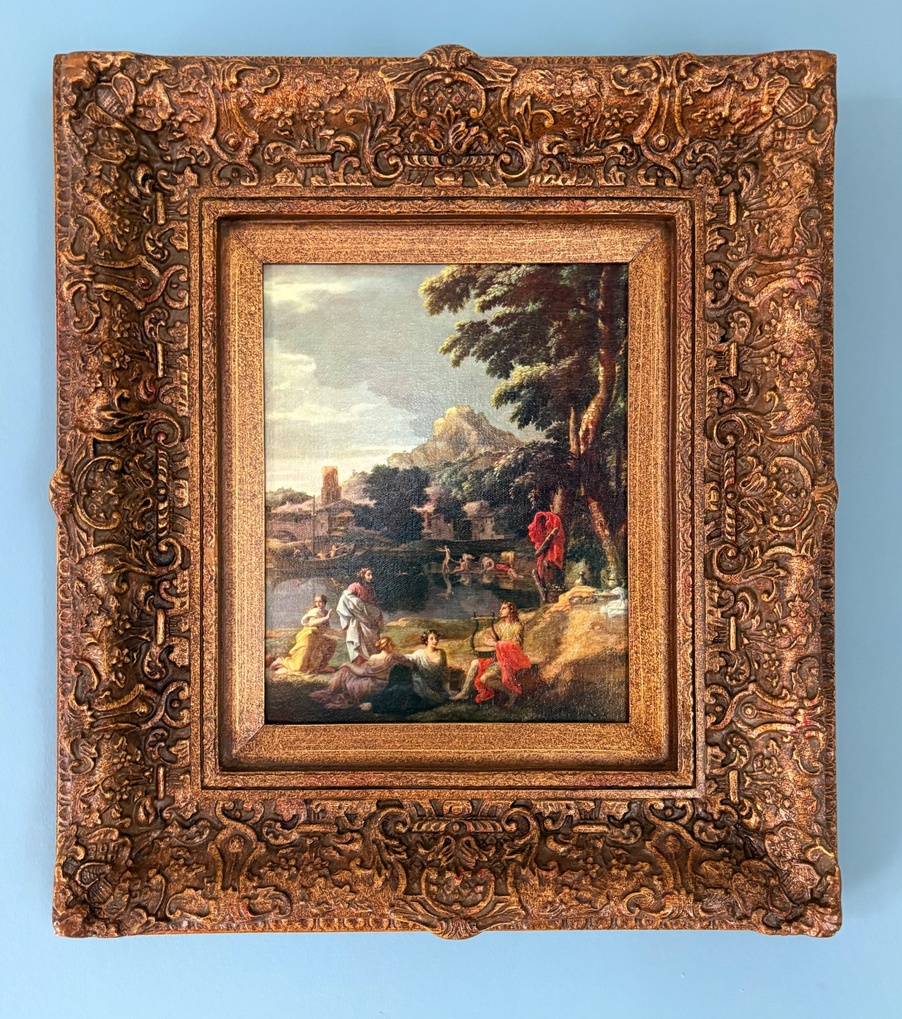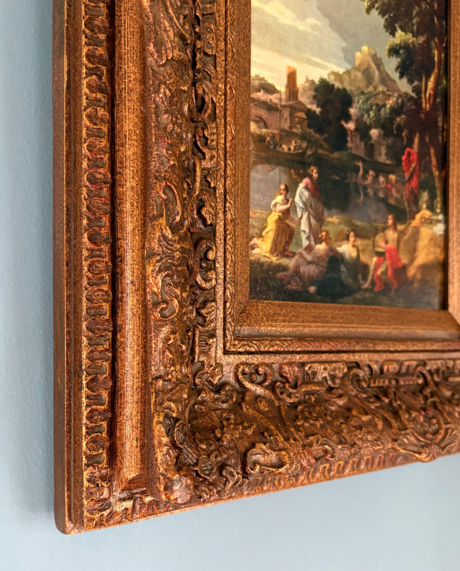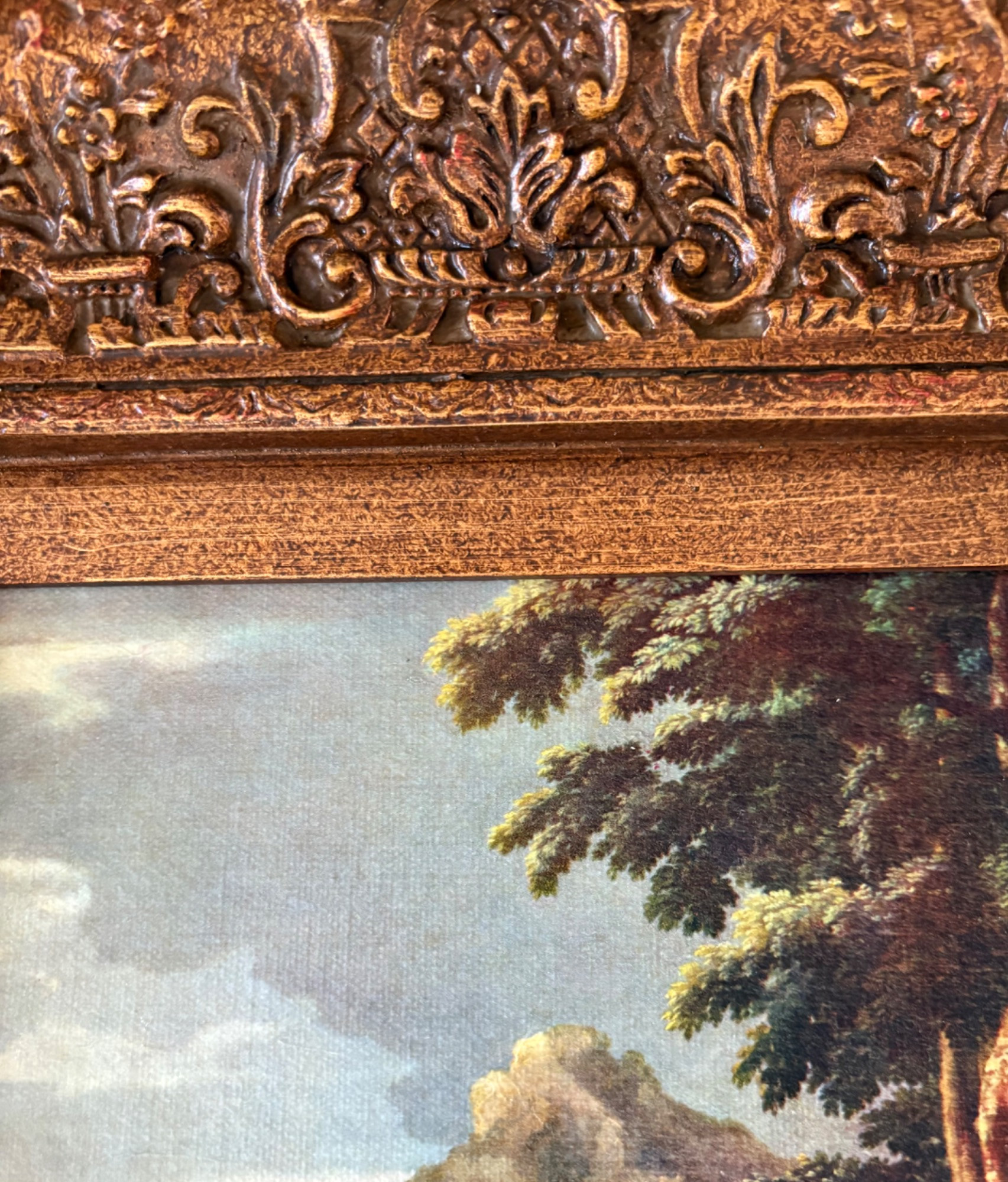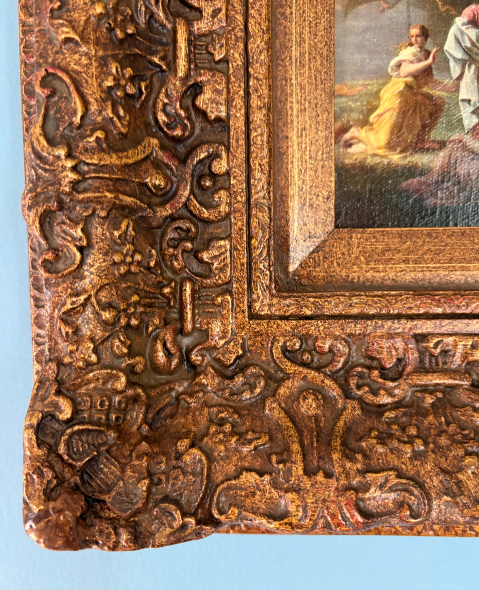 “Orpheus et Eurydice" (detail) by Nicolas Poussin (1594-1665). Reproduction painting on canvas of a typical theme in this artist's repertoire. The carving on the frame is almost over the top! Smaller piece at about 1.5' high framed. From Around the Corner Fine Art of Virginia known for producing high quality reproductions & frames in the 1980s & 1990s (Sadly, they appear to have closed shop in the early 2000s). We found a catalogue offering many of the exact works our client owned that roughly aligns with our client's purchase dates (pre-internet when everything was phone ordered or mail ordered). For those curious about the original price range/production of the paintings, see catalogue info in photos below after the listing photos. Can be shipped FedEx.