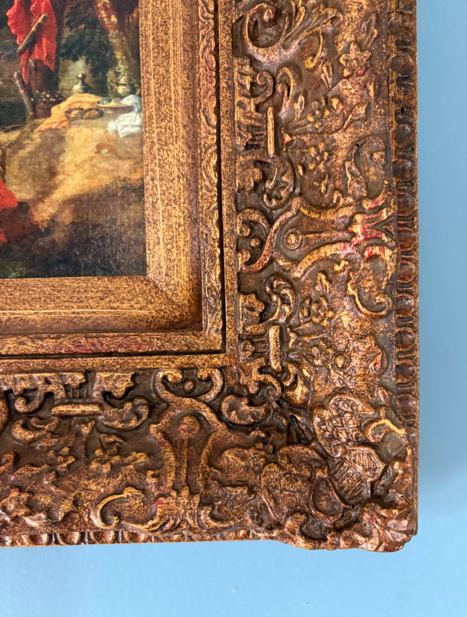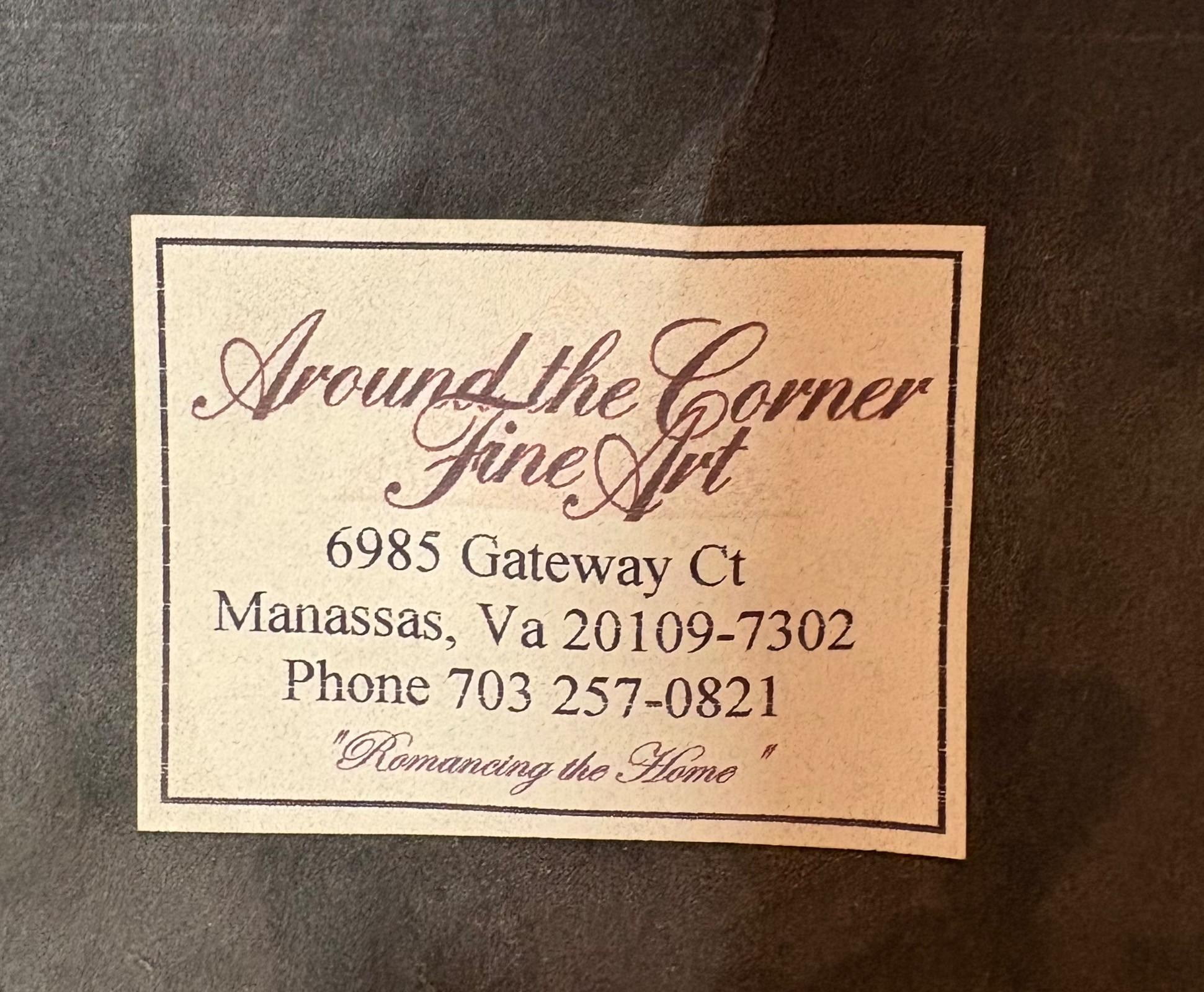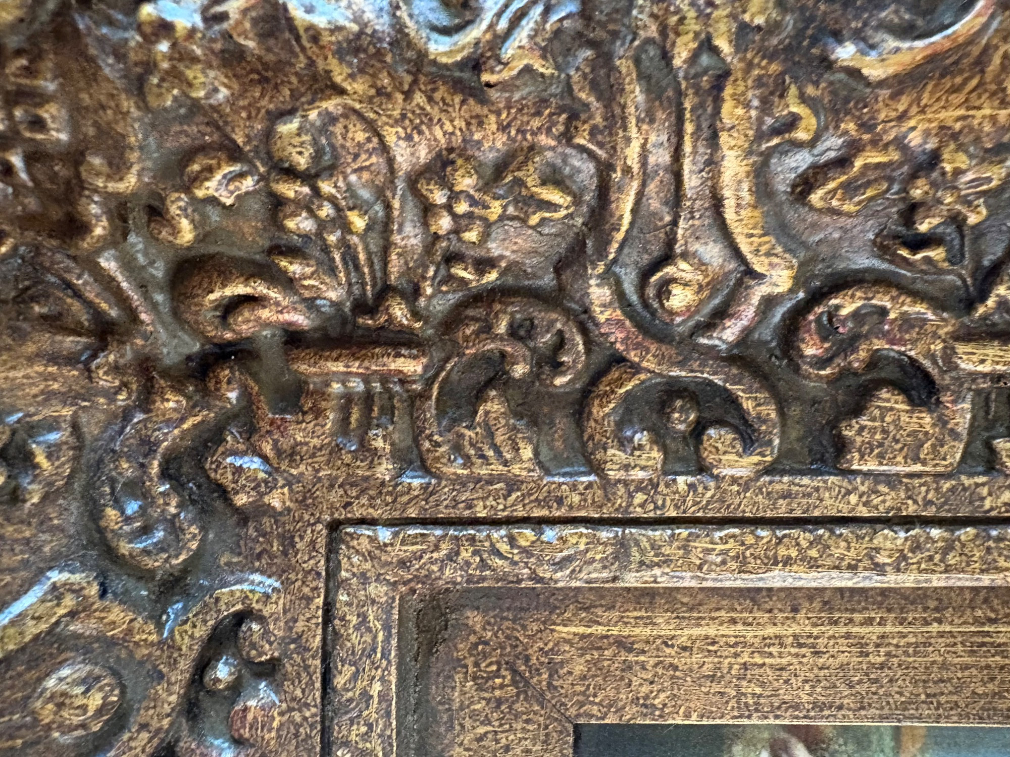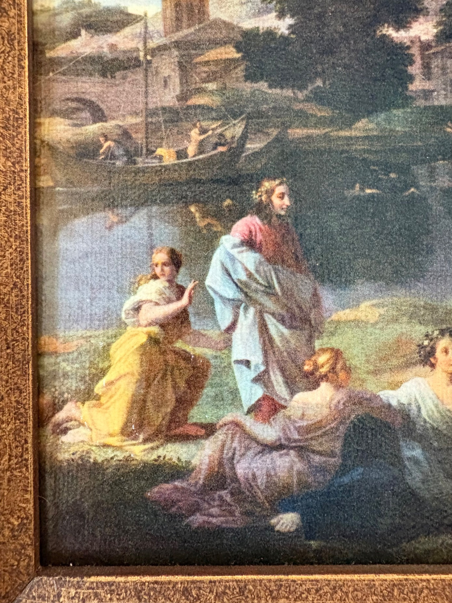 “Orpheus et Eurydice" (detail) by Nicolas Poussin (1594-1665). Reproduction painting on canvas of a typical theme in this artist's repertoire. The carving on the frame is almost over the top! Smaller piece at about 1.5' high framed. From Around the Corner Fine Art of Virginia known for producing high quality reproductions & frames in the 1980s & 1990s (Sadly, they appear to have closed shop in the early 2000s). We found a catalogue offering many of the exact works our client owned that roughly aligns with our client's purchase dates (pre-internet when everything was phone ordered or mail ordered). For those curious about the original price range/production of the paintings, see catalogue info in photos below after the listing photos. Can be shipped FedEx.