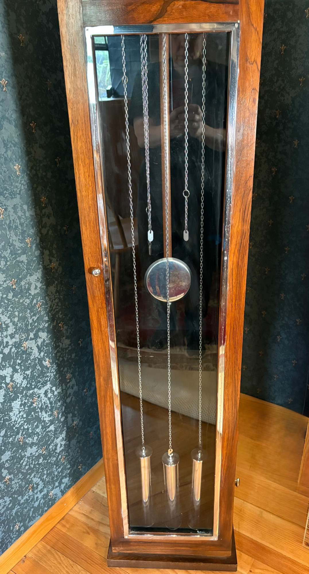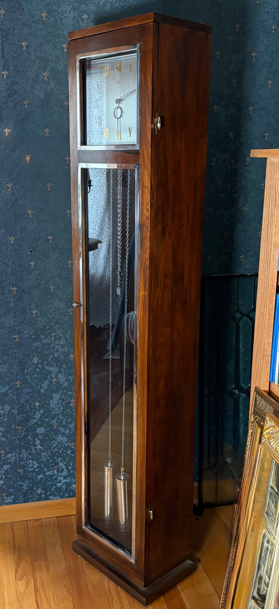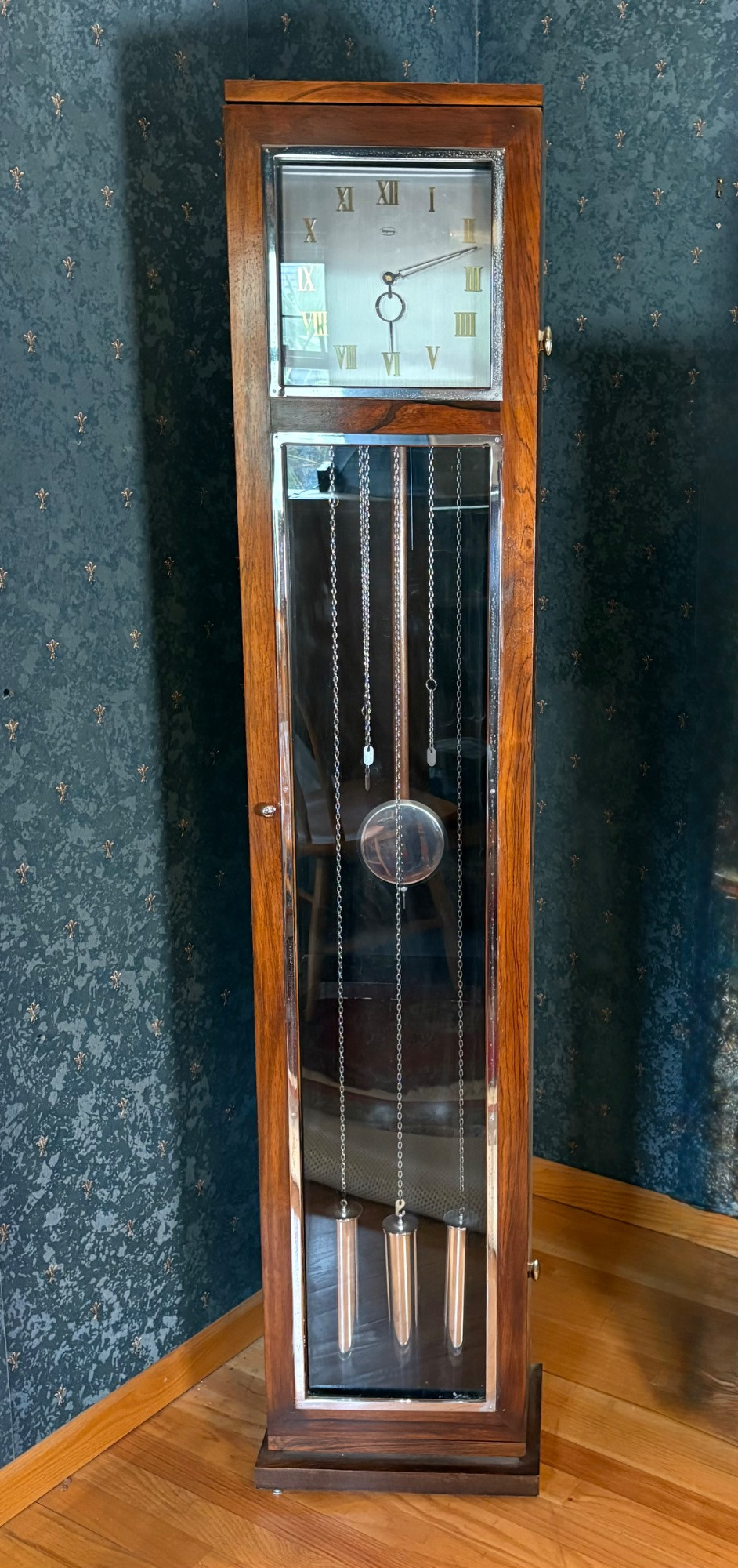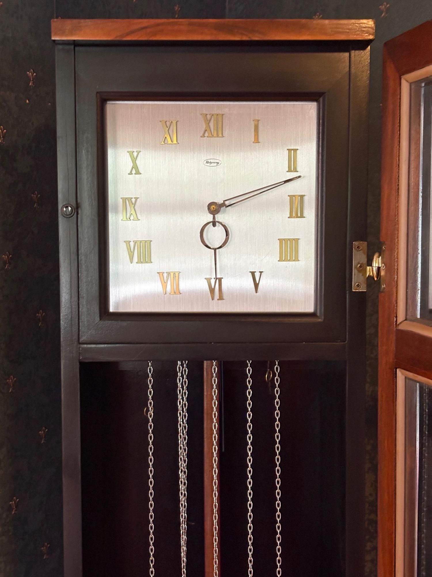 Very nice arts and craft style grandfather clock from Ridgeway . Has Westminster chimes,. pendulum and weights, and pretty woodgrain. It does not appear to be working but we think that because it is sitting on an uneven floor so the weights are not riding free to turn the pendulum. Comes with original paperwork.. Exterior is in great shape with the chrome needing a little bit of polish. White clock face measures approx. 9" square with gold Roman numerals. Front glass door opens easily for full access to interior. Really sleek piece for a turn of the century home or even a modern home. Local Pickup Only. Bidding on this lot is an agreement that you will bring a hand truck and/or any other tools needed to remove this item. If these steps are not followed your item will be forfeited and no refund given.