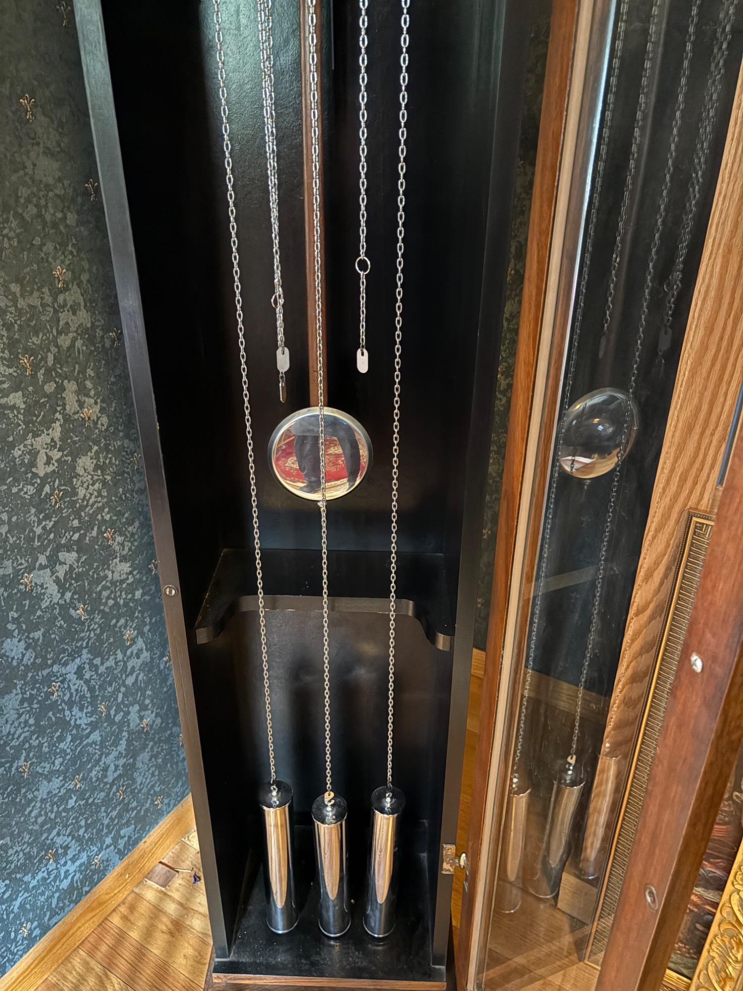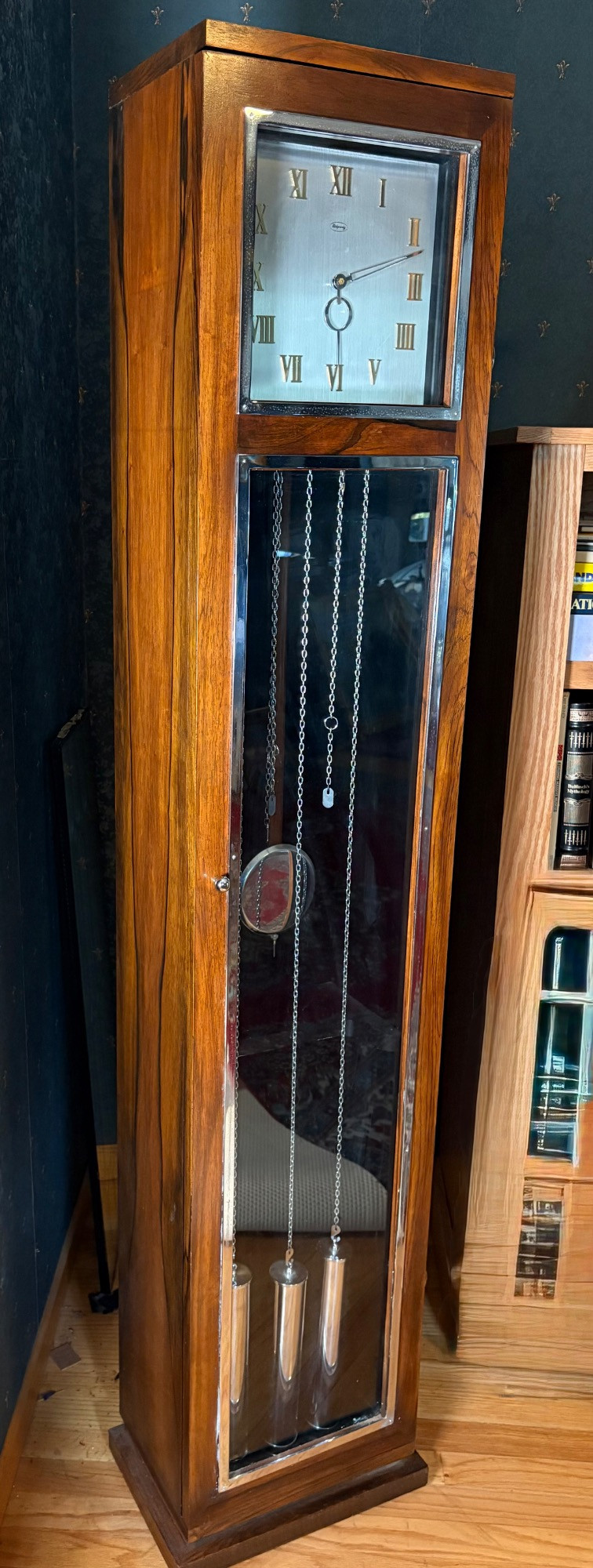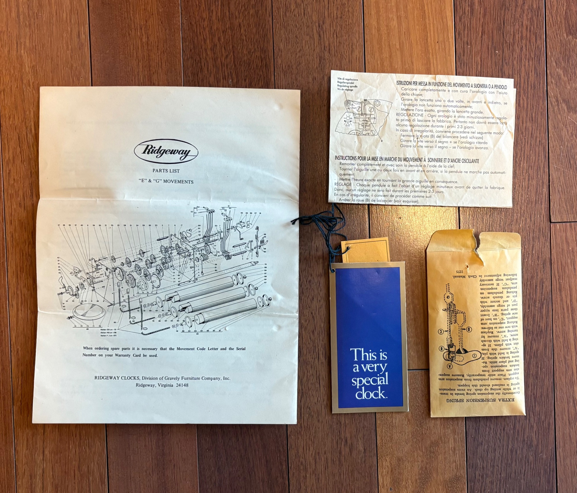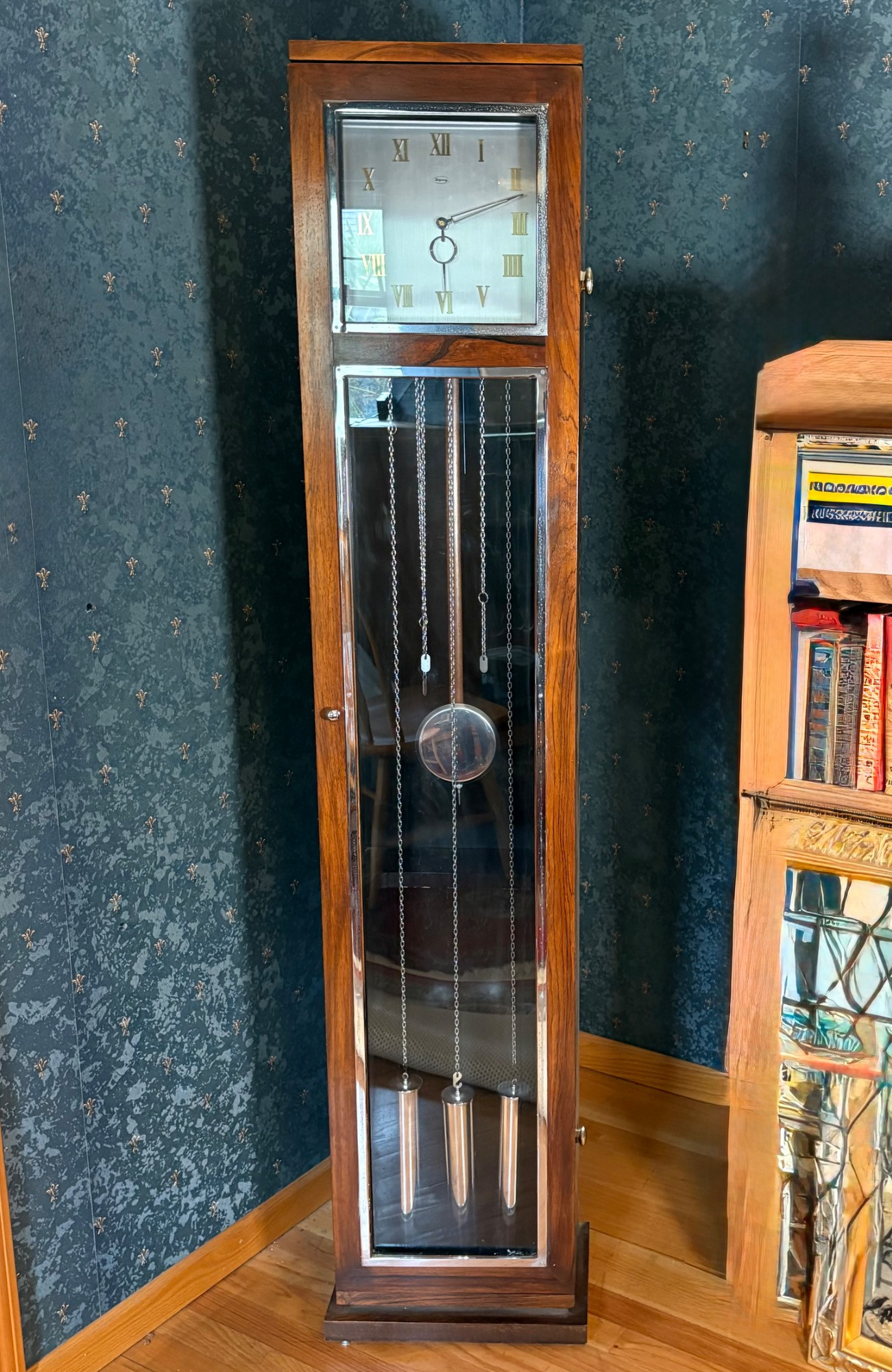 Very nice arts and craft style grandfather clock from Ridgeway . Has Westminster chimes,. pendulum and weights, and pretty woodgrain. It does not appear to be working but we think that because it is sitting on an uneven floor so the weights are not riding free to turn the pendulum. Comes with original paperwork.. Exterior is in great shape with the chrome needing a little bit of polish. White clock face measures approx. 9" square with gold Roman numerals. Front glass door opens easily for full access to interior. Really sleek piece for a turn of the century home or even a modern home. Local Pickup Only. Bidding on this lot is an agreement that you will bring a hand truck and/or any other tools needed to remove this item. If these steps are not followed your item will be forfeited and no refund given.