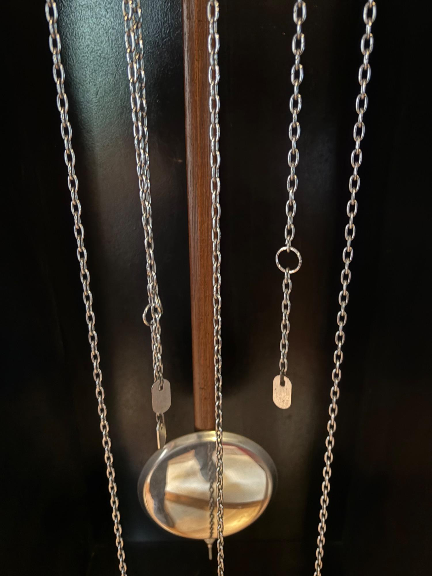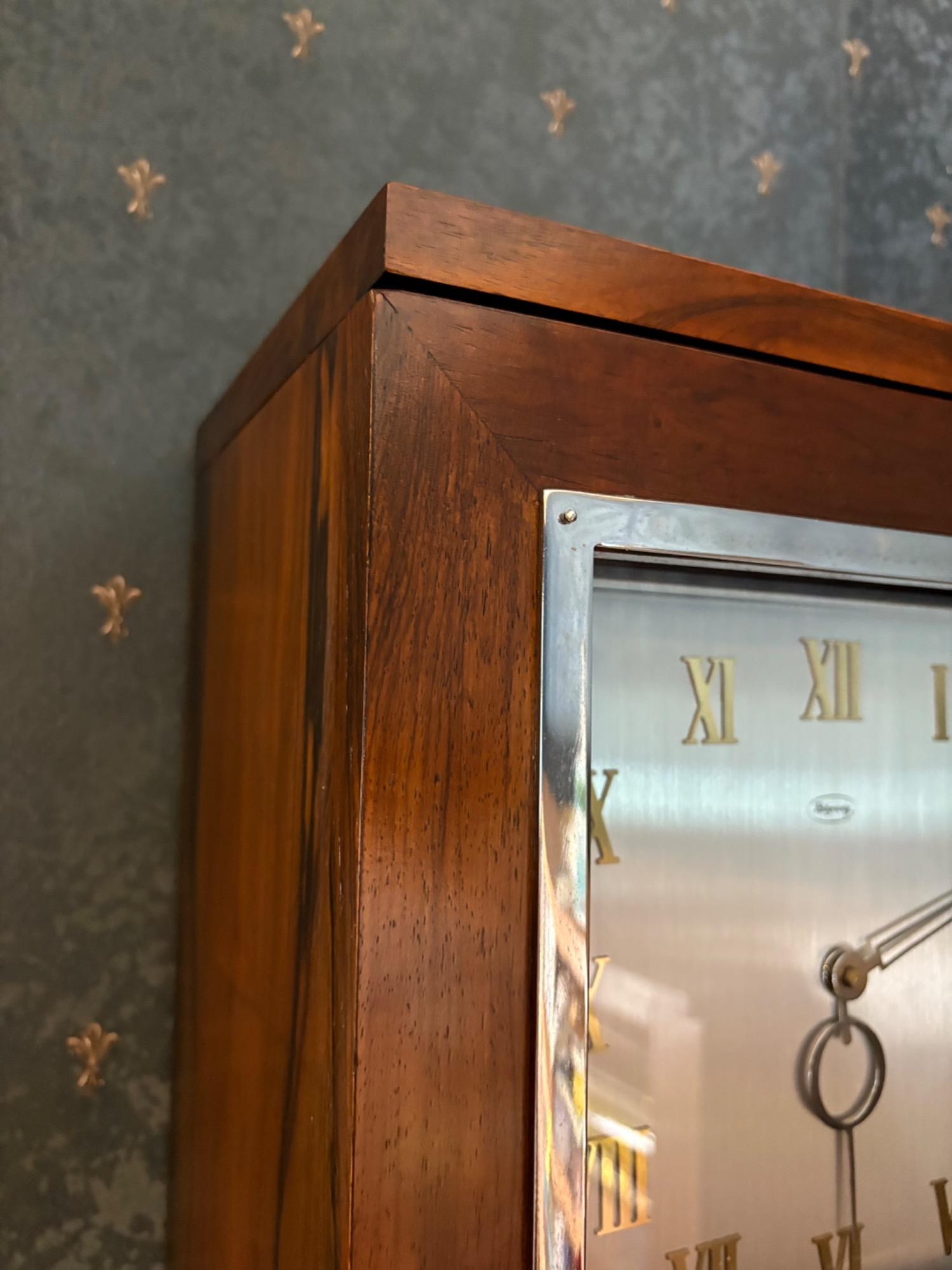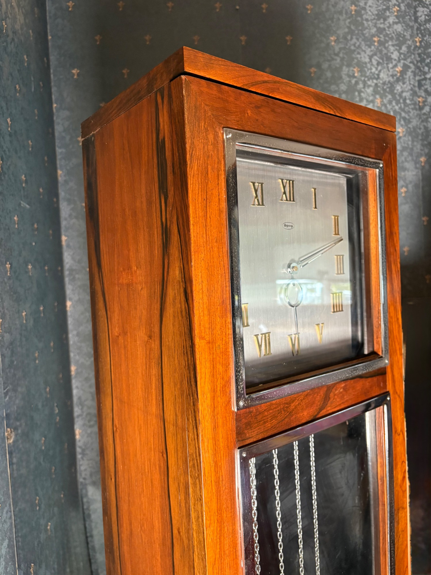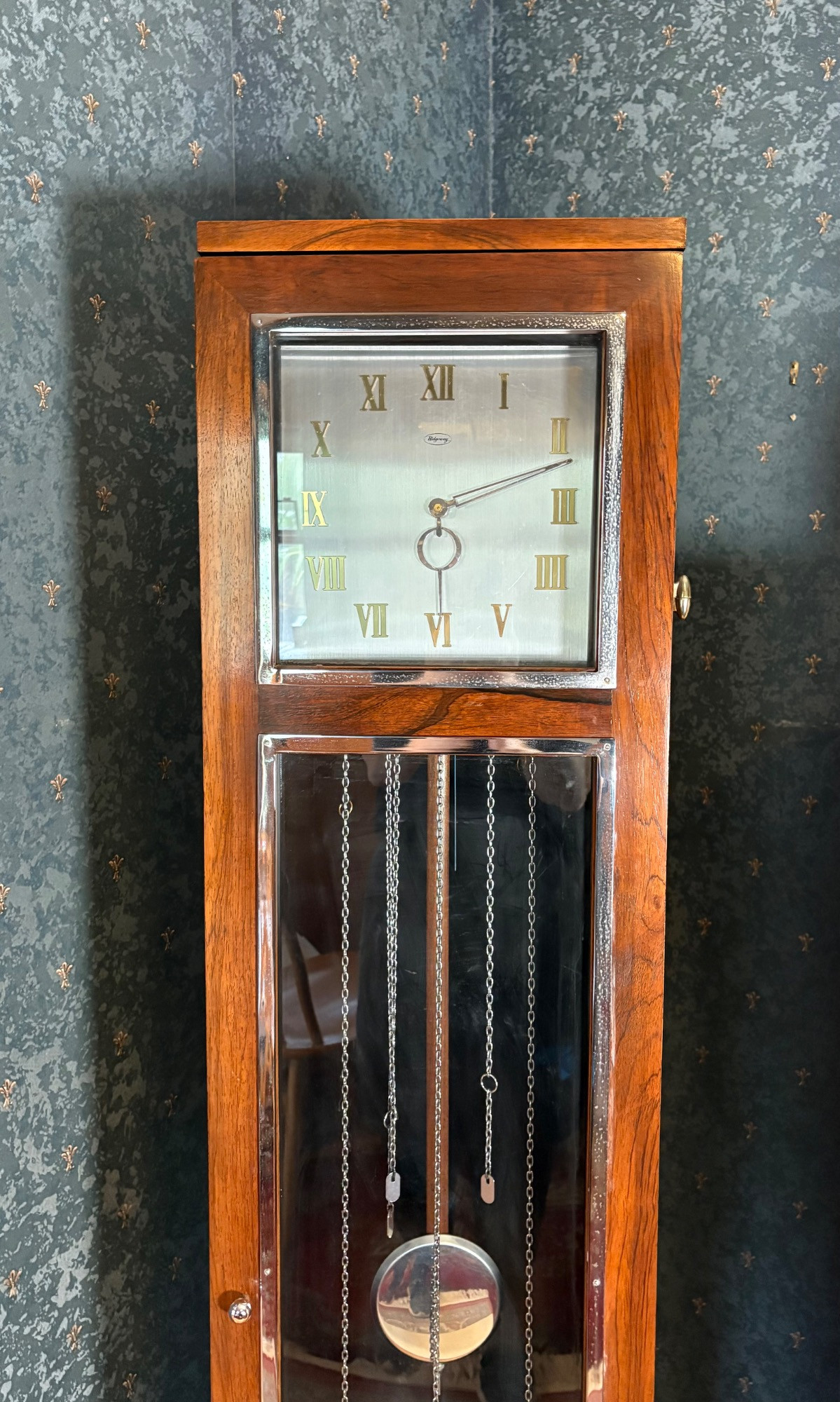 Very nice arts and craft style grandfather clock from Ridgeway . Has Westminster chimes,. pendulum and weights, and pretty woodgrain. It does not appear to be working but we think that because it is sitting on an uneven floor so the weights are not riding free to turn the pendulum. Comes with original paperwork.. Exterior is in great shape with the chrome needing a little bit of polish. White clock face measures approx. 9" square with gold Roman numerals. Front glass door opens easily for full access to interior. Really sleek piece for a turn of the century home or even a modern home. Local Pickup Only. Bidding on this lot is an agreement that you will bring a hand truck and/or any other tools needed to remove this item. If these steps are not followed your item will be forfeited and no refund given.